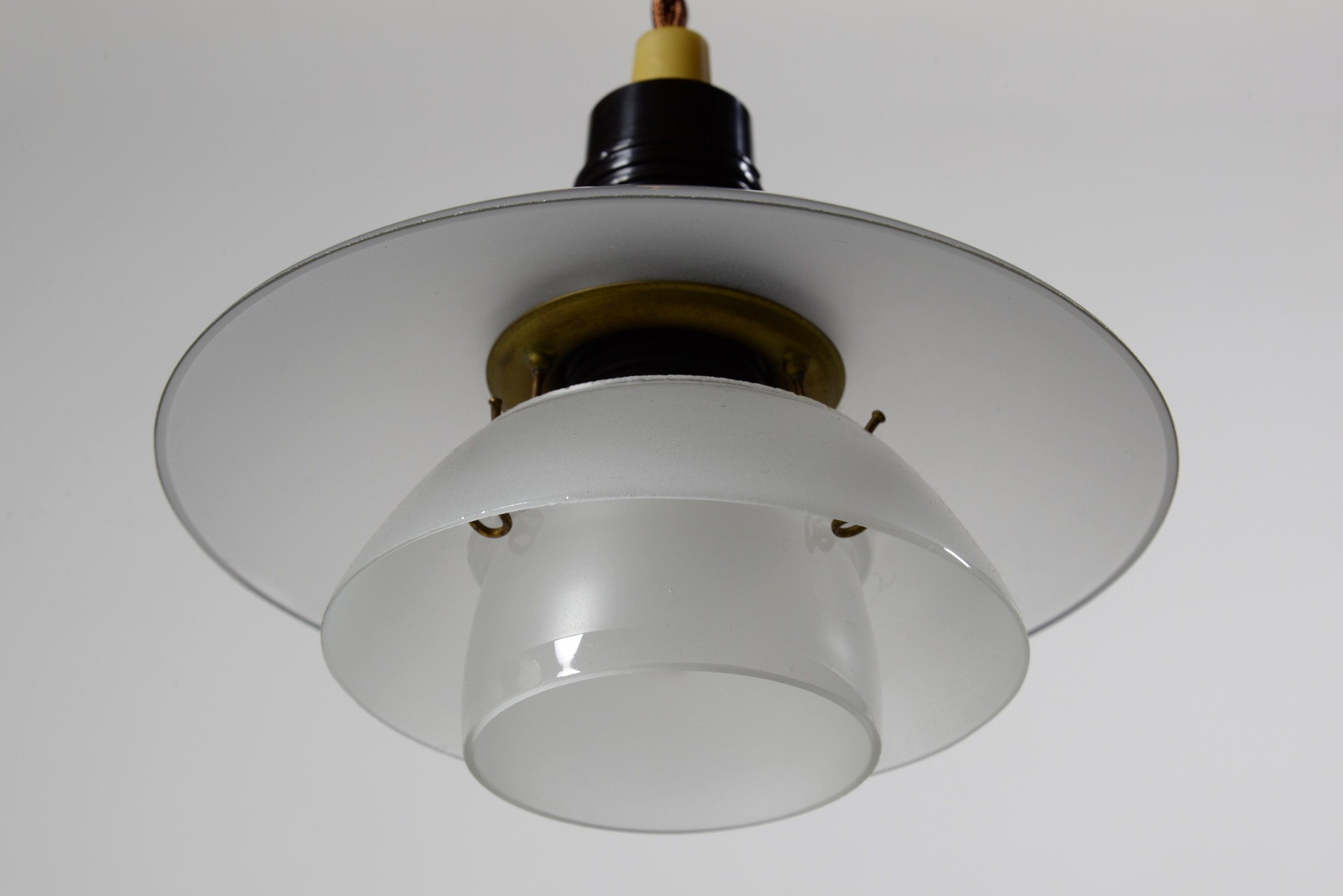 デンマークのデザイナー、Poul Henningsen/ポール・ヘニングセンによってデザインされたPH1/1ペンダントランプ "Nr.17011" 一対です。1930年代に作られたものでしょう。ベークライトのソケットボックスにフロストガラスのシェードの組み合わせです。ボトムボウルは備わりません。ソケットボックスの一部に割れが見られ、シェードの一部に小さなチップが見られますが、大きなダメージは無く、劣化も少なくきれいな状態です。