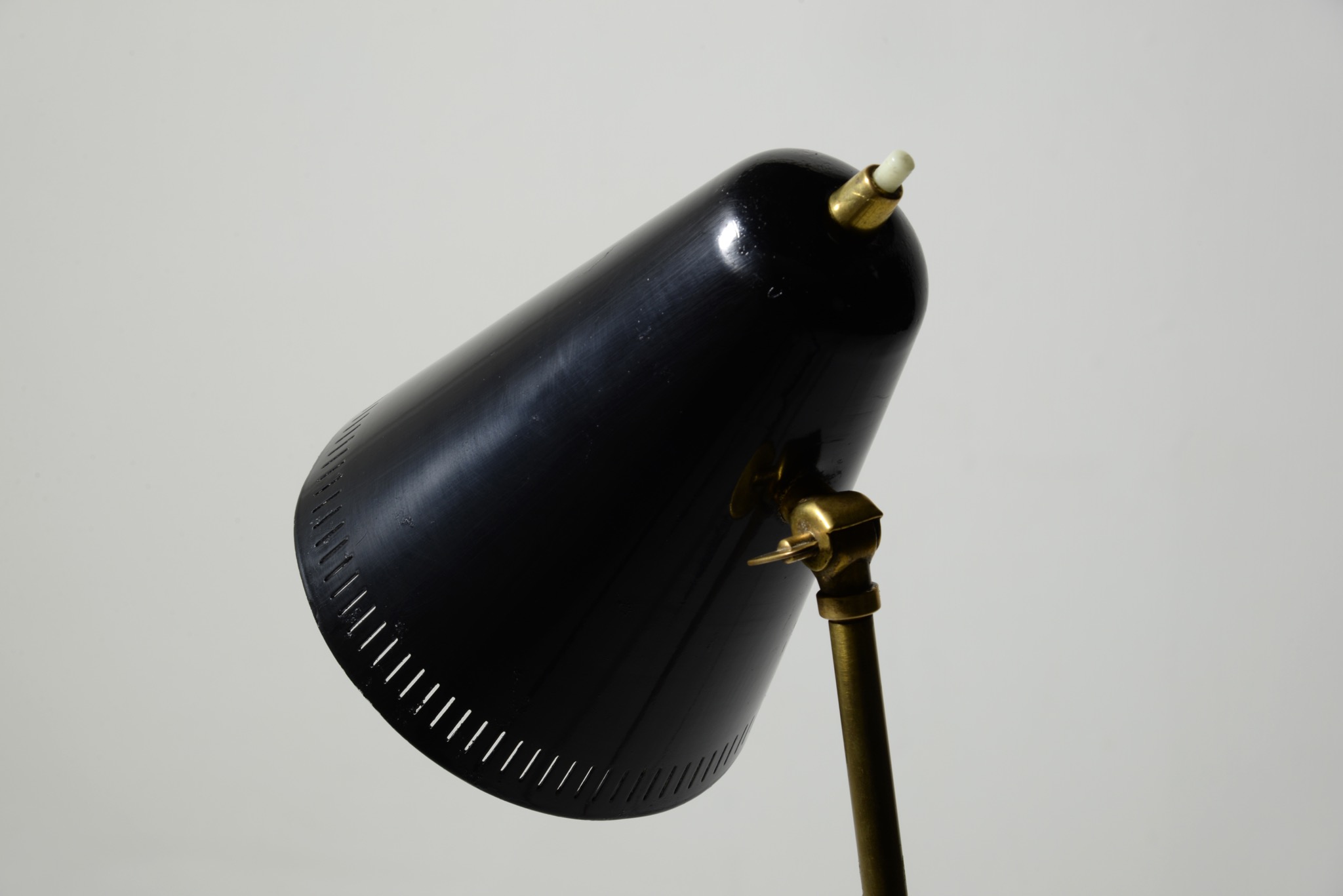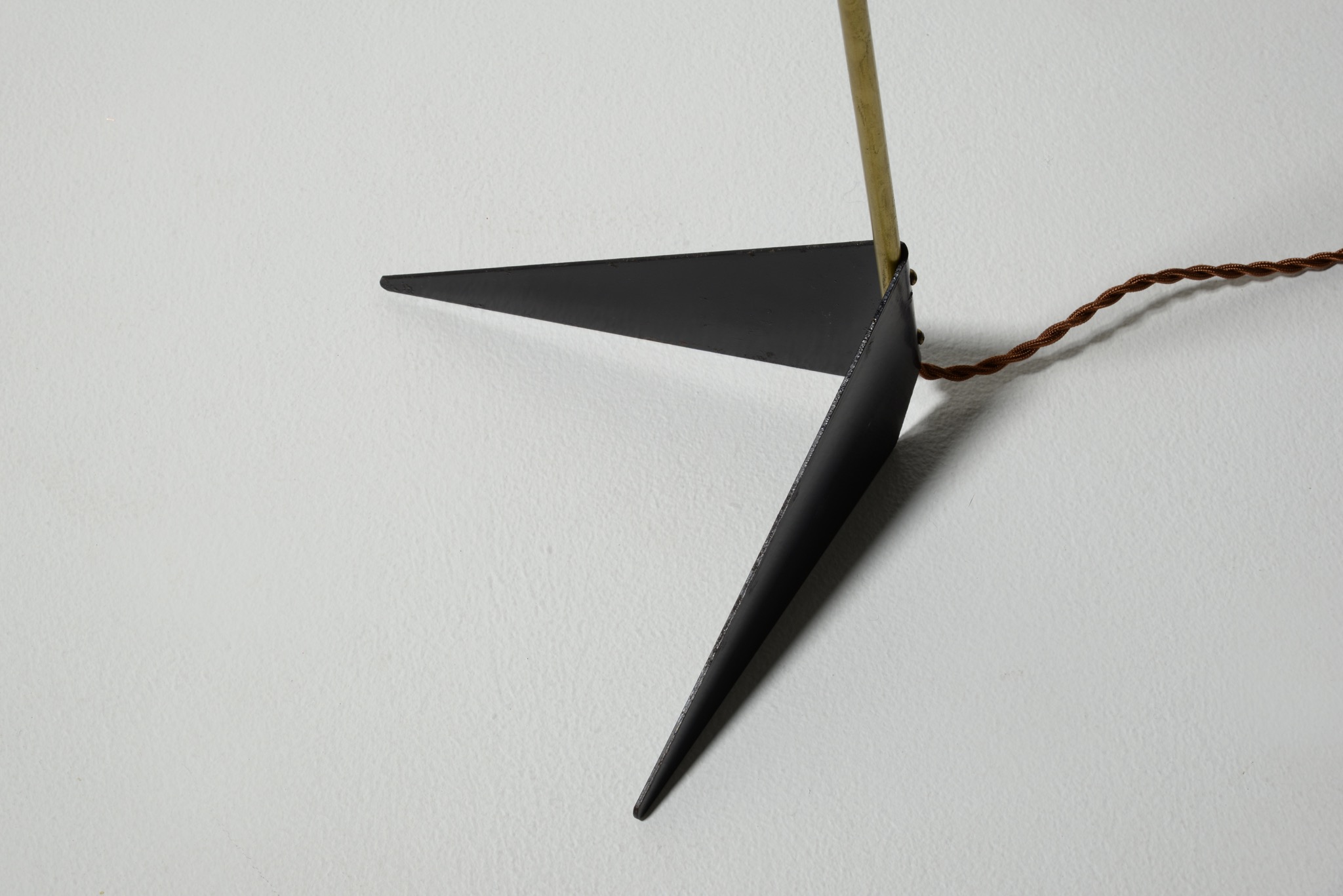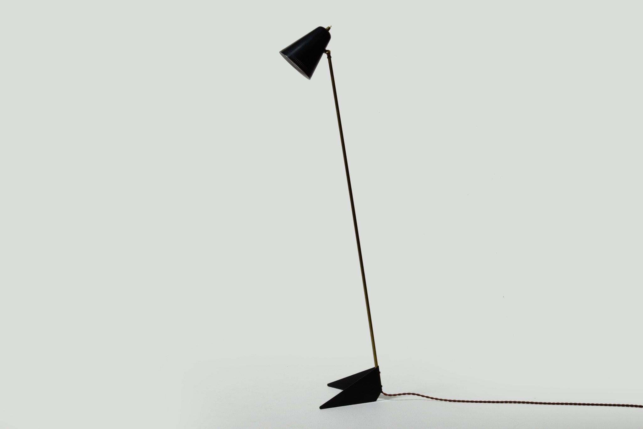 1950年代のデンマークで作られたフロアランプです。シェードとベースは鉄に黒色ラッカーペイントが施されており、支柱には真鍮が用いられています。詳しいメーカーやデザイナーなどは分かっておりませんが、時代を反映したデザインはとてもユニークです。軽くて転倒しやすいのでご使用の際にはご注意ください。