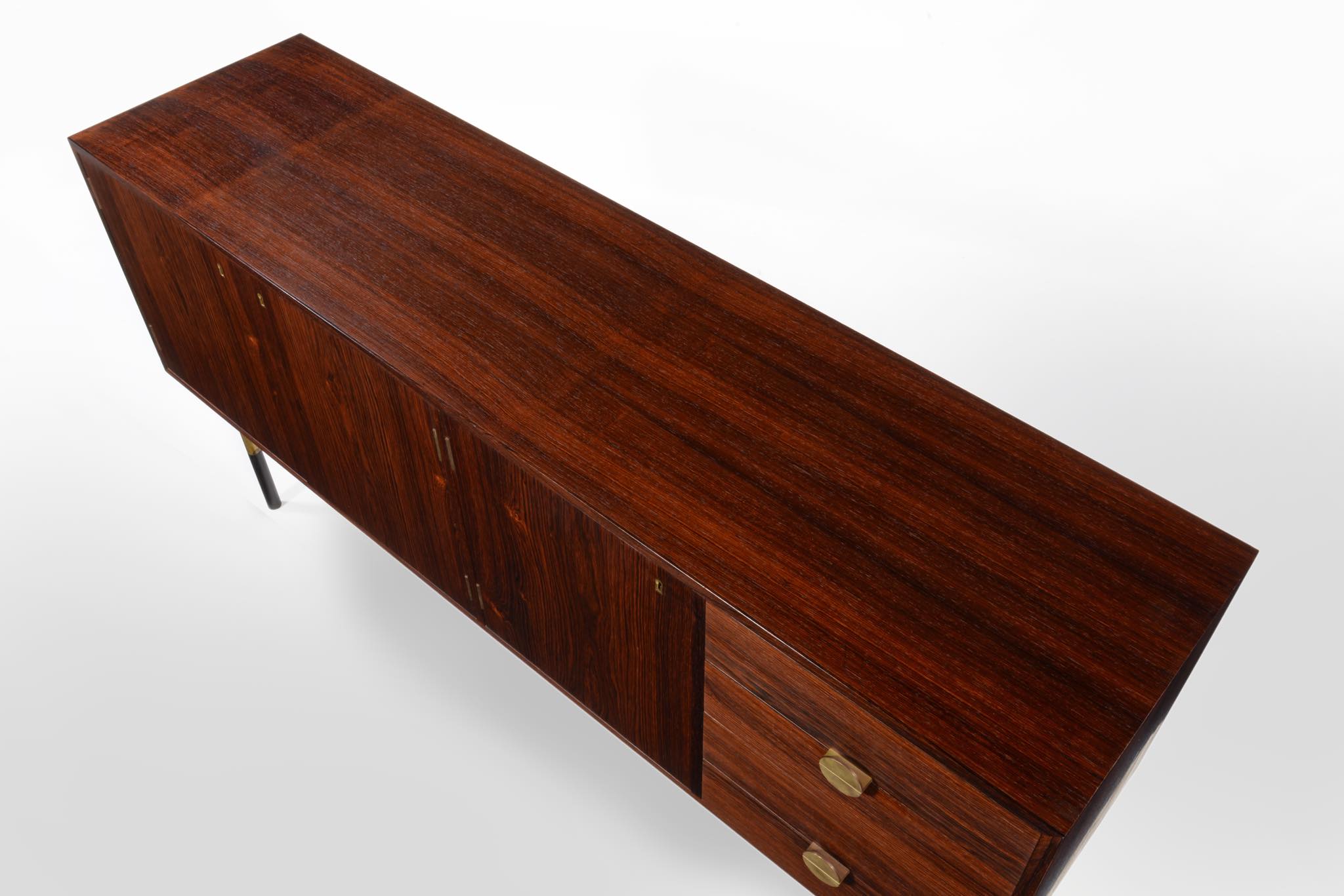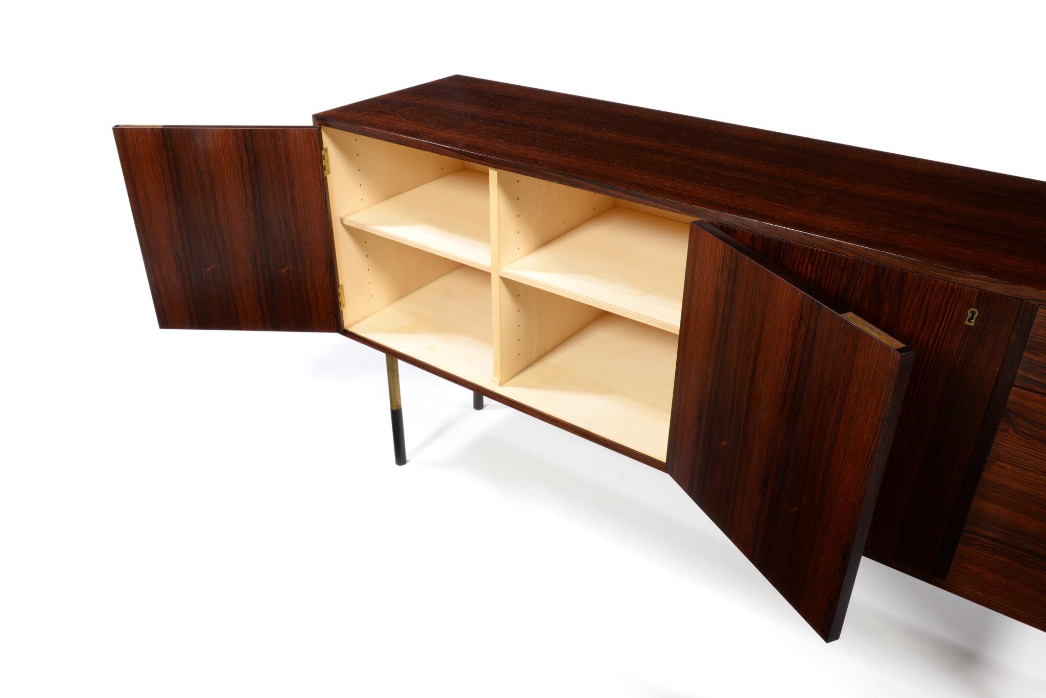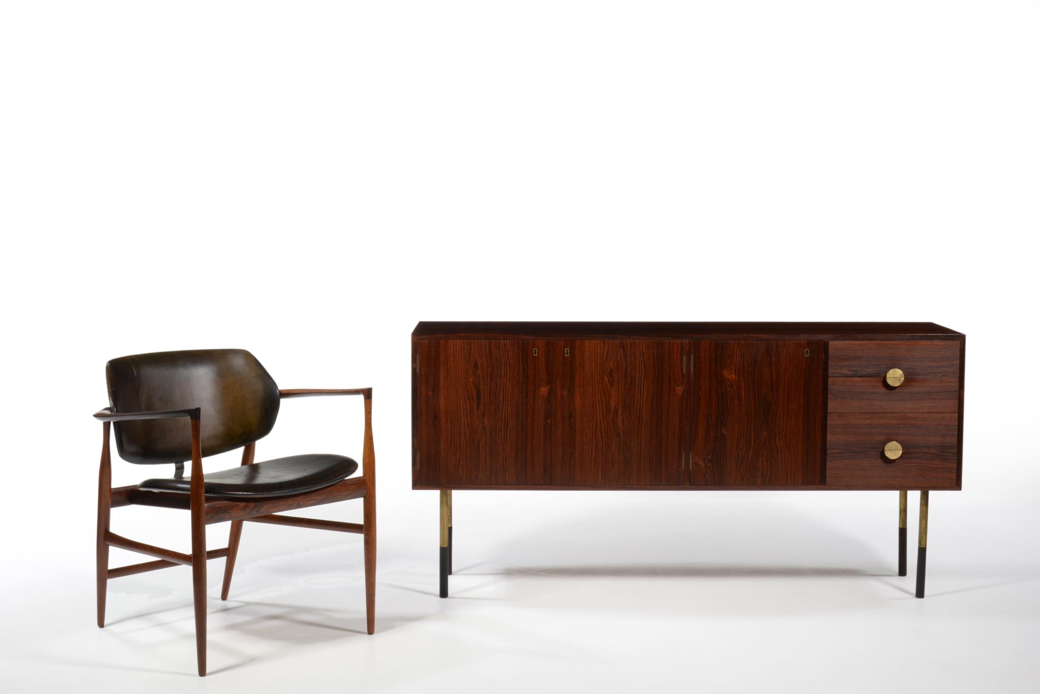 デンマークを代表するデザイナー、Finn Juhl/フィン・ユールによるサイドボードキャビネット、ローズウッドを用いたタイプです。Bovirke社によってシリーズ化されたもので、ライティングデスクや、壁付けのウォールシステムなどに同等のデザインが見られます。真鍮の引手がアクセントとなる抽斗は4杯配置され、扉の内部は棚板が付属します。綺麗な状態です。