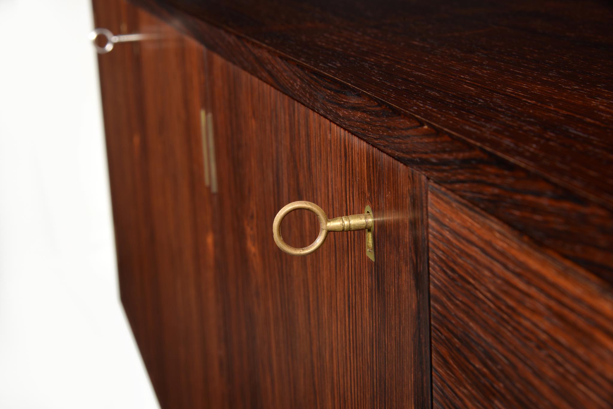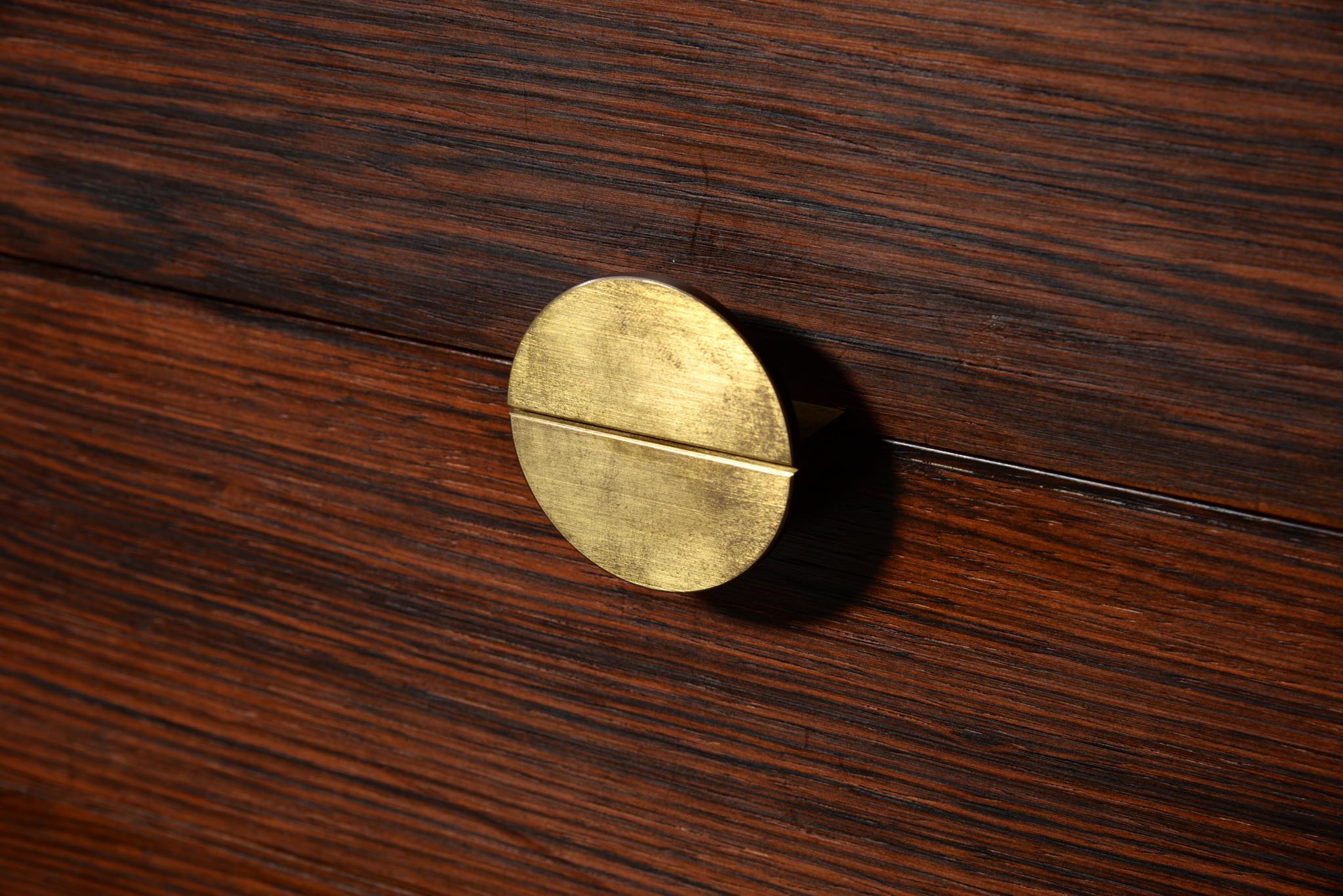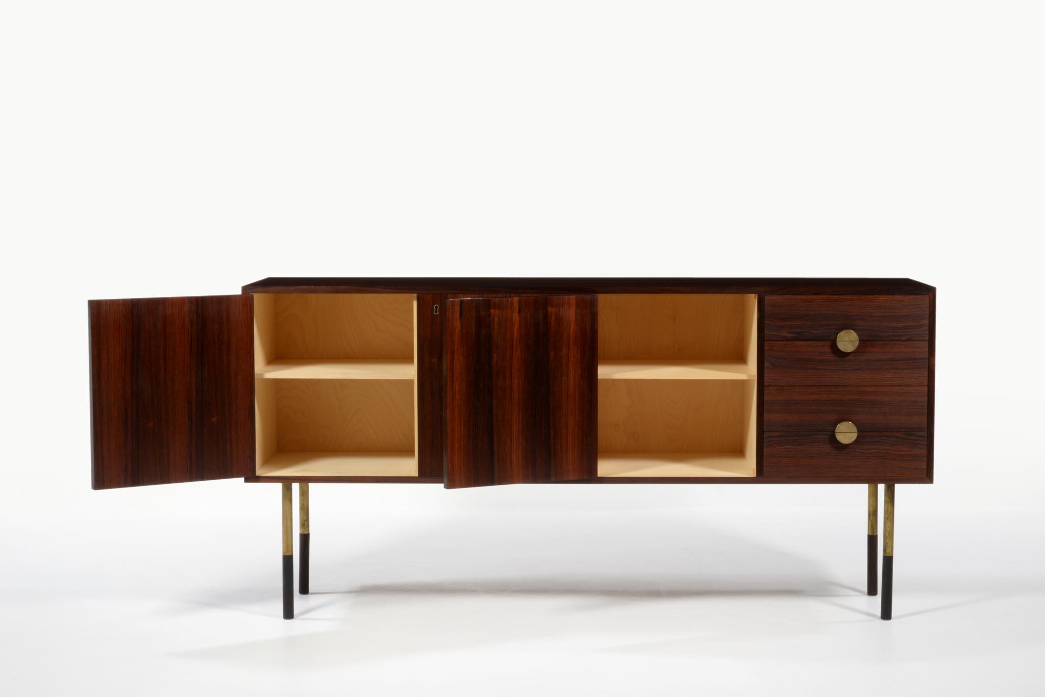 デンマークを代表するデザイナー、Finn Juhl/フィン・ユールによるサイドボードキャビネット、ローズウッドを用いたタイプです。Bovirke社によってシリーズ化されたもので、ライティングデスクや、壁付けのウォールシステムなどに同等のデザインが見られます。真鍮の引手がアクセントとなる抽斗は4杯配置され、扉の内部は棚板が付属します。綺麗な状態です。