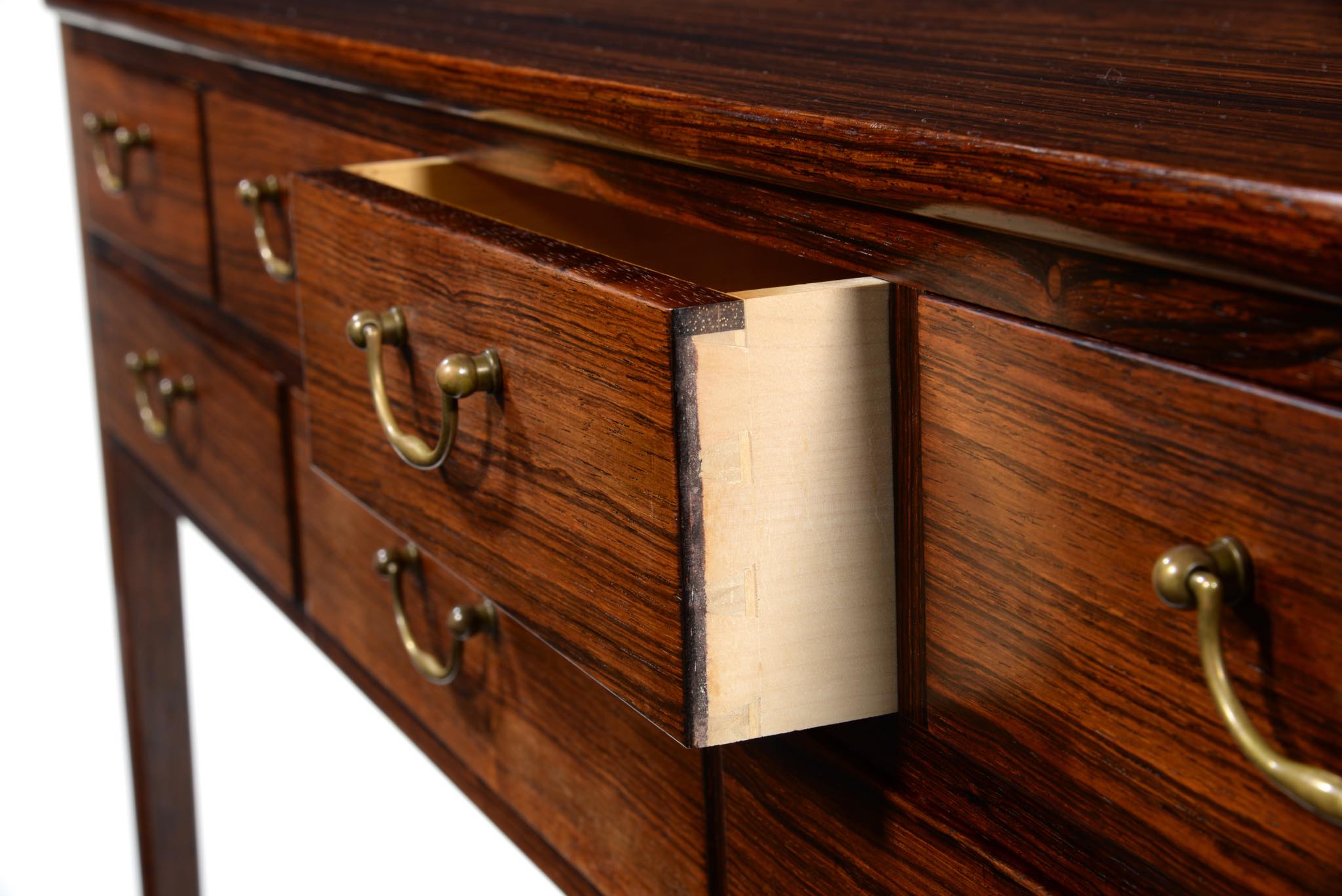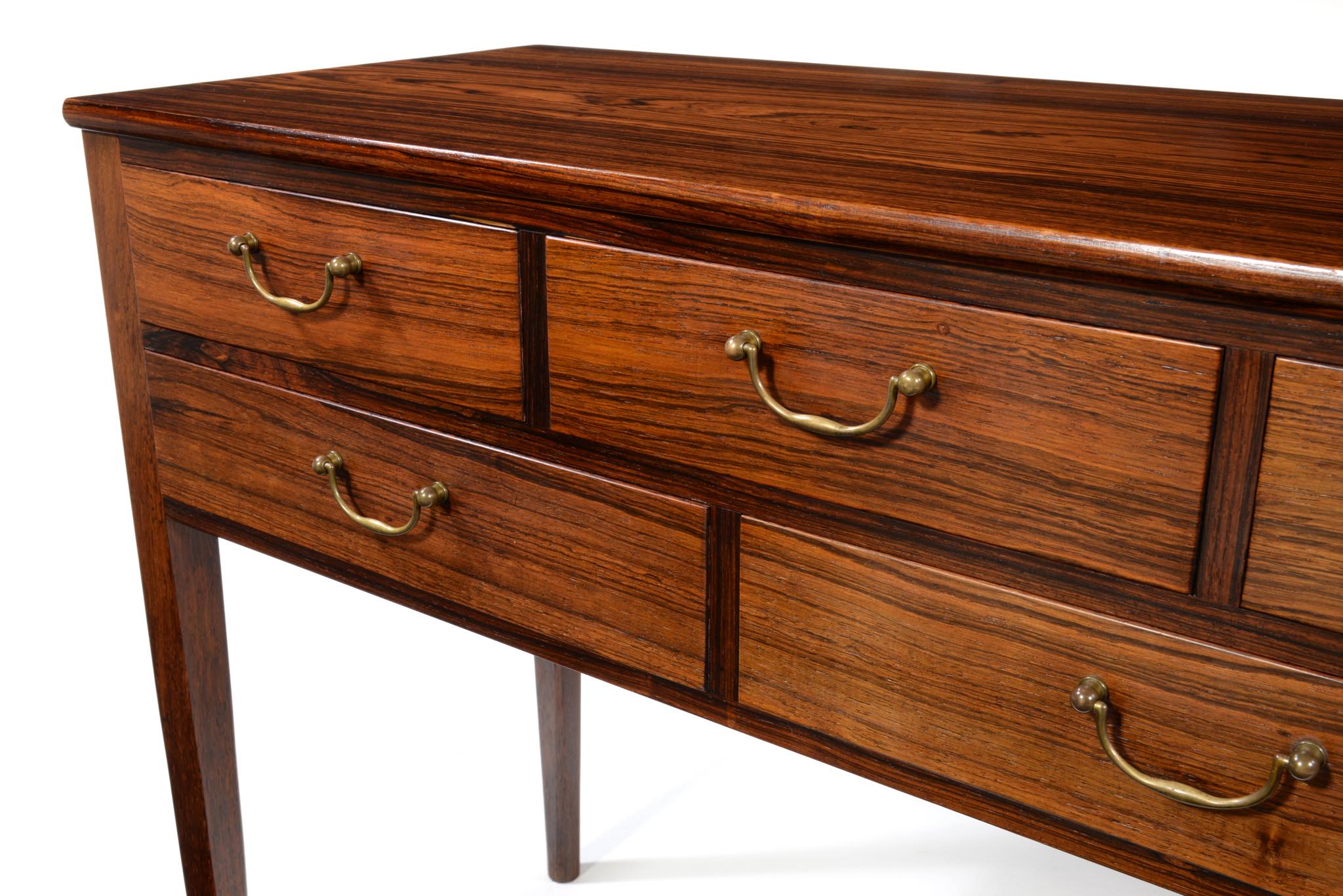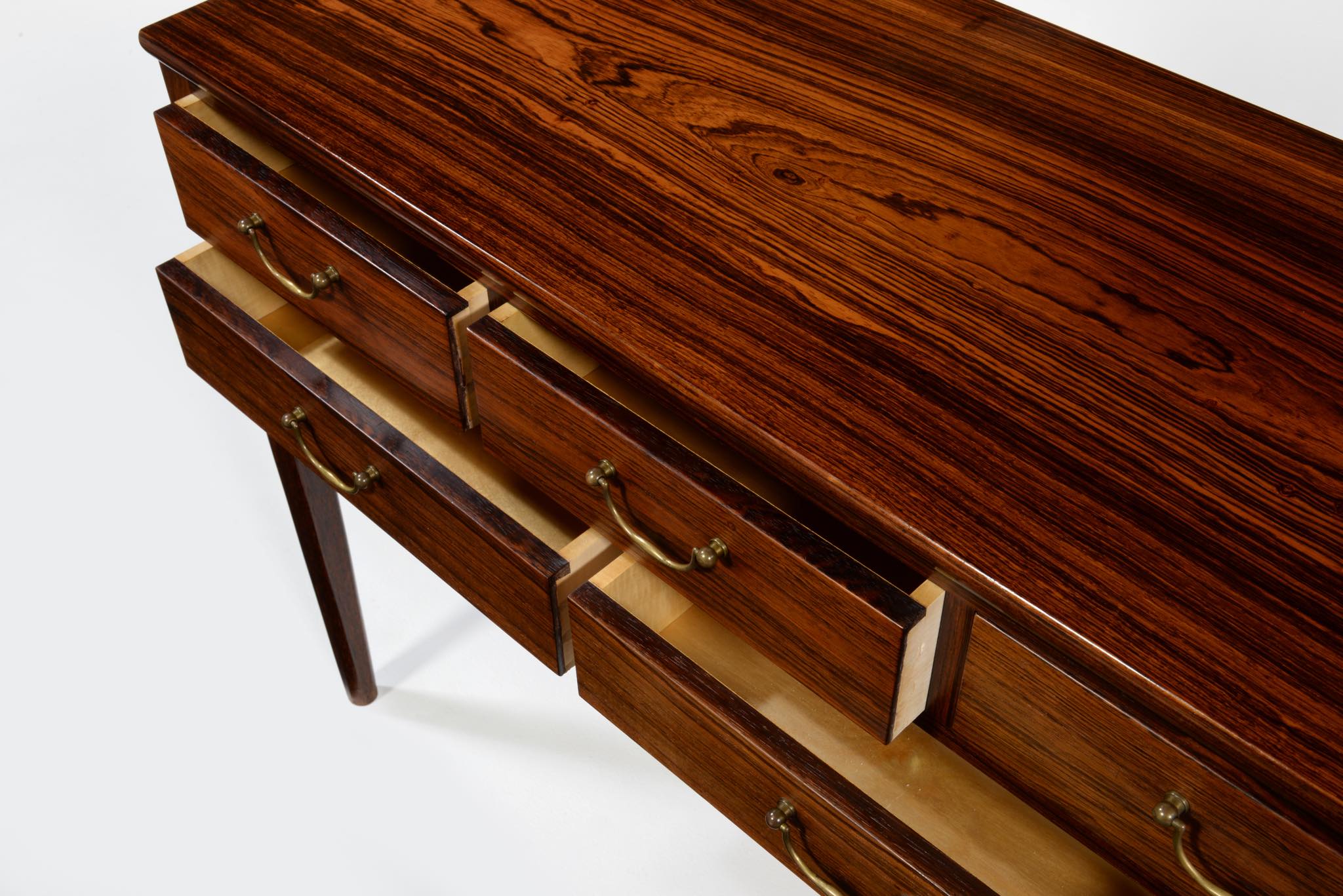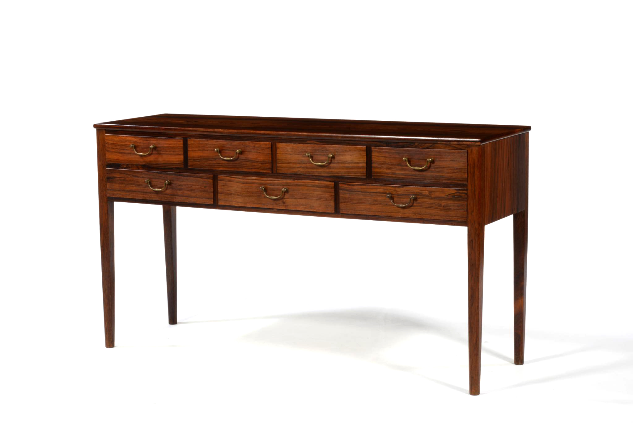 デンマークのデザイナー、Frode Holm/フローデ・ホルムによってデザインされたコンソールテーブルです。フローデ・ホルムは寝室のヴァニティテーブルやチェアなどを手がけ、人気を博したデザイナーです。1950~60年代頃に作られたもので、良質なローズウッドが用いられています。玄関があまり広くないデンマークではコンソール自体の生産量が少ないようで、希少なアイテムとなっています。天板に補修箇所がありますが、全体にきれいな状態です。