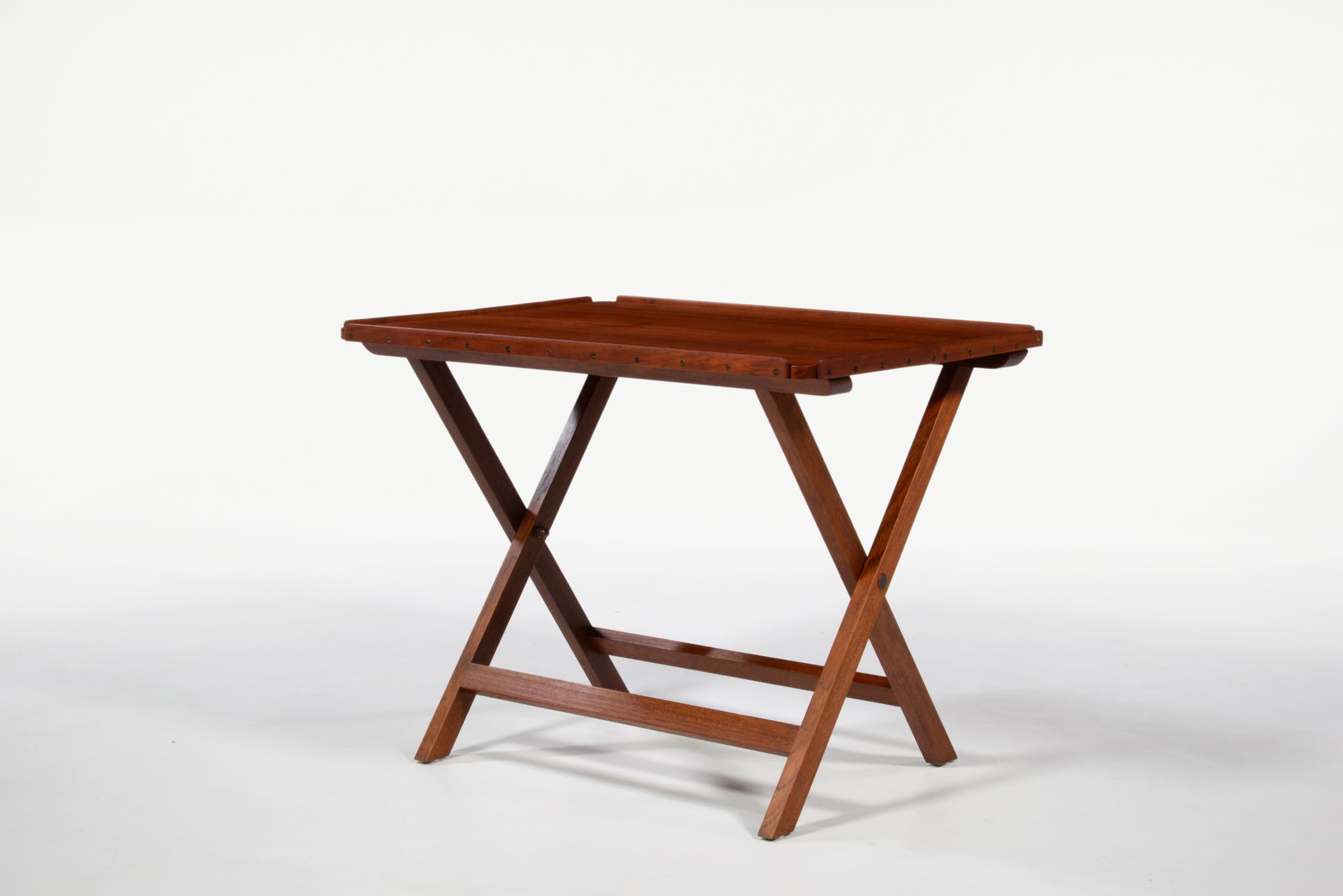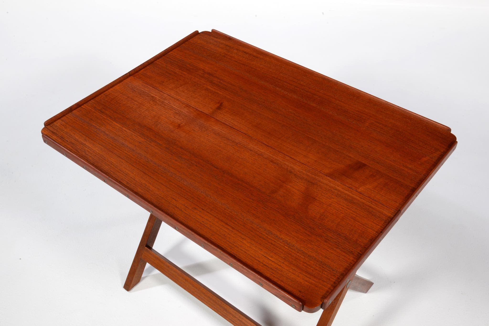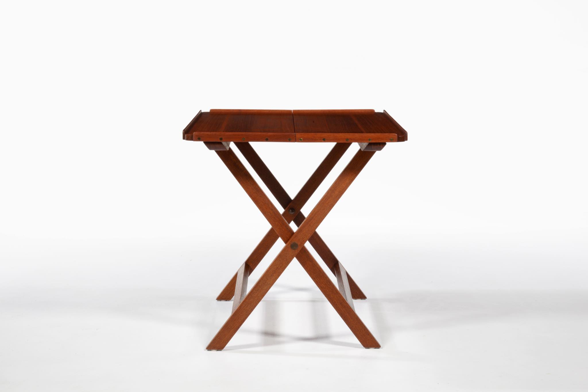「デンマーク近代家具デザインの父」と称され、デザイナーでプロフェッサーを務めた、Kaare Klint/コーア・クリントによるフォールディングテーブルです。フォールディング式のシェーズロングと共にデザインされたもので、使用しないときは畳んで仕舞える構造のものです。良質なチーク材に真鍮の蝶番やビスを用いて組まれています。わずかに修復した部分がございますが、とても綺麗な状態です。
