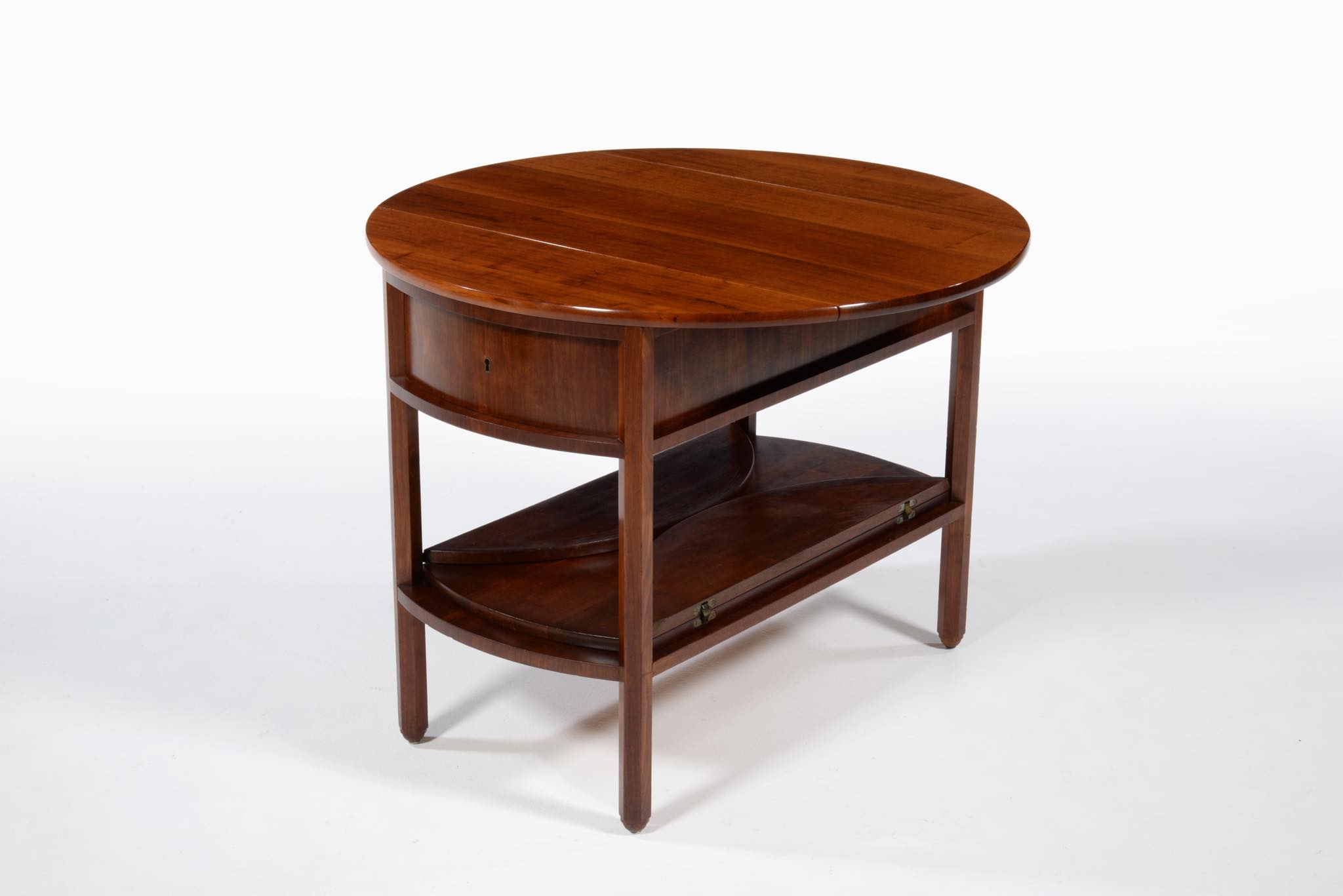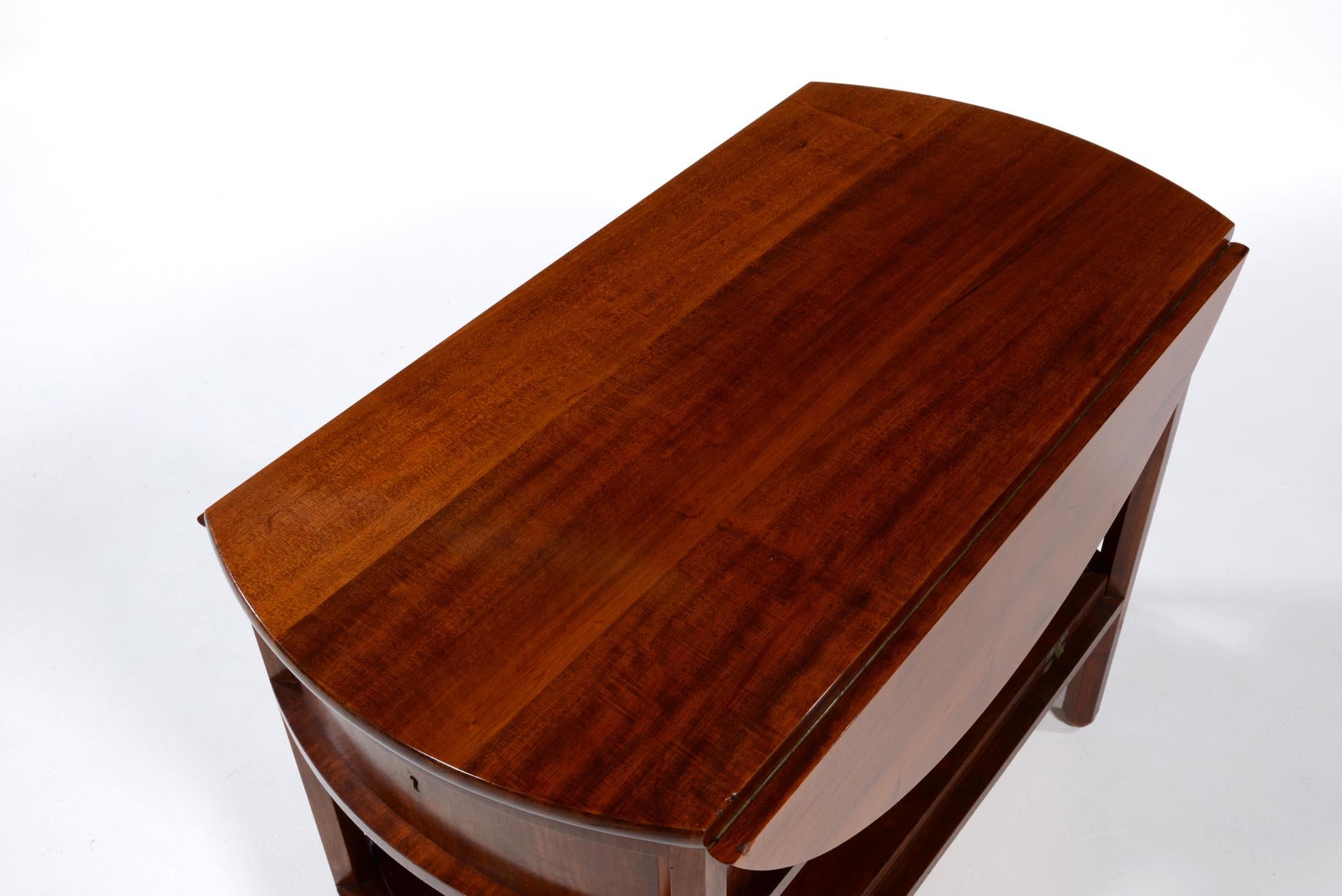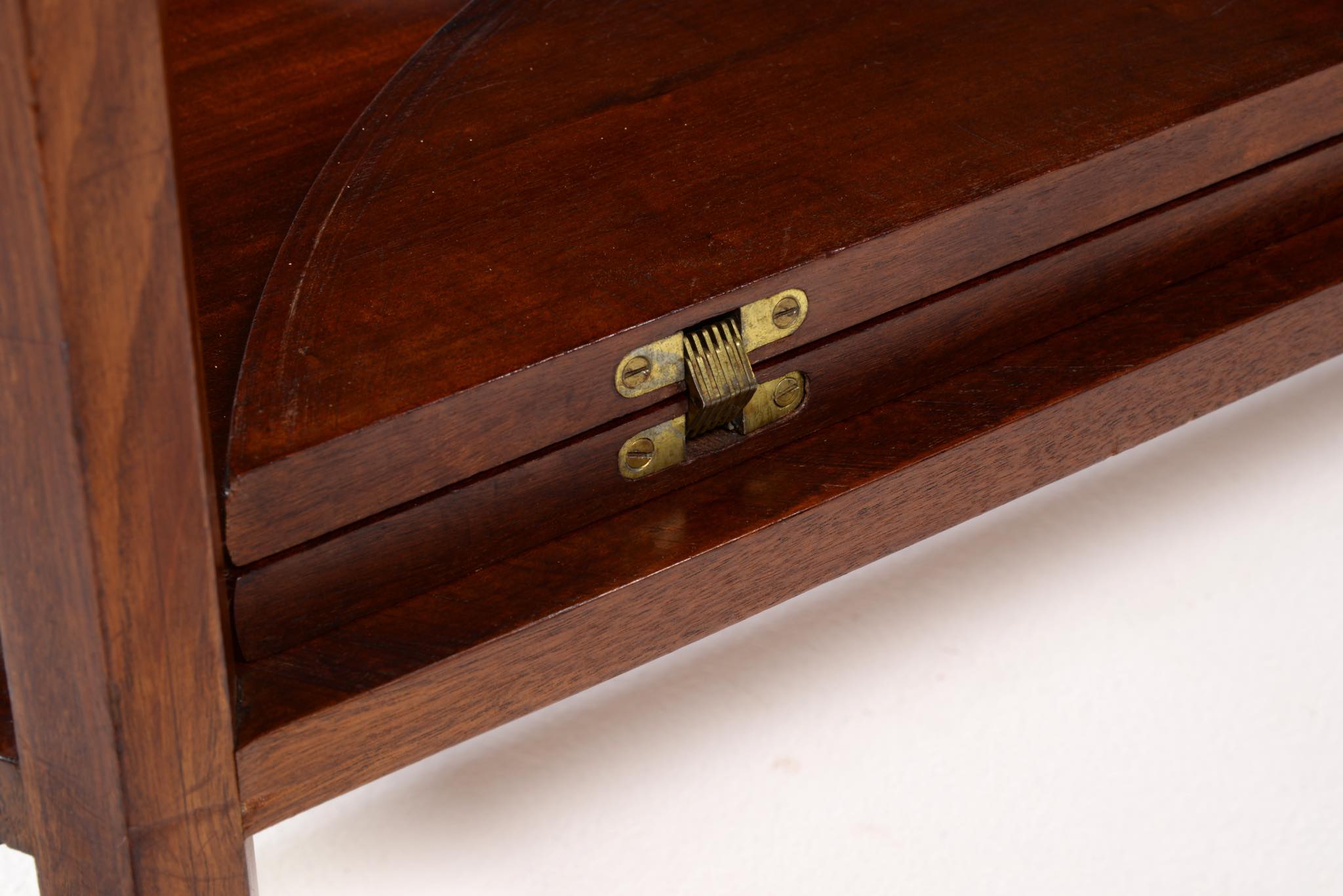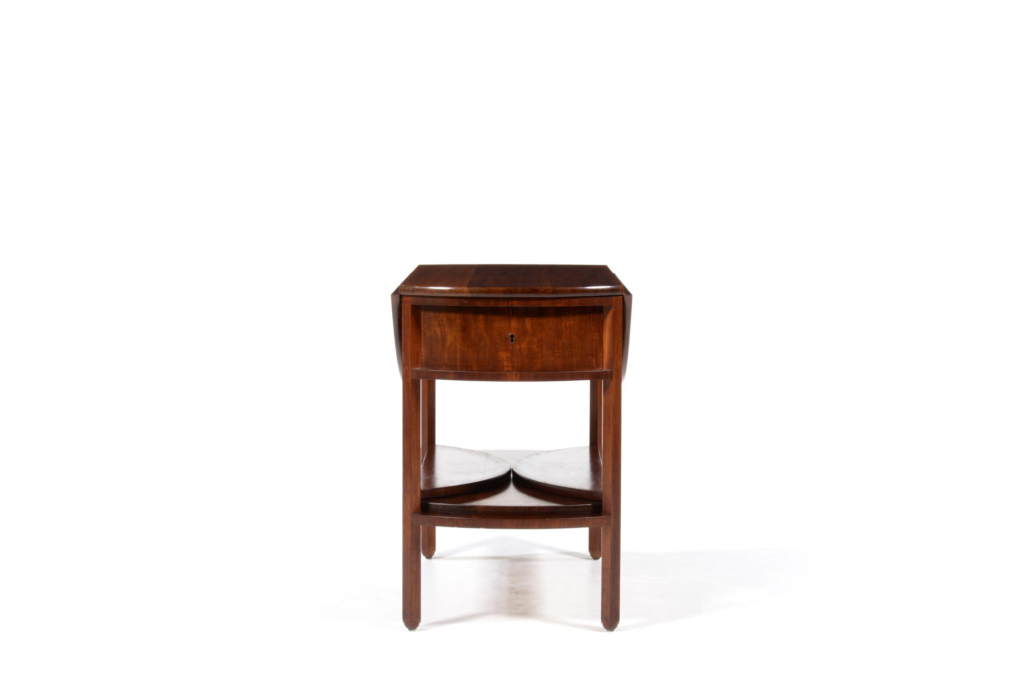 作曲中、一時休止する際にバイオリンなどの楽器を置くためのテーブルです。20世紀前葉のデンマークで活躍した音楽家、Carl Johan Michaelsen/カール・ヨハン・ミカエルセン氏が自身のスタジオで使用していたもので、近年、ファミリーより売り立てられました。氏のスタジオの楽器収納キャビネットは、かつてコーア・クリントが設計した記録が残されています。(資料:Architectural drawings)このテーブルもクリントによるデザインではないかと推測されているようですが、詳細はわかっておりません。おそらくワンオフで作られたもので、その作行きから、キャビネットメーカーのN.C. Jensen Kjær工房製ではないかと云われています。1920年代頃に作られたもので、素材には貴重な材種として知られるキューバンマホガニーの無垢材が用いられています。ドロップリーフを備えた天板は拡張と縮小を行うことができ、棚板も面積を広げることができます。天板を畳んだ際にはランプテーブルのように椅子と椅子の間に設置することができるでしょう。とても丁寧に作られています。
