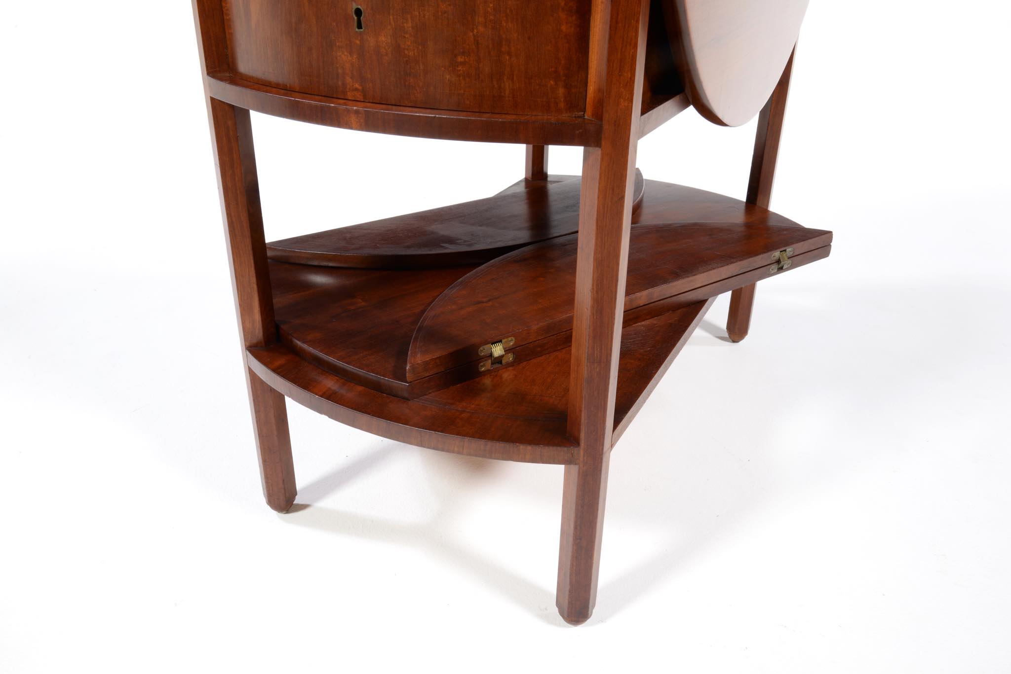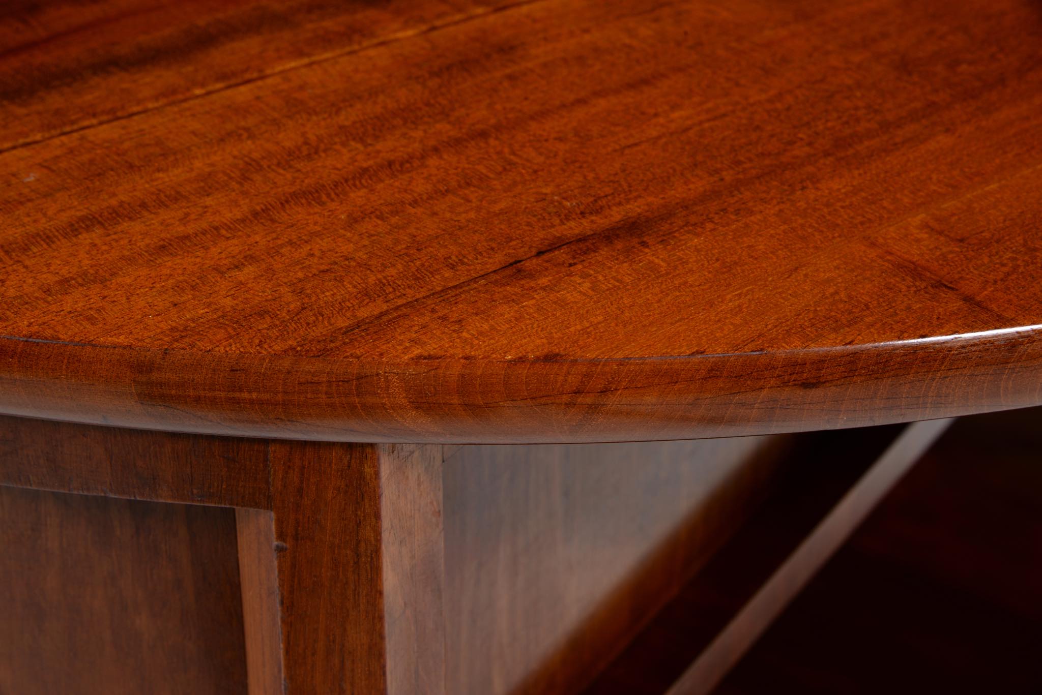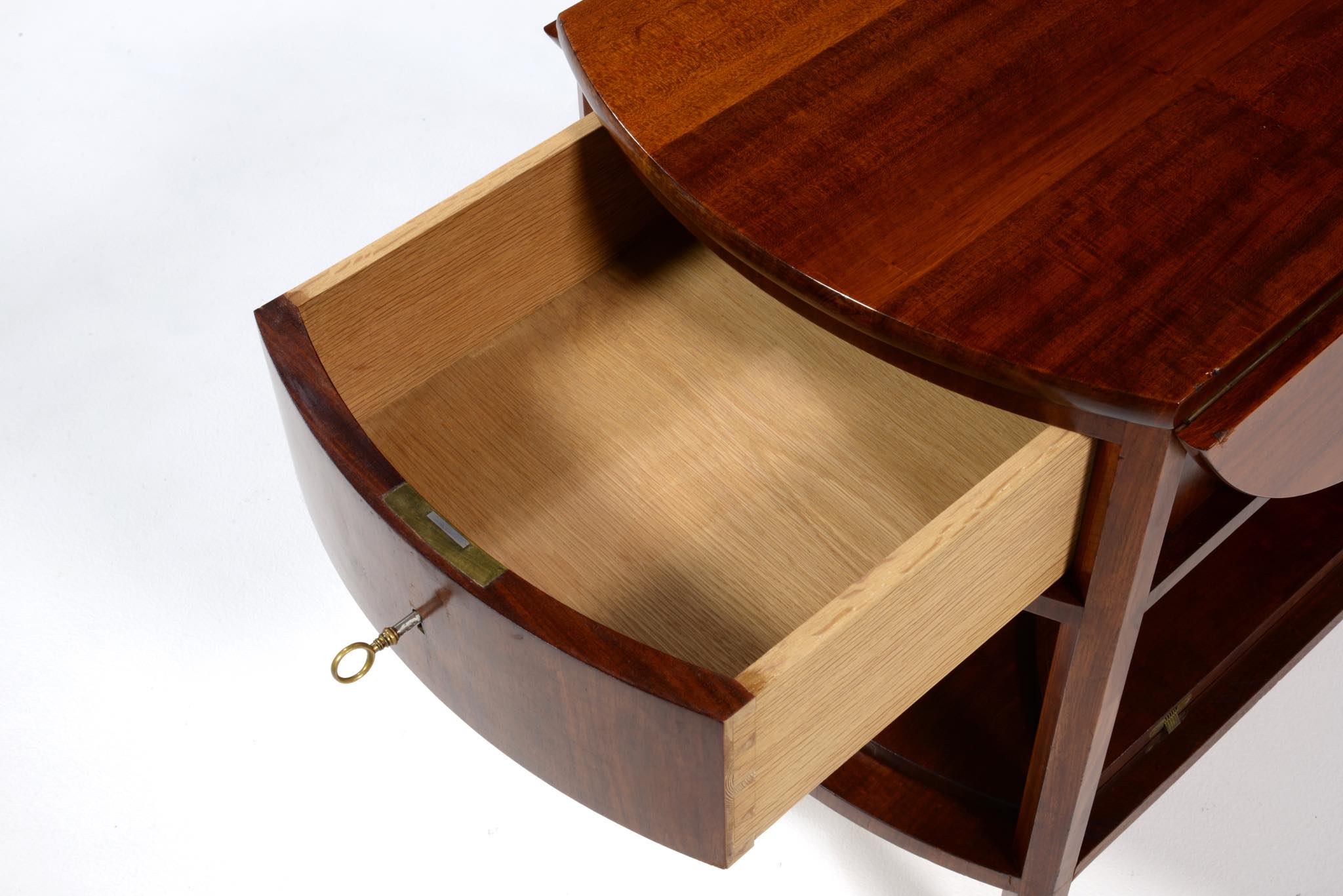 作曲中、一時休止する際にバイオリンなどの楽器を置くためのテーブルです。20世紀前葉のデンマークで活躍した音楽家、Carl Johan Michaelsen/カール・ヨハン・ミカエルセン氏が自身のスタジオで使用していたもので、近年、ファミリーより売り立てられました。氏のスタジオの楽器収納キャビネットは、かつてコーア・クリントが設計した記録が残されています。(資料:Architectural drawings)このテーブルもクリントによるデザインではないかと推測されているようですが、詳細はわかっておりません。おそらくワンオフで作られたもので、その作行きから、キャビネットメーカーのN.C. Jensen Kjær工房製ではないかと云われています。1920年代頃に作られたもので、素材には貴重な材種として知られるキューバンマホガニーの無垢材が用いられています。ドロップリーフを備えた天板は拡張と縮小を行うことができ、棚板も面積を広げることができます。天板を畳んだ際にはランプテーブルのように椅子と椅子の間に設置することができるでしょう。とても丁寧に作られています。