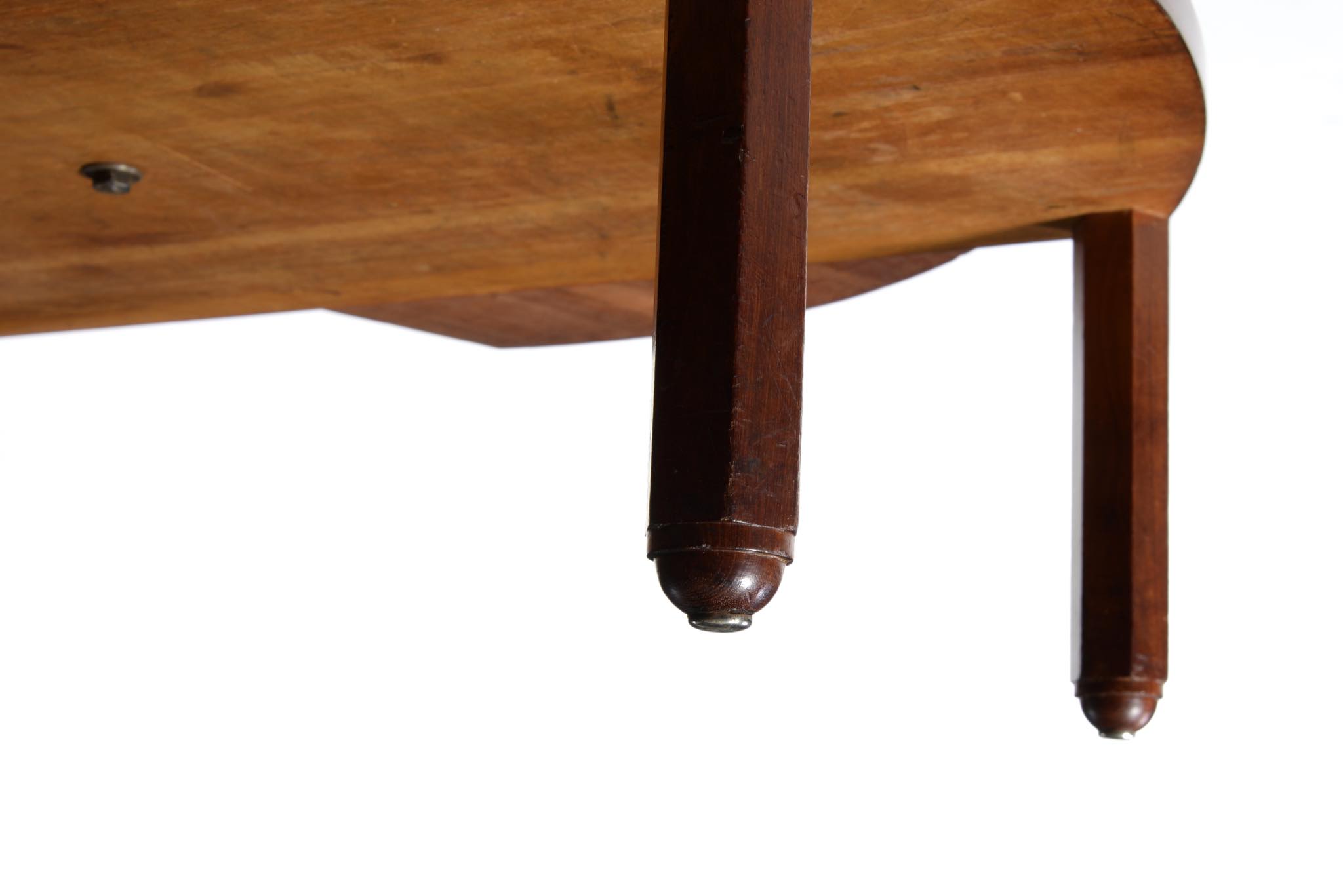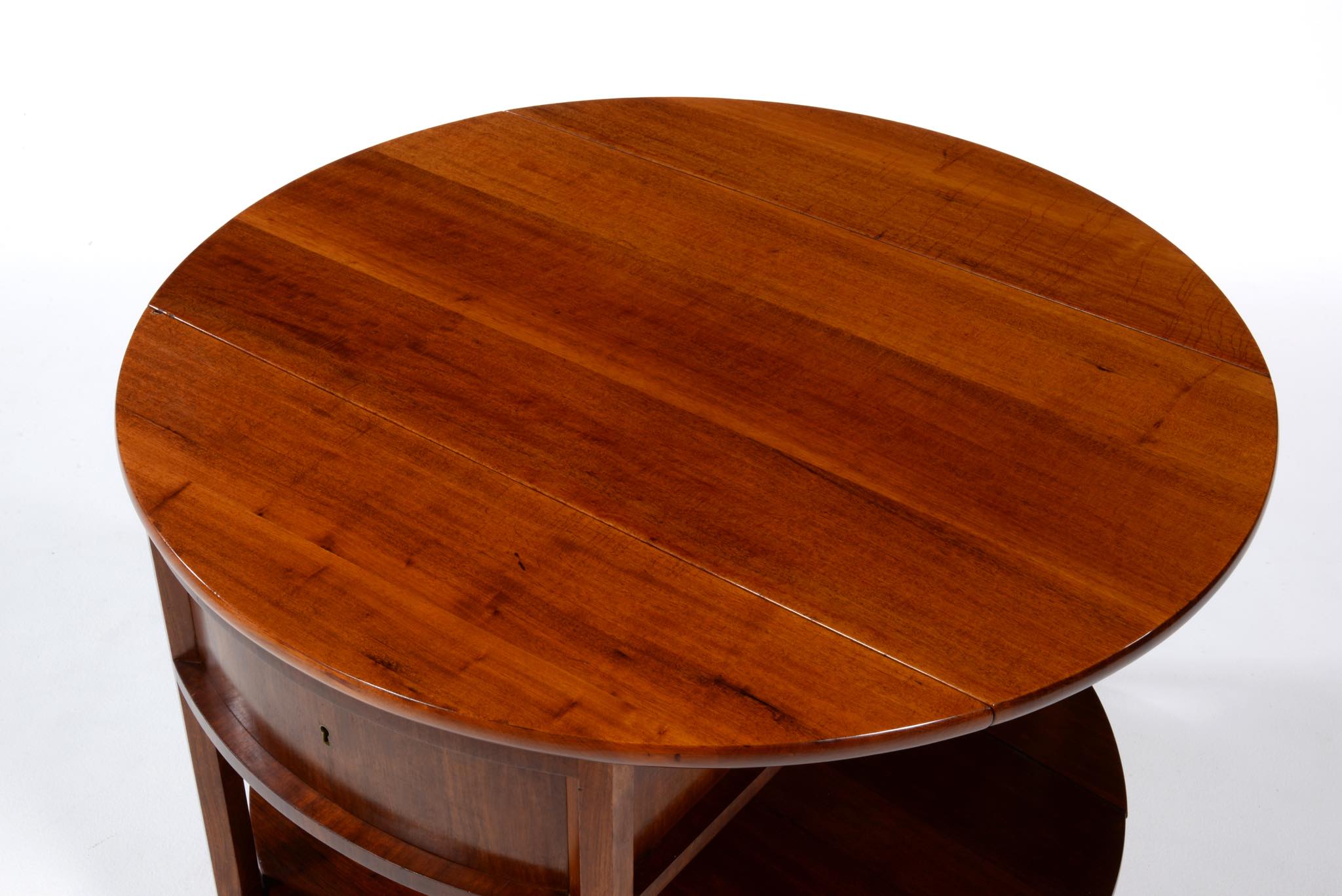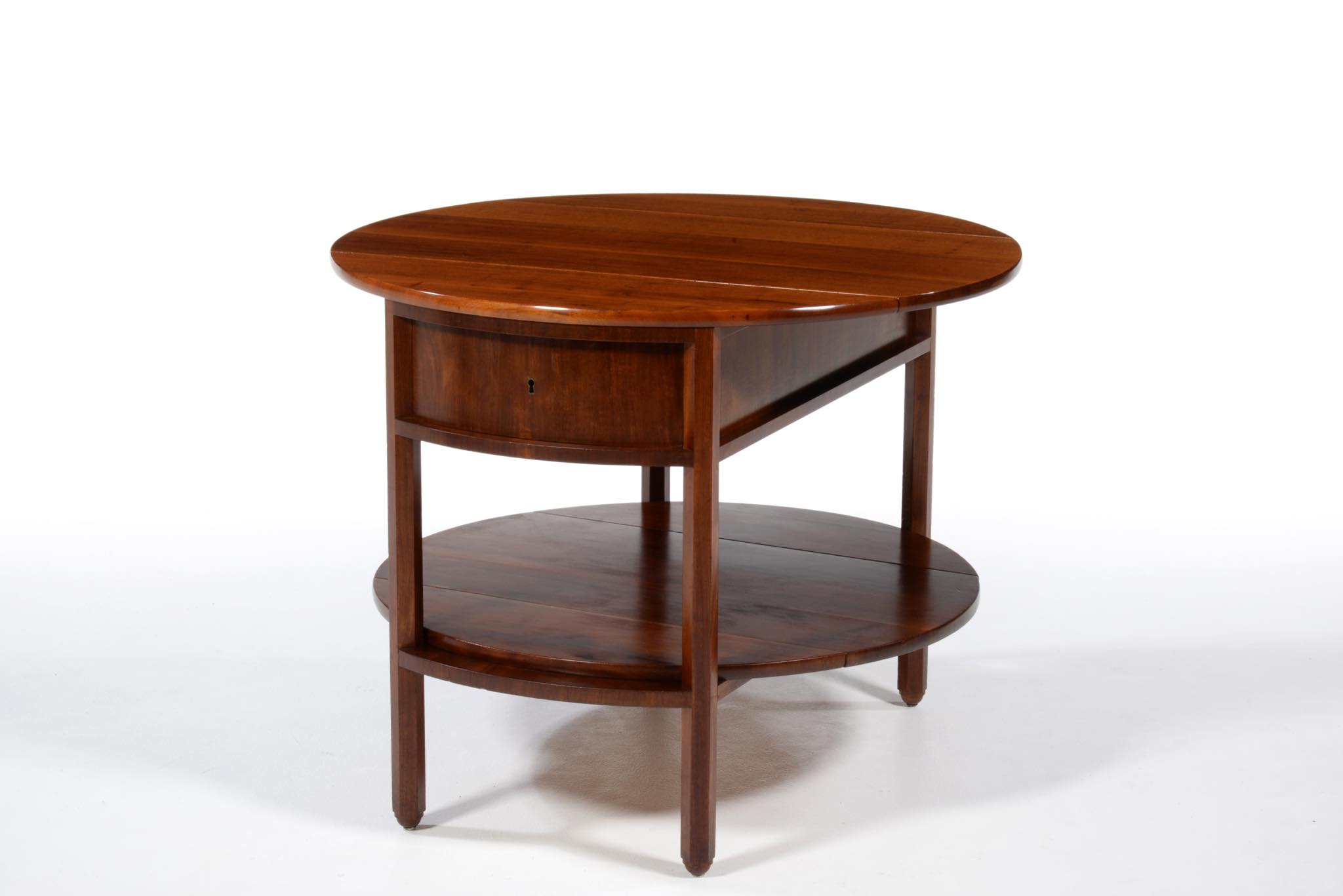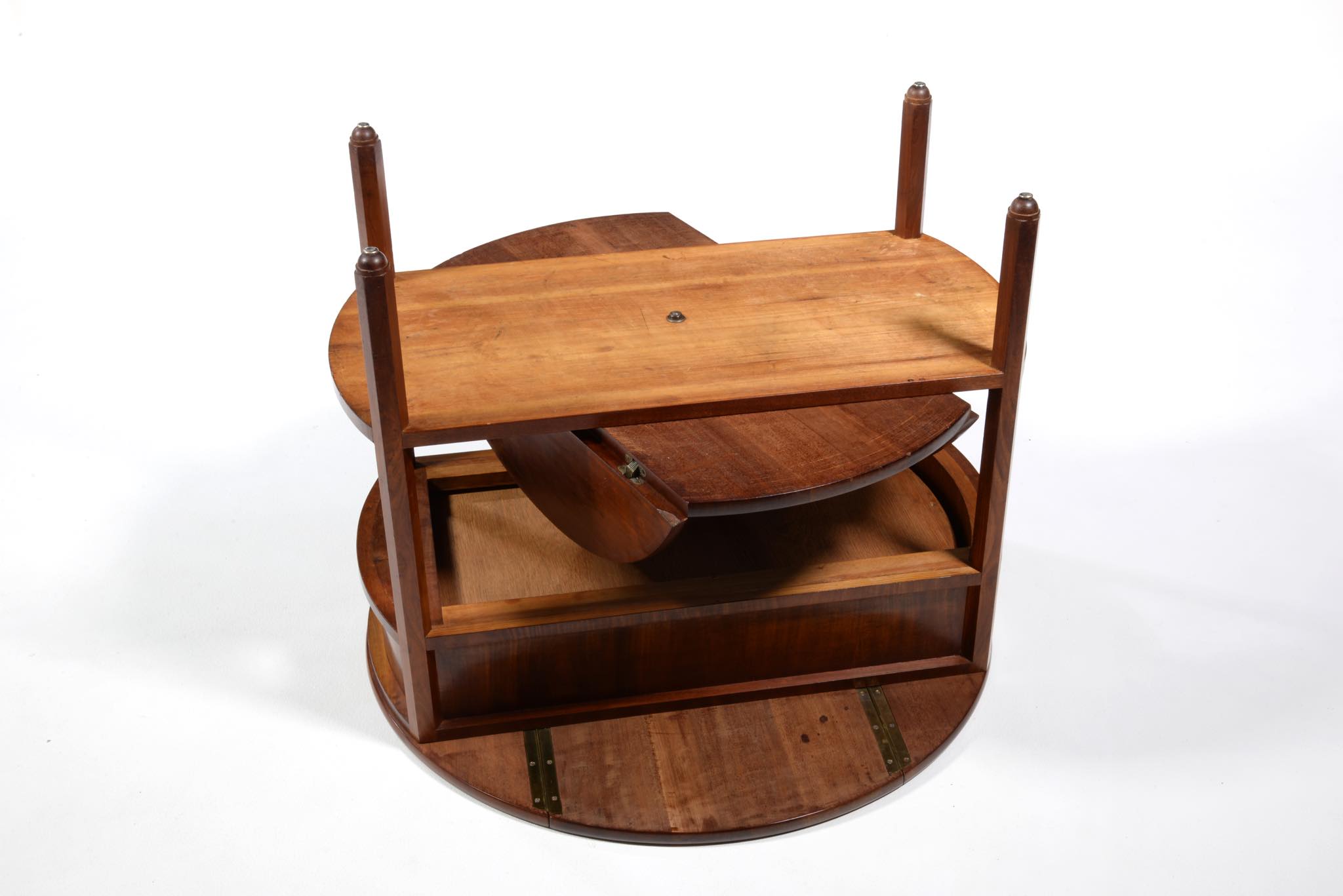 作曲中、一時休止する際にバイオリンなどの楽器を置くためのテーブルです。20世紀前葉のデンマークで活躍した音楽家、Carl Johan Michaelsen/カール・ヨハン・ミカエルセン氏が自身のスタジオで使用していたもので、近年、ファミリーより売り立てられました。氏のスタジオの楽器収納キャビネットは、かつてコーア・クリントが設計した記録が残されています。(資料:Architectural drawings)このテーブルもクリントによるデザインではないかと推測されているようですが、詳細はわかっておりません。おそらくワンオフで作られたもので、その作行きから、キャビネットメーカーのN.C. Jensen Kjær工房製ではないかと云われています。1920年代頃に作られたもので、素材には貴重な材種として知られるキューバンマホガニーの無垢材が用いられています。ドロップリーフを備えた天板は拡張と縮小を行うことができ、棚板も面積を広げることができます。天板を畳んだ際にはランプテーブルのように椅子と椅子の間に設置することができるでしょう。とても丁寧に作られています。