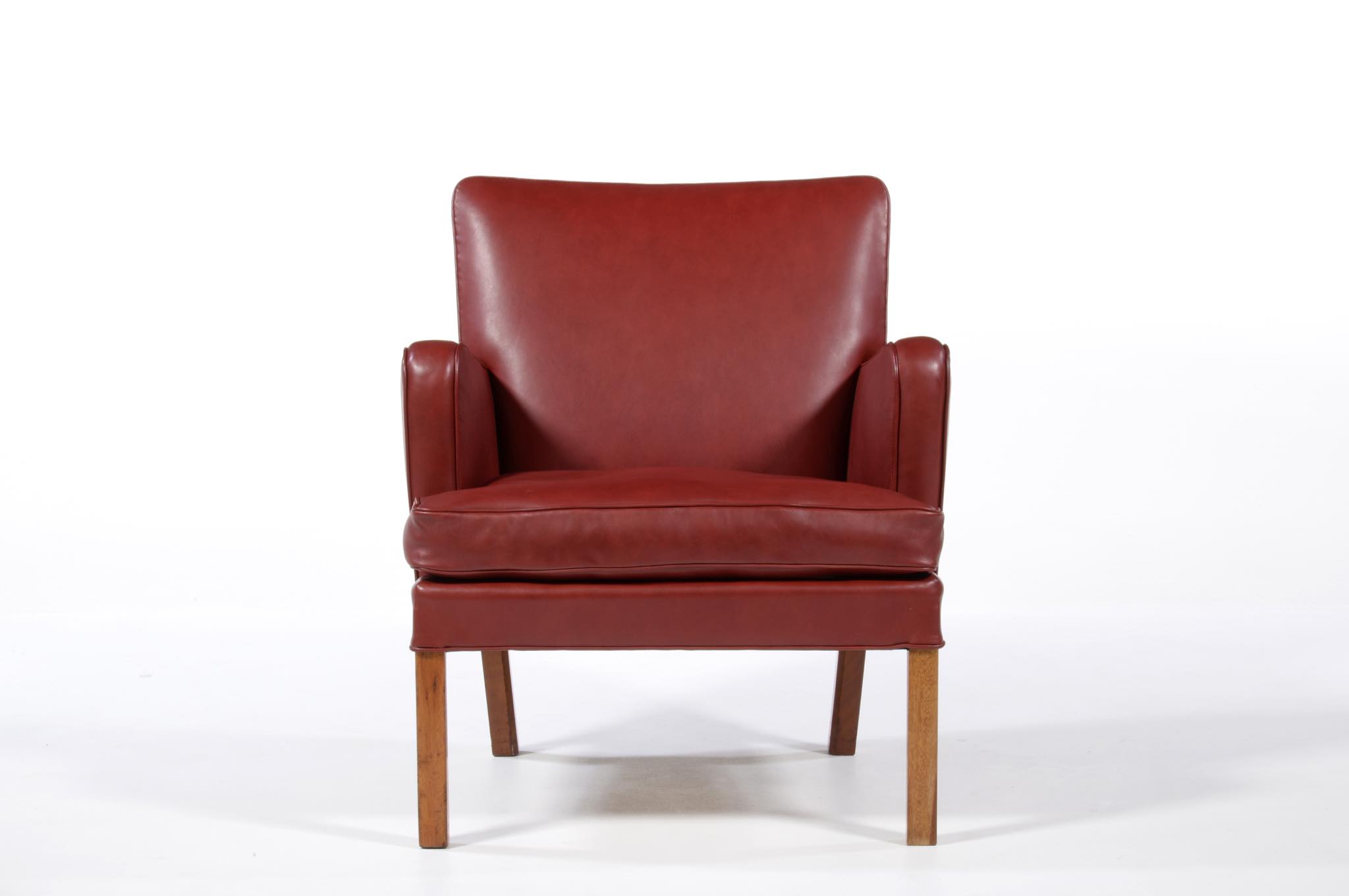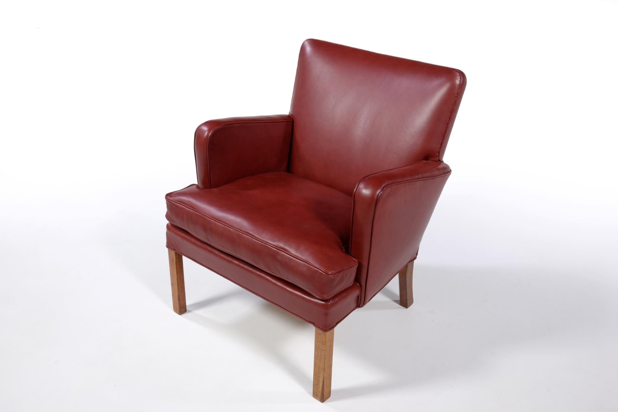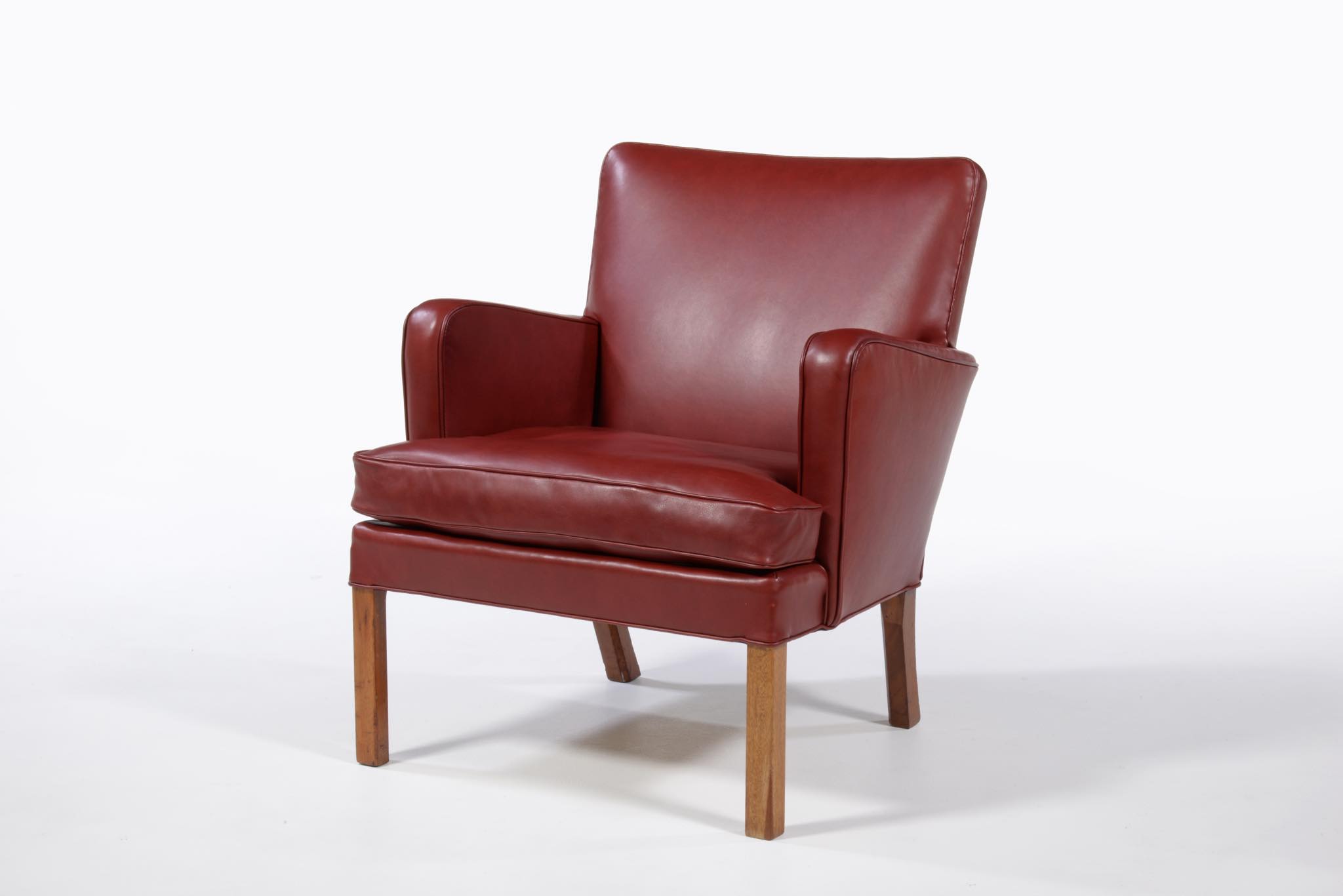 「デンマーク近代家具デザインの父」と称され、デザイナーでプロフェッサーを務めた、Kaare Klint/コーア・クリントによる "model 5313" イージーチェア初期タイプです。1936年にデザインされ、1937年開催のコペンハーゲンキャビネットメーカーズギルド展にて発表されたモデルです。1960年まで製作されていたようですが、こちらのイージーチェアは比較的早い時期に作られたものと思われます。デンマークのソーレンセンレザー社の皮革にて張り替えを行い、シートに内包された羽毛クッションも新調しました。シートクッションは使い込むうちに馴染んでくるでしょう。