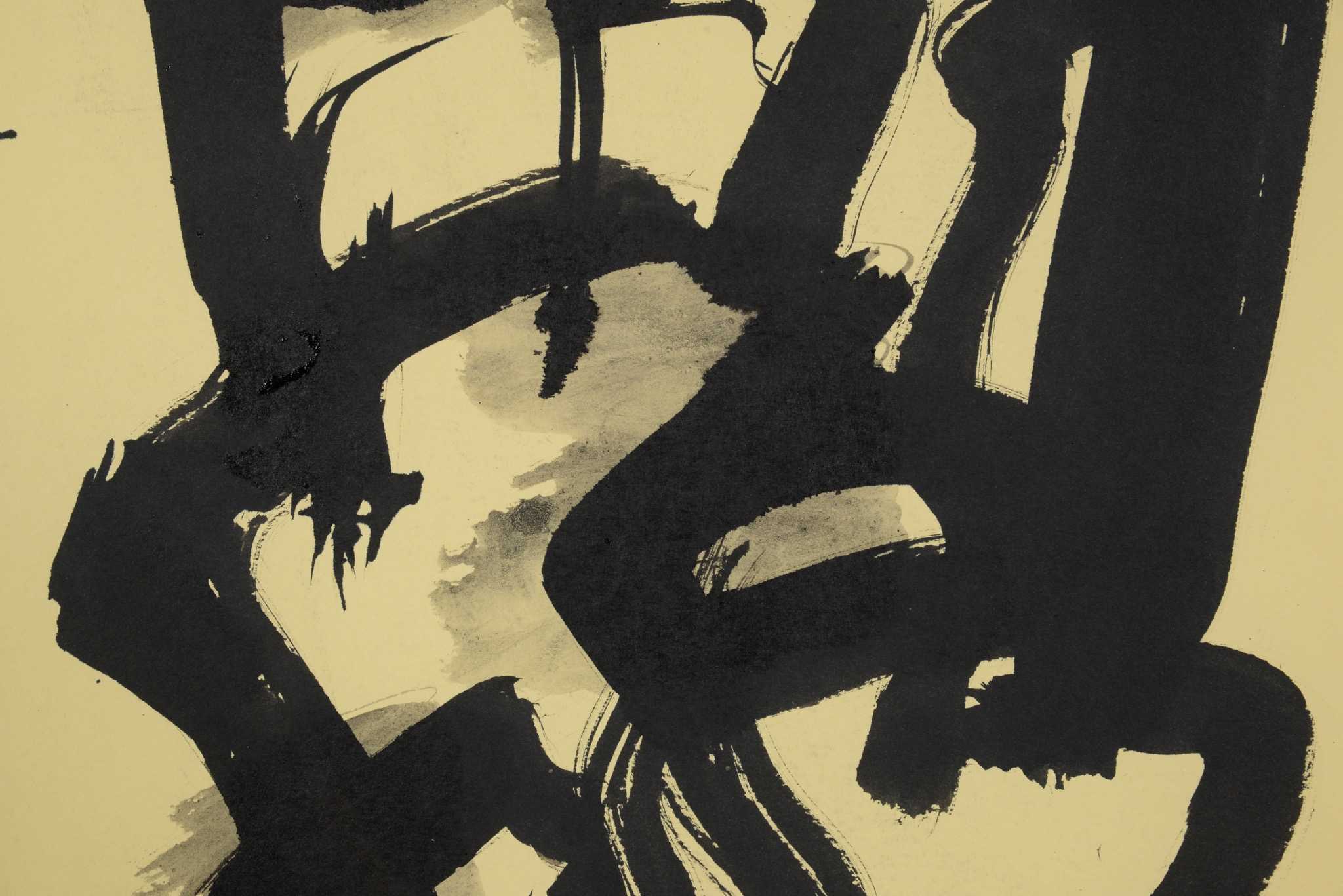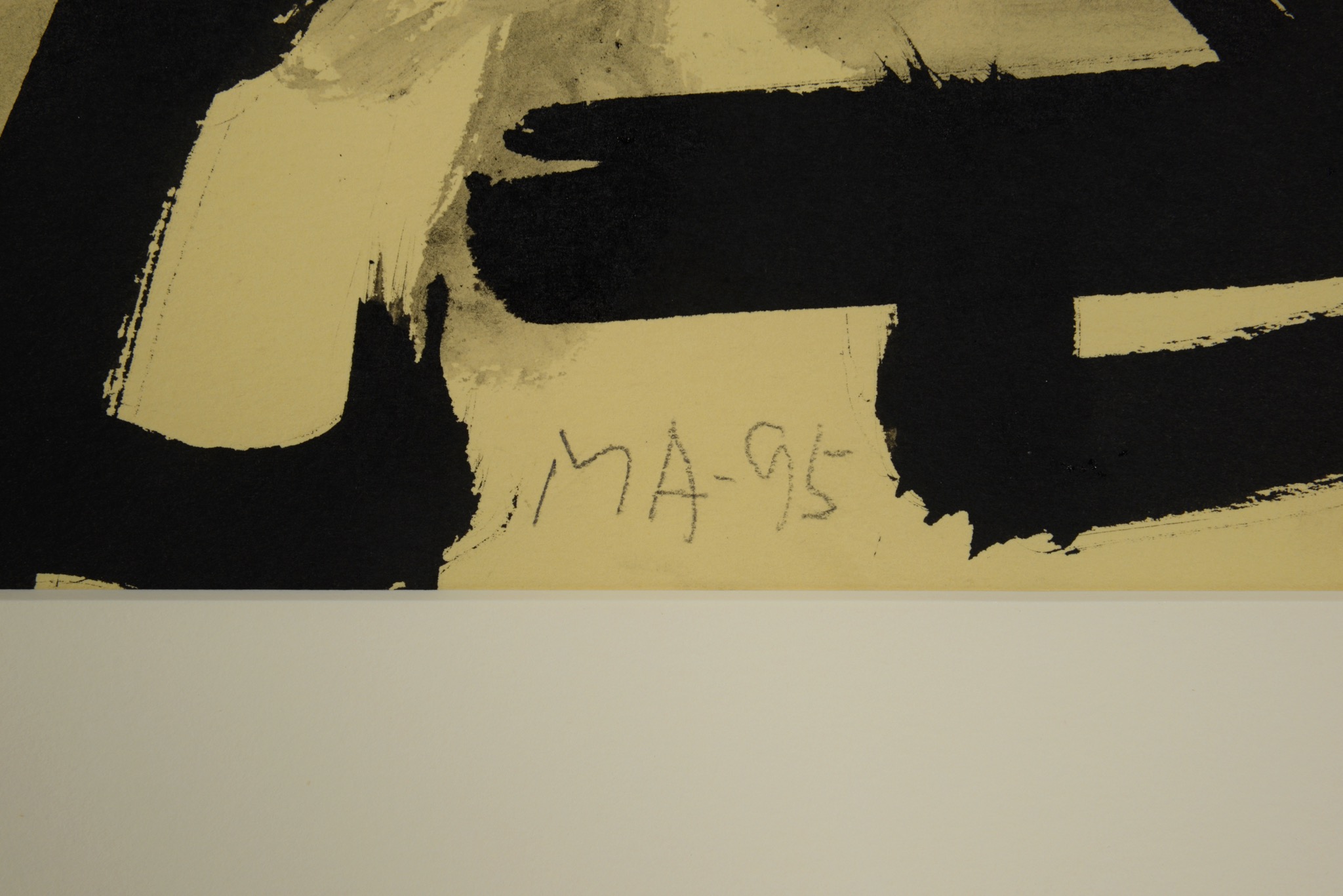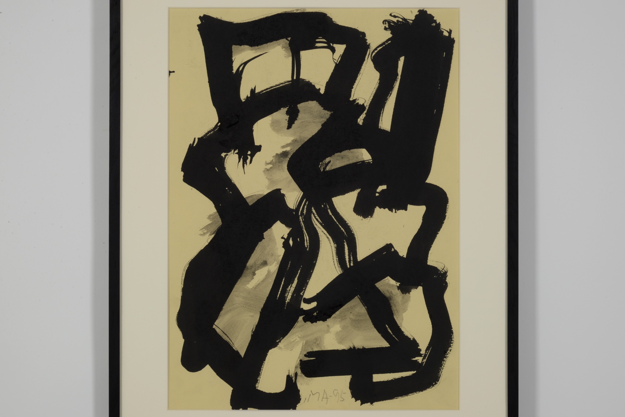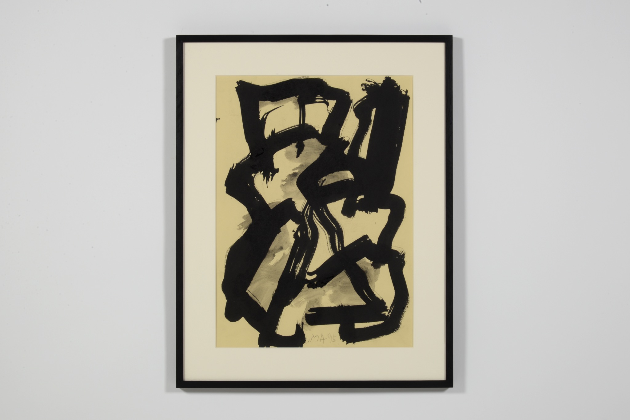 デンマークの芸術家、Mogens Andersen/モーエンス・アナセンによる水彩画作品です。厚紙に墨黒のようなインクで描かれた作品で、絵の具はアクリルガッシュのようにも見えます。フレームは黒の木地で新たに額装しました。小振りなサイズ感ですが晩年の力強さを感じる作品です。