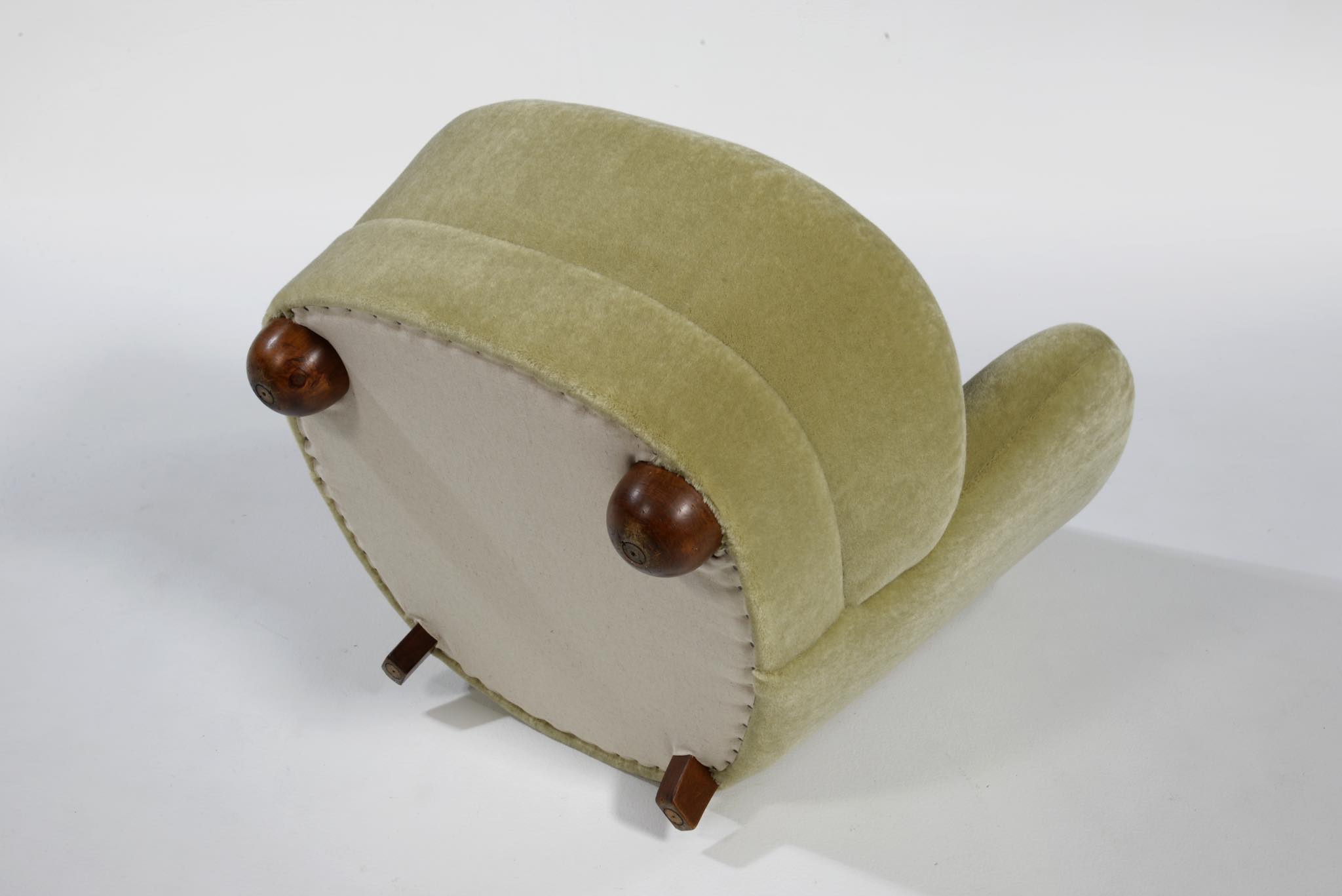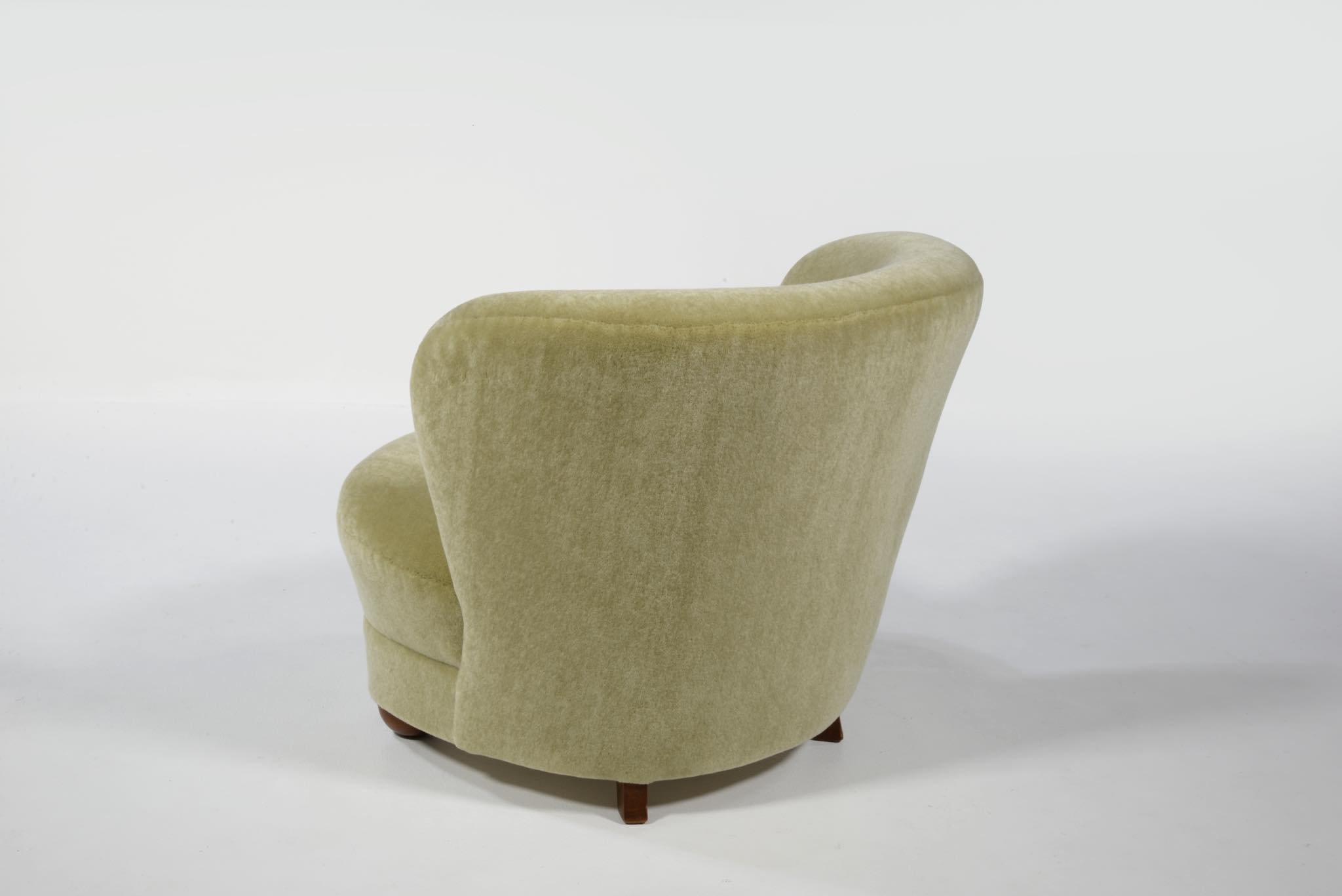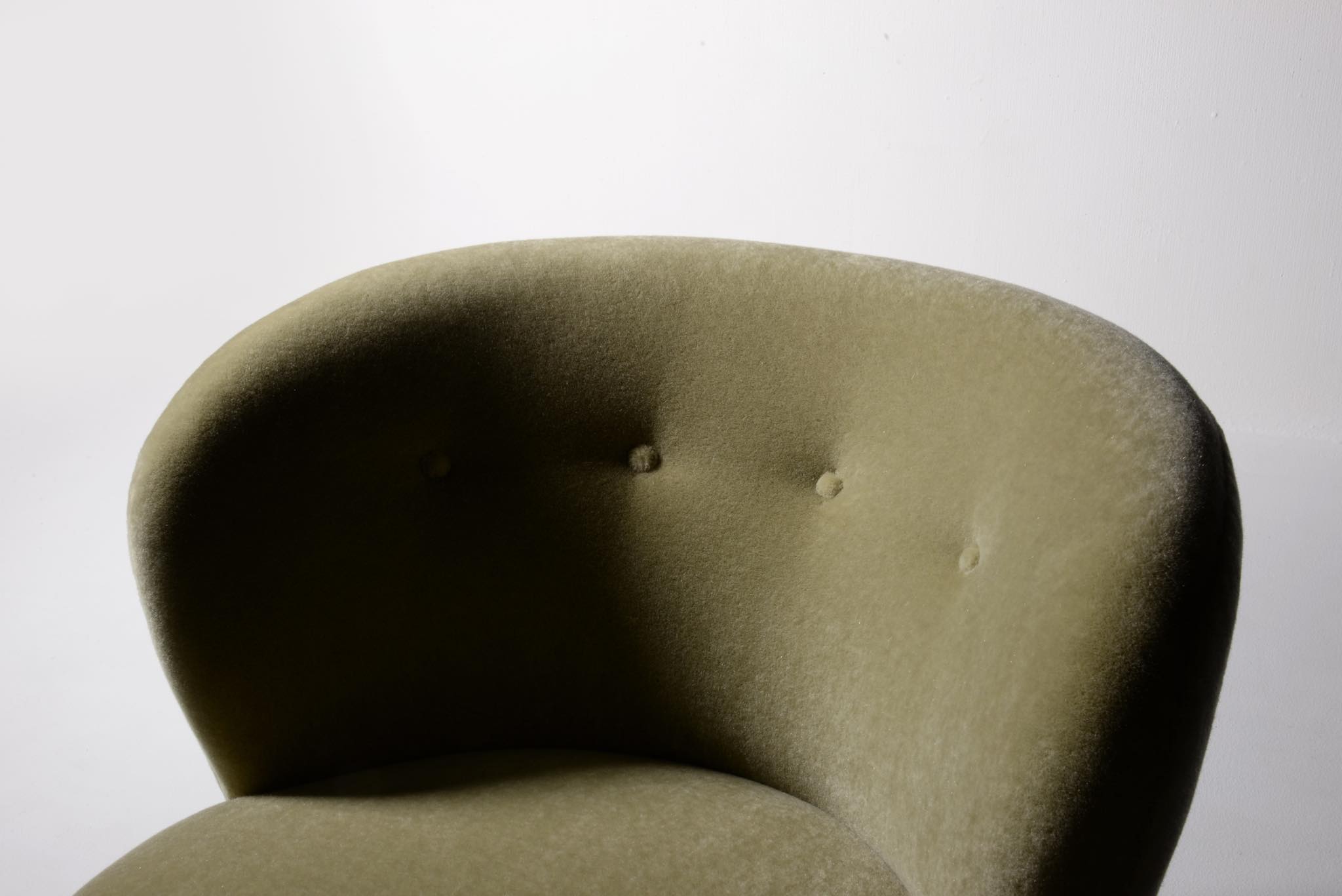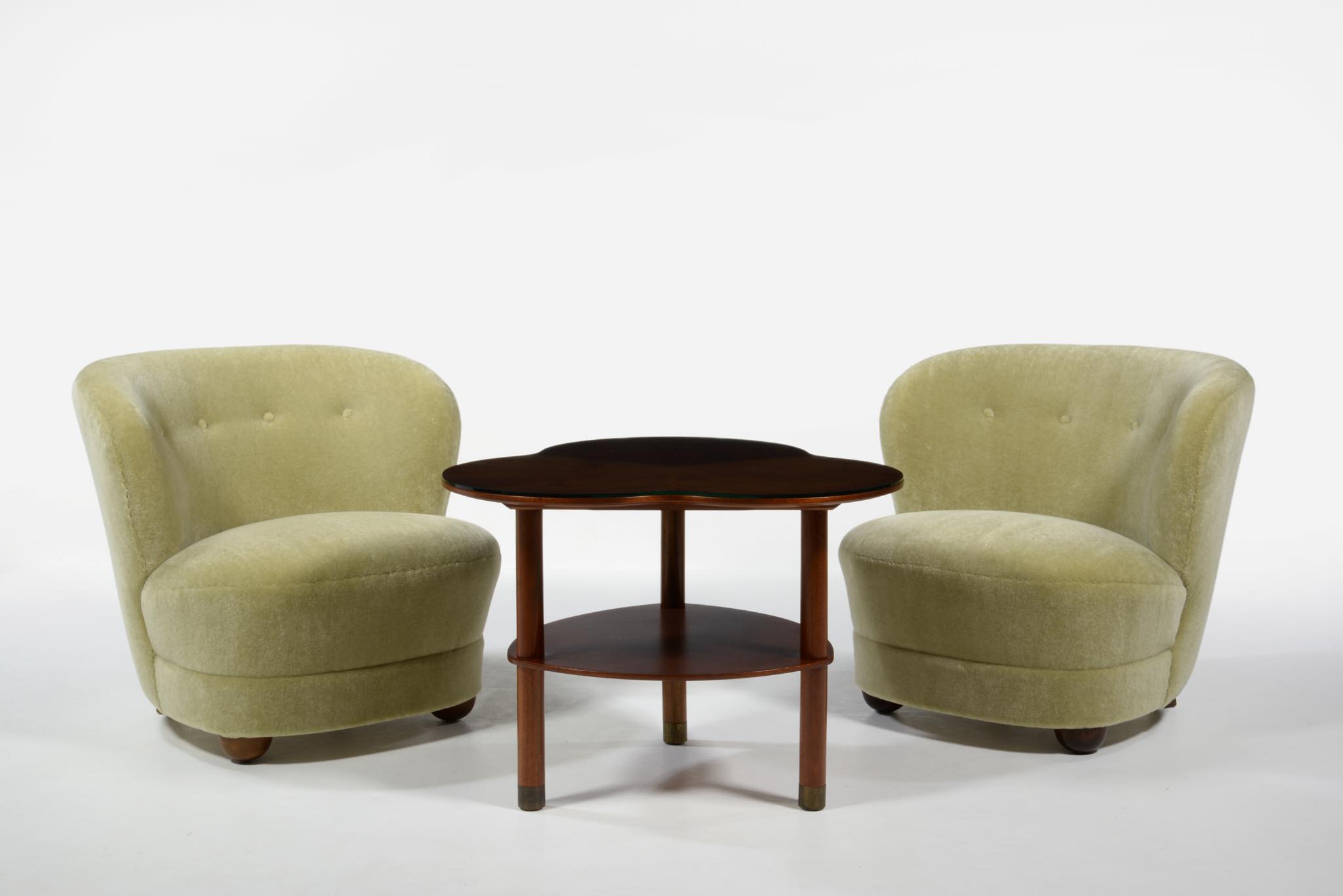 デンマークの家具工房で作られたイージーチェア一対で、1930年代頃に作られたものでしょう。デザイナーや工房など詳しい事は分かりませんが、アールデコ期の時代を反映した作りとなっています。内部クッションは椰子繊維などの天然素材が使われており、とても座りやすい椅子です。ファブリックはアンゴラ山羊のモヘアを用いて張り替えました。こちらは一対での販売となります。