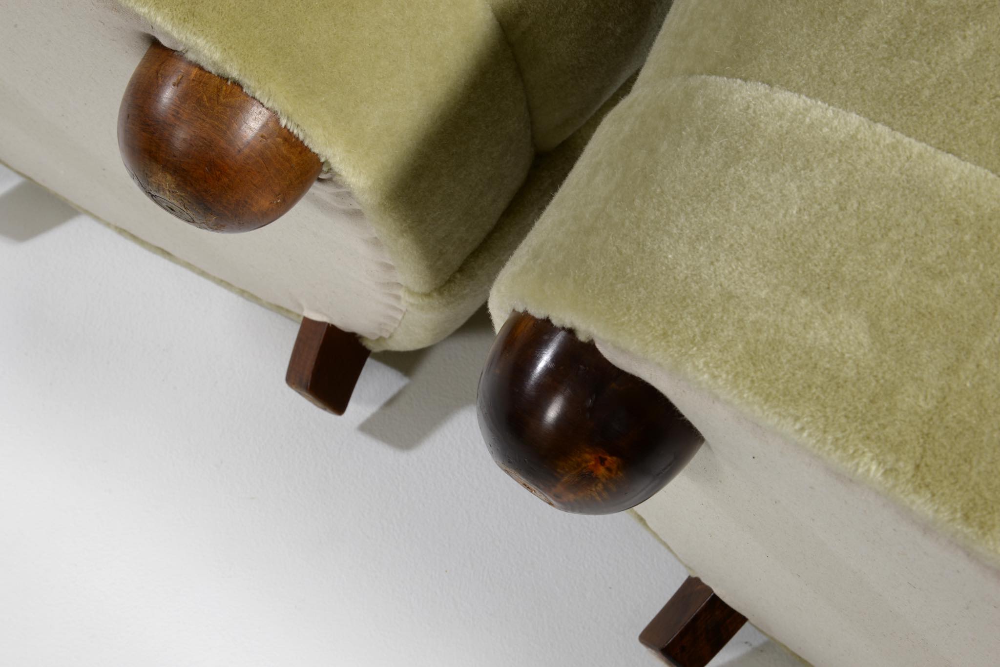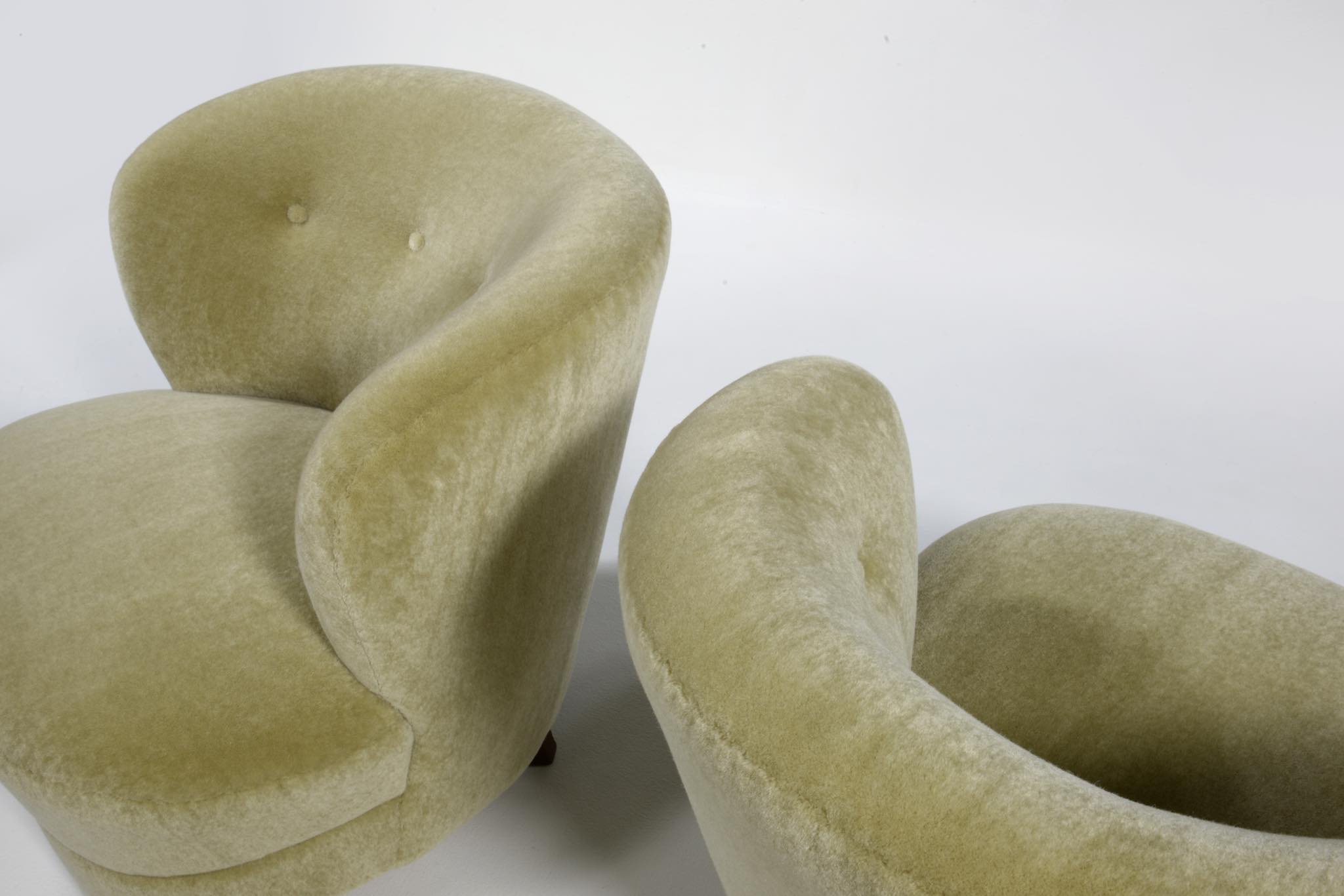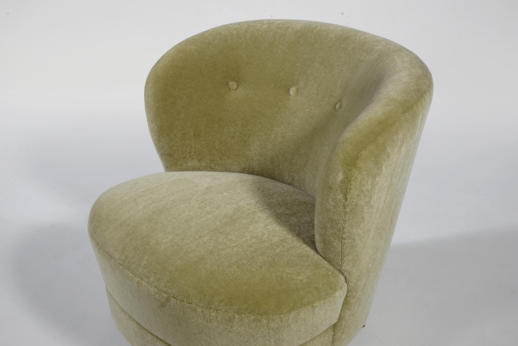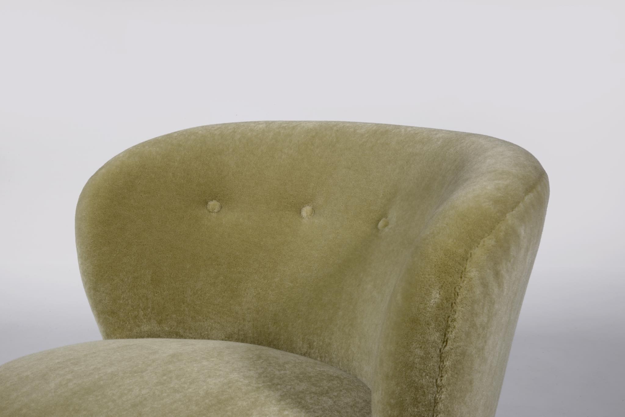デンマークの家具工房で作られたイージーチェア一対で、1930年代頃に作られたものでしょう。デザイナーや工房など詳しい事は分かりませんが、アールデコ期の時代を反映した作りとなっています。内部クッションは椰子繊維などの天然素材が使われており、とても座りやすい椅子です。ファブリックはアンゴラ山羊のモヘアを用いて張り替えました。こちらは一対での販売となります。
