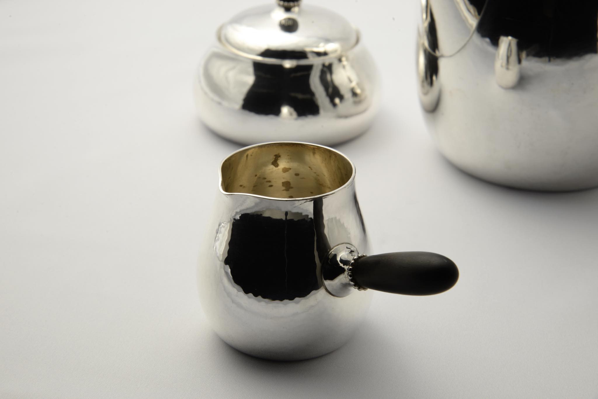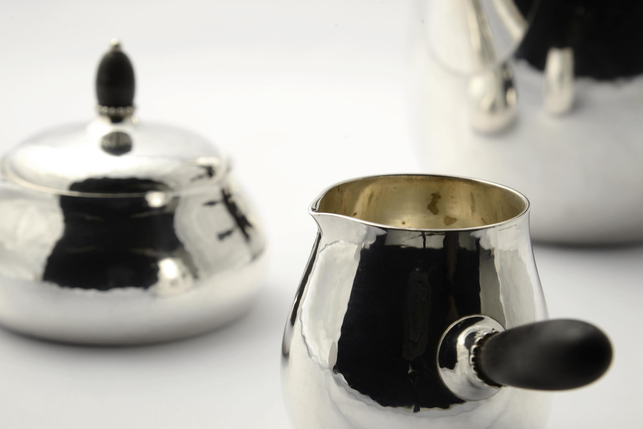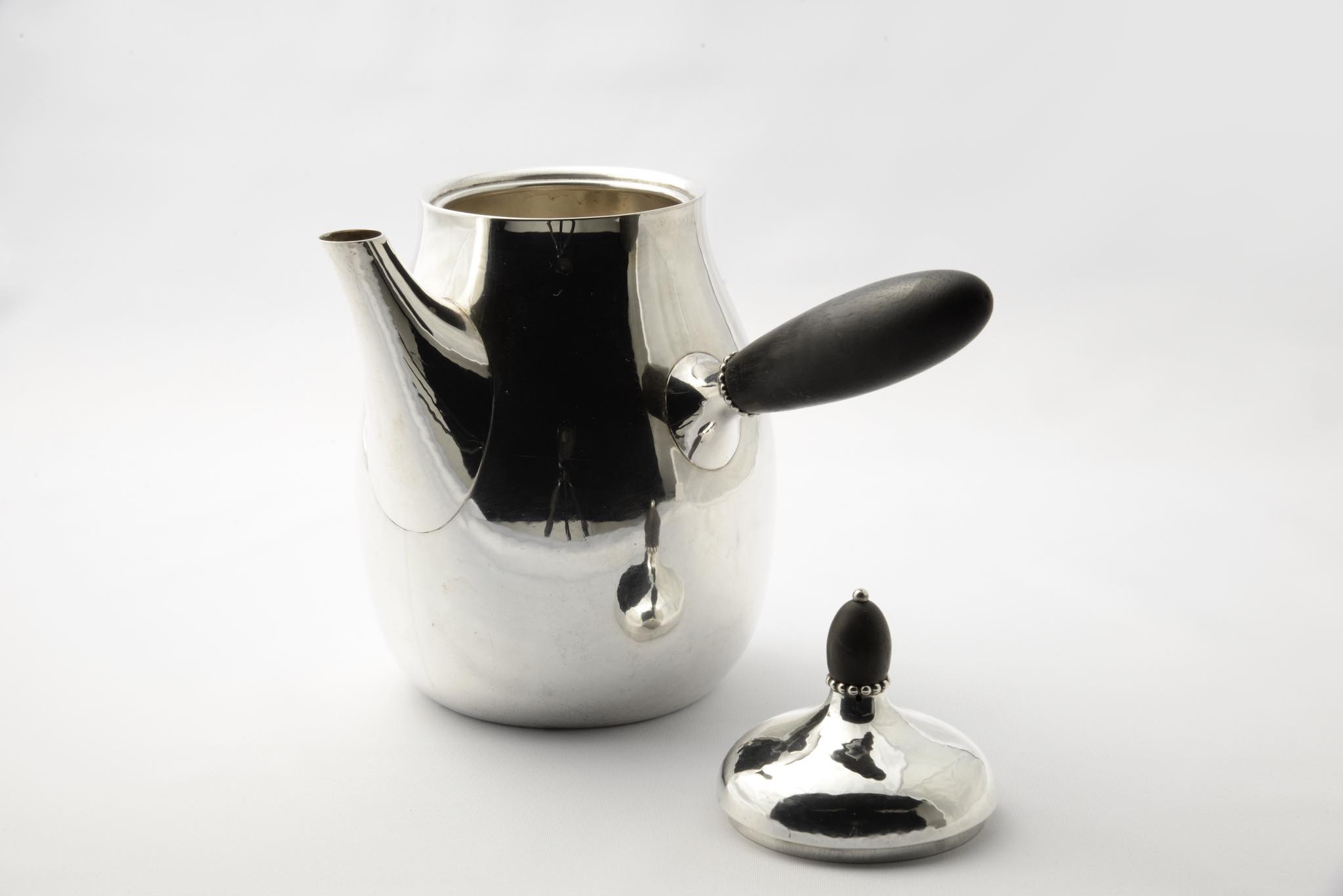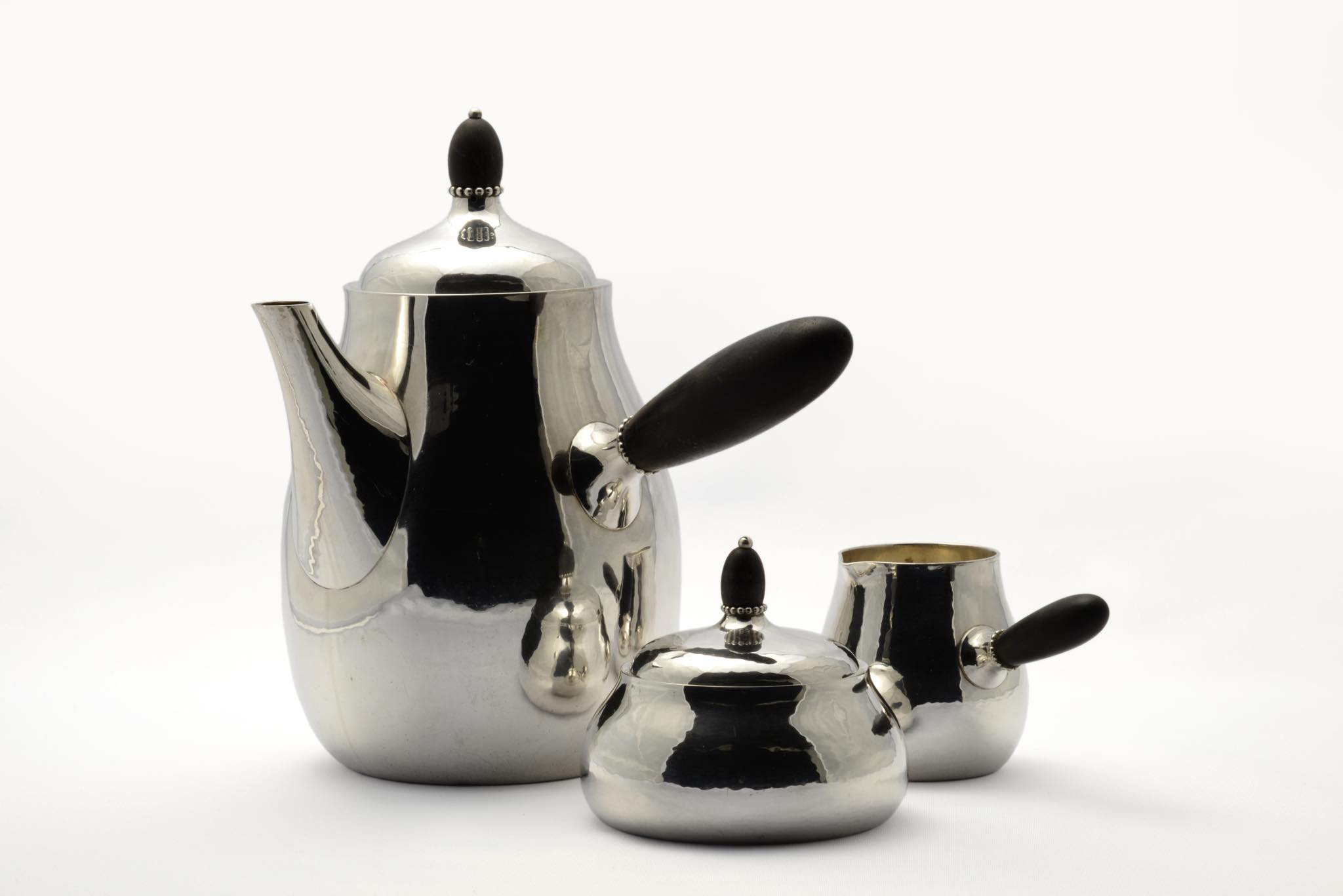 デンマークのシルバースミス、Georg Jensen/ジョージ・ジェンセンによって作られたスターリングシルバーのコーヒーセットです。ハンマーで形成された本体には、鍛造模様が心地よく表面を覆います。ハンドルはエボニー(黒檀材)が用いられており、凹みなどのダメージもなく綺麗な状態です。こちらは3点セットでの販売となります。