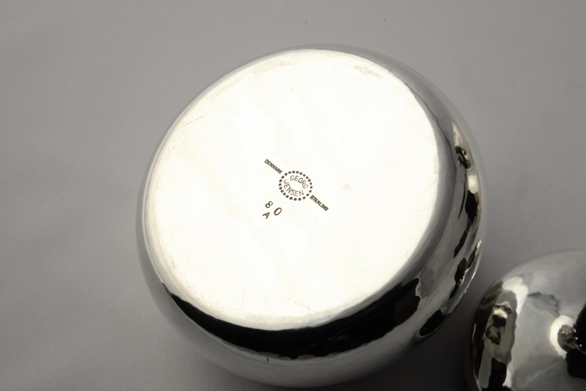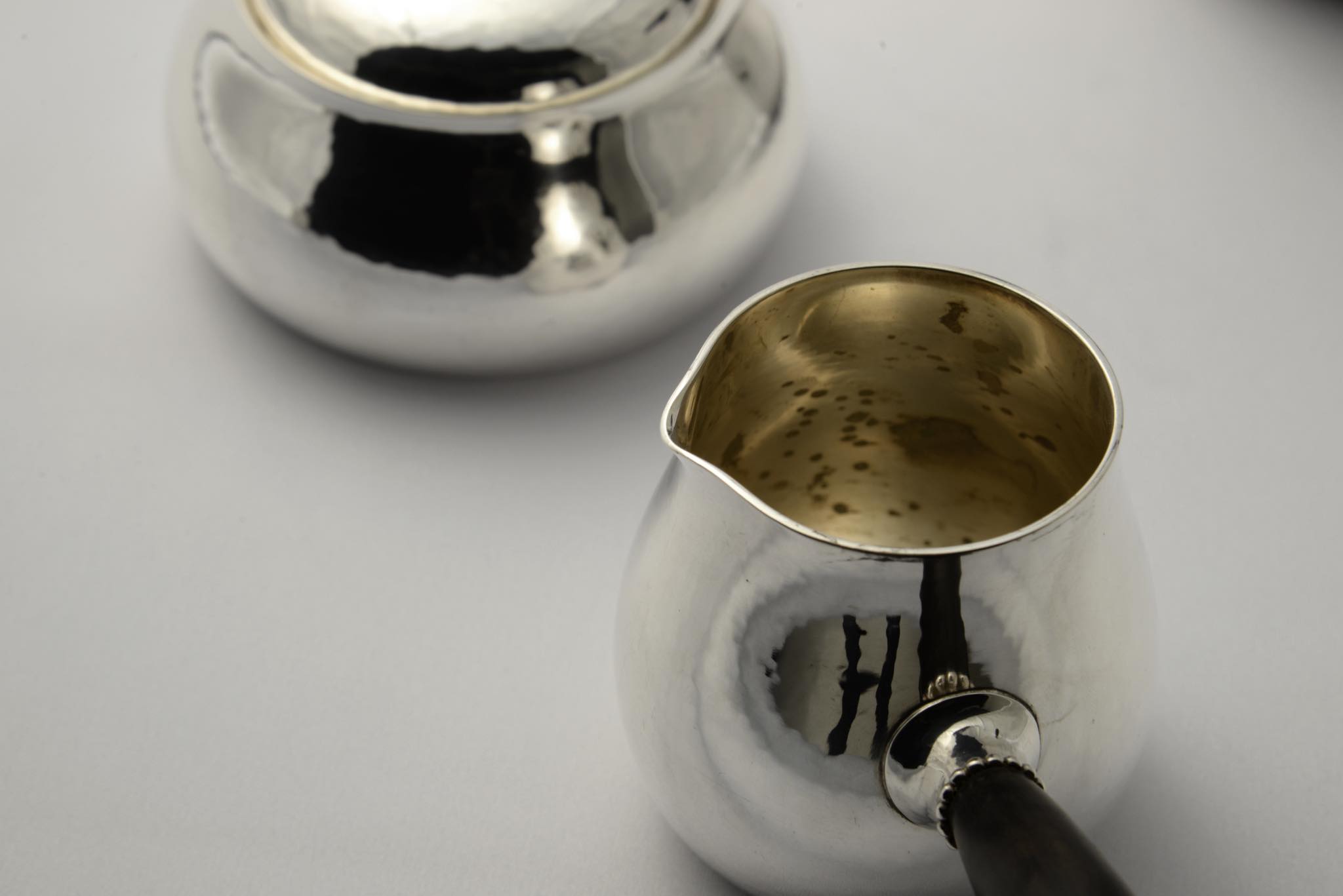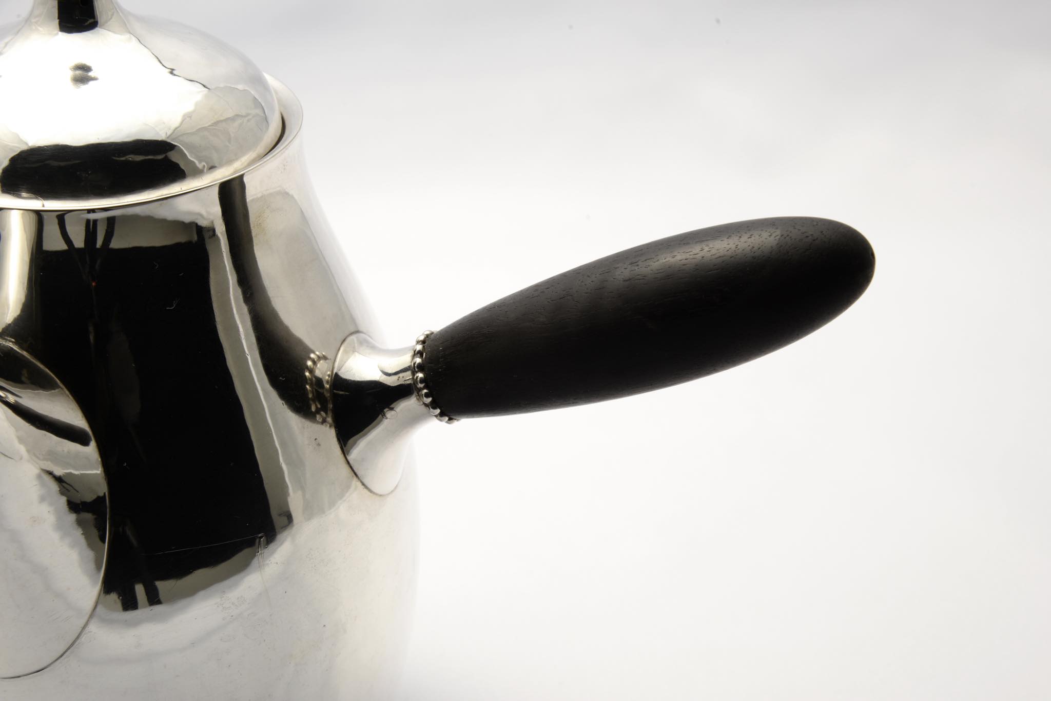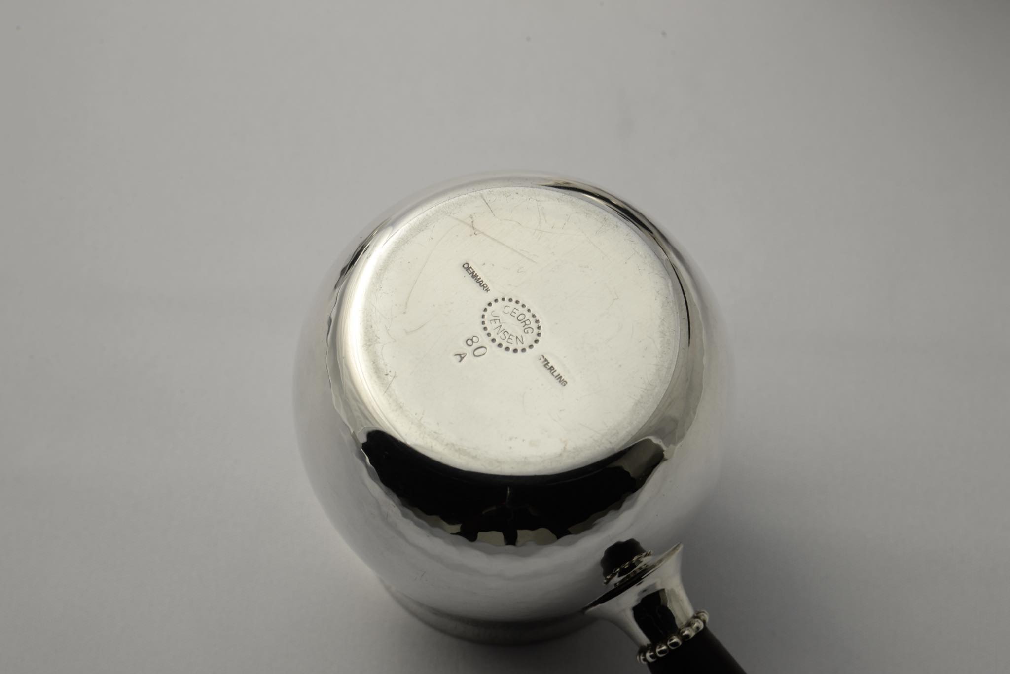 デンマークのシルバースミス、Georg Jensen/ジョージ・ジェンセンによって作られたスターリングシルバーのコーヒーセットです。ハンマーで形成された本体には、鍛造模様が心地よく表面を覆います。ハンドルはエボニー(黒檀材)が用いられており、凹みなどのダメージもなく綺麗な状態です。こちらは3点セットでの販売となります。