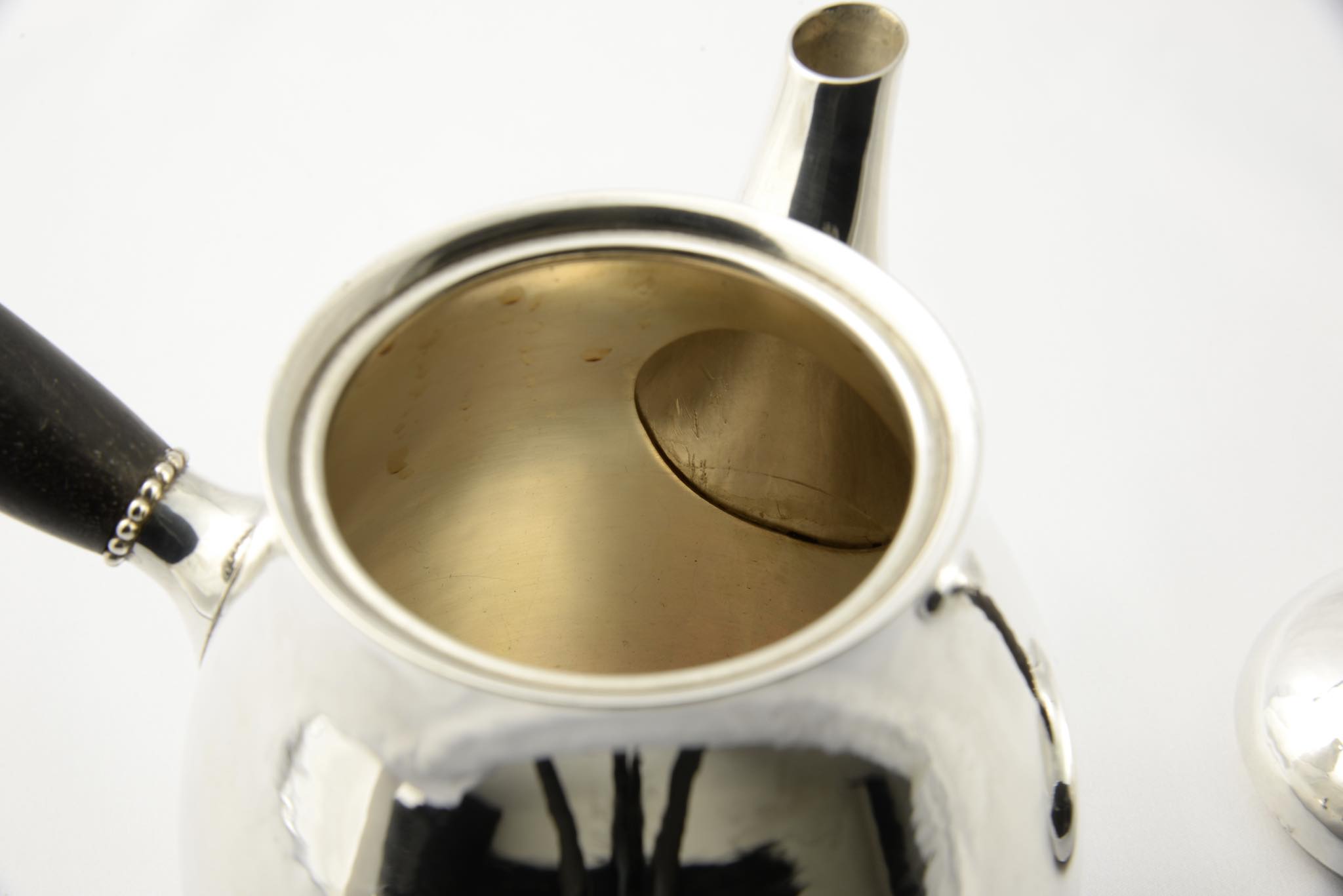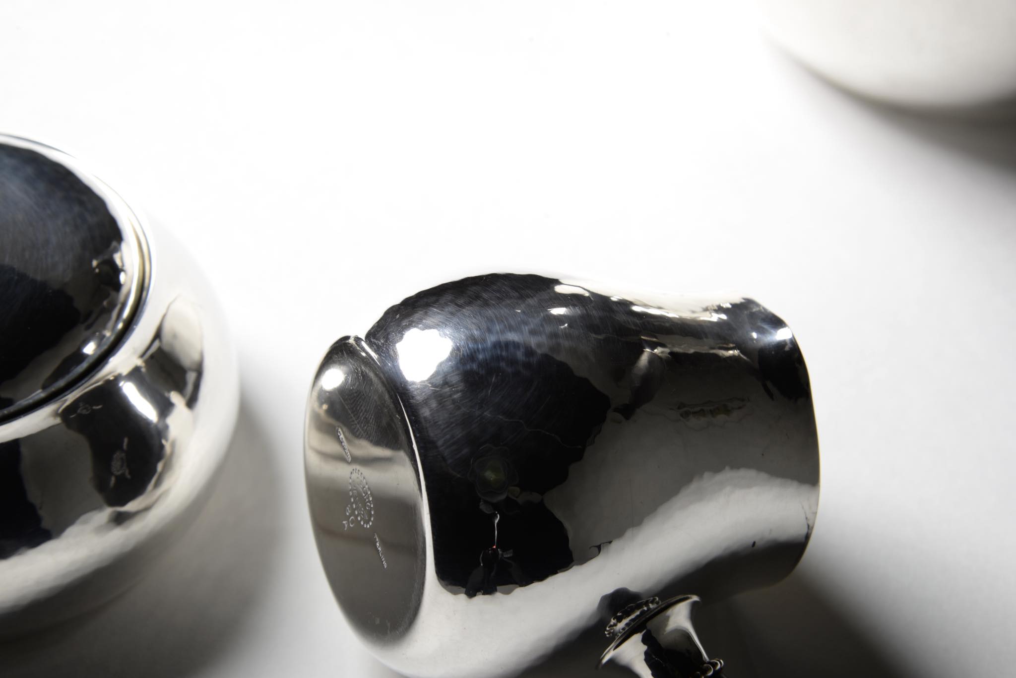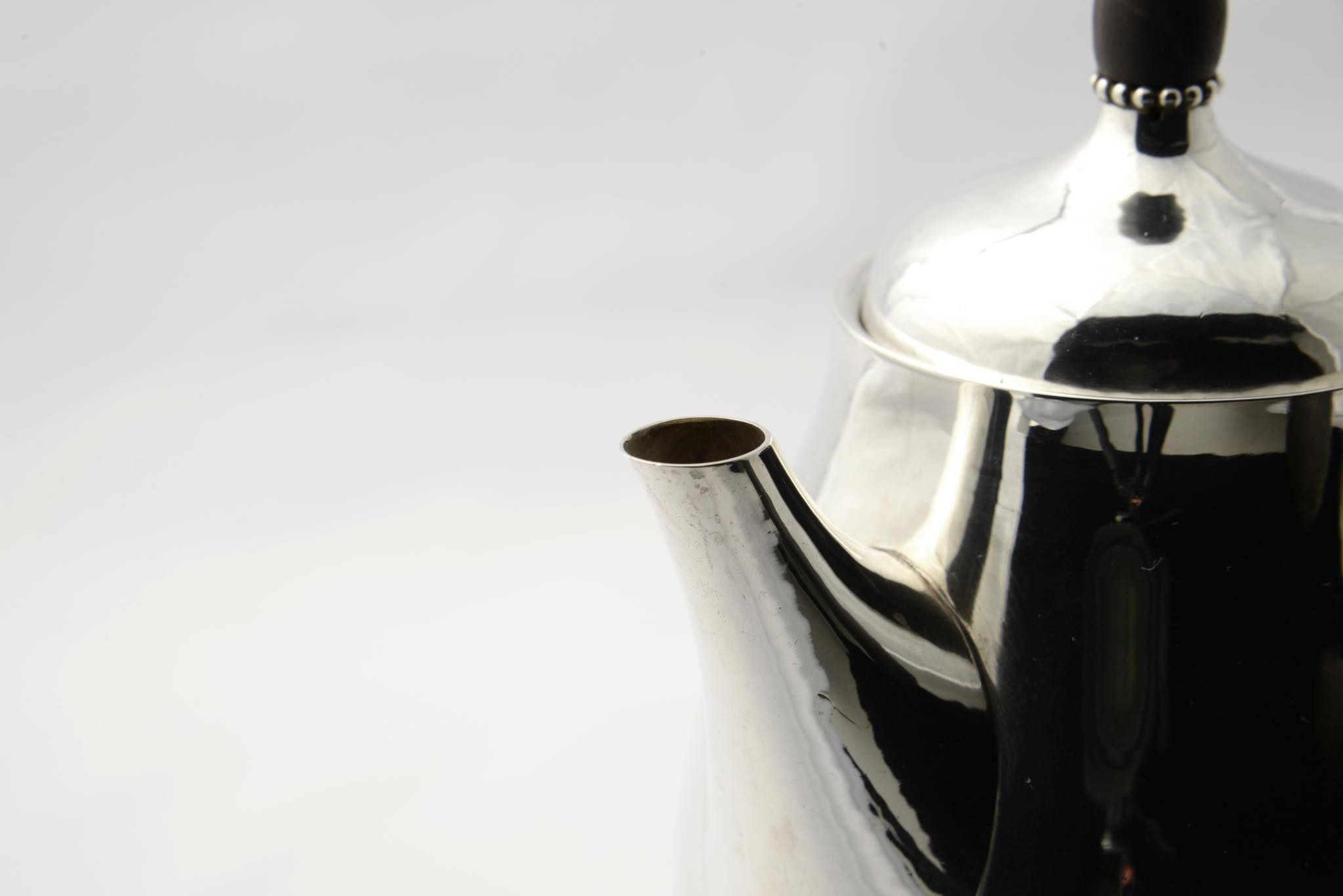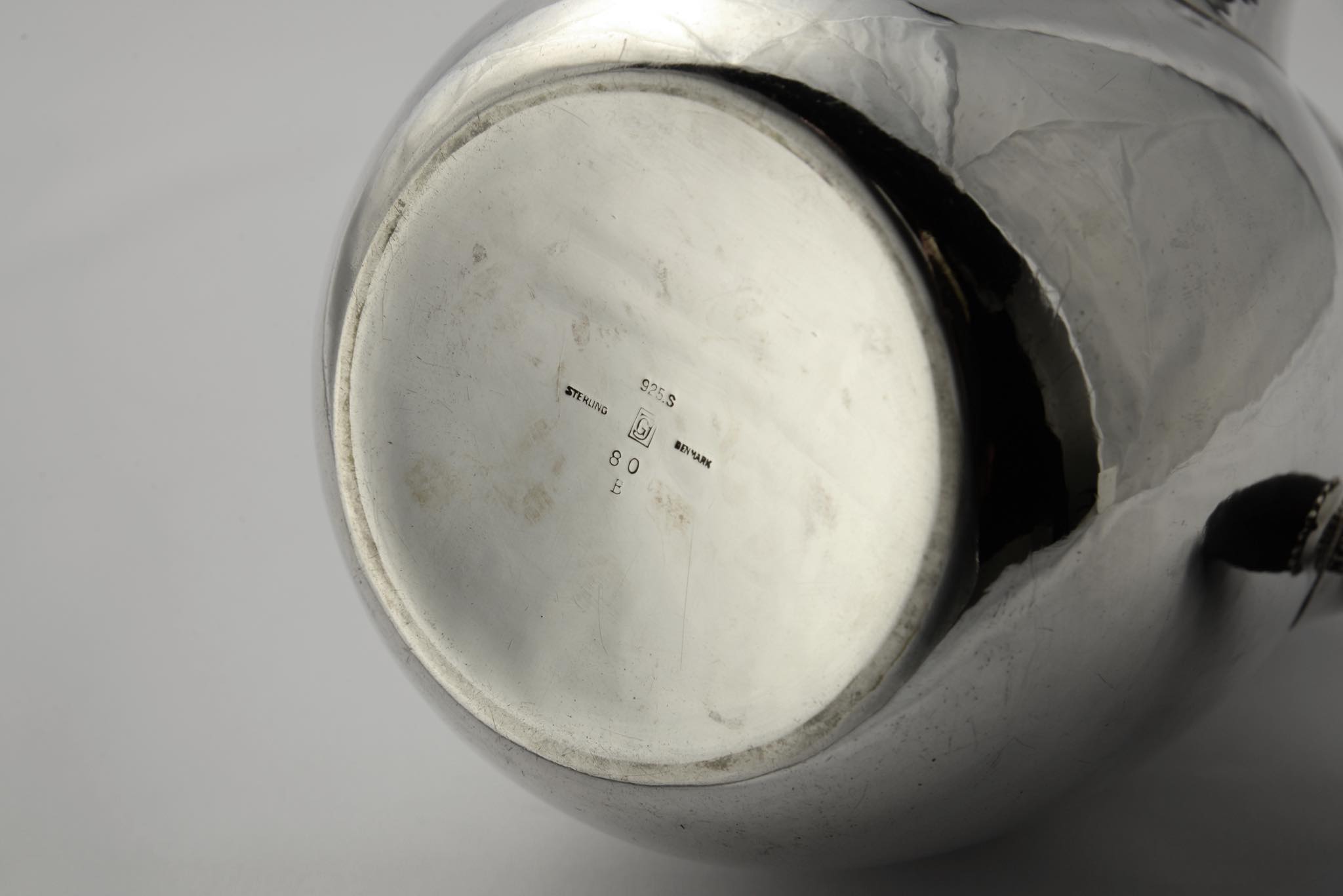 デンマークのシルバースミス、Georg Jensen/ジョージ・ジェンセンによって作られたスターリングシルバーのコーヒーセットです。ハンマーで形成された本体には、鍛造模様が心地よく表面を覆います。ハンドルはエボニー(黒檀材)が用いられており、凹みなどのダメージもなく綺麗な状態です。こちらは3点セットでの販売となります。