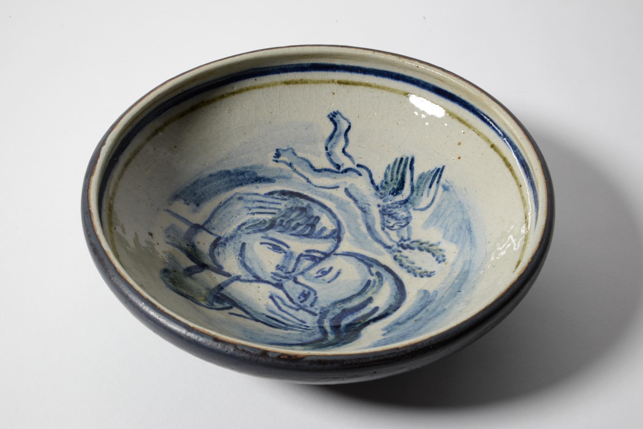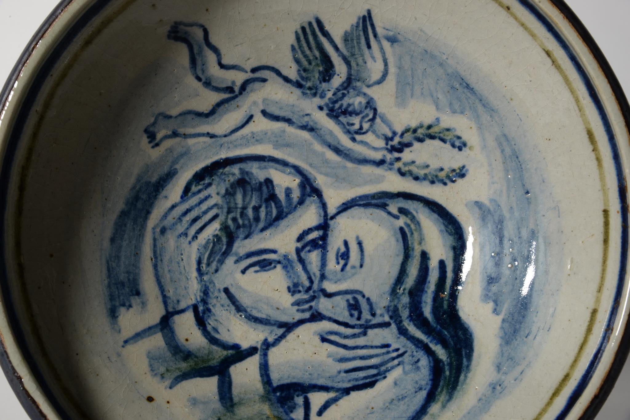デンマークの芸術家、Jais Nielsen/ヤイス・ニールセンによる陶芸作品です。ロイヤルコペンハーゲンにて1940年代にシリーズ化されたもので、氏の絵付けによって一点一点描かれたユニーク作品です。シャモットクレイ(耐火性の陶土を高温で一度焼いたのち細かく粉砕し粉状にした陶土)で成形されたもので、半陶半磁のような独自の質感が特長です。見込みには、仲睦まじき男女と、宙を舞う天使が描かれています。