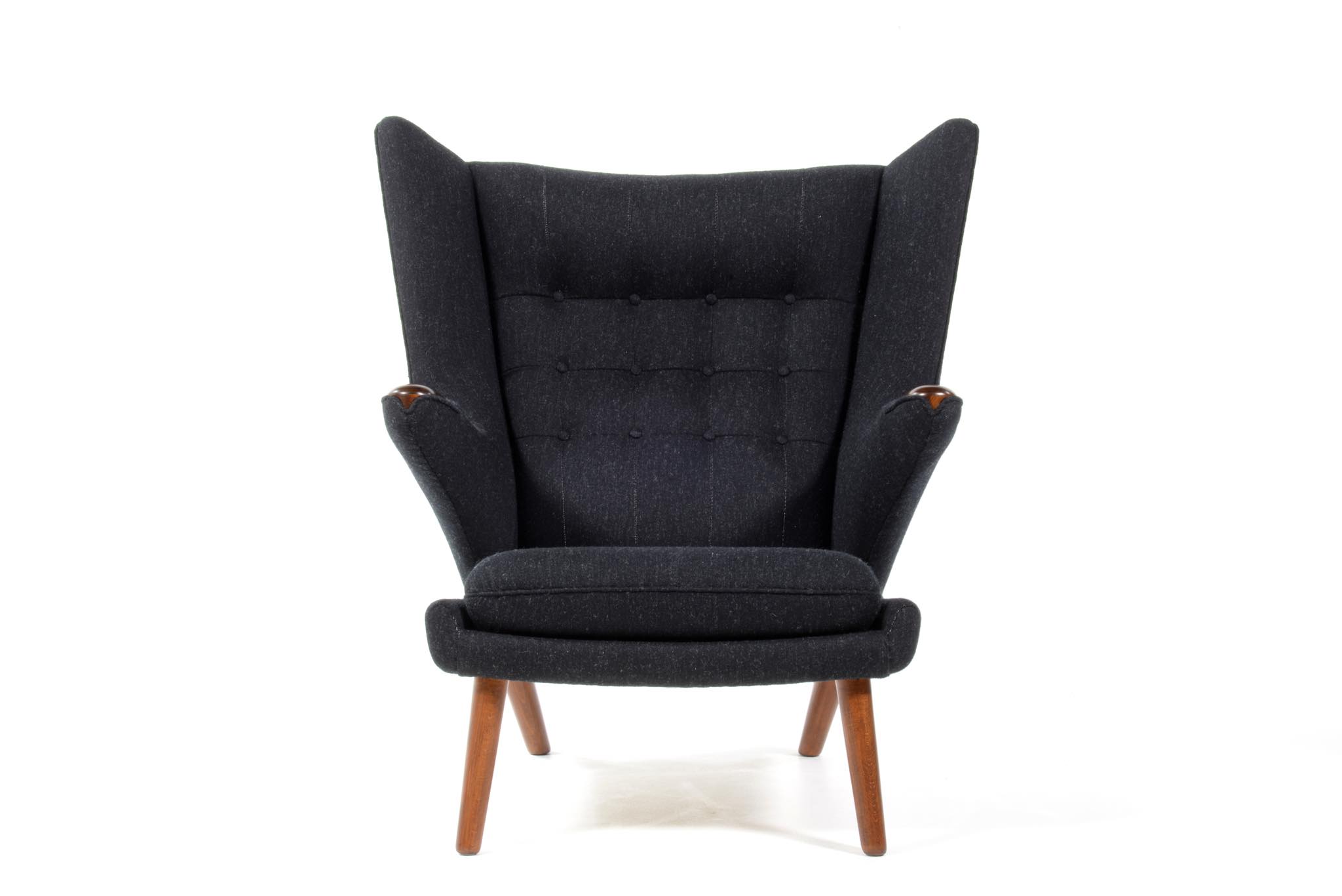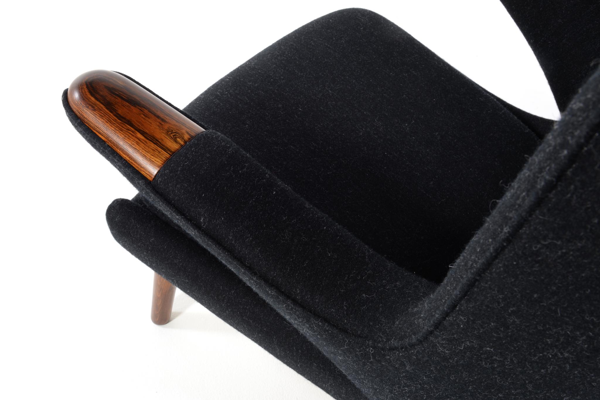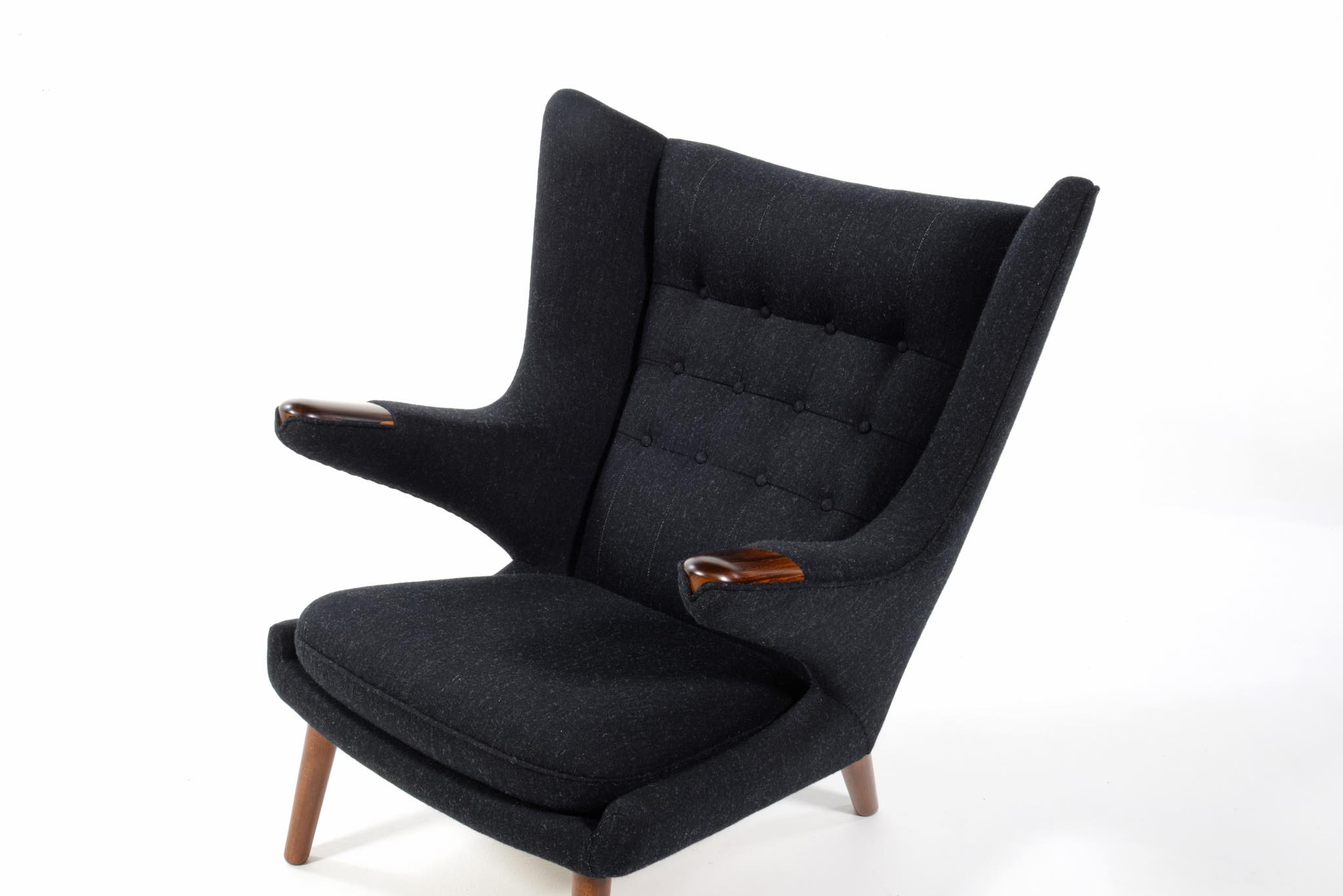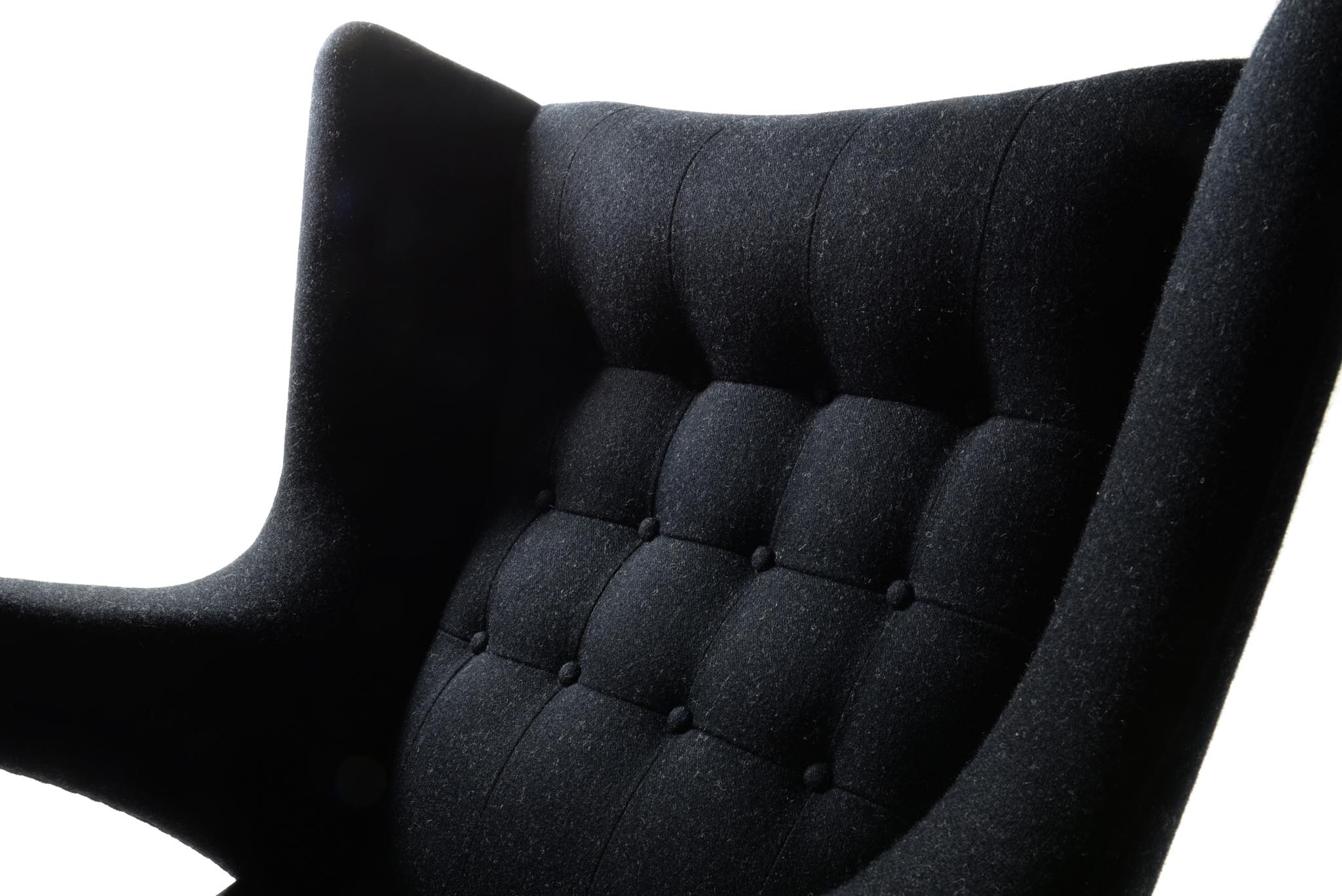 デンマークを代表する家具デザイナー、Hans J. Wegner/ハンス・ウェグナーによる ”パパベア” です。こちらは1950~60年代頃に作られたヴィンテージモデルで、爪はローズウッド材、脚にはステインされたビーチ材が用いられています。爪のローズウッドは木取りもよく、綺麗な木目が現れています。ファブリックはデンマークのテキスタイルメーカー、Gabriel/ガブリエル社の SAVAK/サヴァクにて張り替えました。SAVAKはデザイナーのTove Kindt-Larsen/トーべ・キンド・ラーセンによって1960年代初頭に生み出されたカブリエル社の名作ファブリックで、羊毛を絡めたようなきめ細やかな織りが特徴です。