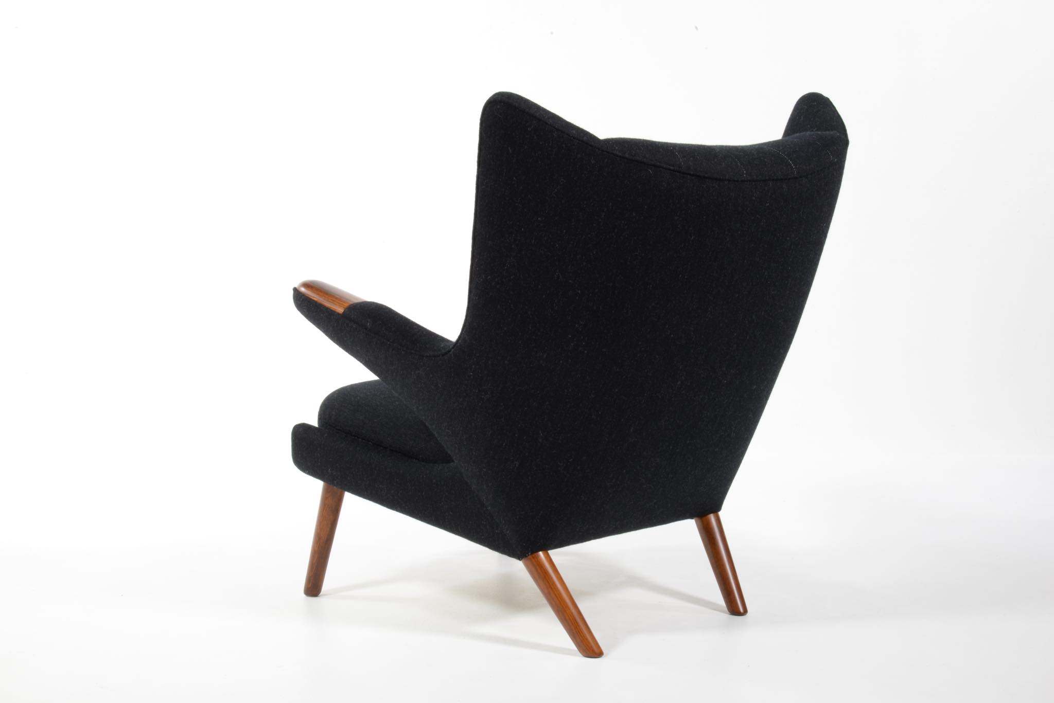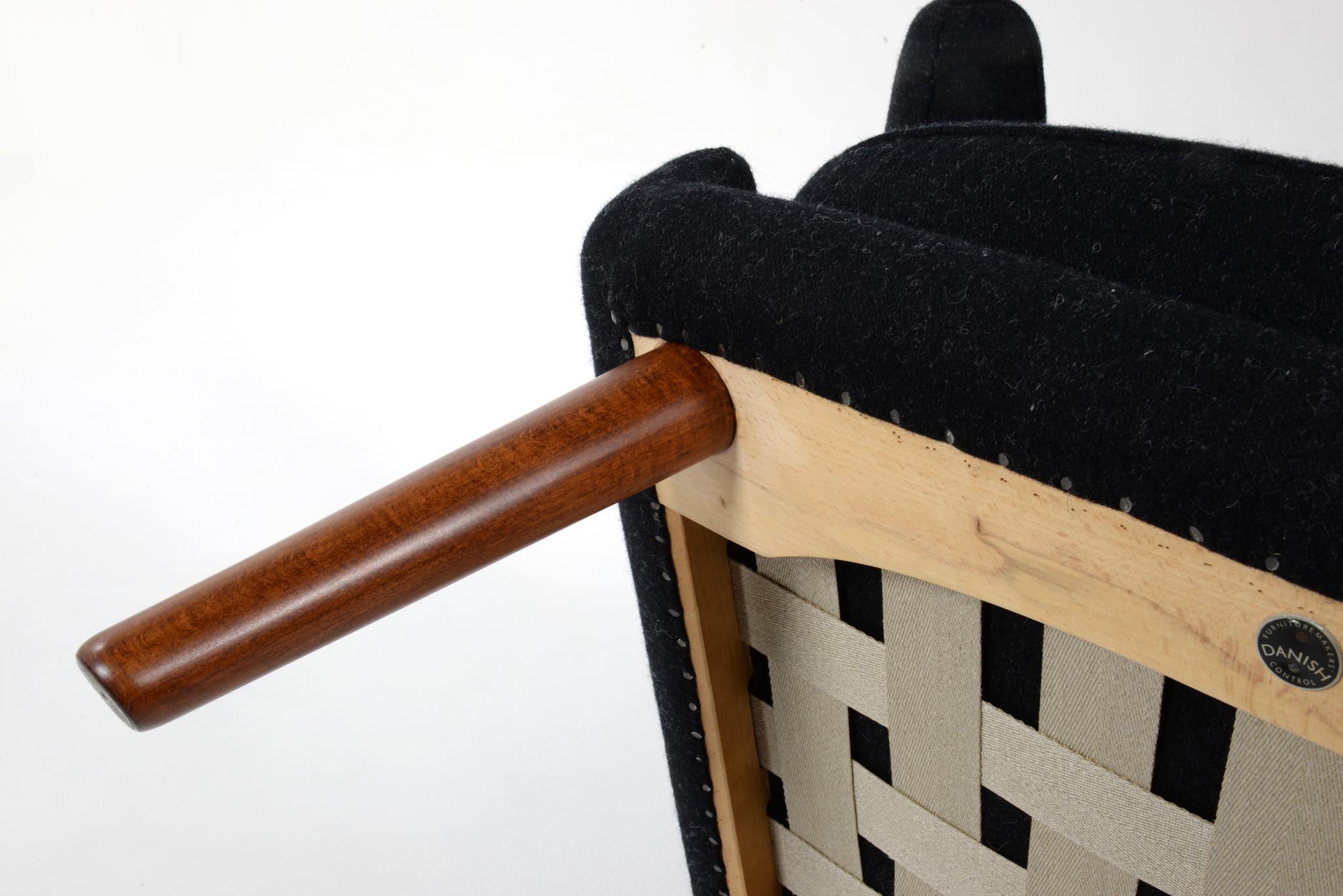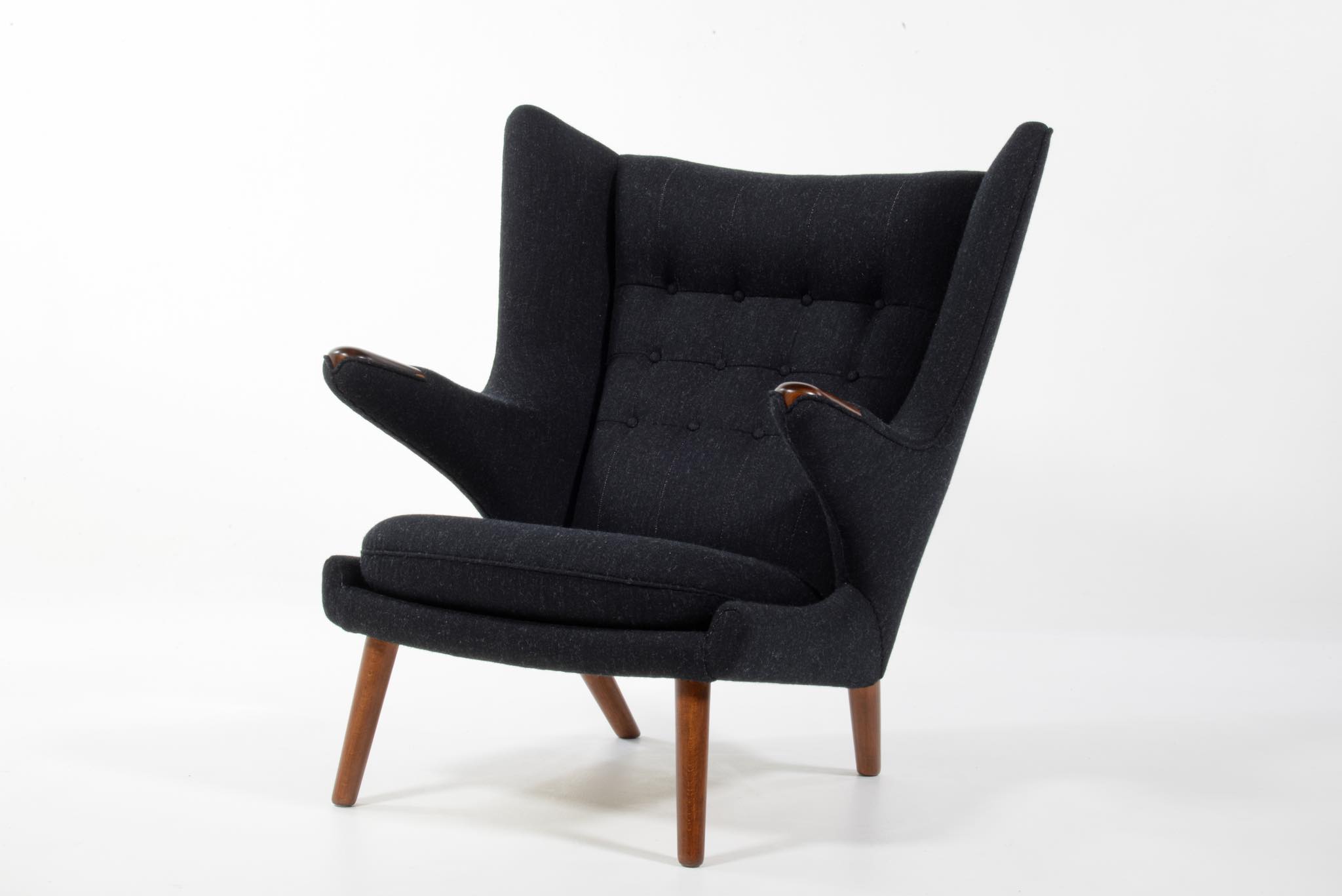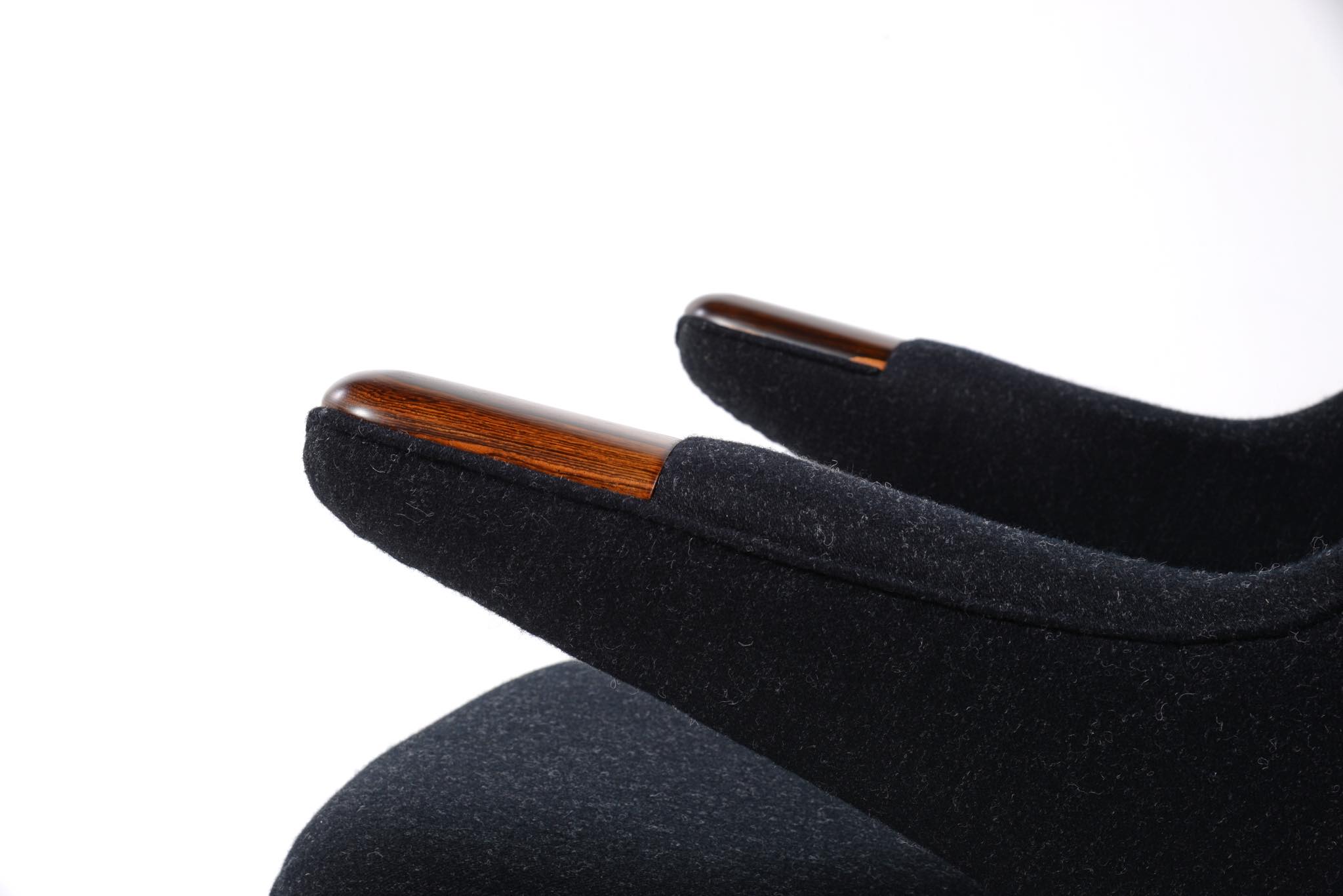 デンマークを代表する家具デザイナー、Hans J. Wegner/ハンス・ウェグナーによる ”パパベア” です。こちらは1950~60年代頃に作られたヴィンテージモデルで、爪はローズウッド材、脚にはステインされたビーチ材が用いられています。爪のローズウッドは木取りもよく、綺麗な木目が現れています。ファブリックはデンマークのテキスタイルメーカー、Gabriel/ガブリエル社の SAVAK/サヴァクにて張り替えました。SAVAKはデザイナーのTove Kindt-Larsen/トーべ・キンド・ラーセンによって1960年代初頭に生み出されたカブリエル社の名作ファブリックで、羊毛を絡めたようなきめ細やかな織りが特徴です。