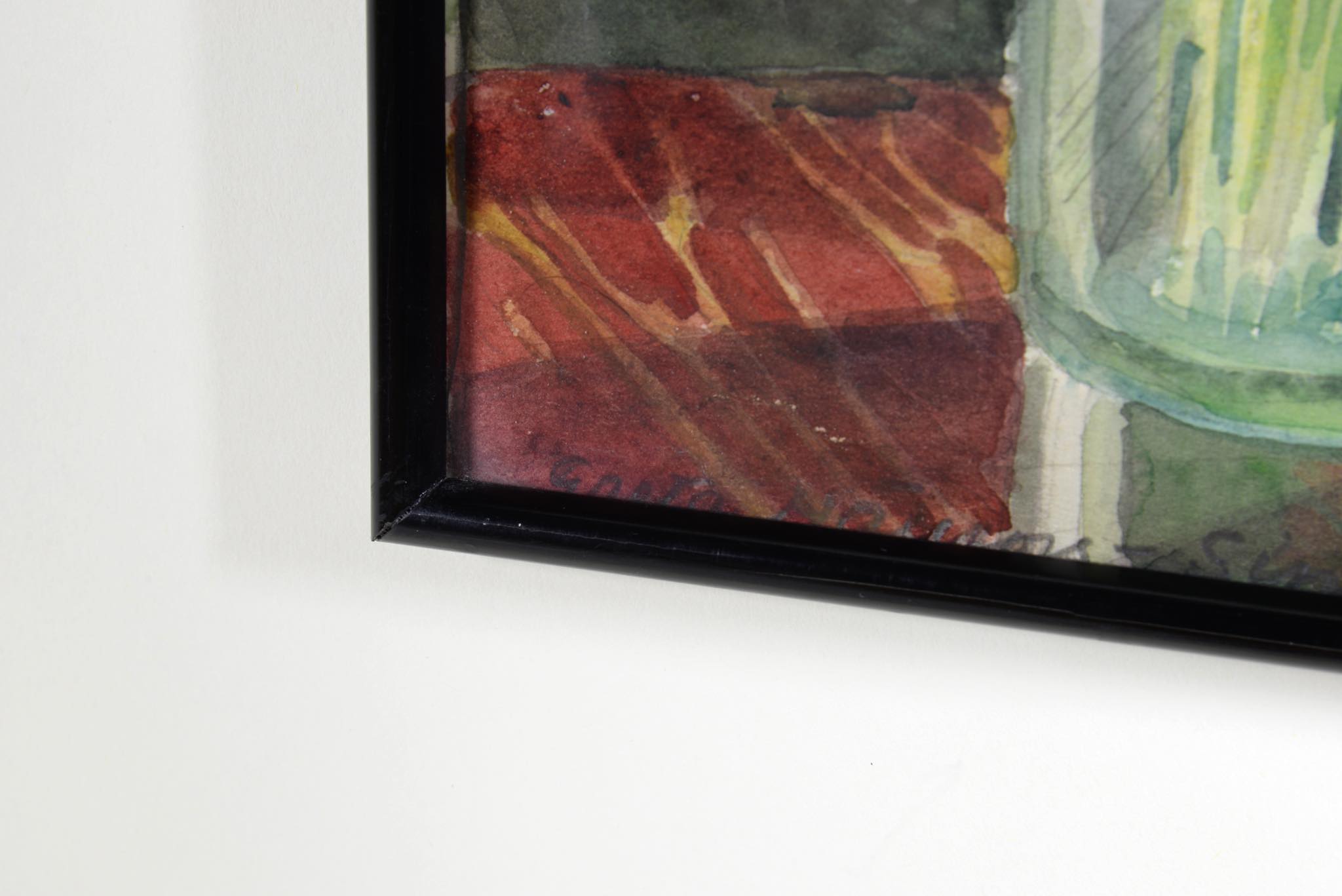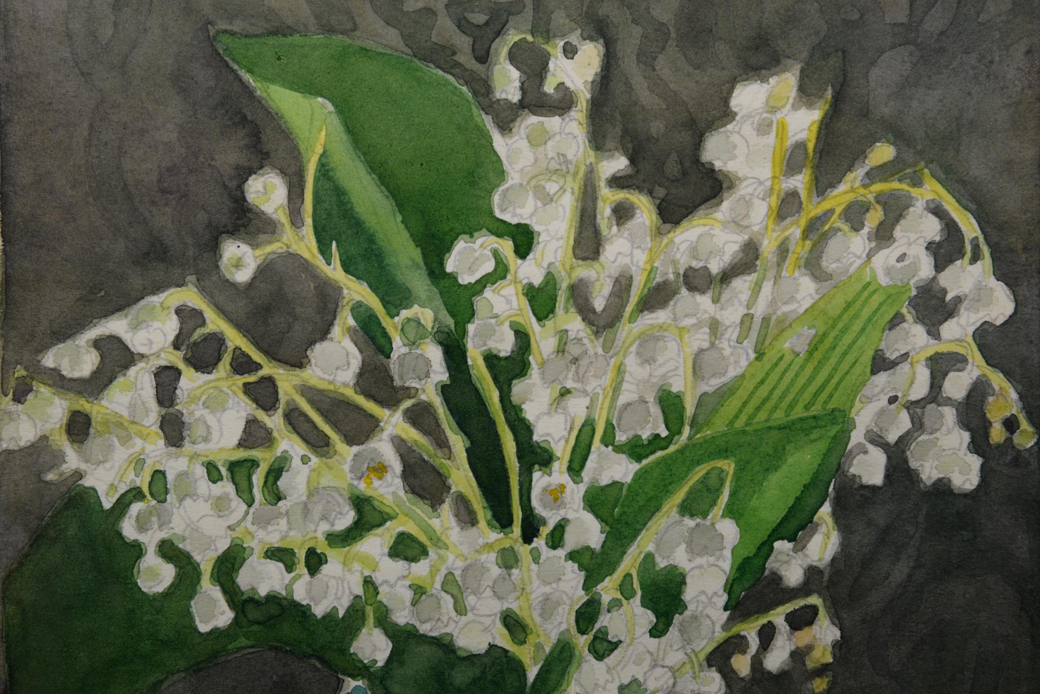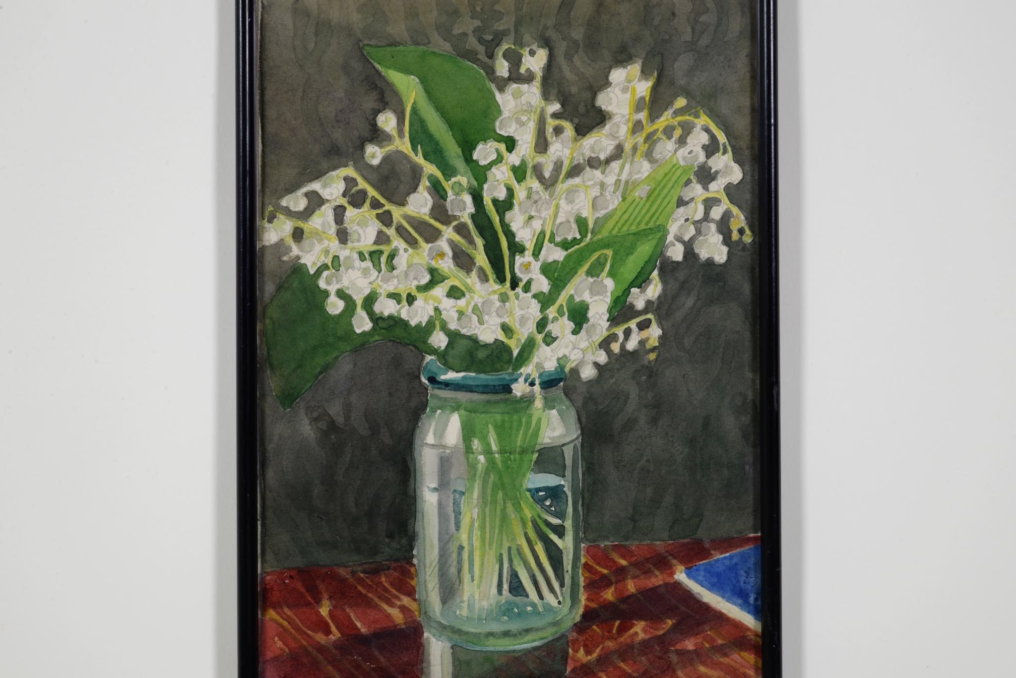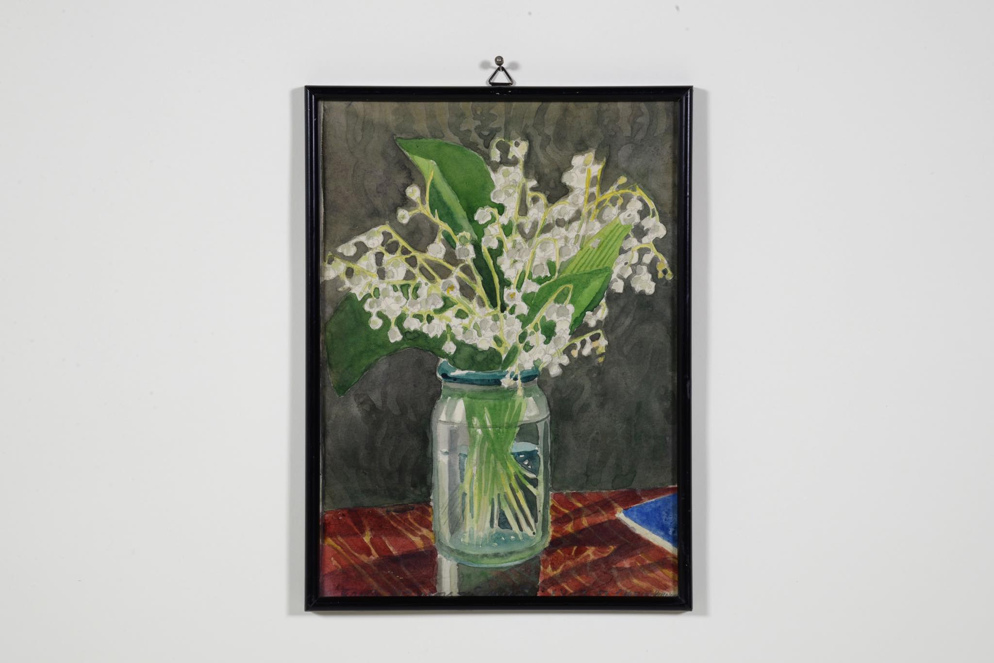 20世紀前葉に活躍したフィンランドの前衛的アーティスト、Greta Hällfors-sipilä/グレタ・ヘルフォース・シピラによる水彩画作品です。1951年に制作されたようで、卓上のLilies of the valley/スズランを描いています。小ぶりな作品ですが、生き生きとしたスズランやほのかな日差しなどが表現されています。額装はオリジナルのようで、小傷等見られますがきれいな状態です。ガラスを磨きました。壁用のフックは上部に一箇所のみに備わる仕様です。