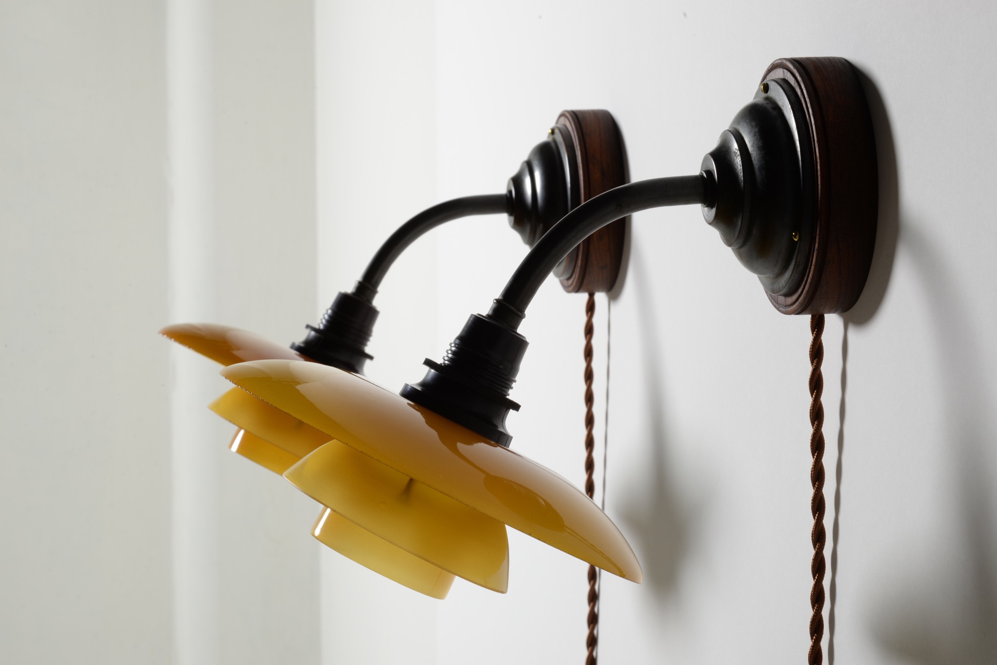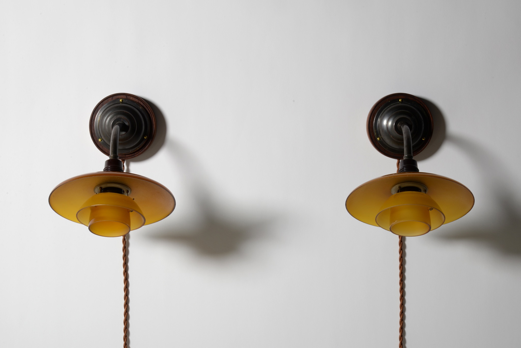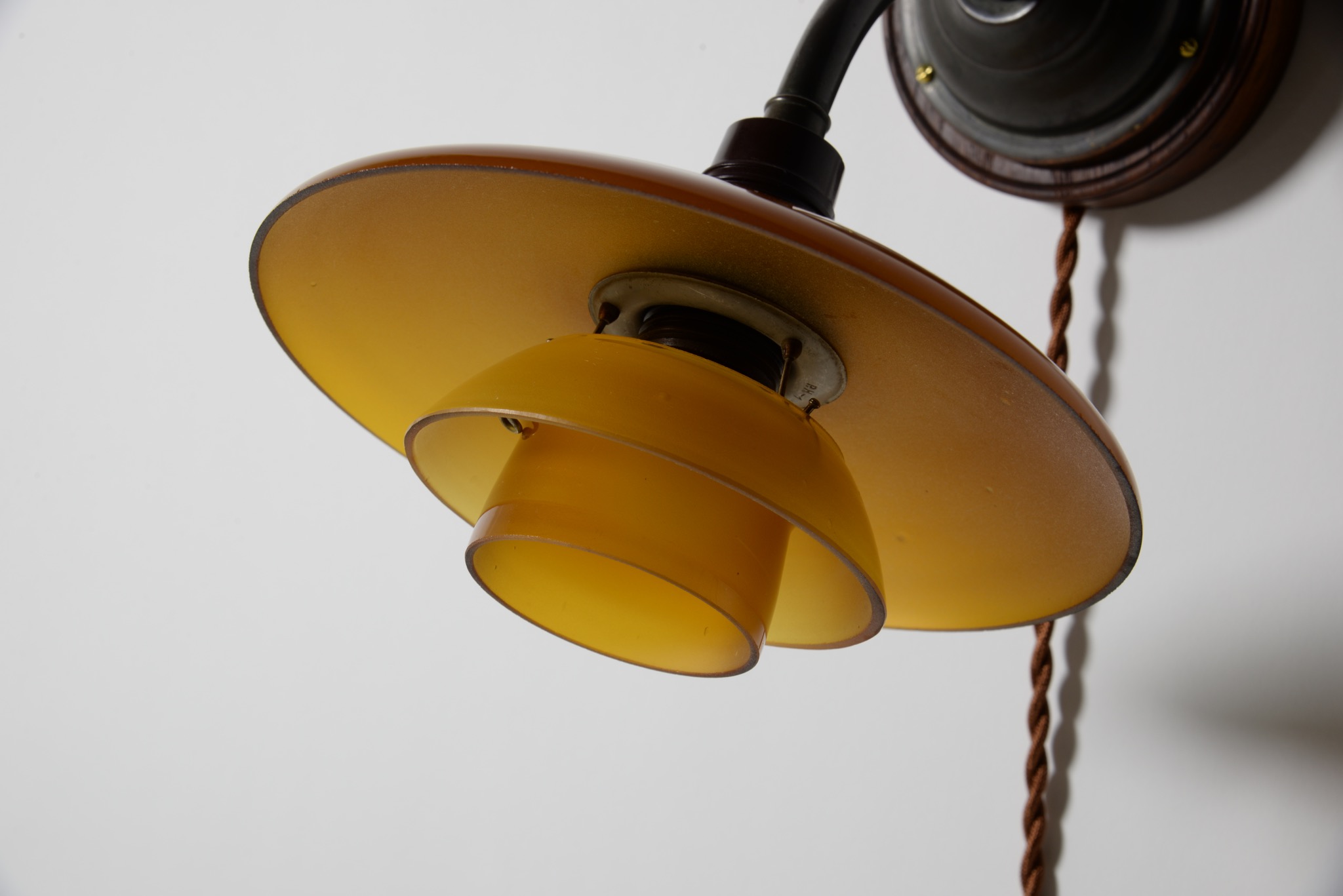 デンマークのデザイナー、Poul Henningsen/ポール・ヘニングセンによってデザインされたPH2/1ウォールランプ "Nr.4821" 一対です。1930年代に作られたものでしょう。アップライトピアノを設置した壁の両サイドに取り付けるなど、壁面や柱に取り付けるためのランプです。銅製のアームにベークライトのソケットボックス、アンバーガラスのシェードが備わります。チーク材の台座は当店で作成しました。ボトムボウルは備わりません。大きなダメージは無くきれいな状態です。