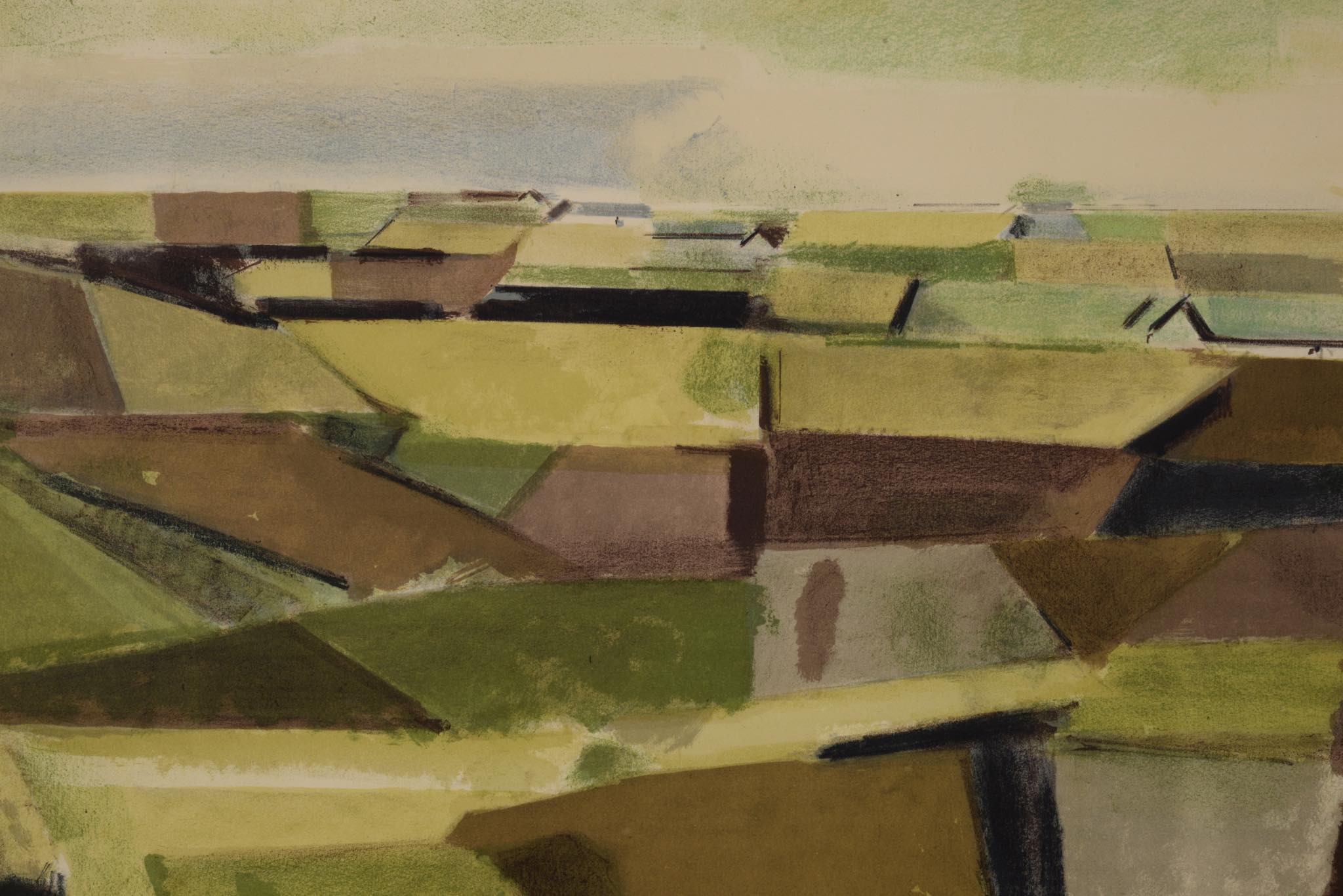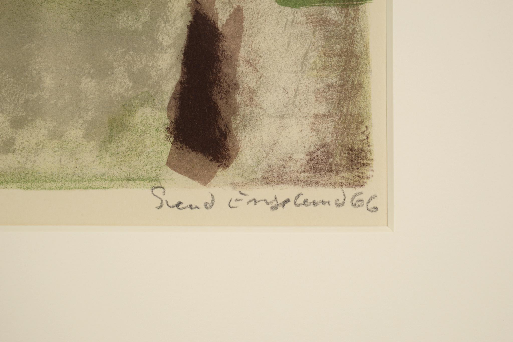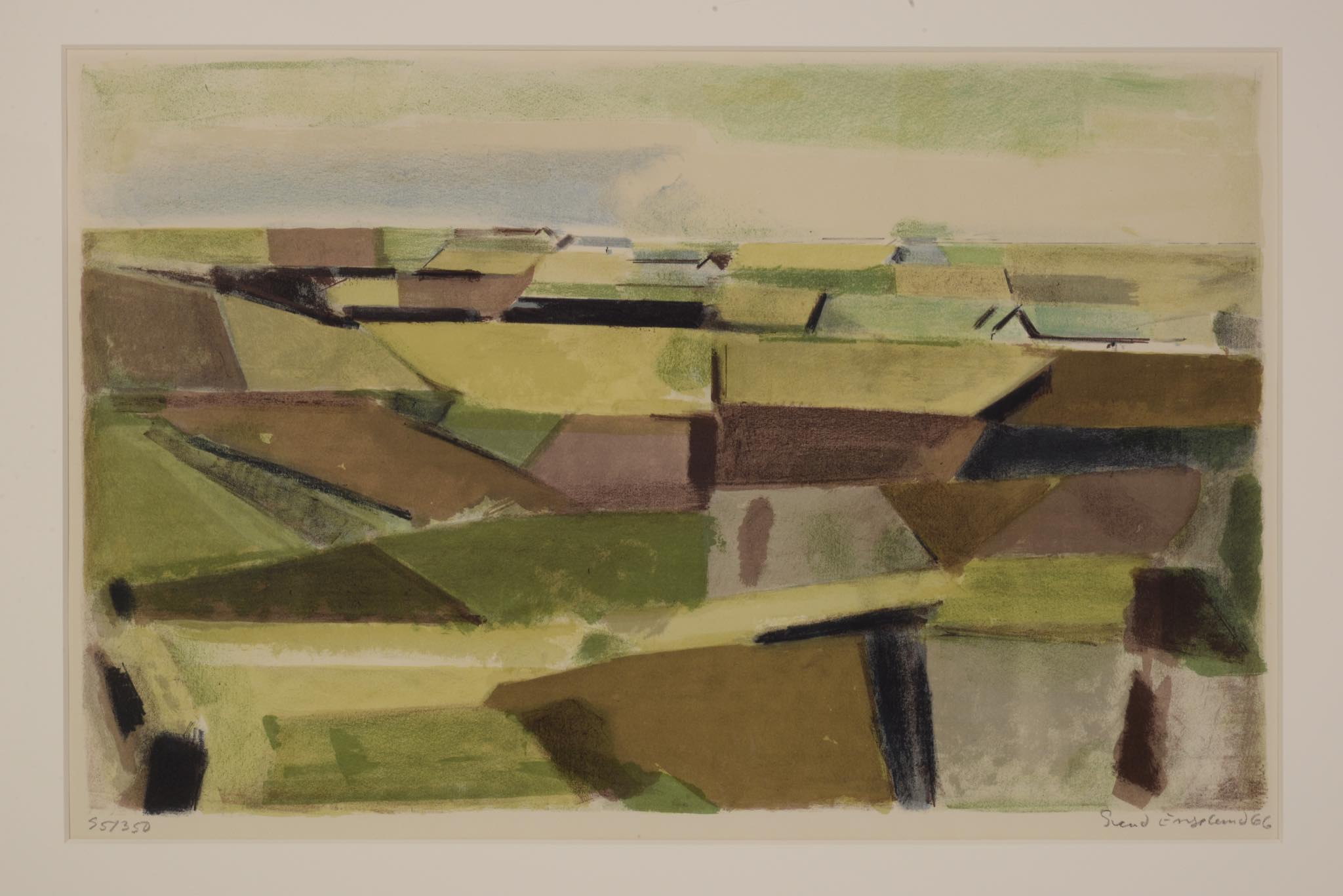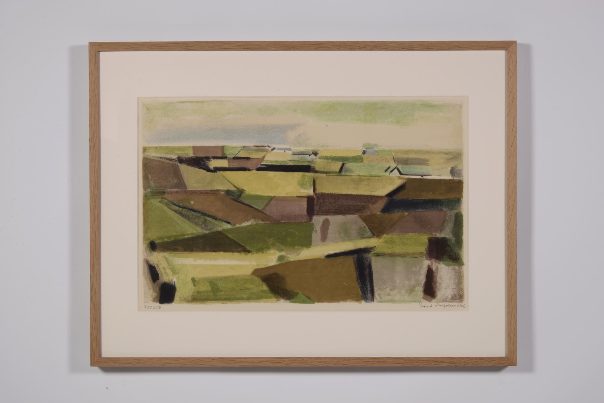 デンマークの画家、Svend Engelund/スヴェン・インゲルンドによるリトグフラフ作品です。氏の得意とする構図で、大地に広がる農園が描かれています。オーク材のフレームとマットは新調しました。