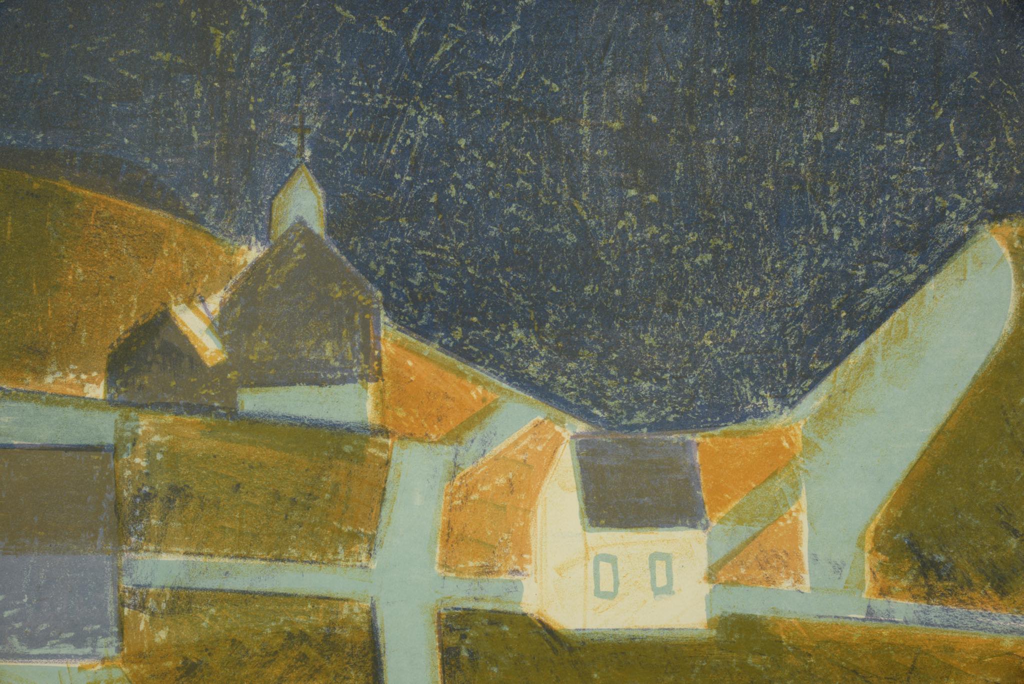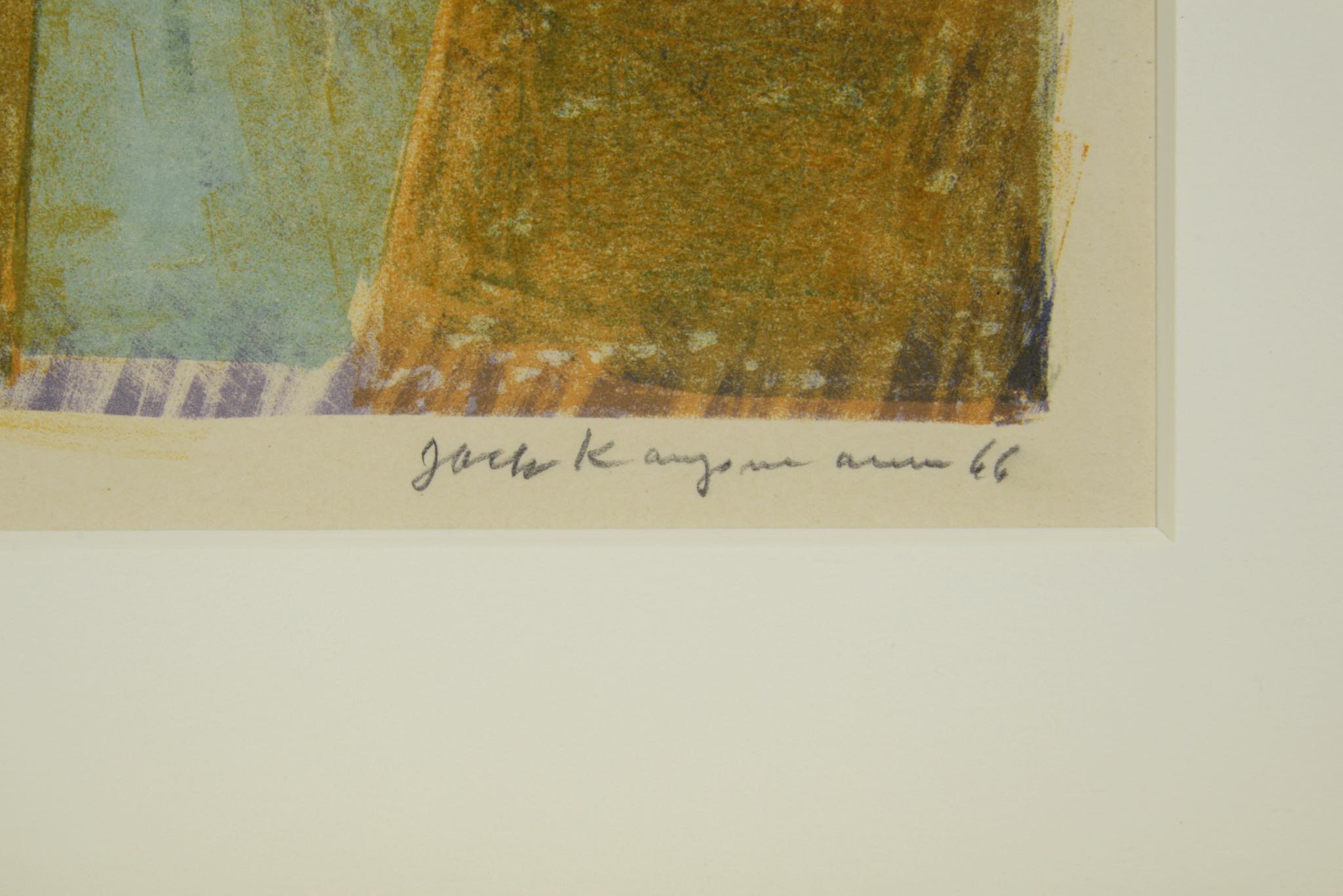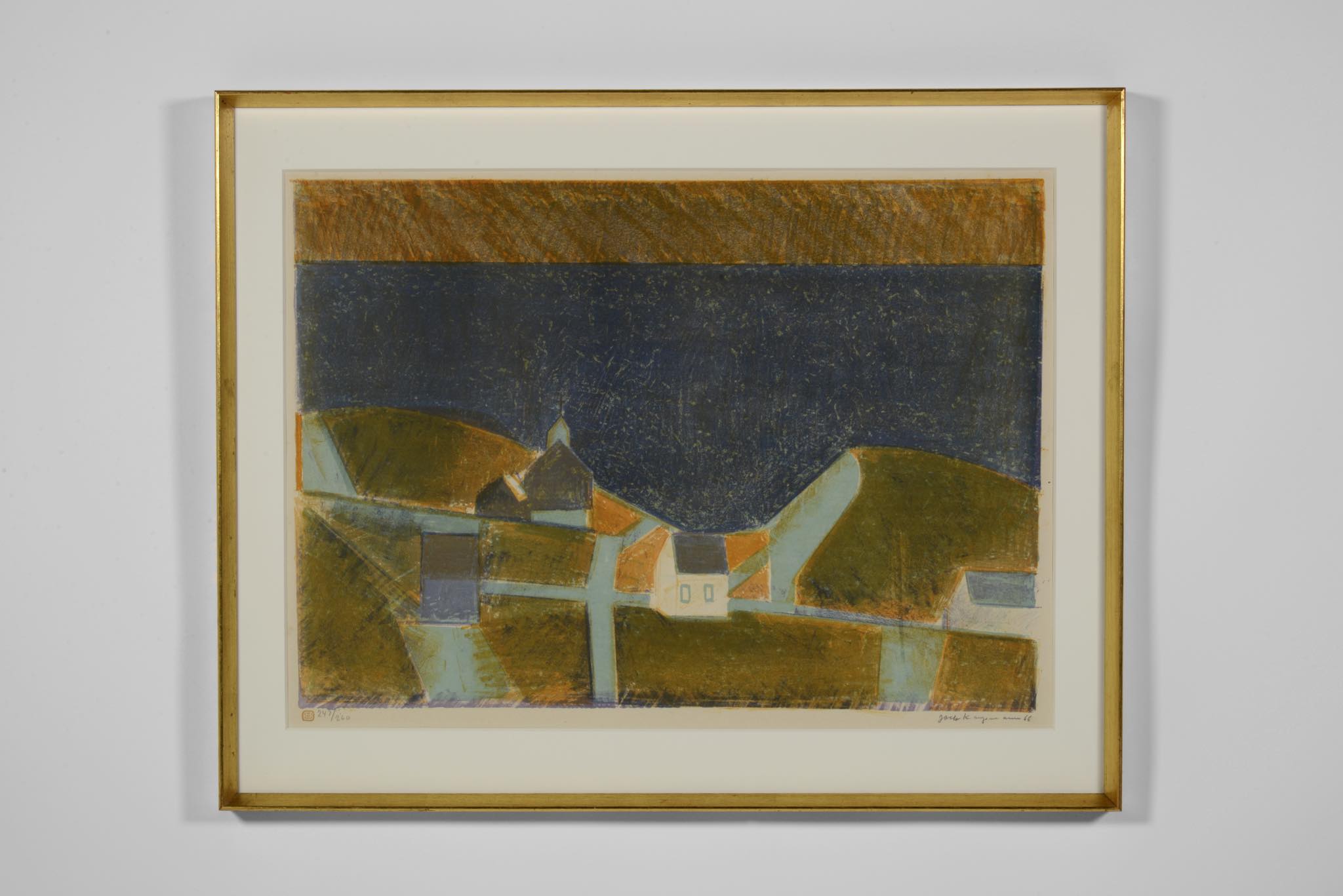 デンマークの画家、Jack Kampmann/ジャック・カンプマンによるリトグラフ作品、1966年に刷られたものです。大海原と対峙するフェロー諸島に生きる人々の集落を描いた作品です。氏の古い時代の作品によく使われた木製金箔のフレームはそのままに、マットを新調しました。