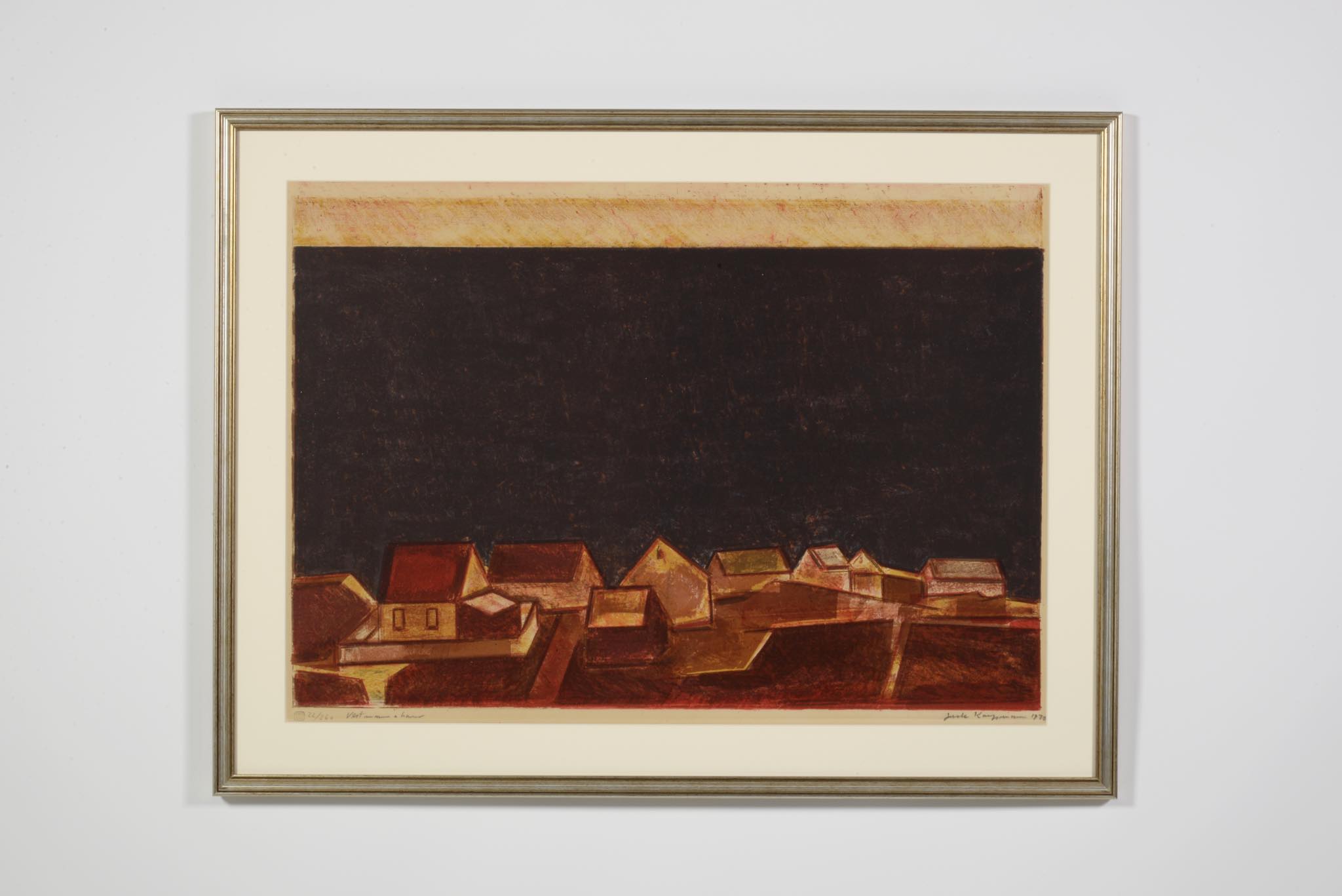 デンマークの画家、Jack Kampmann/ジャック・カンプマンによるリトグラフ作品、1970年に刷られたものです。大海原と対峙するフェロー諸島に生きる人々の集落を描いた作品です。タイトルと思しき書き込みが見られますが判読できません。オリジナルの銀箔木製のフレームはそのままに、マットを新調しました。凝った造りの綺麗なフレームが設えらておりますが、反りが生じています。詳しくはお問い合わせください。