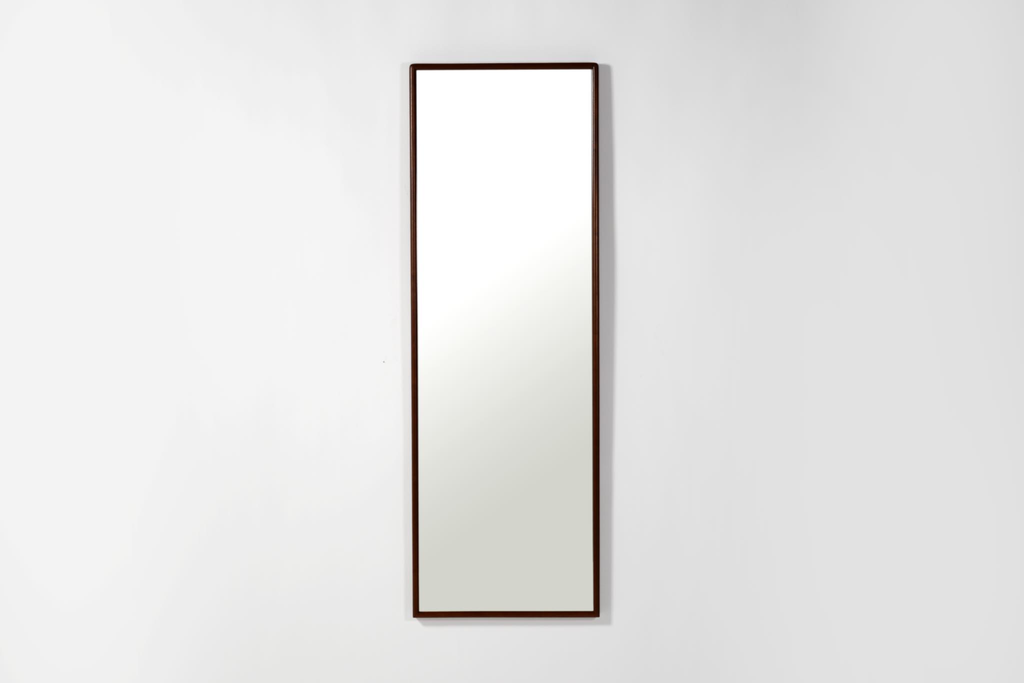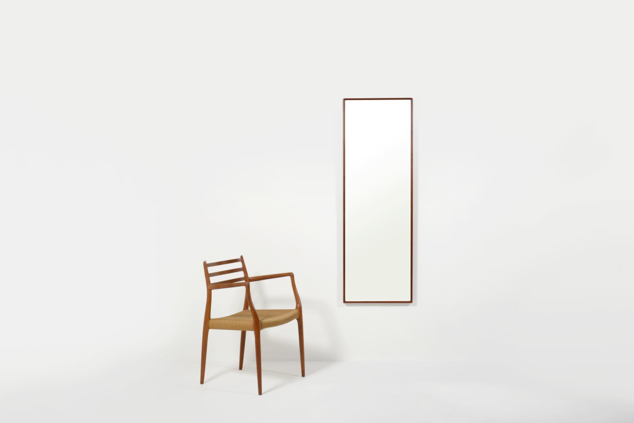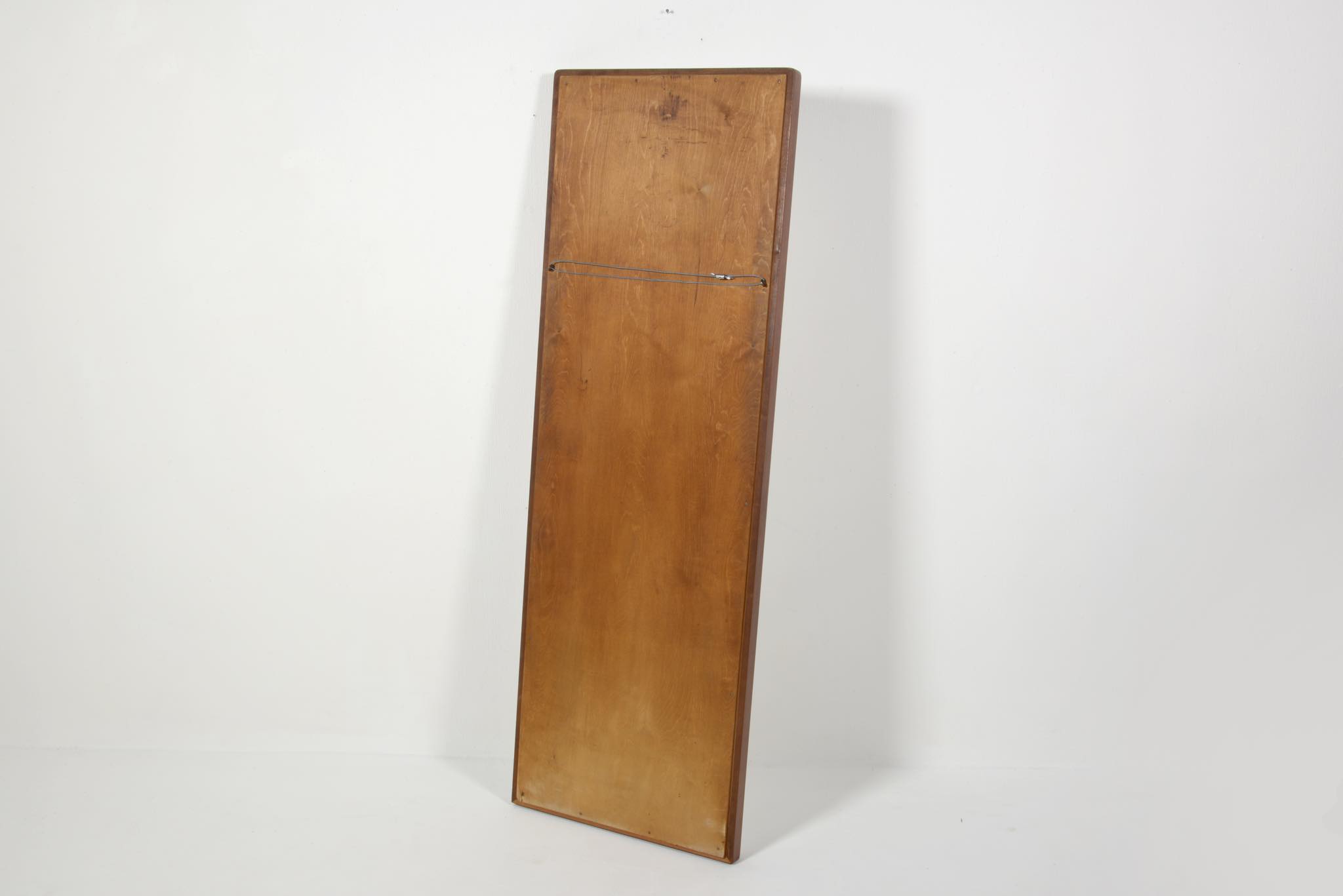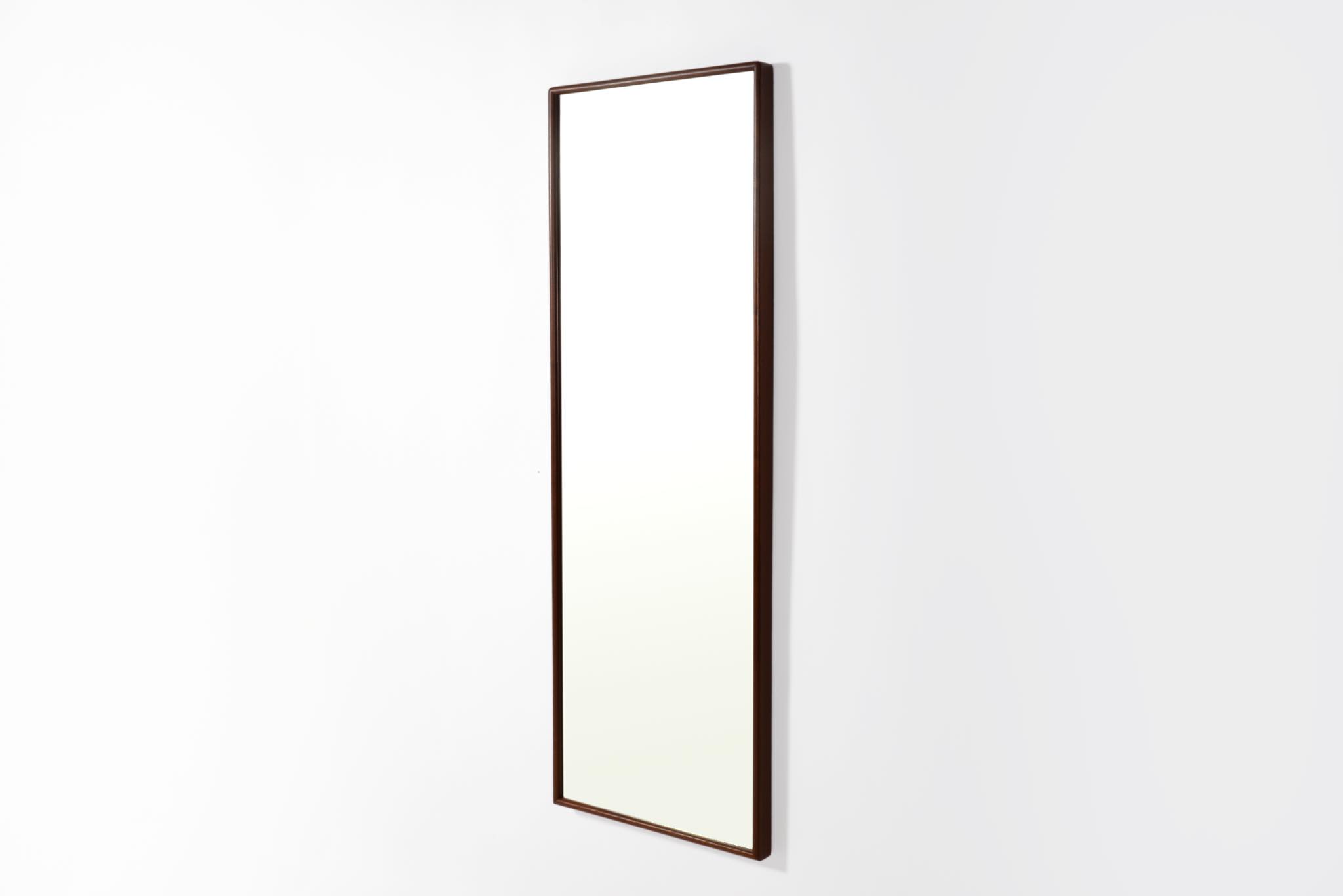 デンマークの家具工房にて作られた大きめの壁掛け鏡です。作行きを見ると1940年代頃に作られたもののようで、マホガニー材が用いられており、工房等は不明ですが丁寧な仕事のものです。マホガニー部分は塗膜の劣化が見られたため一旦剥離し再塗装しております。デンマークでは大きな鏡はあまり見かけず、姿見として使えるものは比較的希少なようです。鏡(ガラス)は腐食が見られたため新たに交換しました。鏡を交換する際の部材はオーク材が用いられています。総重量は12kg、背後の紐はスチール芯の入った強度のあるものに交換しました。立て掛けでも壁掛けでもご使用いただけます。
