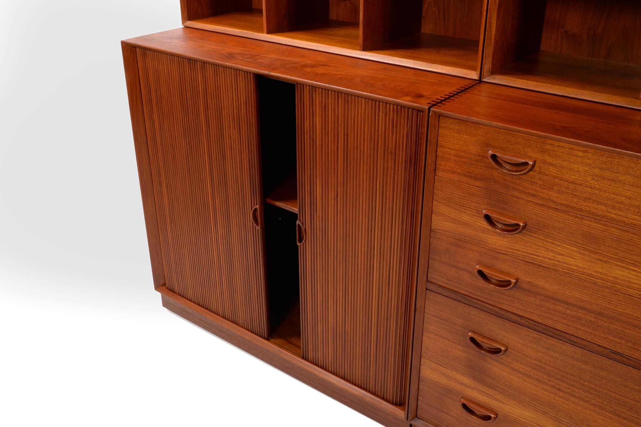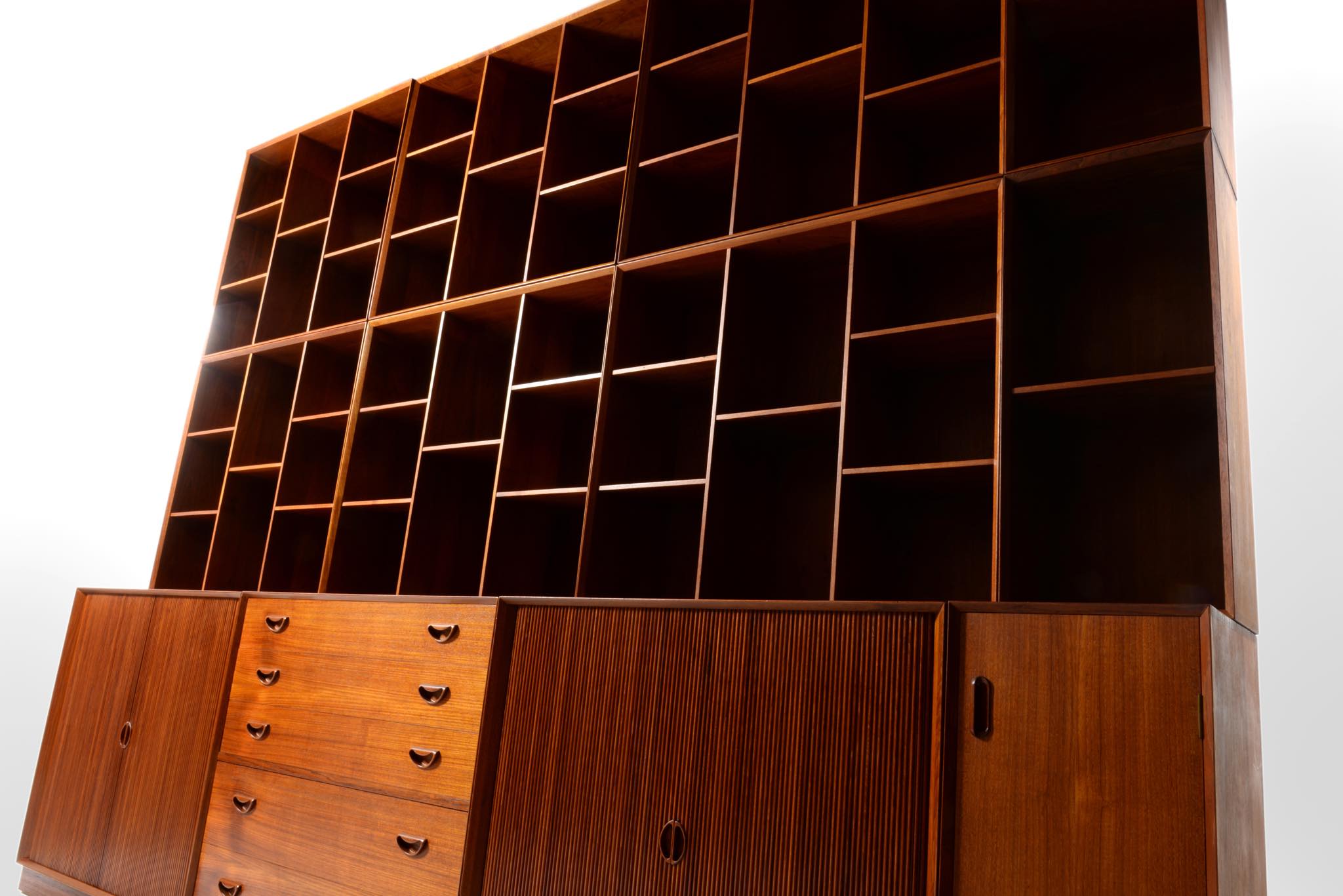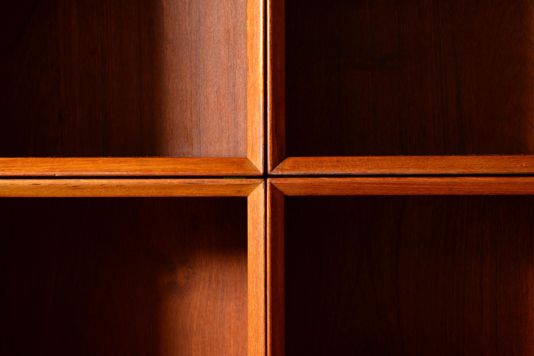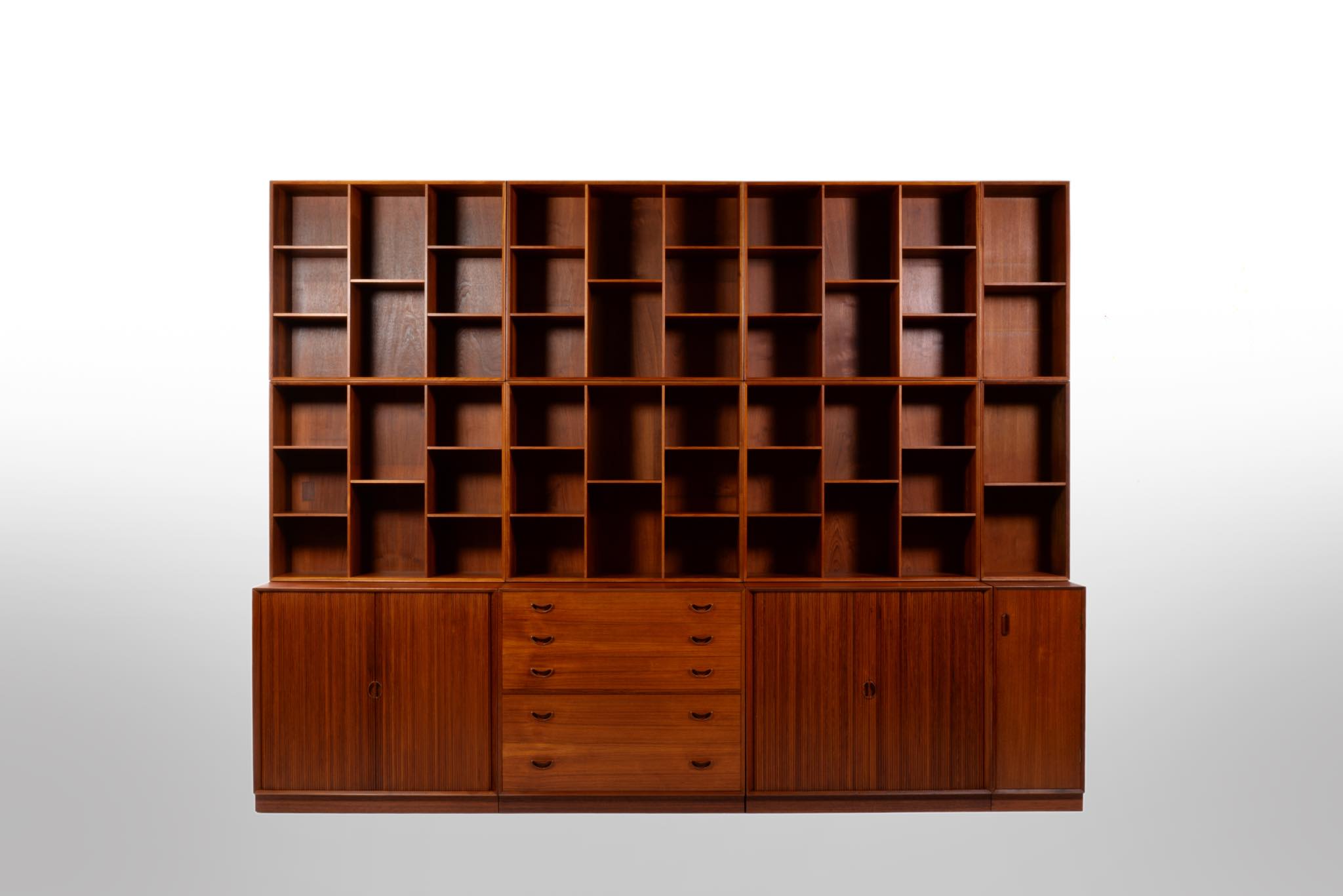 1950年代に活躍したデンマークのデザイナーユニット、Peter Hvidt/ピーター・ヴィッツとOrla Mølgaard Nielsen/オルラ・ミュルゴー・ニールセンによるブックケースキャビネットです。タイ国原産と思しき良質なチーク無垢材を用いたシリーズのもので、それぞれ異なる扉を有する3棹のキャビネットに6棹のシェルフ、加えて、あまり見かけない細いタイプの棚3棹を組み合わせた見所のあるものです。キャビネットの2棹は蛇腹式の扉のタイプで、開閉は軽くスムーズです。内部の棚板の位置は移動できます。一部、台輪に近い部分やエッジに小傷がありますが、あまり目立ちません。チェストは抽斗が5杯備わり、こちらも開閉はスムーズです。内部も使用感なく綺麗です。6棹のシェルフは日焼けも少なく状態は良いようです。一部背板に配線を通すための穴が開けられておりましたので、軽く塞いでおります。あまり見かけない細身のものは、同じくチークの無垢材を用いて作られておりますが、わずかに技法が異なるため、後から腕の良い職人さんが作製したものではないかと思われます。キャビネットとシェルフはそれぞれが独立したものなので、各本体を別な部屋で使用することも可能です。また、シェルフを壁へ取り付けるための金具がございますので、必要な際にはお申し付けください。各サイズやコンディションなど、詳細についてはお問い合わせください。