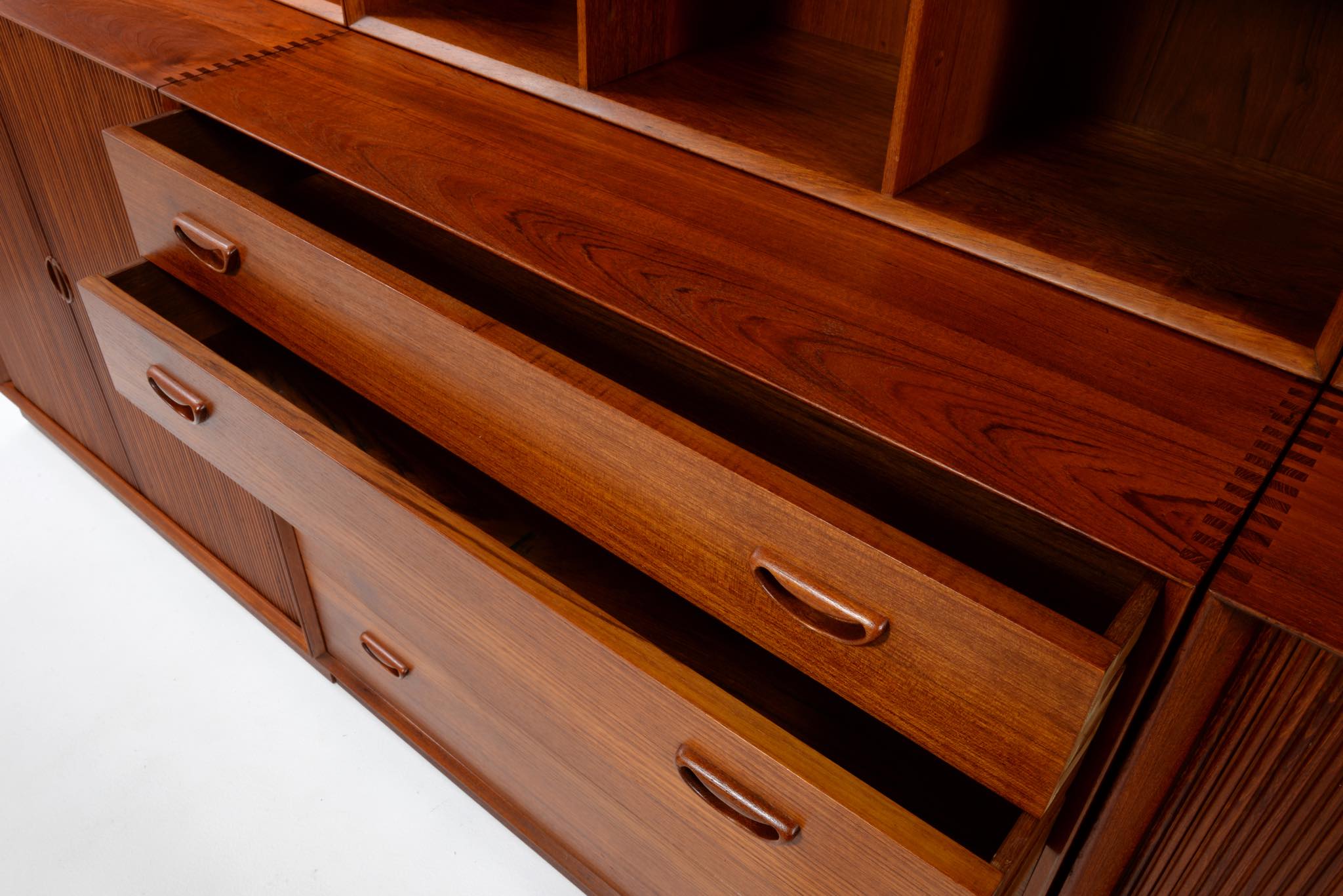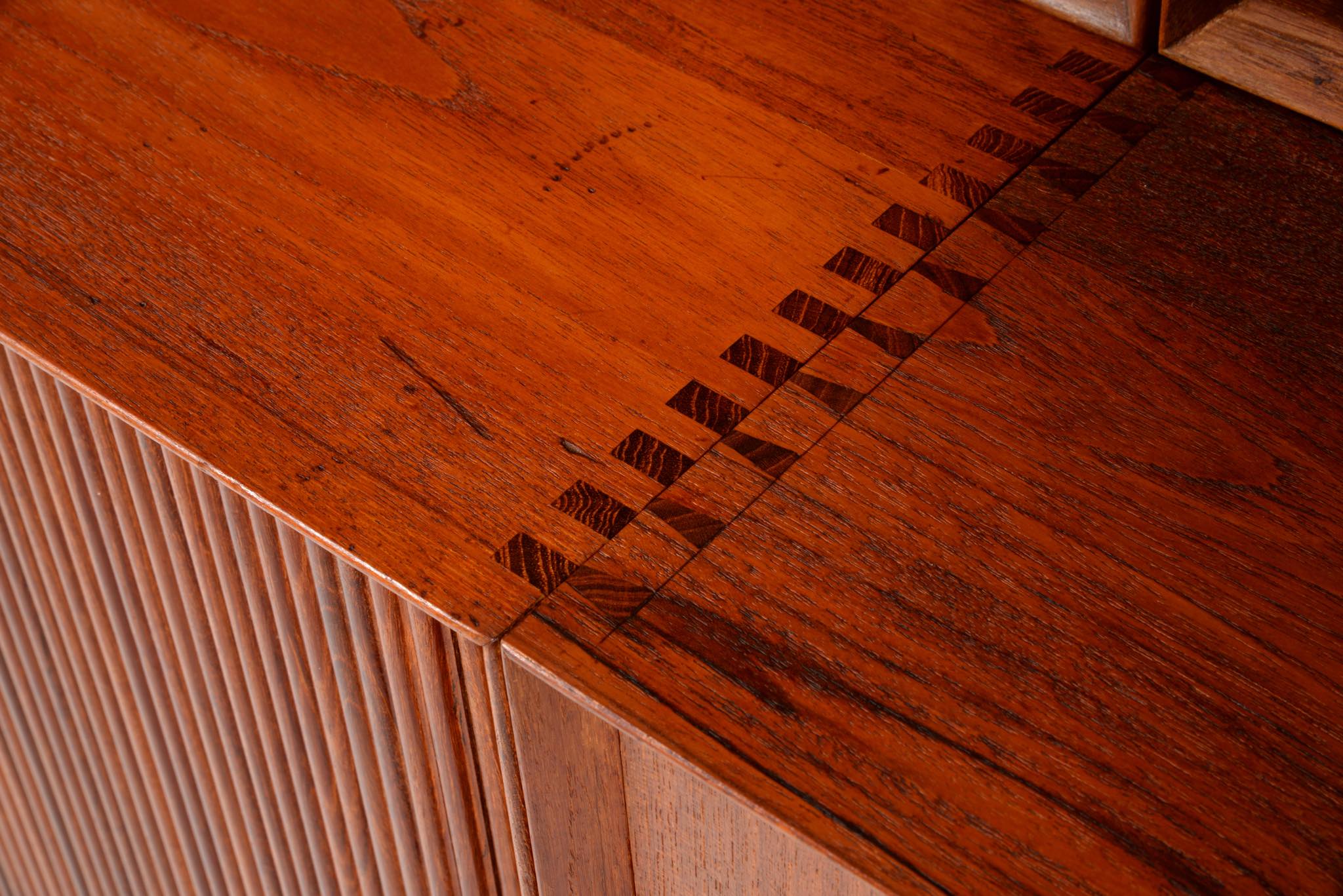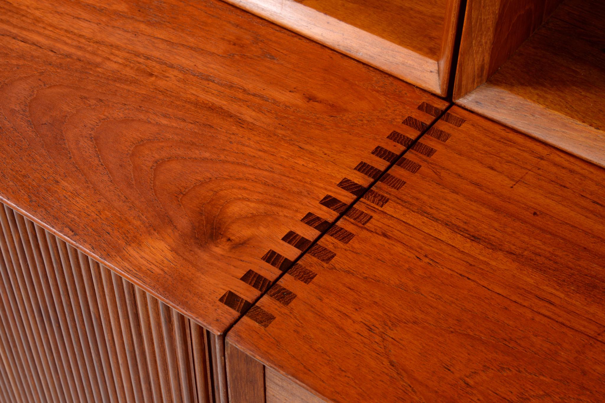 1950年代に活躍したデンマークのデザイナーユニット、Peter Hvidt/ピーター・ヴィッツとOrla Mølgaard Nielsen/オルラ・ミュルゴー・ニールセンによるブックケースキャビネットです。タイ国原産と思しき良質なチーク無垢材を用いたシリーズのもので、それぞれ異なる扉を有する3棹のキャビネットに6棹のシェルフ、加えて、あまり見かけない細いタイプの棚3棹を組み合わせた見所のあるものです。キャビネットの2棹は蛇腹式の扉のタイプで、開閉は軽くスムーズです。内部の棚板の位置は移動できます。一部、台輪に近い部分やエッジに小傷がありますが、あまり目立ちません。チェストは抽斗が5杯備わり、こちらも開閉はスムーズです。内部も使用感なく綺麗です。6棹のシェルフは日焼けも少なく状態は良いようです。一部背板に配線を通すための穴が開けられておりましたので、軽く塞いでおります。あまり見かけない細身のものは、同じくチークの無垢材を用いて作られておりますが、わずかに技法が異なるため、後から腕の良い職人さんが作製したものではないかと思われます。キャビネットとシェルフはそれぞれが独立したものなので、各本体を別な部屋で使用することも可能です。また、シェルフを壁へ取り付けるための金具がございますので、必要な際にはお申し付けください。各サイズやコンディションなど、詳細についてはお問い合わせください。