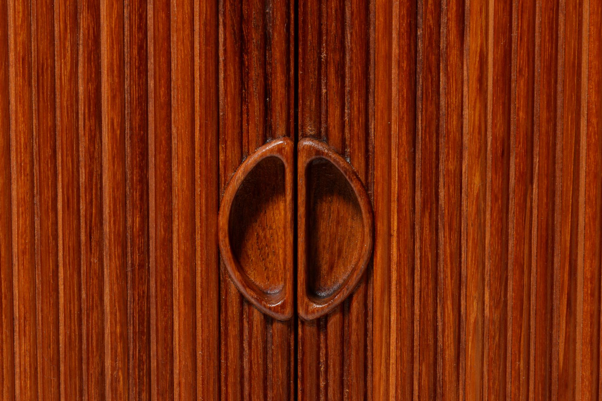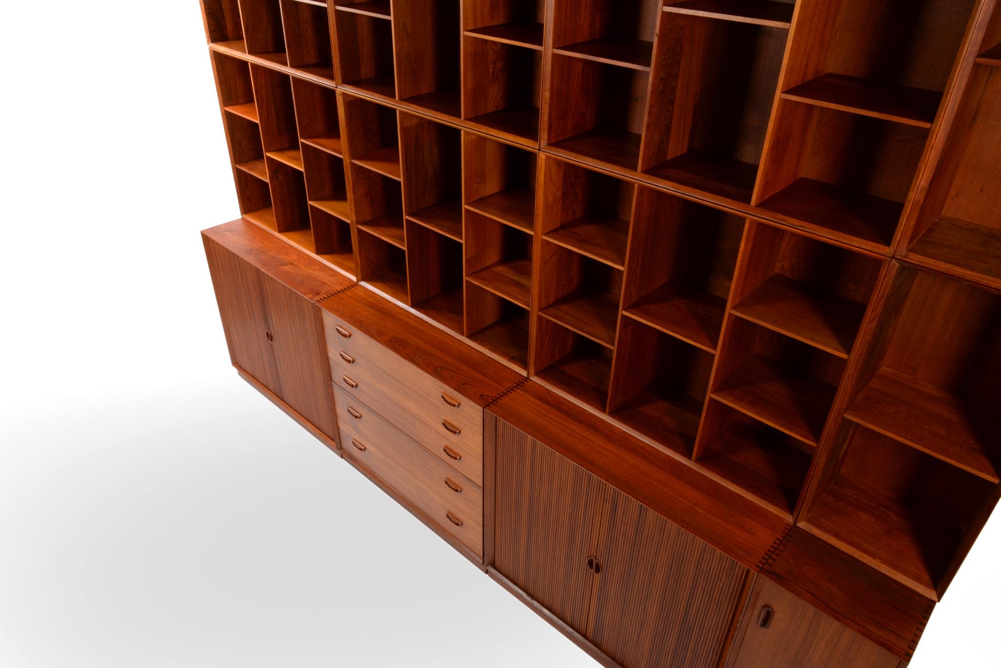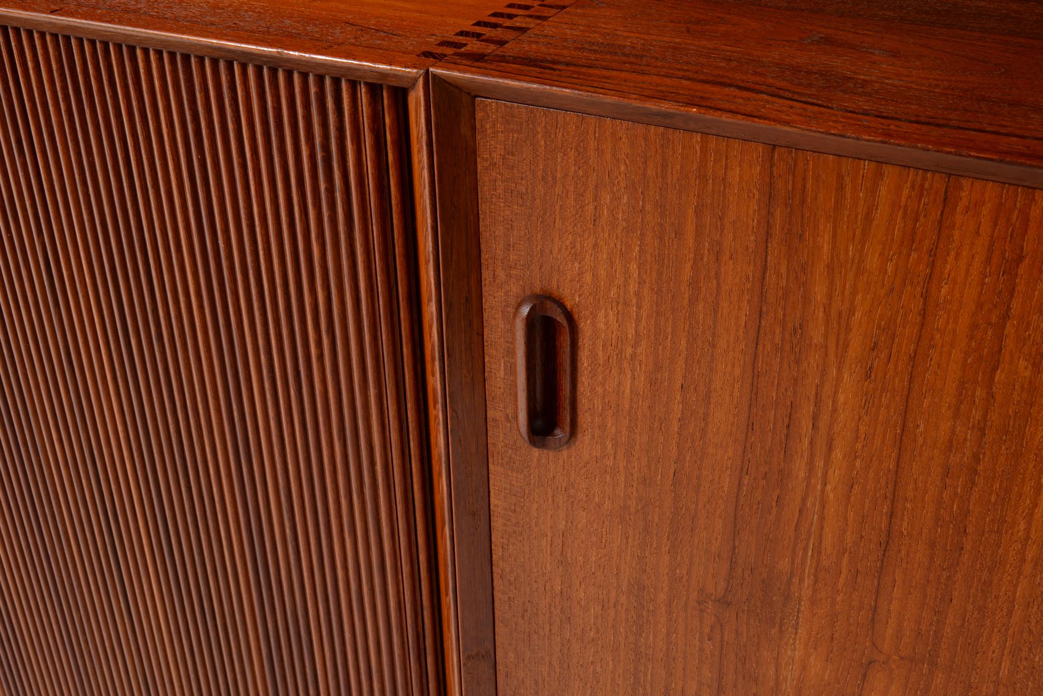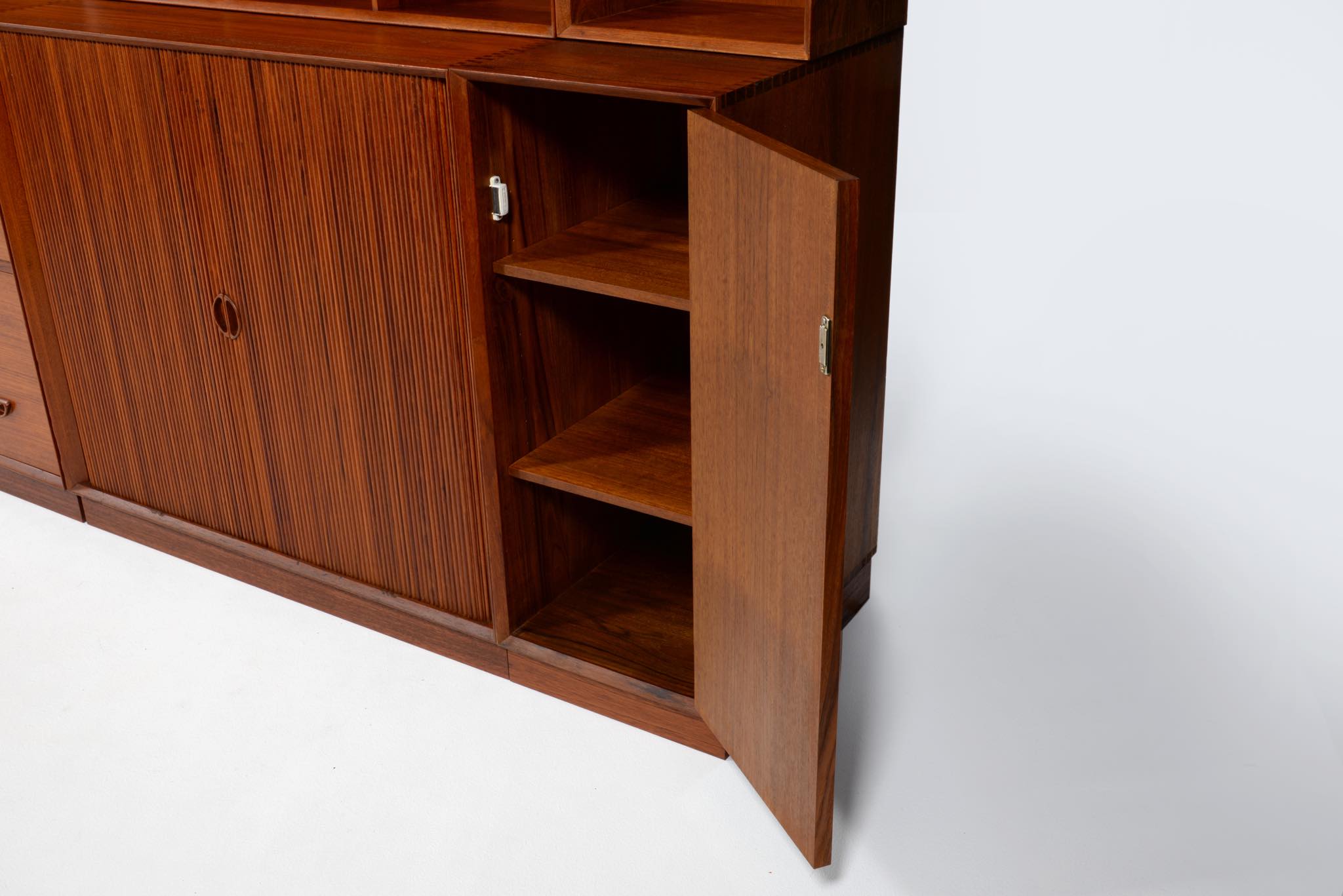 1950年代に活躍したデンマークのデザイナーユニット、Peter Hvidt/ピーター・ヴィッツとOrla Mølgaard Nielsen/オルラ・ミュルゴー・ニールセンによるブックケースキャビネットです。タイ国原産と思しき良質なチーク無垢材を用いたシリーズのもので、それぞれ異なる扉を有する3棹のキャビネットに6棹のシェルフ、加えて、あまり見かけない細いタイプの棚3棹を組み合わせた見所のあるものです。キャビネットの2棹は蛇腹式の扉のタイプで、開閉は軽くスムーズです。内部の棚板の位置は移動できます。一部、台輪に近い部分やエッジに小傷がありますが、あまり目立ちません。チェストは抽斗が5杯備わり、こちらも開閉はスムーズです。内部も使用感なく綺麗です。6棹のシェルフは日焼けも少なく状態は良いようです。一部背板に配線を通すための穴が開けられておりましたので、軽く塞いでおります。あまり見かけない細身のものは、同じくチークの無垢材を用いて作られておりますが、わずかに技法が異なるため、後から腕の良い職人さんが作製したものではないかと思われます。キャビネットとシェルフはそれぞれが独立したものなので、各本体を別な部屋で使用することも可能です。また、シェルフを壁へ取り付けるための金具がございますので、必要な際にはお申し付けください。各サイズやコンディションなど、詳細についてはお問い合わせください。