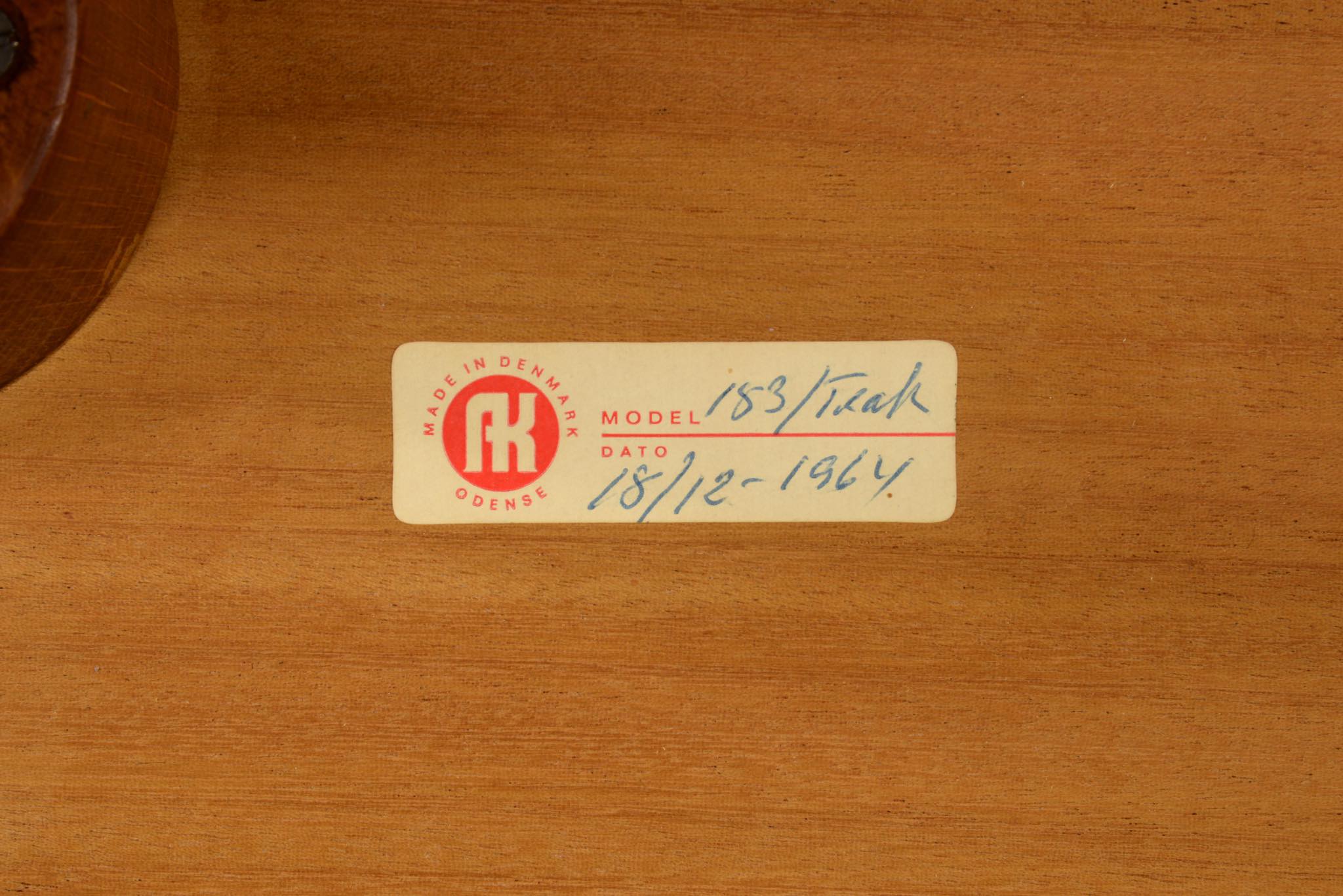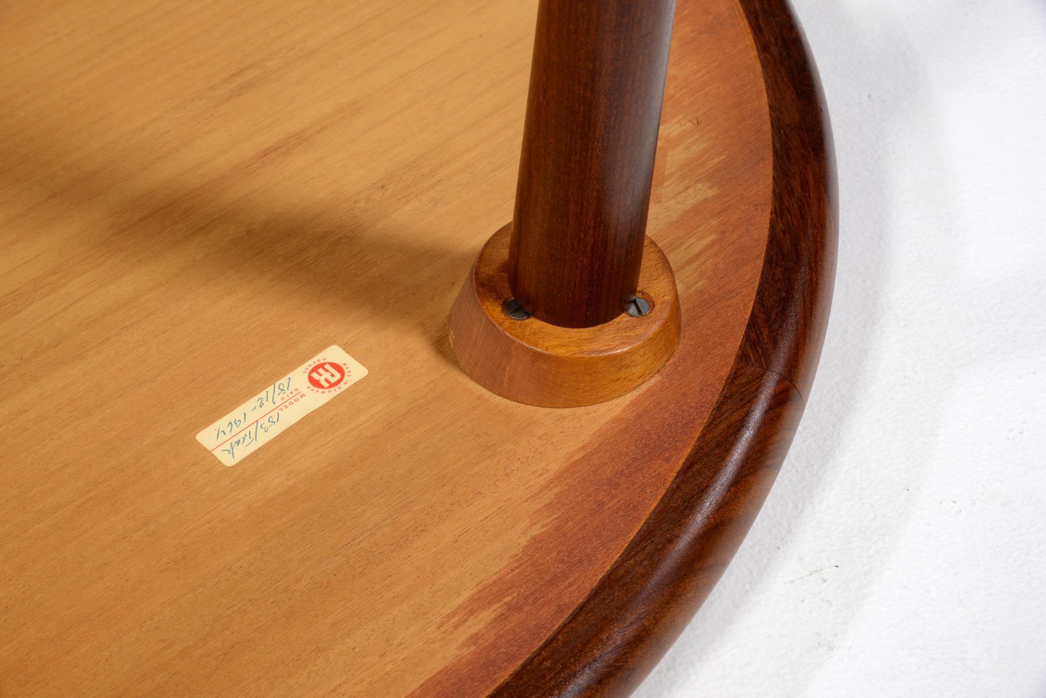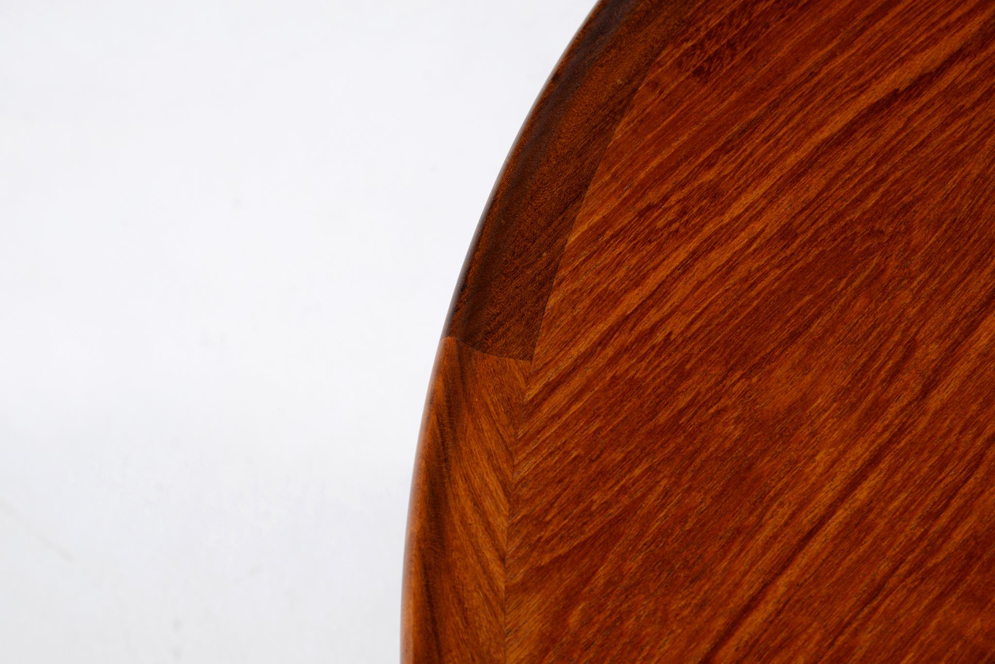デンマークの家具工房、Anton Kildebergsによるラウンド型コーヒーテーブル、1964年に作られたものです。当時少なくとも二種類のサイズ展開があったようで、こちらは直径の大きなタイプです。天板はチーク材の突き板で作られており、天板の縁回しと、取り外し可能な脚にはアフロルモシアの無垢材が用いられています。