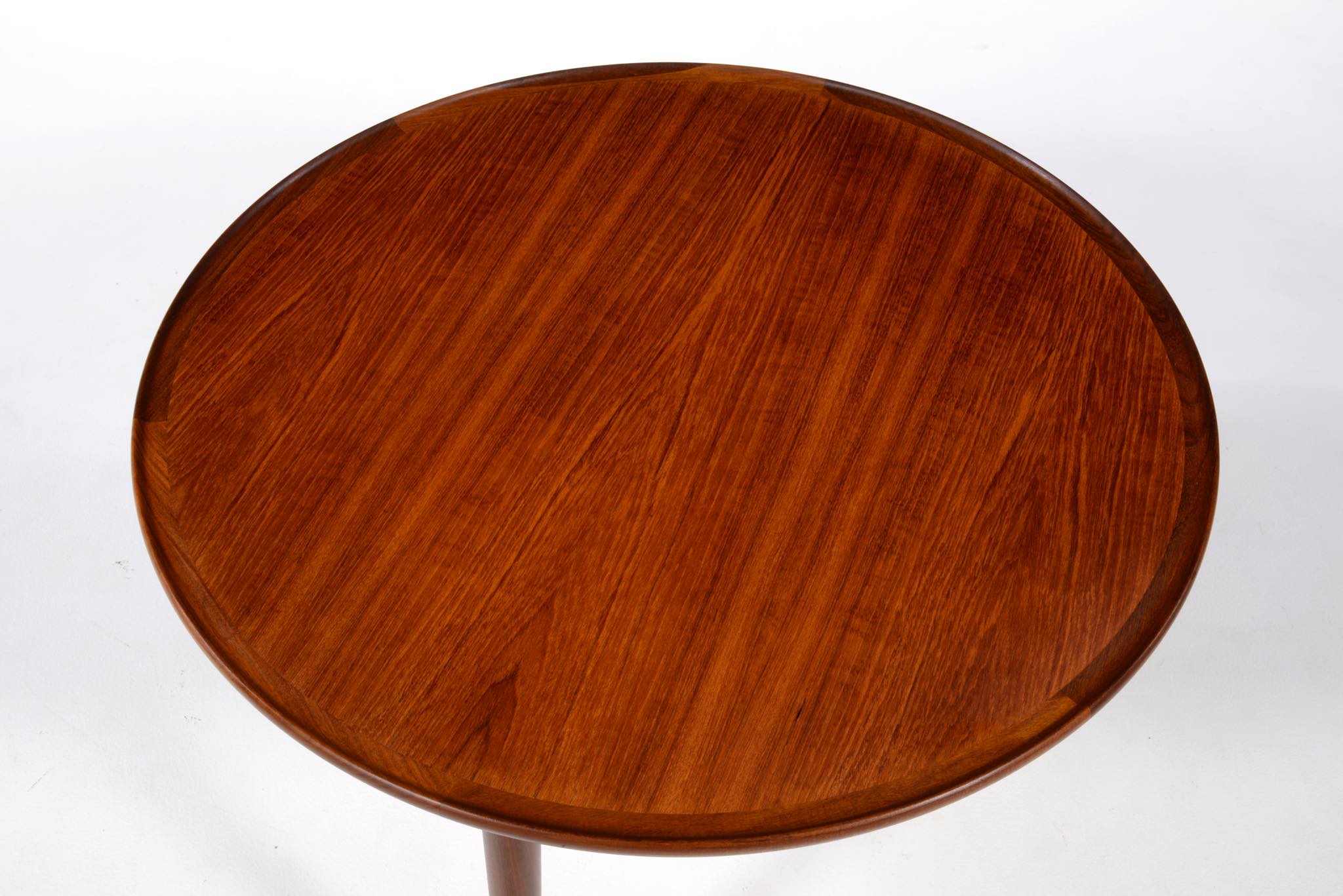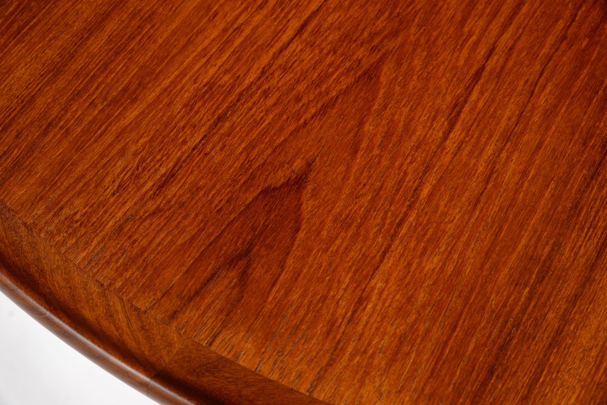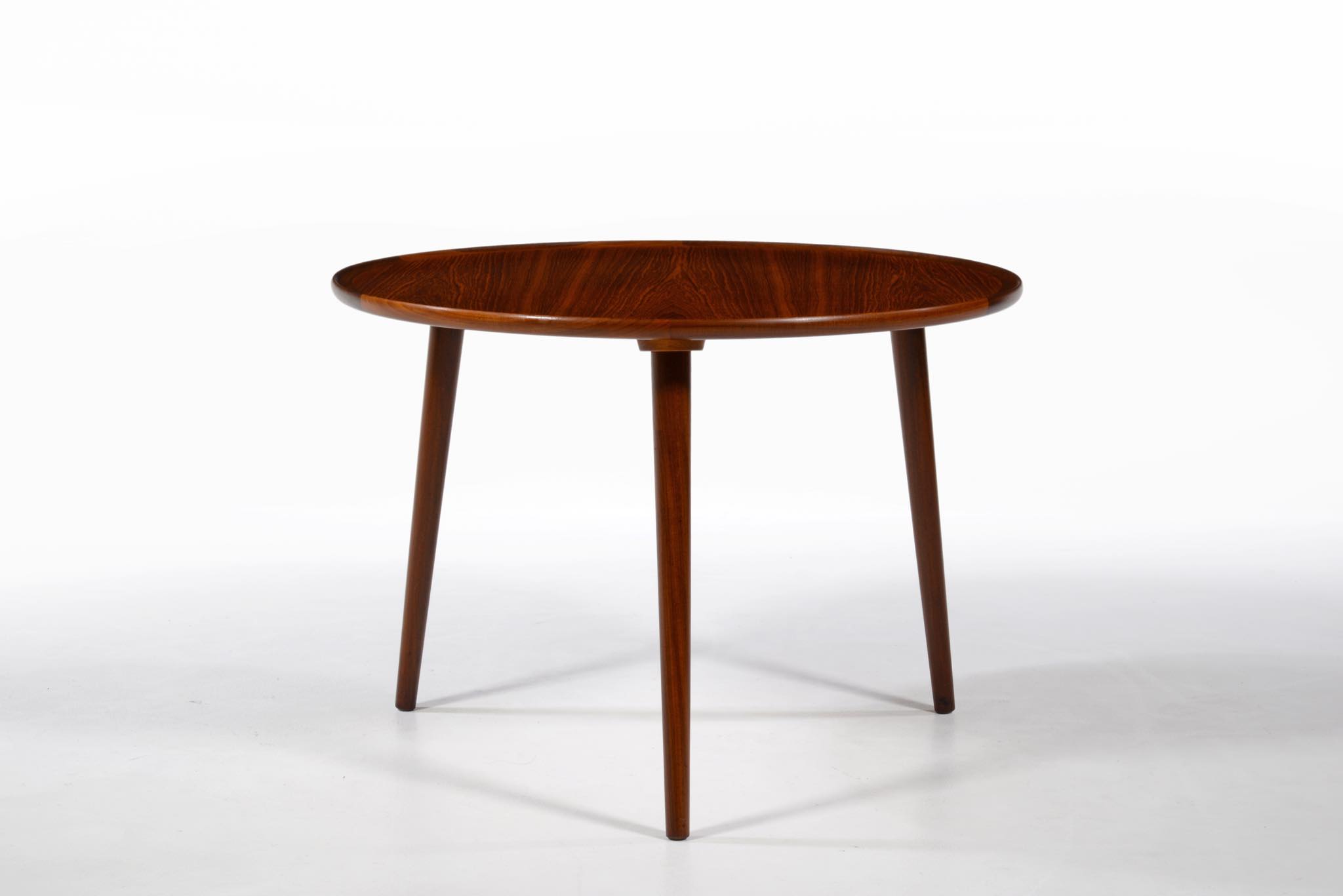 デンマークの家具工房、Anton Kildebergsによるラウンド型コーヒーテーブル、1964年に作られたものです。当時少なくとも二種類のサイズ展開があったようで、こちらは直径の大きなタイプです。天板はチーク材の突き板で作られており、天板の縁回しと、取り外し可能な脚にはアフロルモシアの無垢材が用いられています。