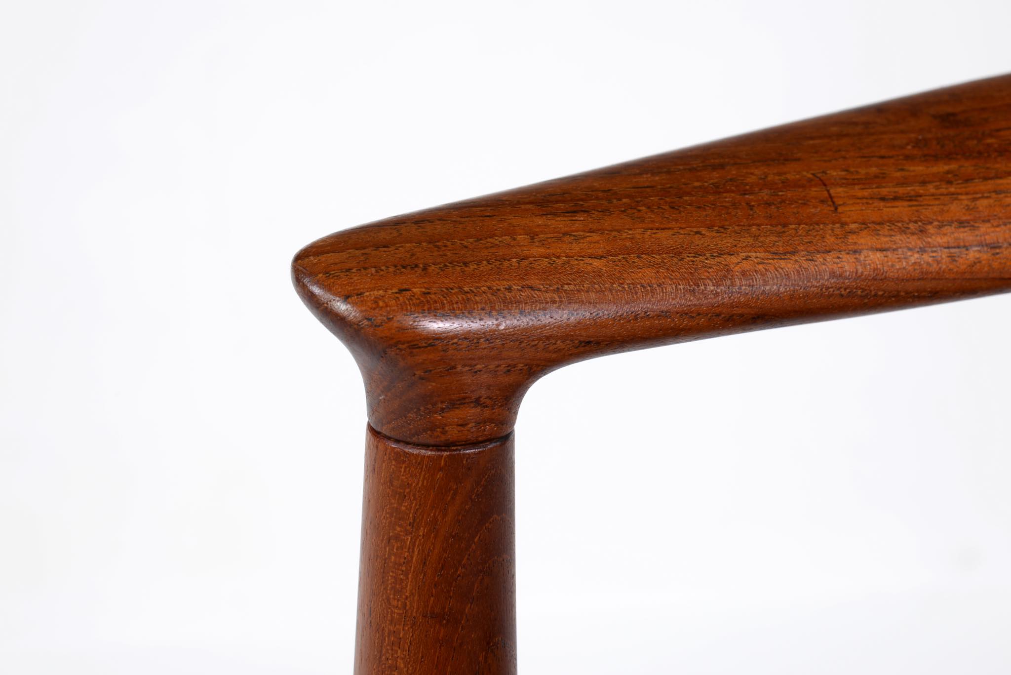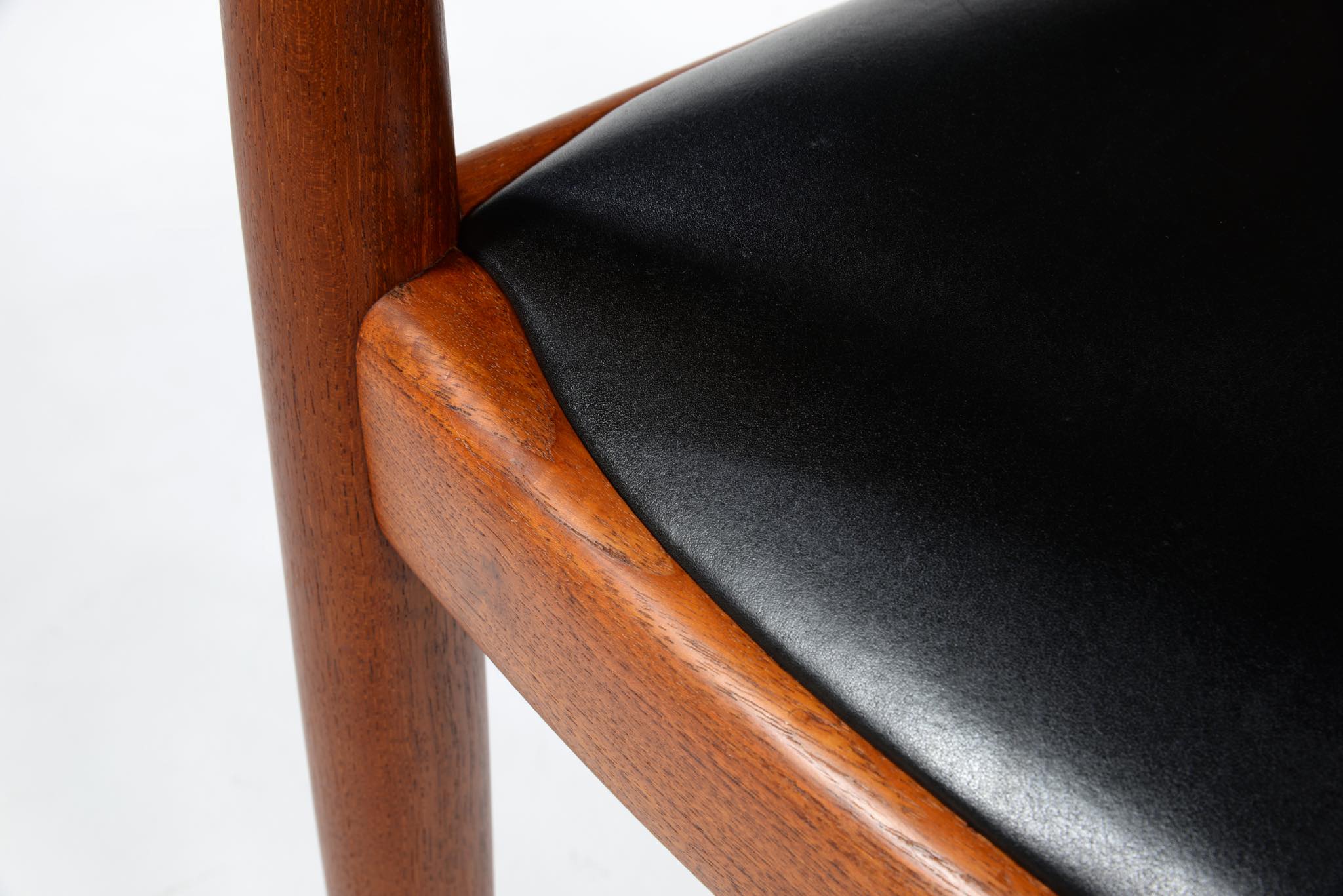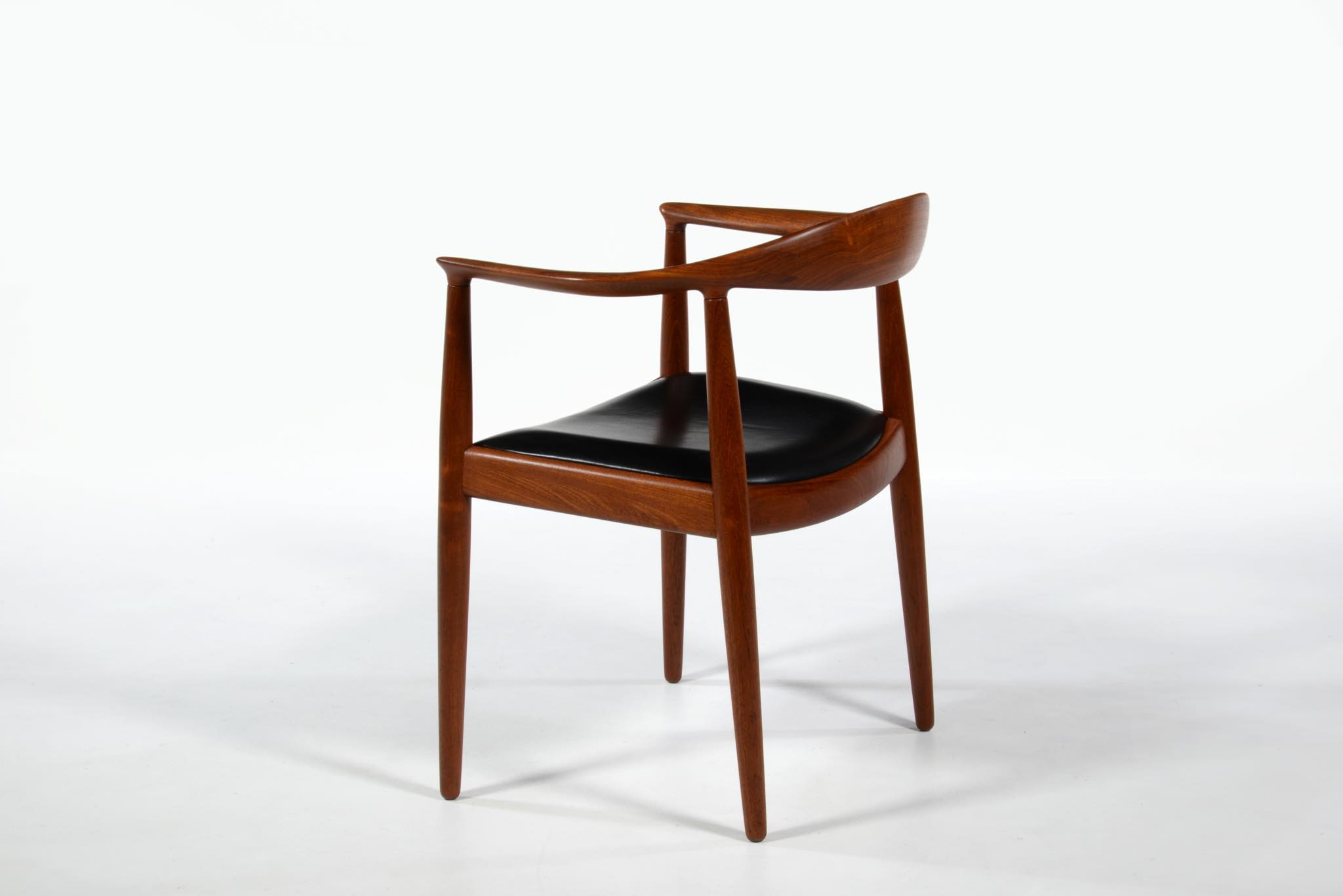 デンマークを代表する家具デザイナー、ハンス・ウェグナーによる代表作 “ザ・チェア”、チーク材のモデル、シートは黒色の皮革張りです。1960年にアメリカのCNNテレビで大統領候補のジョン・F・ケネディとリチャード・ニクソンが討論会を行った際に使われた椅子として知られています。笠木には木目に変化のある材を木取りしています。ウェグナー作品では木目に変化のある部位をあえて目立つ箇所へ木取りすることが多いように見受けられます。アームの先端に小さなアタリが見られ、かつてパテにて補修した箇所が見られますが、全体にきれいな状態です。