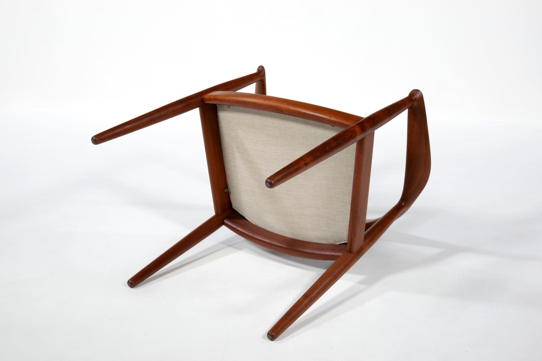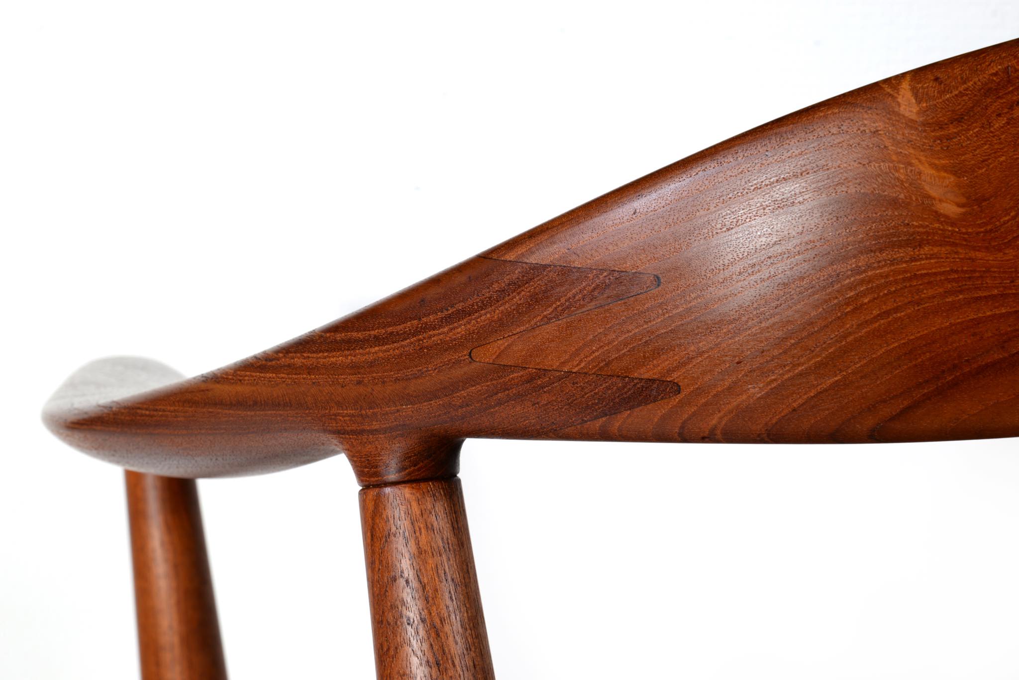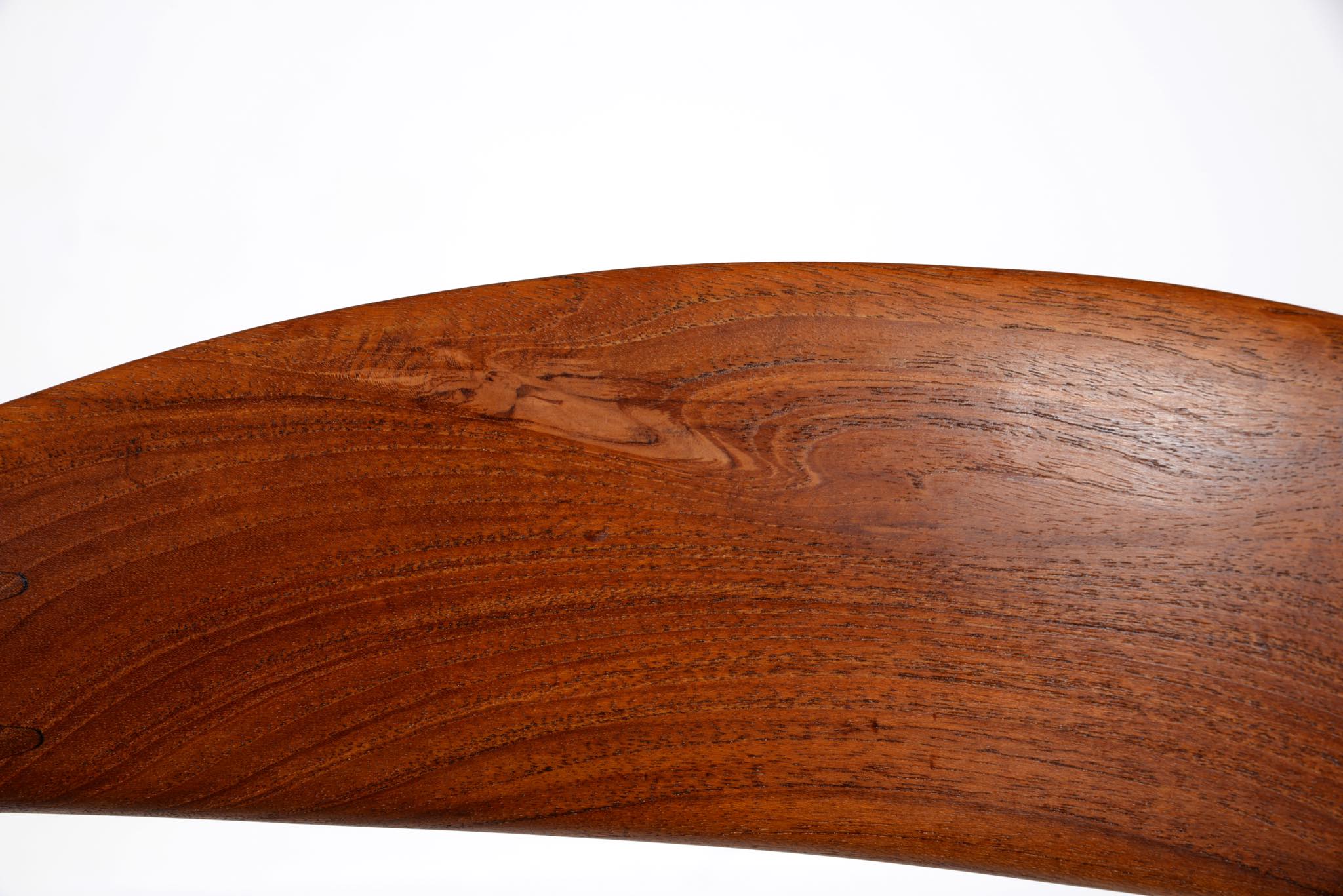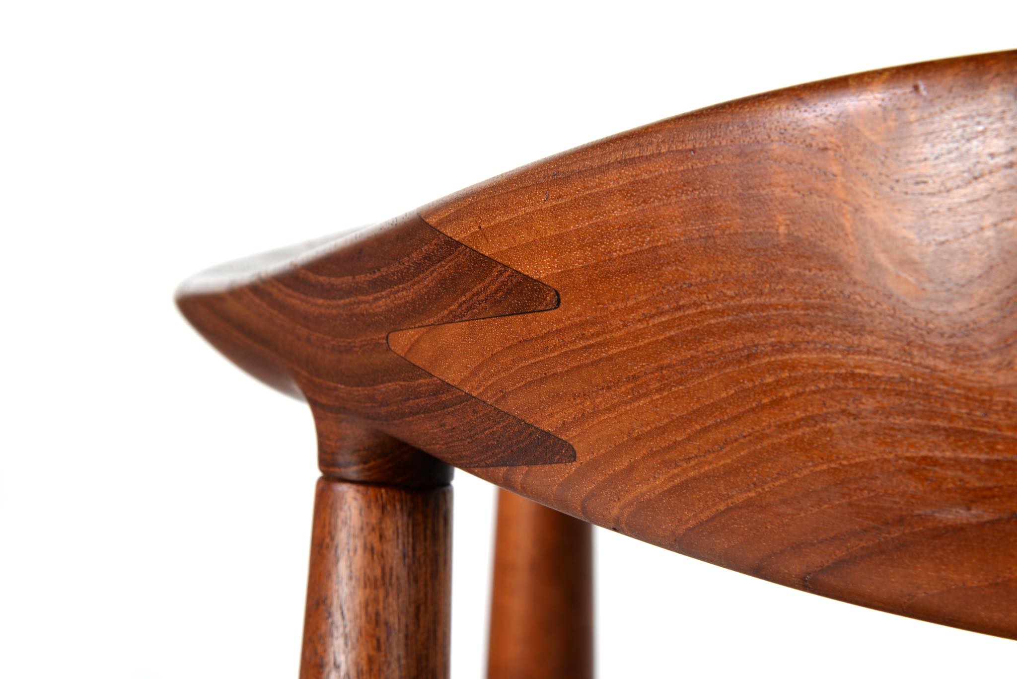 デンマークを代表する家具デザイナー、ハンス・ウェグナーによる代表作 “ザ・チェア”、チーク材のモデル、シートは黒色の皮革張りです。1960年にアメリカのCNNテレビで大統領候補のジョン・F・ケネディとリチャード・ニクソンが討論会を行った際に使われた椅子として知られています。笠木には木目に変化のある材を木取りしています。ウェグナー作品では木目に変化のある部位をあえて目立つ箇所へ木取りすることが多いように見受けられます。アームの先端に小さなアタリが見られ、かつてパテにて補修した箇所が見られますが、全体にきれいな状態です。