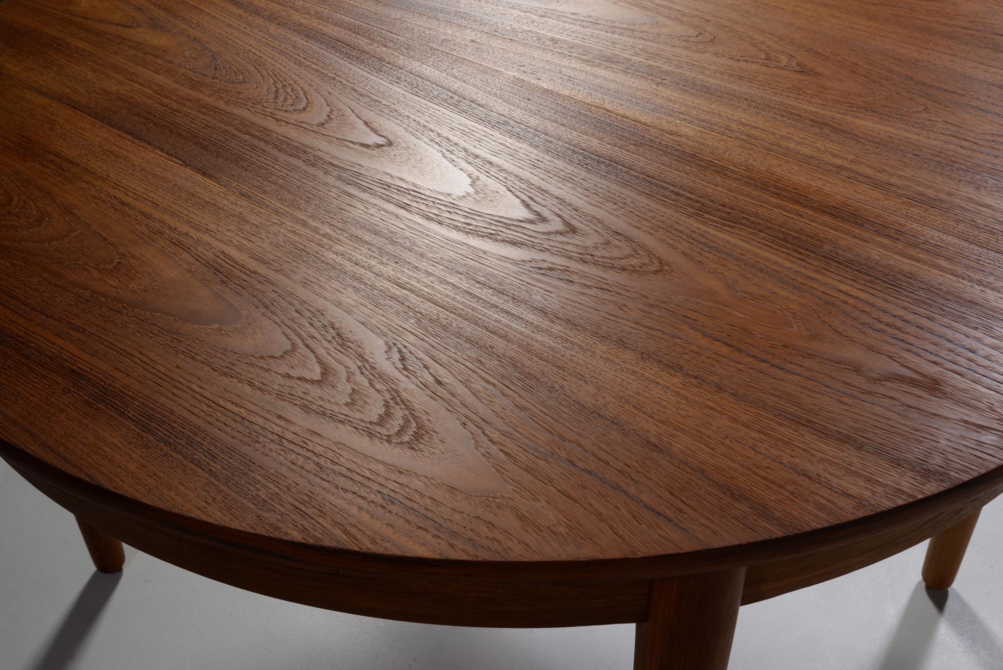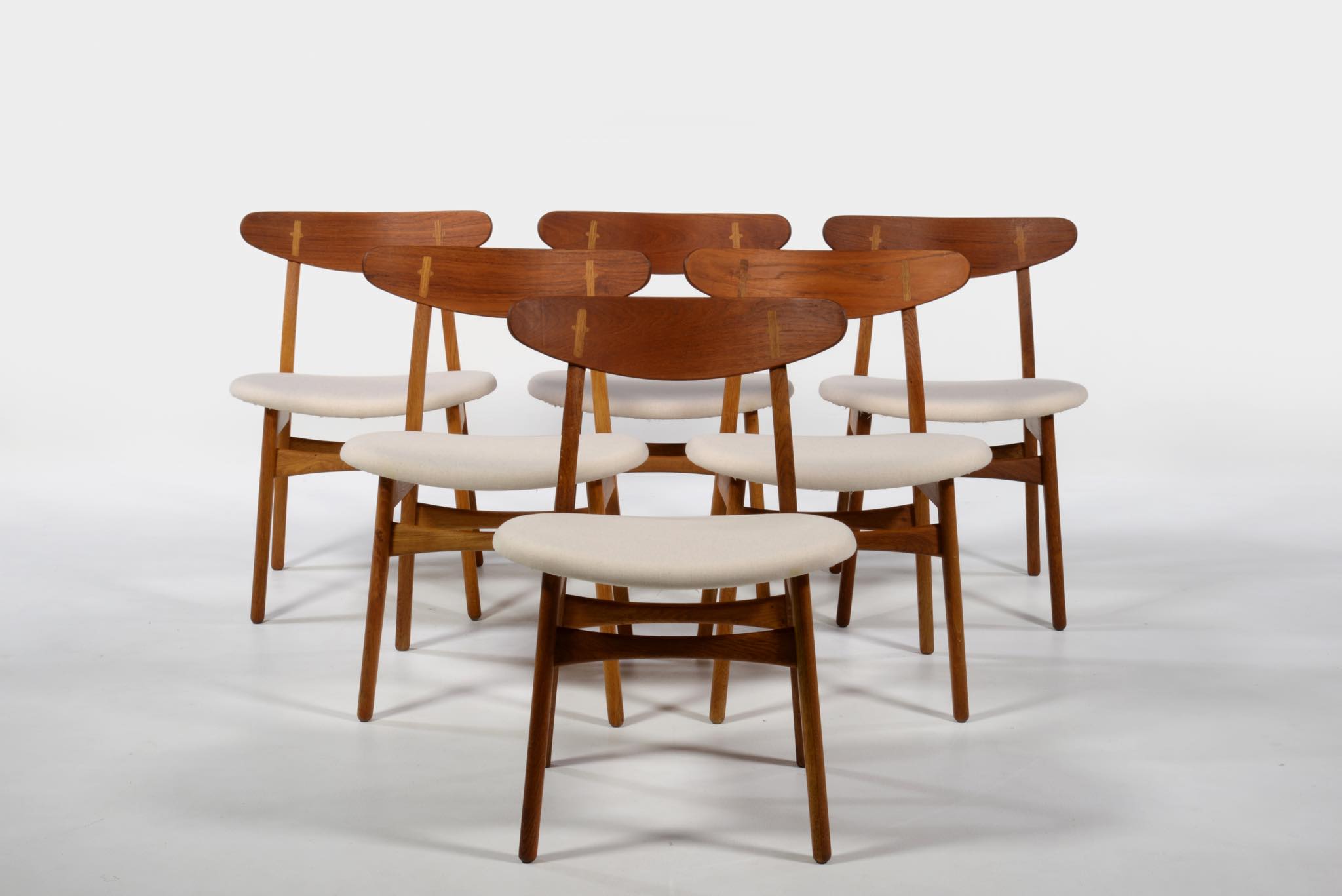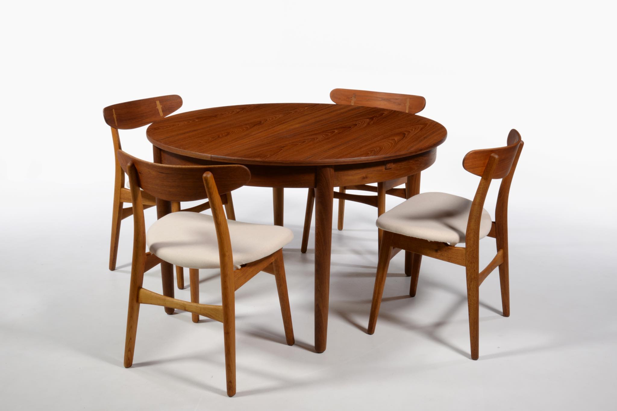 デンマークを代表する家具デザイナー、ハンス・ウェグナーによるダイニングセットです。ラウンド型テーブルと椅子6脚との計7点セットとなります。テーブルはAndreas Tuck社製、1959年発表の"AT302"です。天板、幕板、脚の全てがチーク材で、エクステンションリーフが一枚のみ付属します。エクステンション時でも脚の位置は変わらず、天板のみがスライドするタイプで、ひとりでも拡張が可能です。椅子は当時人気のあったモデル "CH-30"で、6脚揃っての伝世品です。笠木はチーク材、脚はオーク材のコンビネーションに時代感が反映されています。ファブリックは仮張りの状態ですので、お好きな生地や皮革をお選びください。詳しくはお問い合わせください。