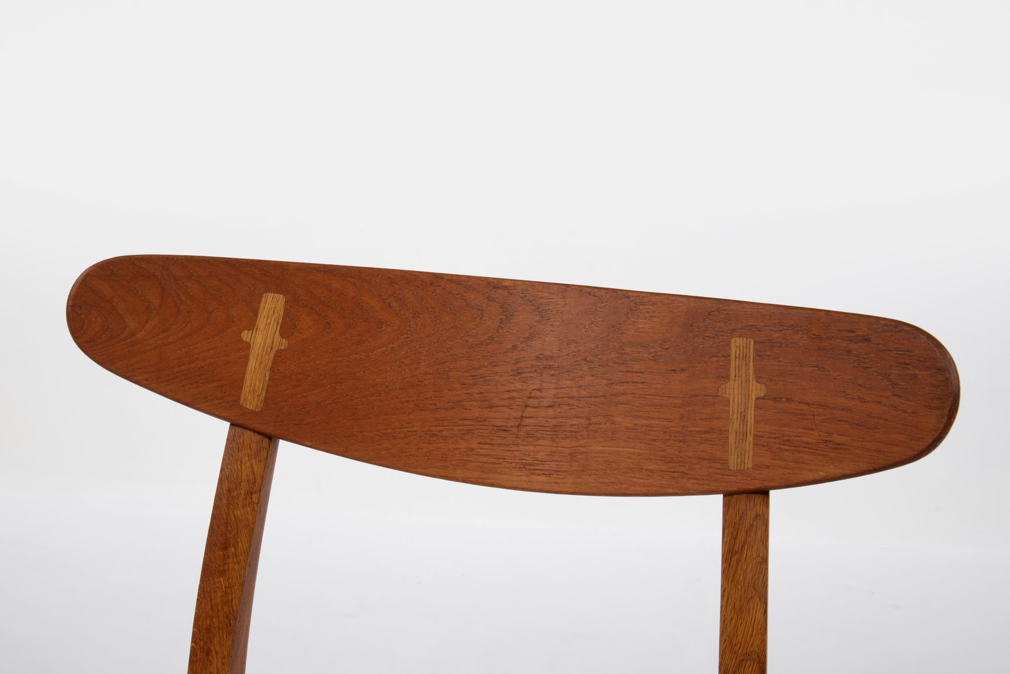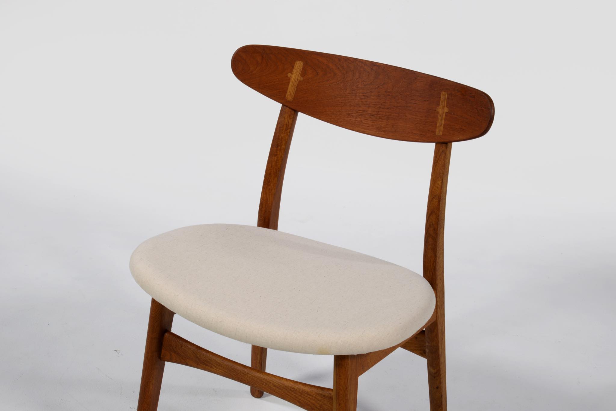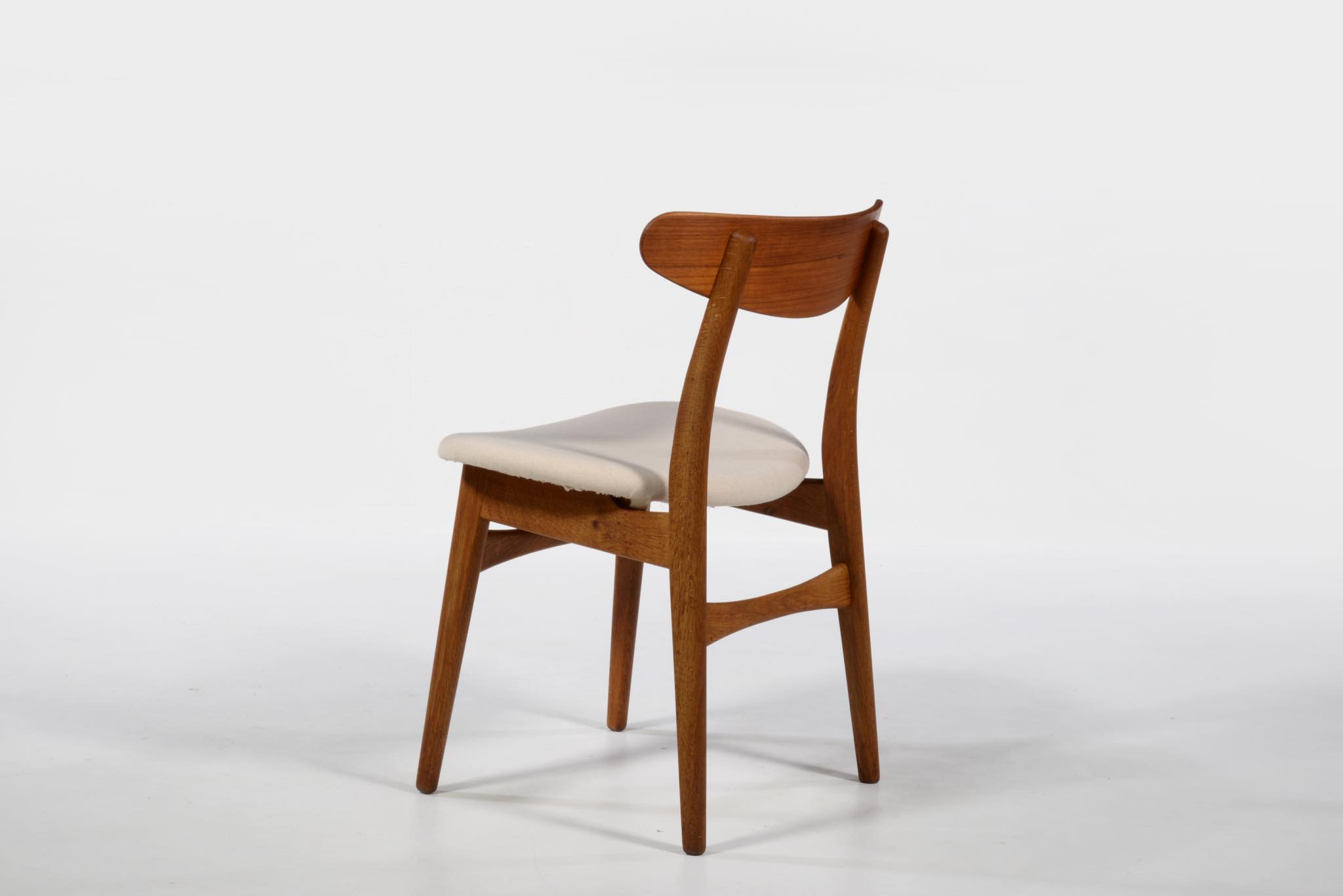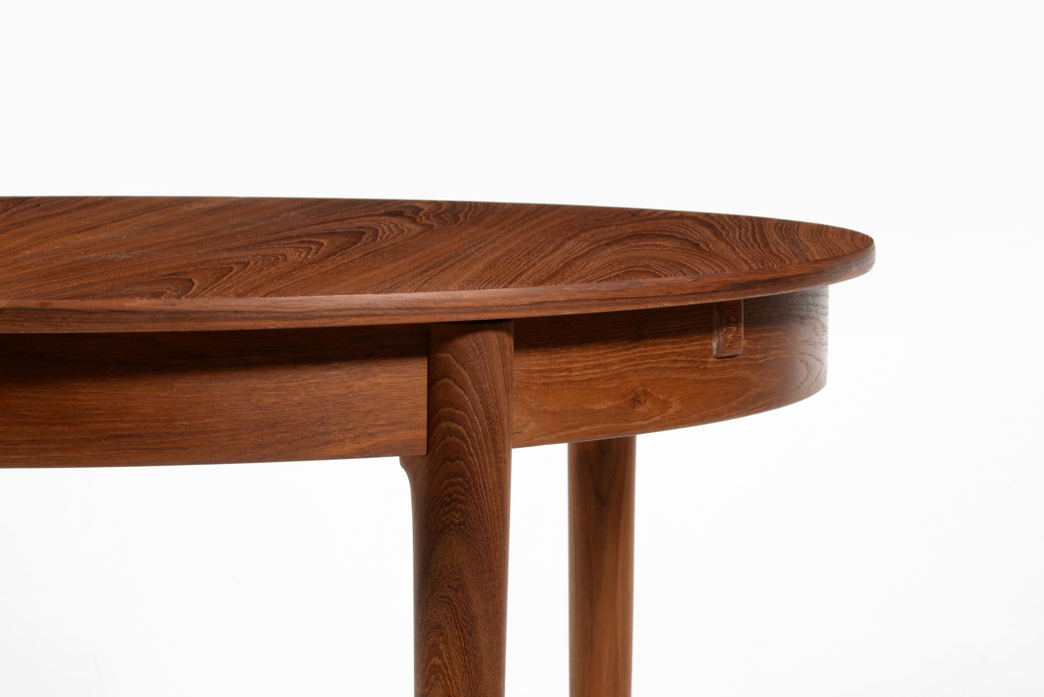 デンマークを代表する家具デザイナー、ハンス・ウェグナーによるダイニングセットです。ラウンド型テーブルと椅子6脚との計7点セットとなります。テーブルはAndreas Tuck社製、1959年発表の"AT302"です。天板、幕板、脚の全てがチーク材で、エクステンションリーフが一枚のみ付属します。エクステンション時でも脚の位置は変わらず、天板のみがスライドするタイプで、ひとりでも拡張が可能です。椅子は当時人気のあったモデル "CH-30"で、6脚揃っての伝世品です。笠木はチーク材、脚はオーク材のコンビネーションに時代感が反映されています。ファブリックは仮張りの状態ですので、お好きな生地や皮革をお選びください。詳しくはお問い合わせください。