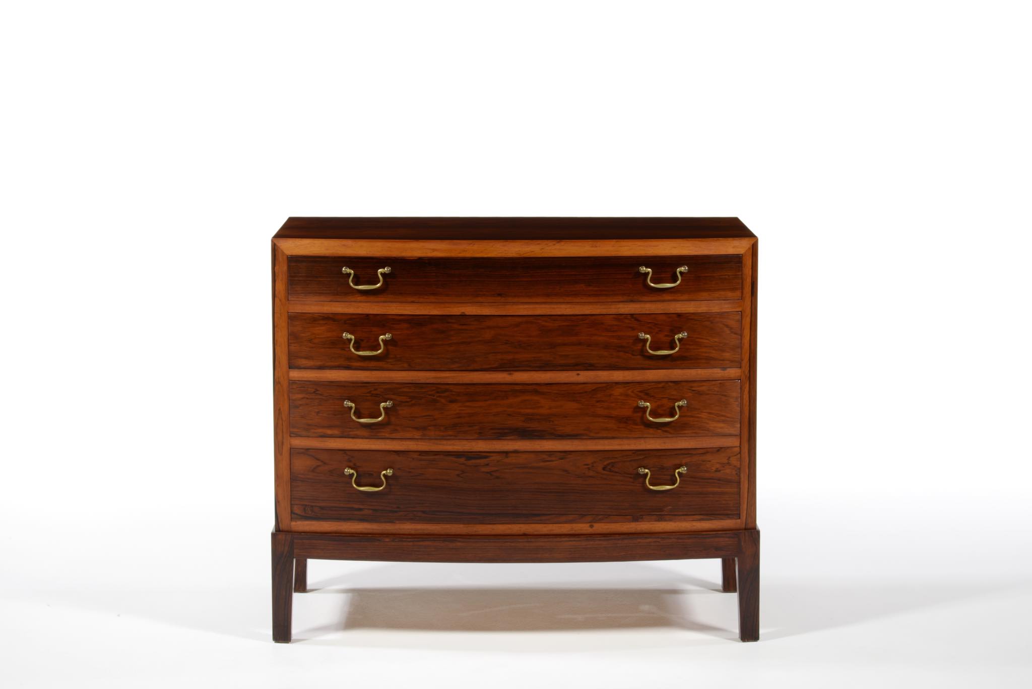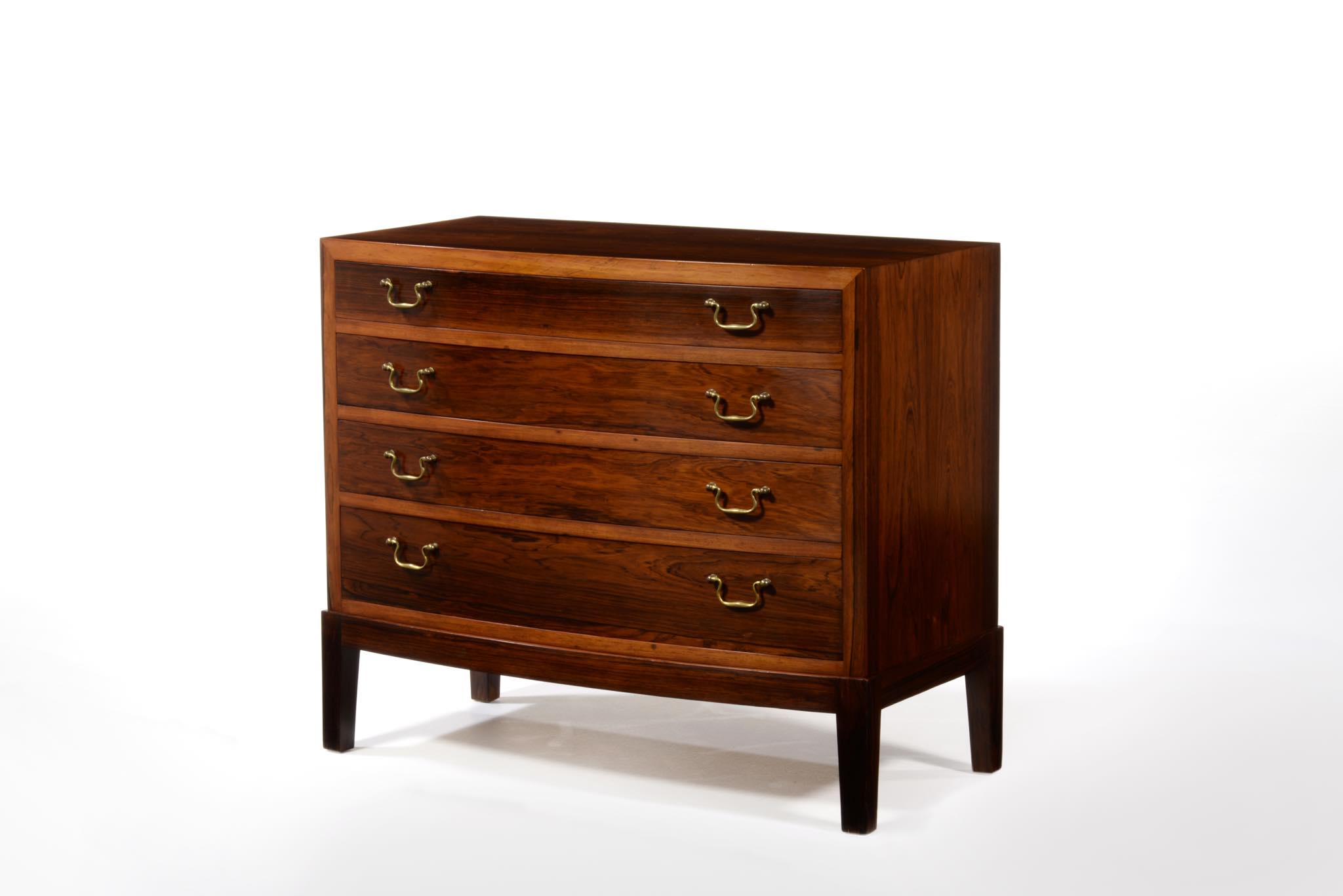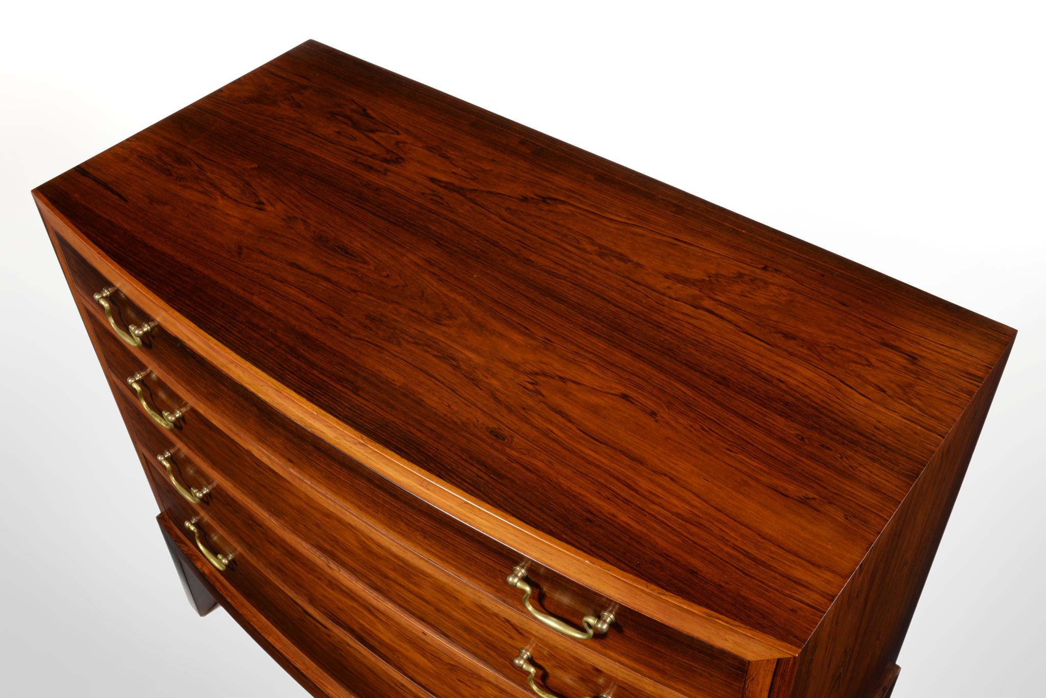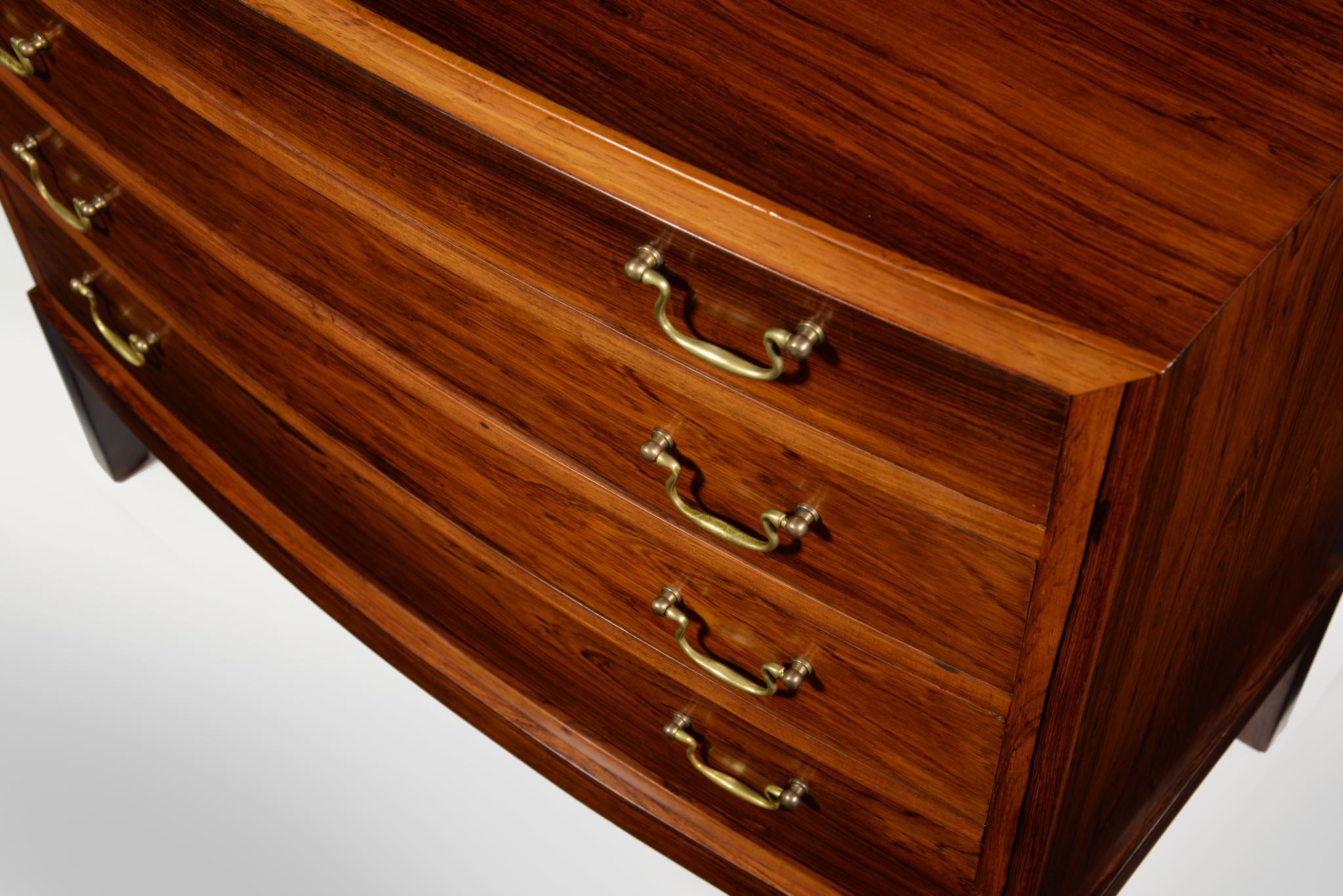 デンマークの家具工房によるボウフロントチェストです。工房やデザイナーなど詳細は判っておりませんが、丁寧な作りのもので、デンマークのオークションハウスにて、オーレ・ヴァンシャーによるものとして出品されておりました。ブラジル原産と思しき良質なローズウッド材が用いられ、真鍮の引手が備わるなど、クラシックな趣のチェストです。天板に小傷や染み、抽斗内部にも若干の染みが見られますが、全体にきれいな状態です。