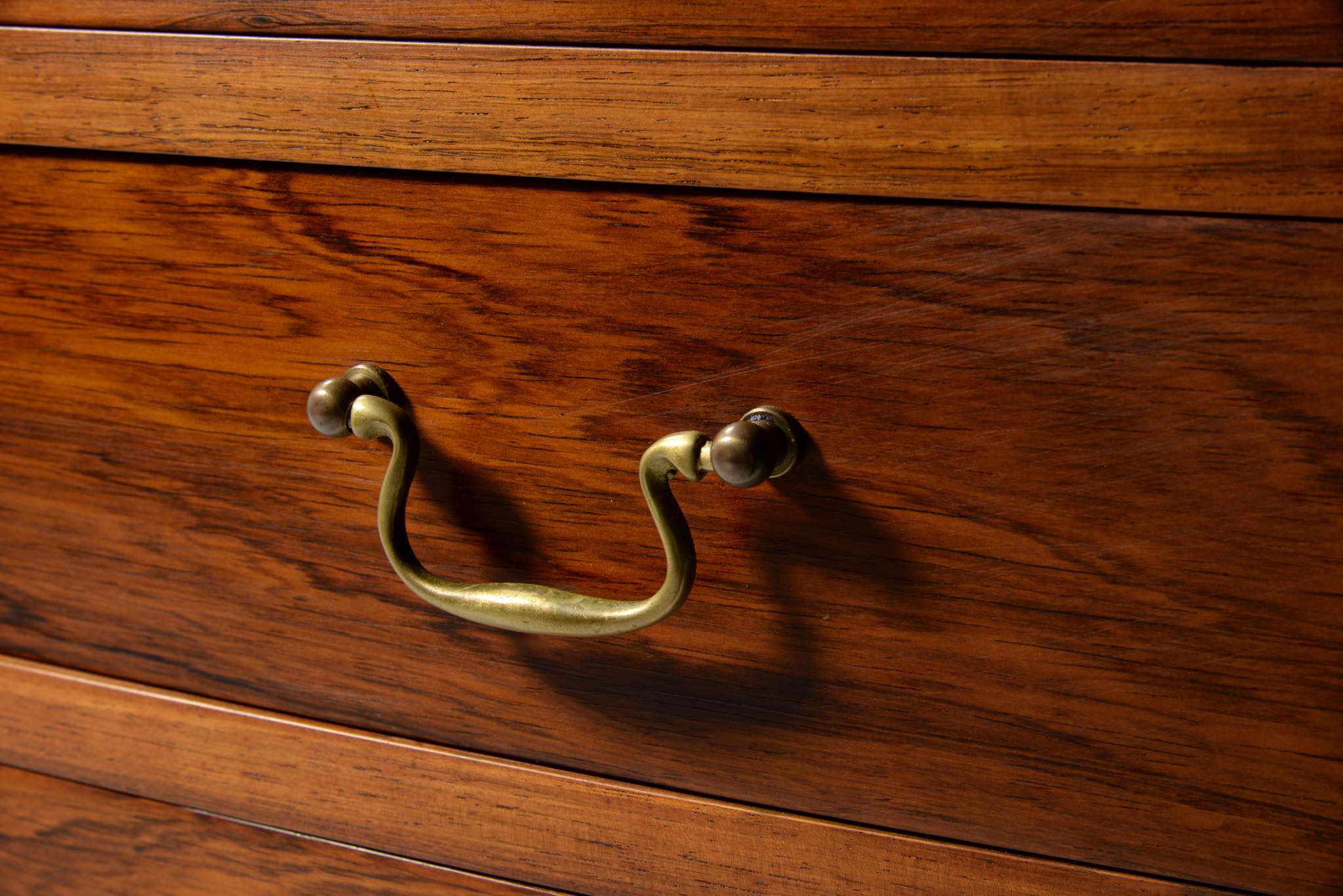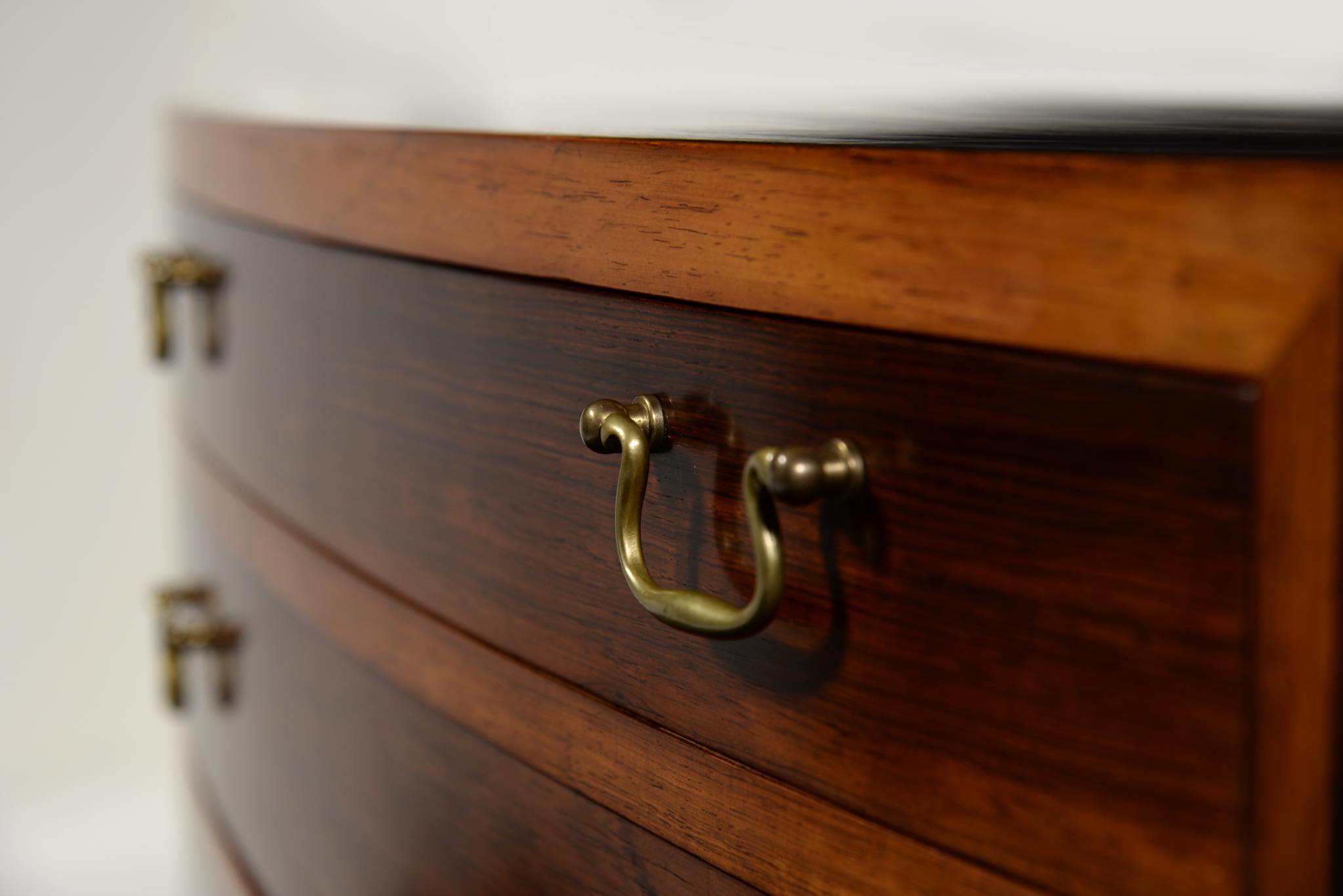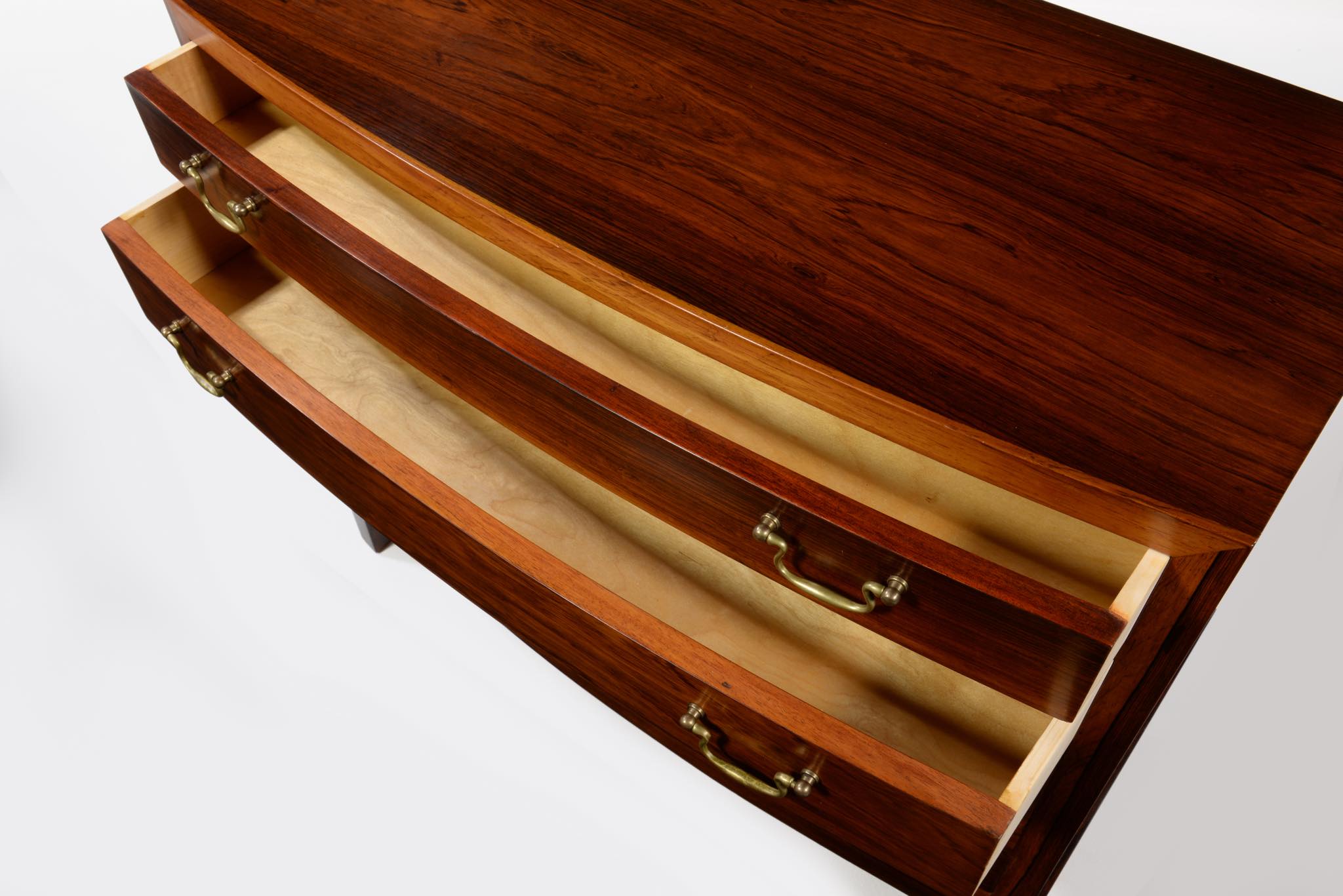 デンマークの家具工房によるボウフロントチェストです。工房やデザイナーなど詳細は判っておりませんが、丁寧な作りのもので、デンマークのオークションハウスにて、オーレ・ヴァンシャーによるものとして出品されておりました。ブラジル原産と思しき良質なローズウッド材が用いられ、真鍮の引手が備わるなど、クラシックな趣のチェストです。天板に小傷や染み、抽斗内部にも若干の染みが見られますが、全体にきれいな状態です。