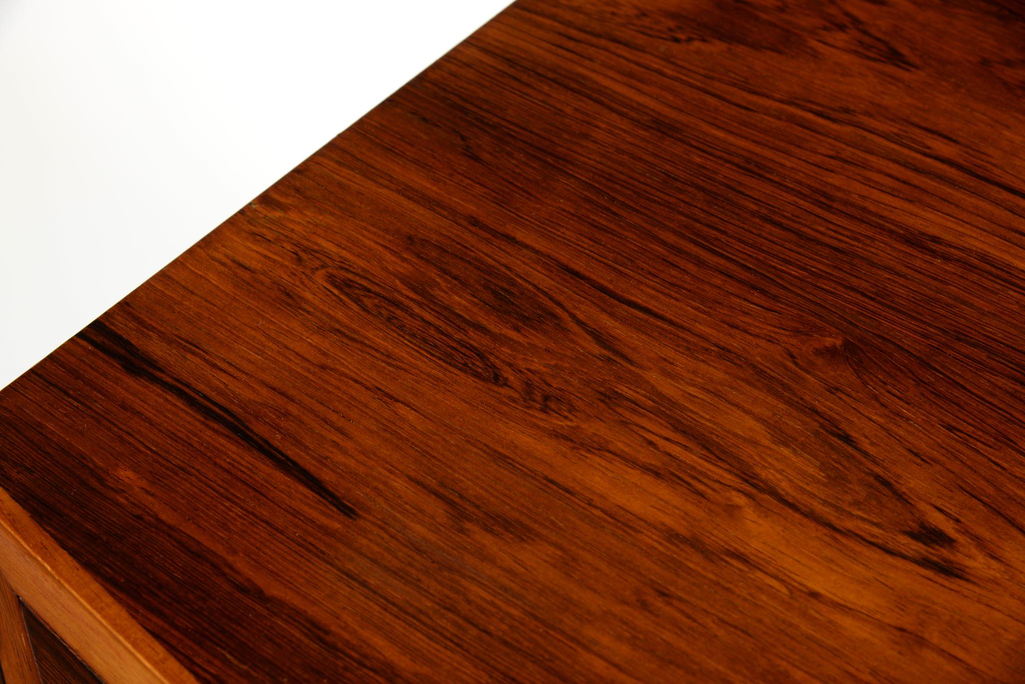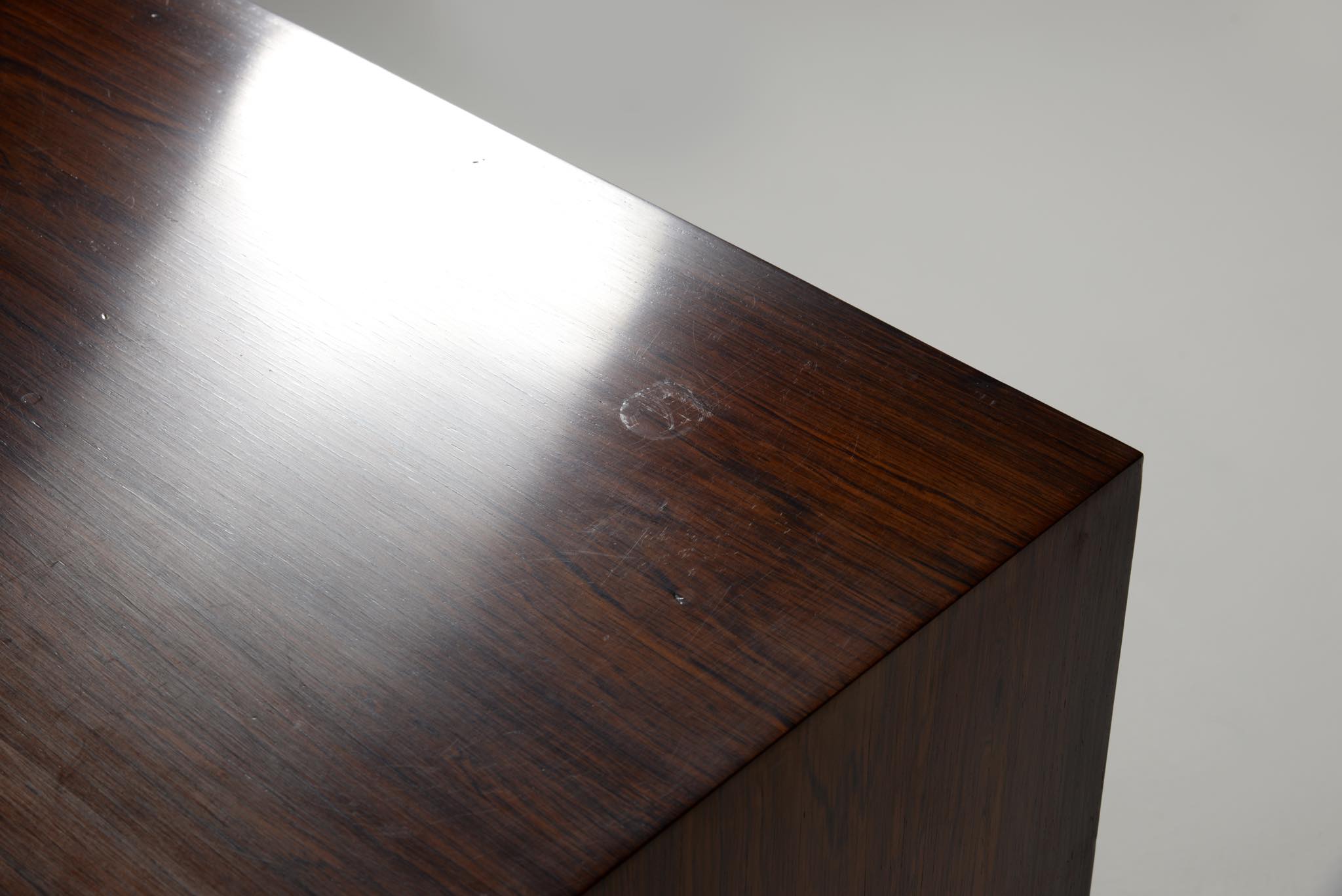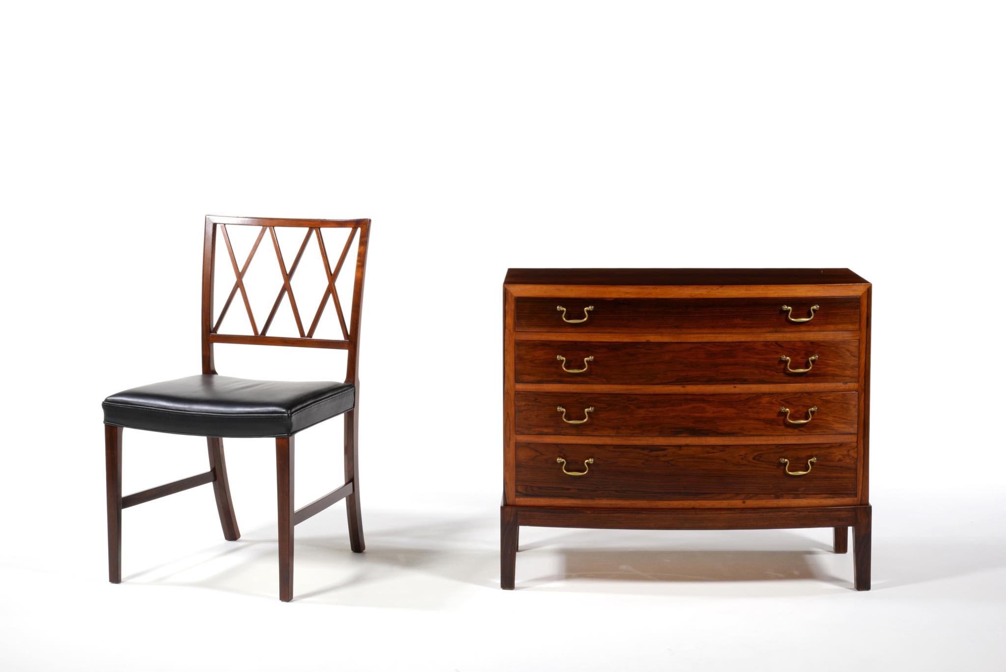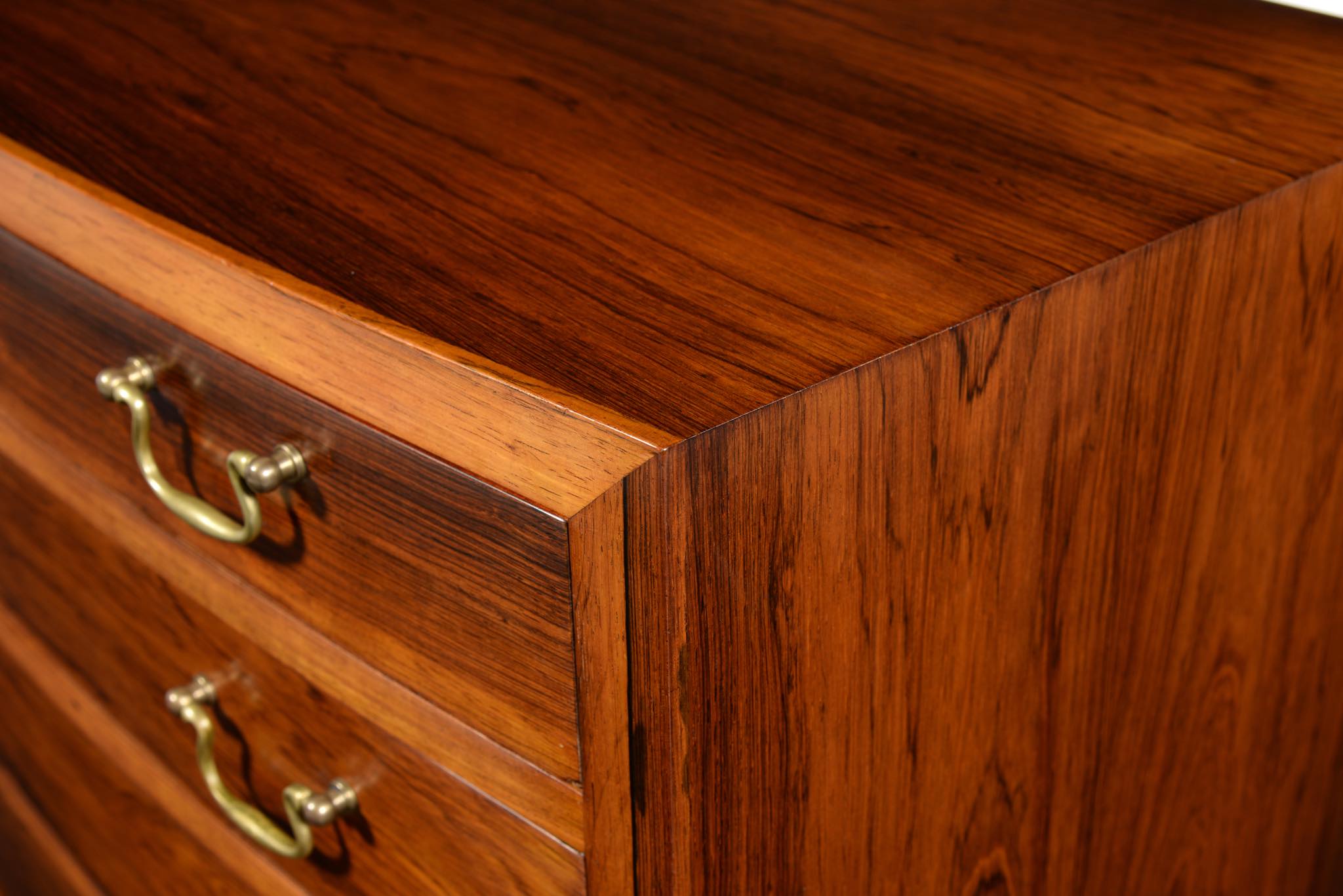 デンマークの家具工房によるボウフロントチェストです。工房やデザイナーなど詳細は判っておりませんが、丁寧な作りのもので、デンマークのオークションハウスにて、オーレ・ヴァンシャーによるものとして出品されておりました。ブラジル原産と思しき良質なローズウッド材が用いられ、真鍮の引手が備わるなど、クラシックな趣のチェストです。天板に小傷や染み、抽斗内部にも若干の染みが見られますが、全体にきれいな状態です。