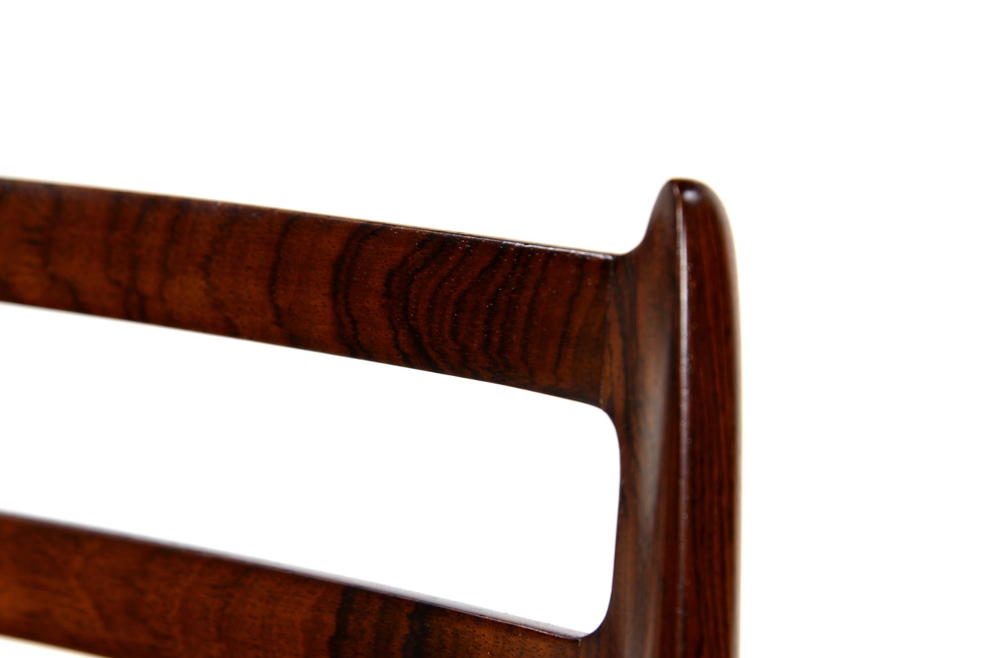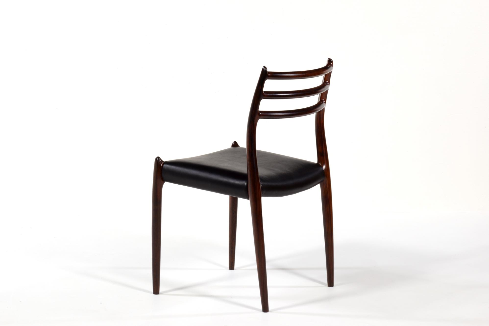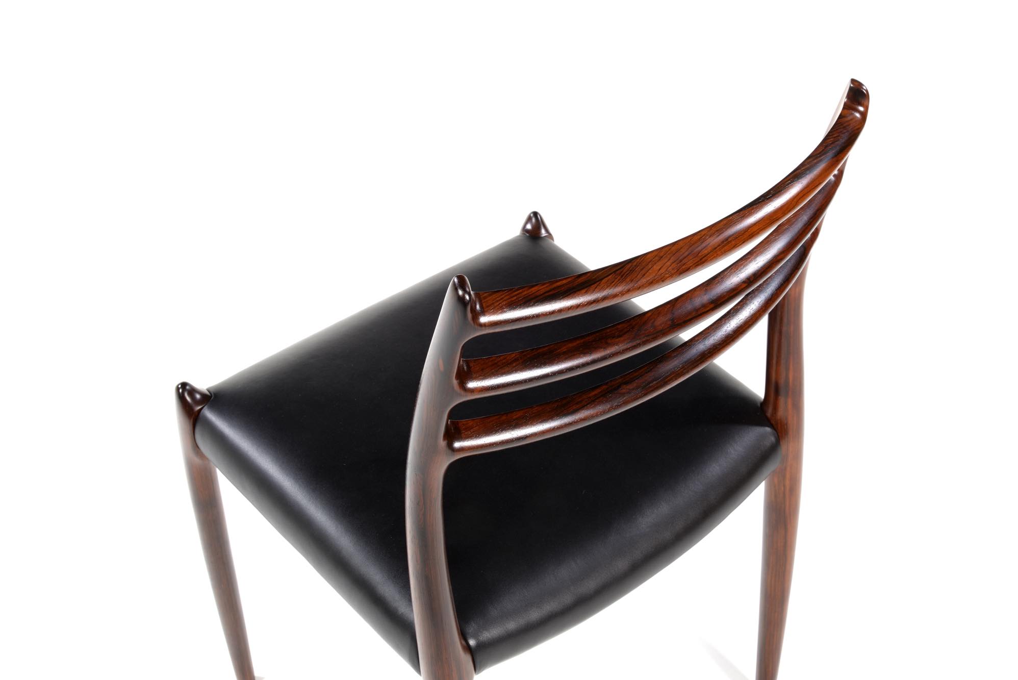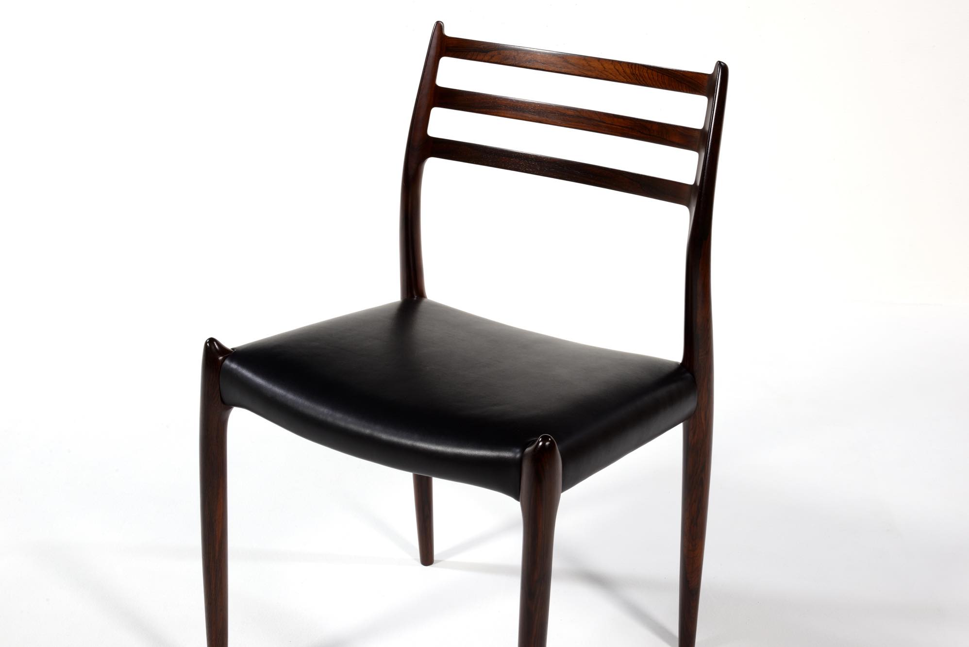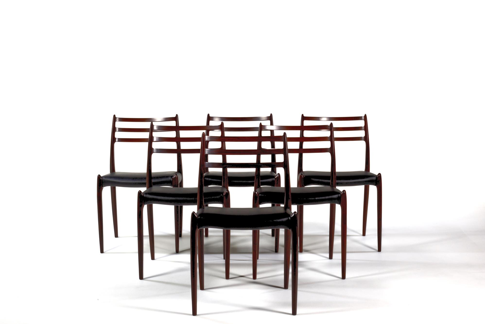 デンマークの家具工房、J.L.Møller/J.L.モラーによるダイニングチェア "Model 78" です。創業者のN.O. Moller/ニルス・オット・モラーによってデザインされたモデルで、こちらは1960年代頃に作られたヴィンテージ品です。良質なローズウッド材が用いられており、こちらはブラジル原産の材と思われます。笠木と尖ったツノに特徴のあるモデルで、ダイニングはもちろん、レストランや、日本国内では割烹店で使われている事例が多くあります。座面は黒皮革にて張り替えを行いました。こちらは6脚セットでの販売となります。