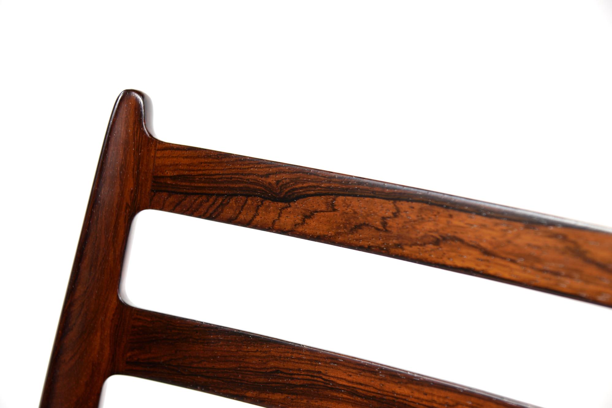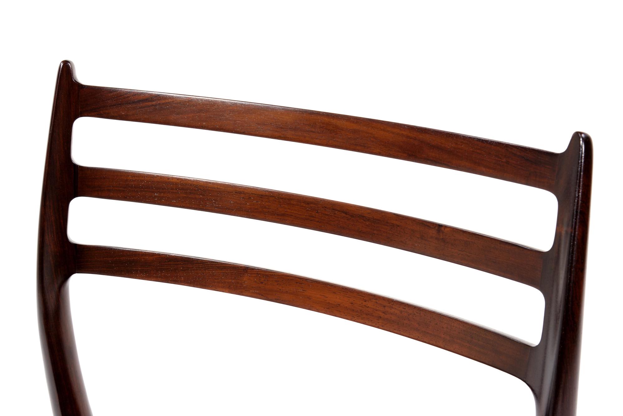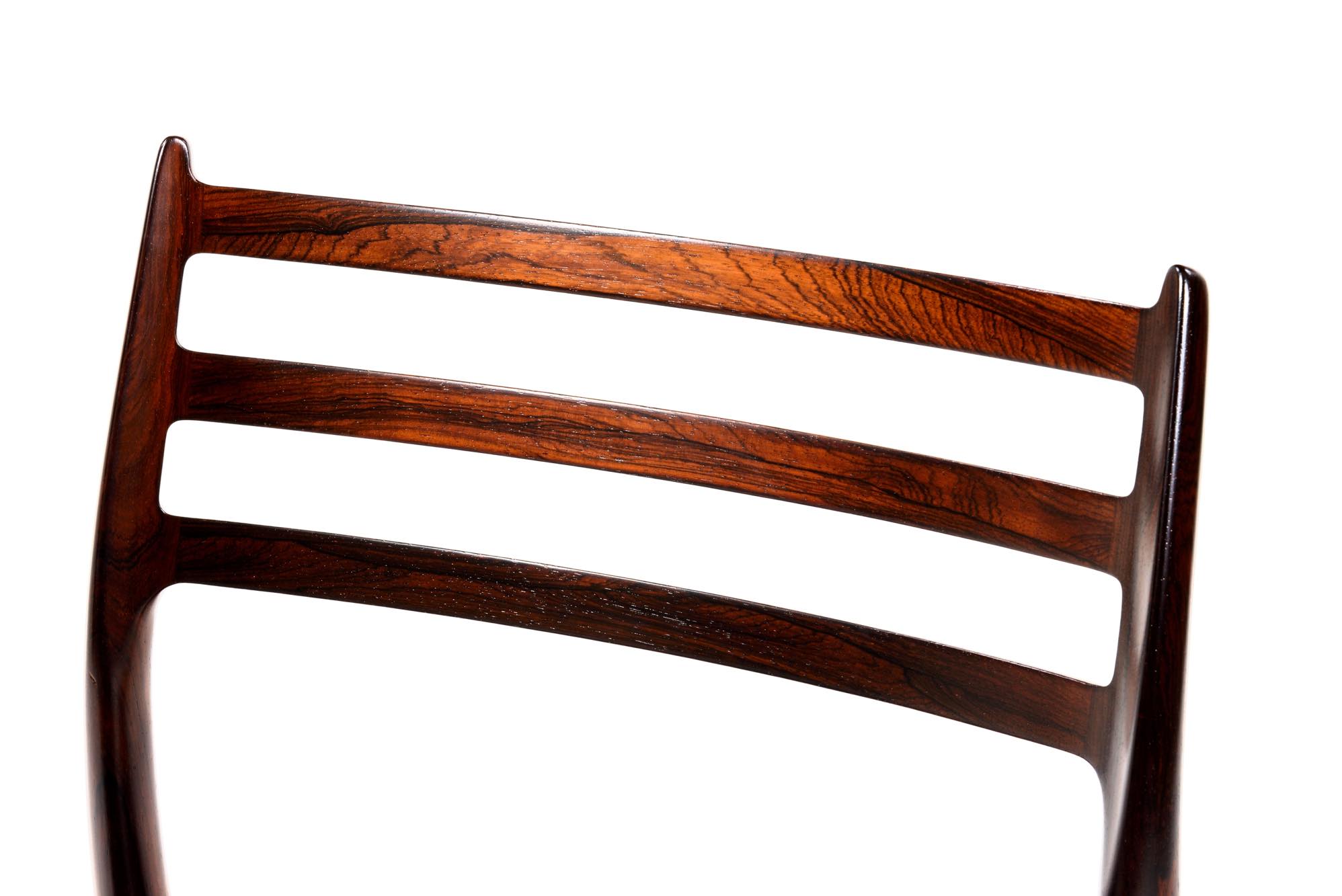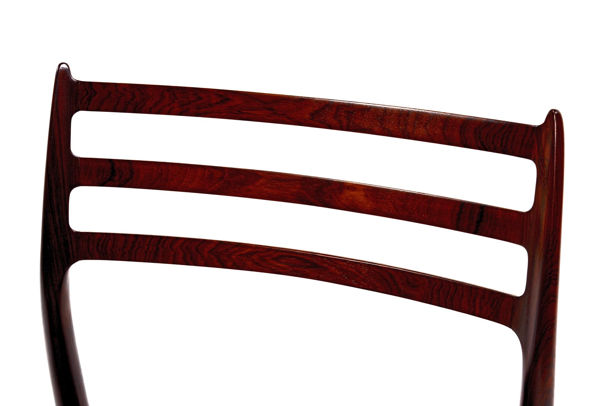 デンマークの家具工房、J.L.Møller/J.L.モラーによるダイニングチェア "Model 78" です。創業者のN.O. Moller/ニルス・オット・モラーによってデザインされたモデルで、こちらは1960年代頃に作られたヴィンテージ品です。良質なローズウッド材が用いられており、こちらはブラジル原産の材と思われます。笠木と尖ったツノに特徴のあるモデルで、ダイニングはもちろん、レストランや、日本国内では割烹店で使われている事例が多くあります。座面は黒皮革にて張り替えを行いました。こちらは6脚セットでの販売となります。