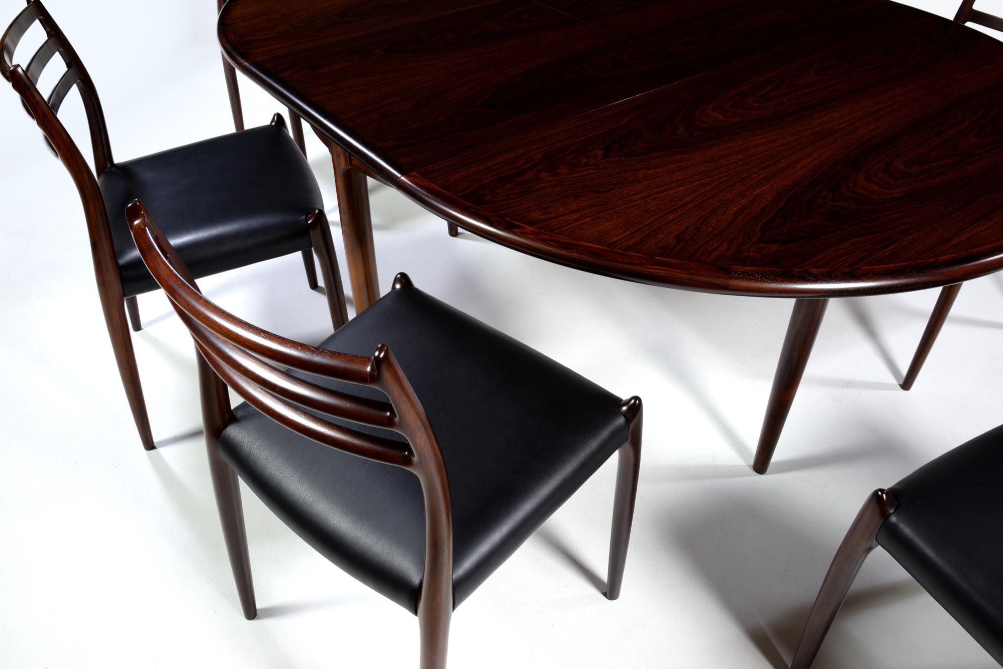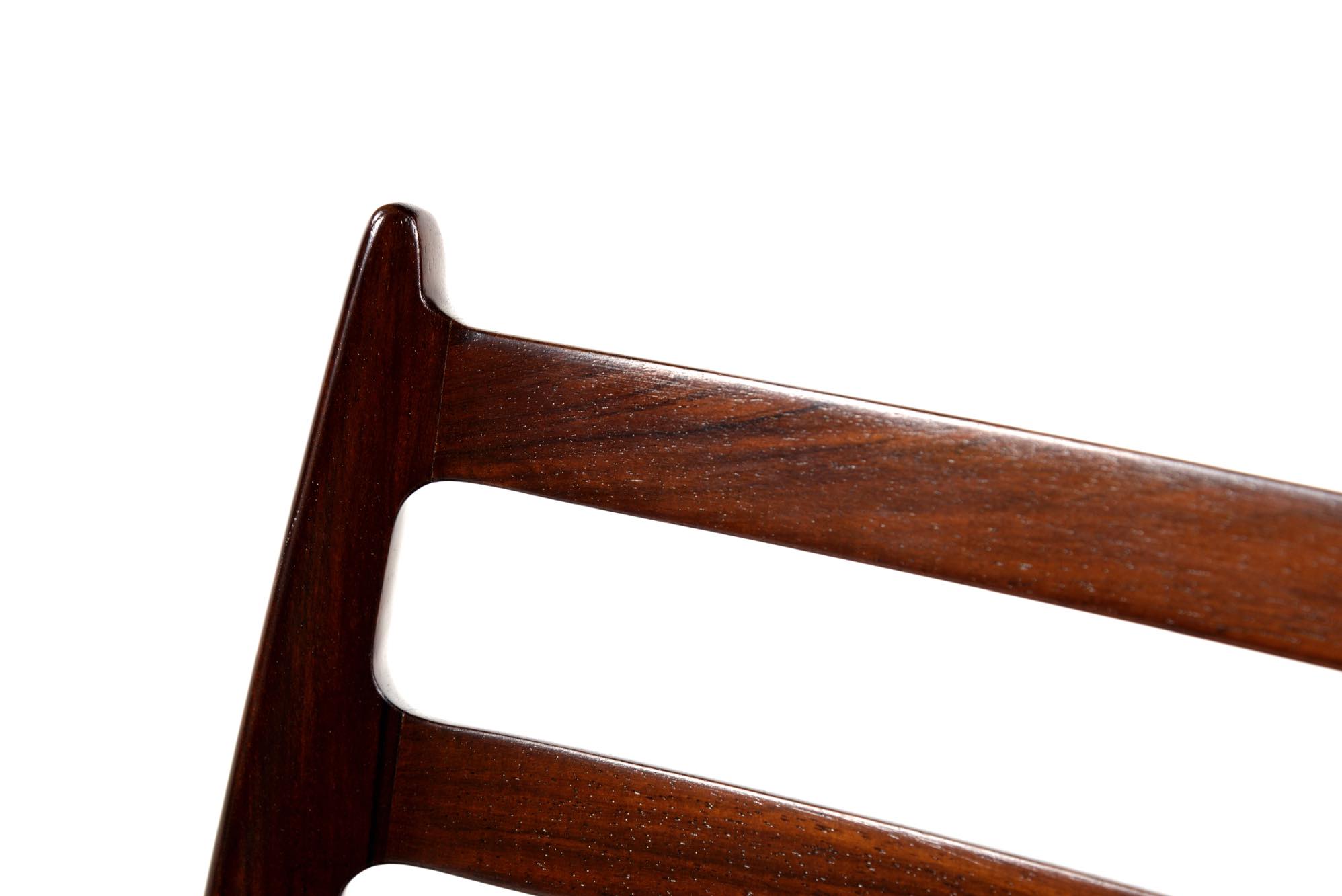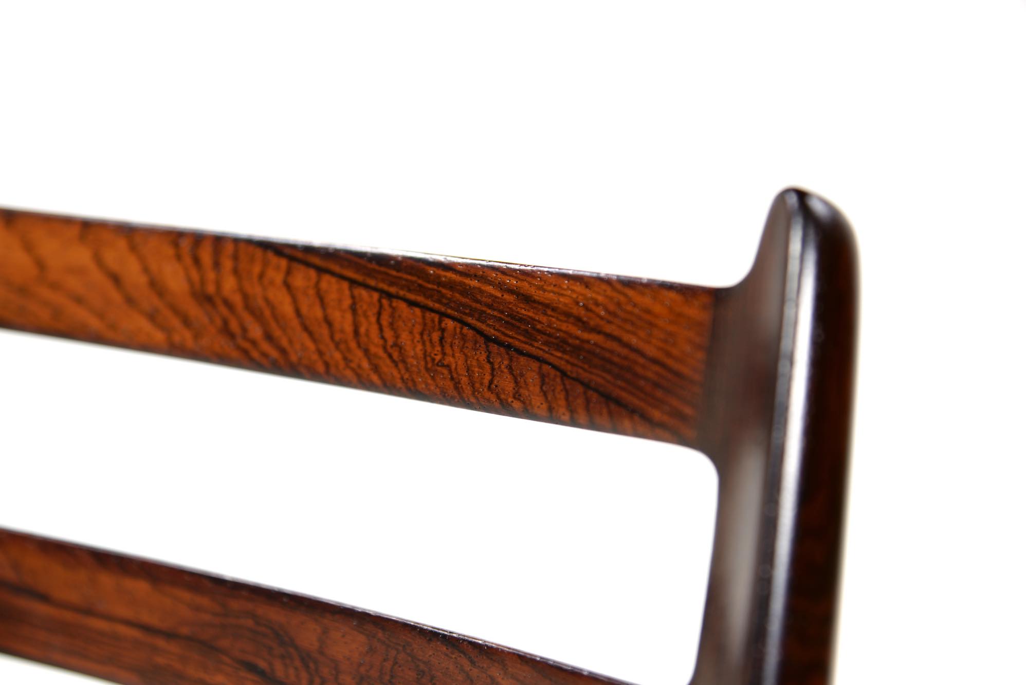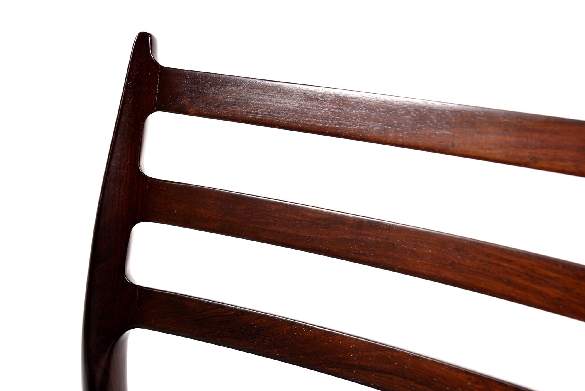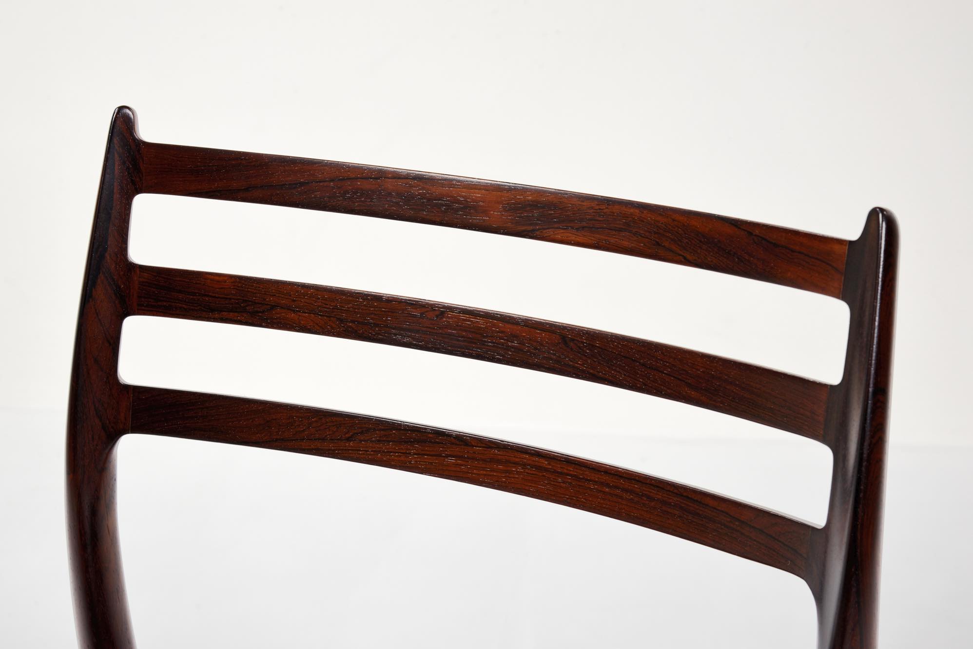 デンマークの家具工房、J.L.Møller/J.L.モラーによるダイニングチェア "Model 78" です。創業者のN.O. Moller/ニルス・オット・モラーによってデザインされたモデルで、こちらは1960年代頃に作られたヴィンテージ品です。良質なローズウッド材が用いられており、こちらはブラジル原産の材と思われます。笠木と尖ったツノに特徴のあるモデルで、ダイニングはもちろん、レストランや、日本国内では割烹店で使われている事例が多くあります。座面は黒皮革にて張り替えを行いました。こちらは6脚セットでの販売となります。