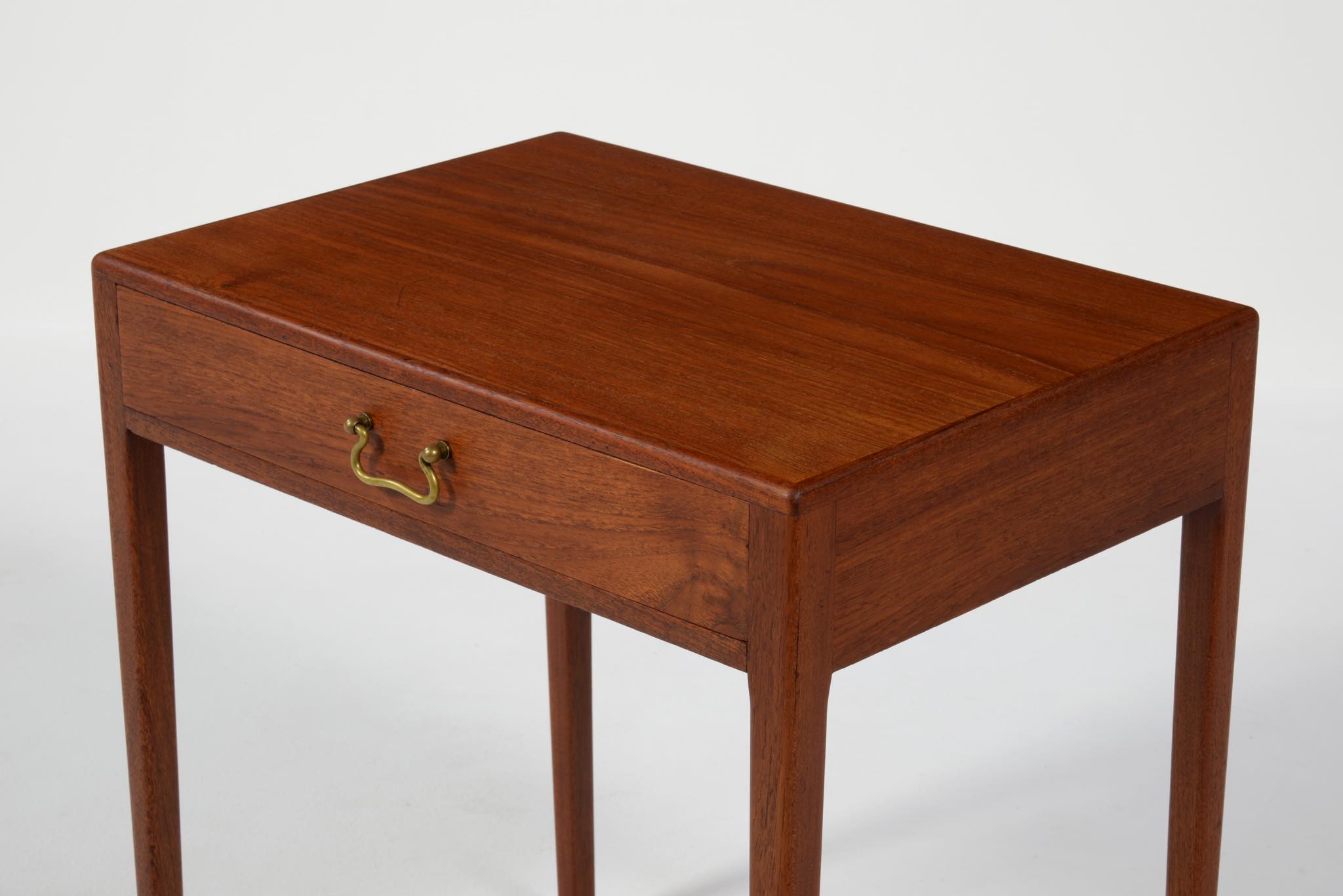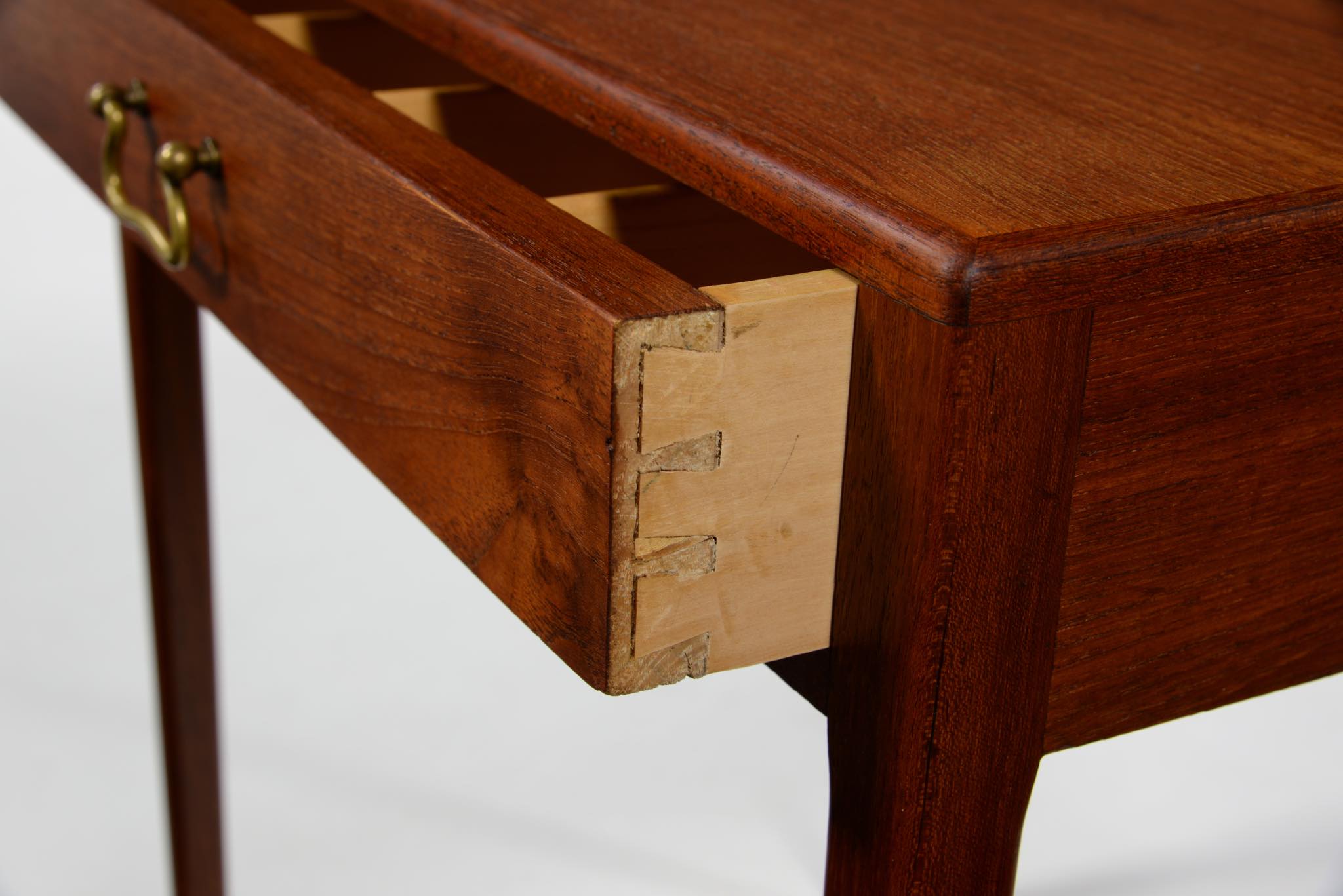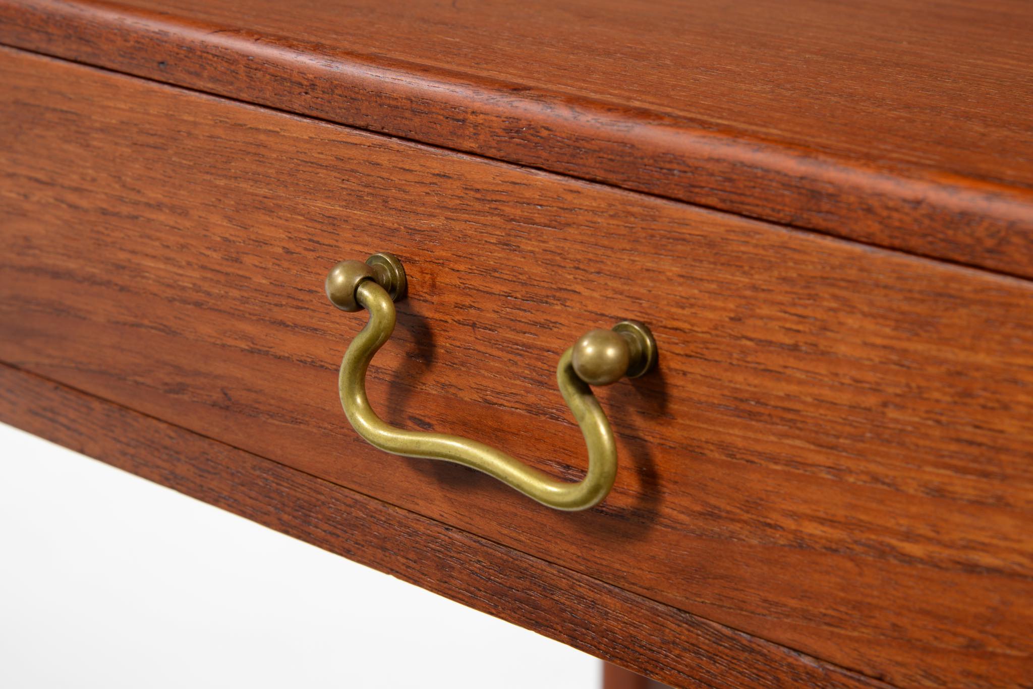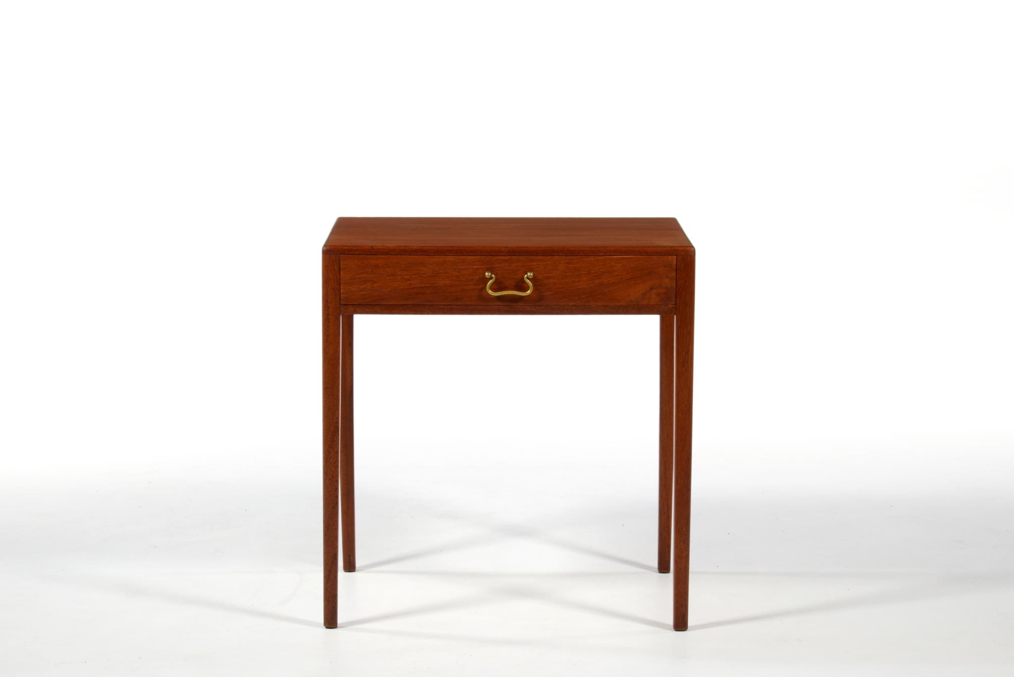 デンマーク製、1950年代に作られたサイドテーブルです。真鍮の引手のついた一杯の抽斗が備わります。デザイナーや工房等詳しいことは分かりませんが、丁寧に作られた作品です。天板に僅かな輪染みと小傷が見られます。また、左後脚に僅かな反りが見られますが、全体的なコンディションは良好です。
