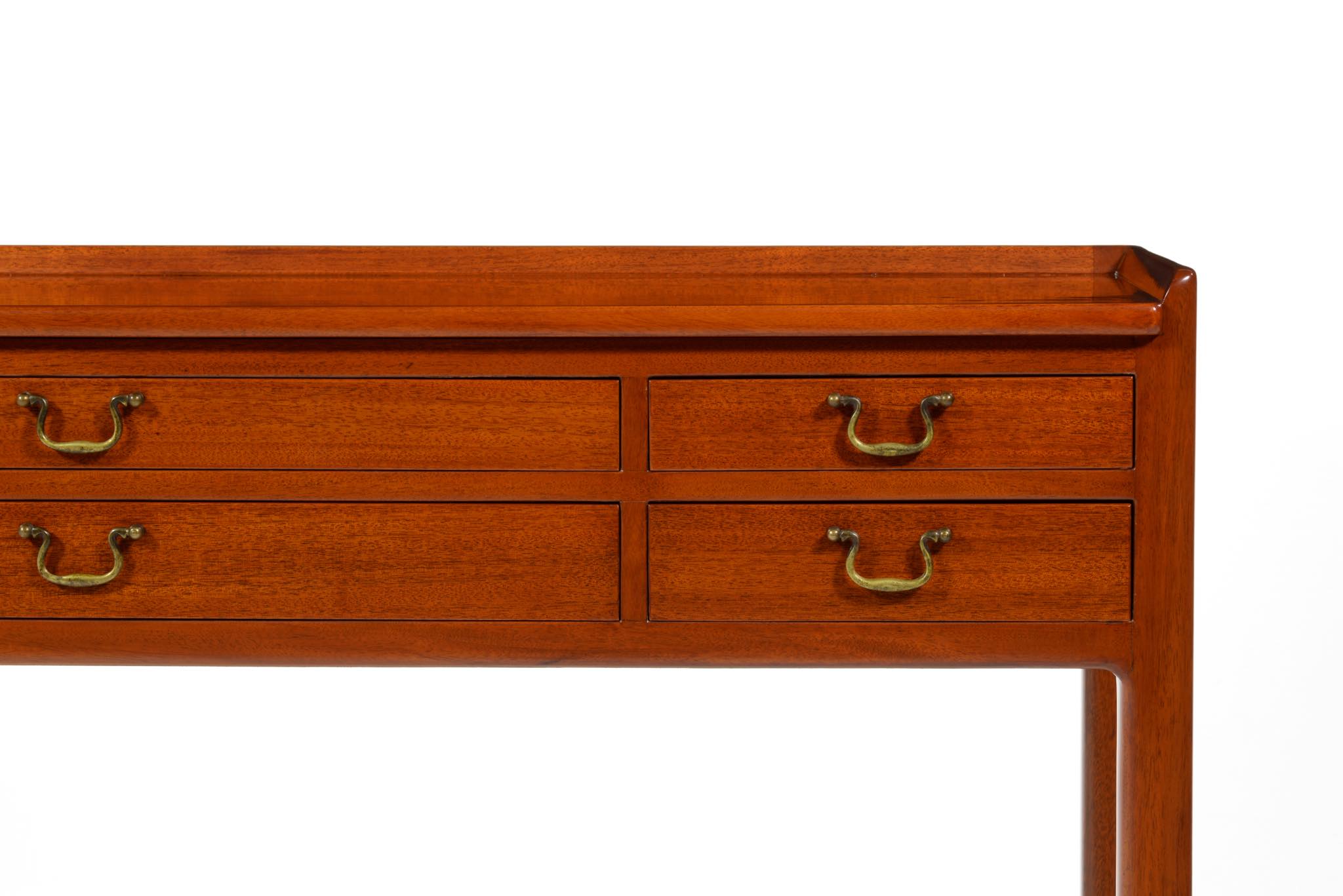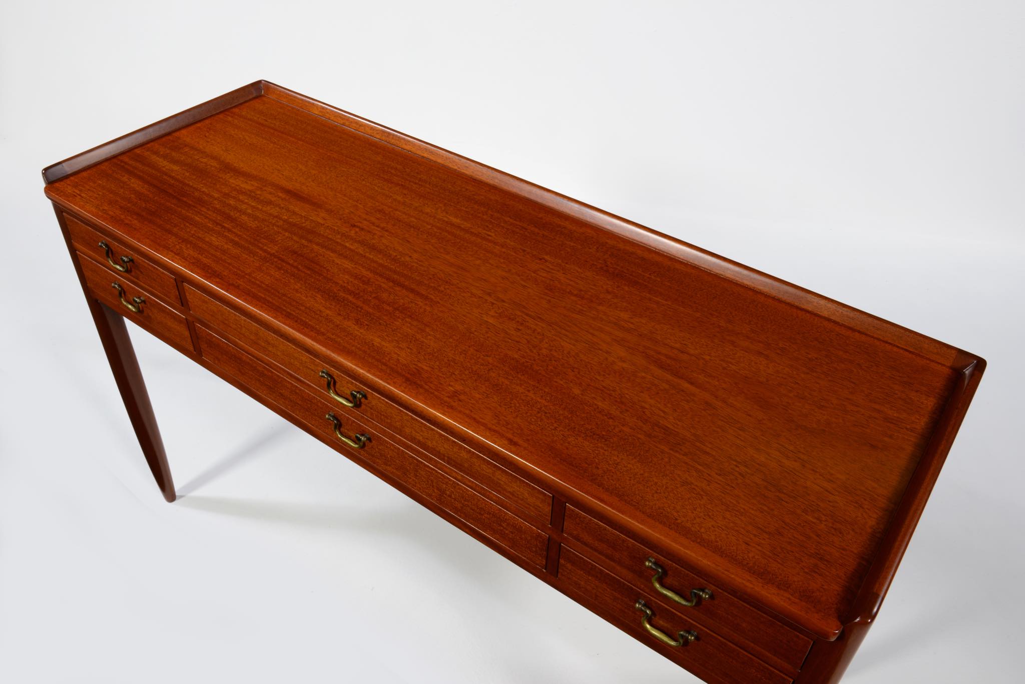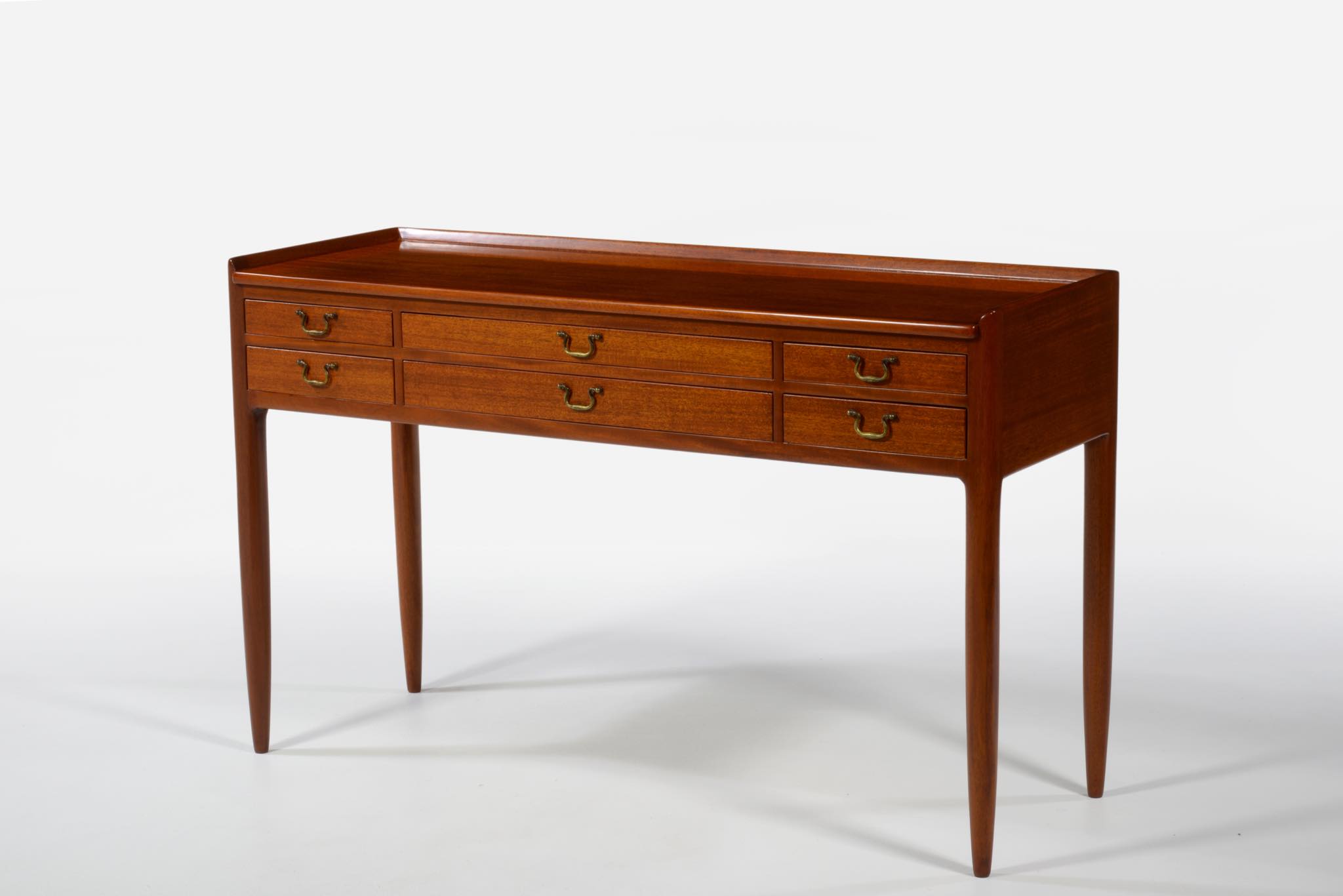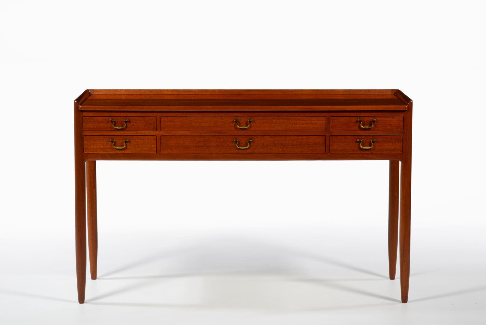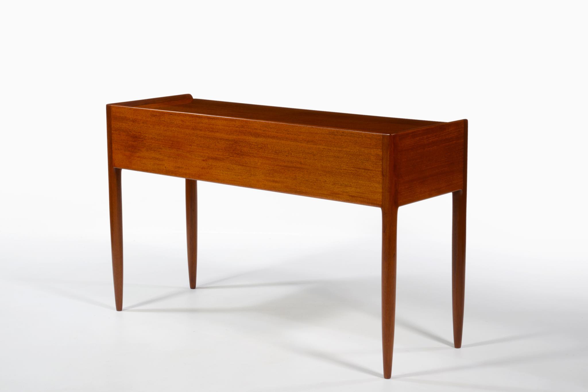 デンマークの家具工房にて作られたコンソールテーブルです。玄関ホールや通路脇などに備えるテーブルです。作行きから見て1940年代頃に作られたもののようで、工房等は不明ですが丁寧な仕事のものです。本体はマホガニー材、ハンドルは真鍮で、ハンドルに現れた経年のくすみはそのままにしております。背面も化粧されているので間仕切りとしてもお使いいただけます。表面の塗膜は劣化が見られたため一旦剥離し再塗装しました。艶感など違和感なくきれいに整える事ができました。