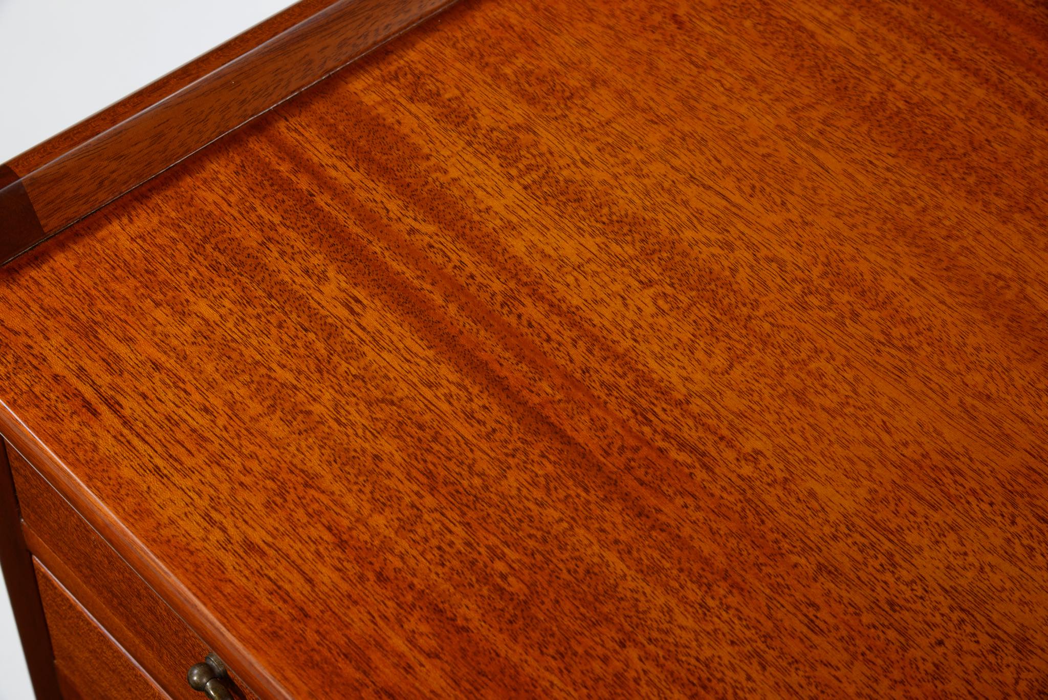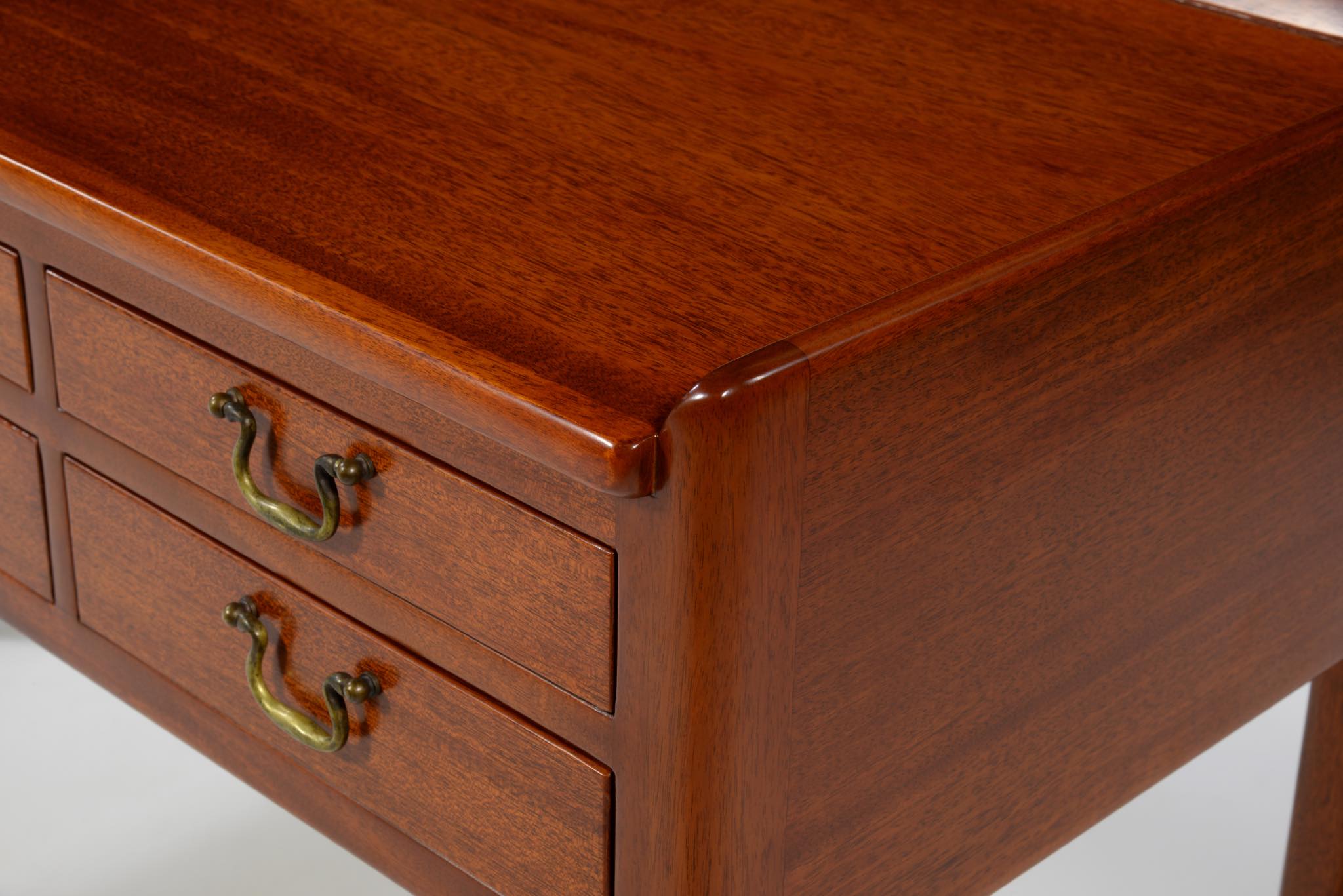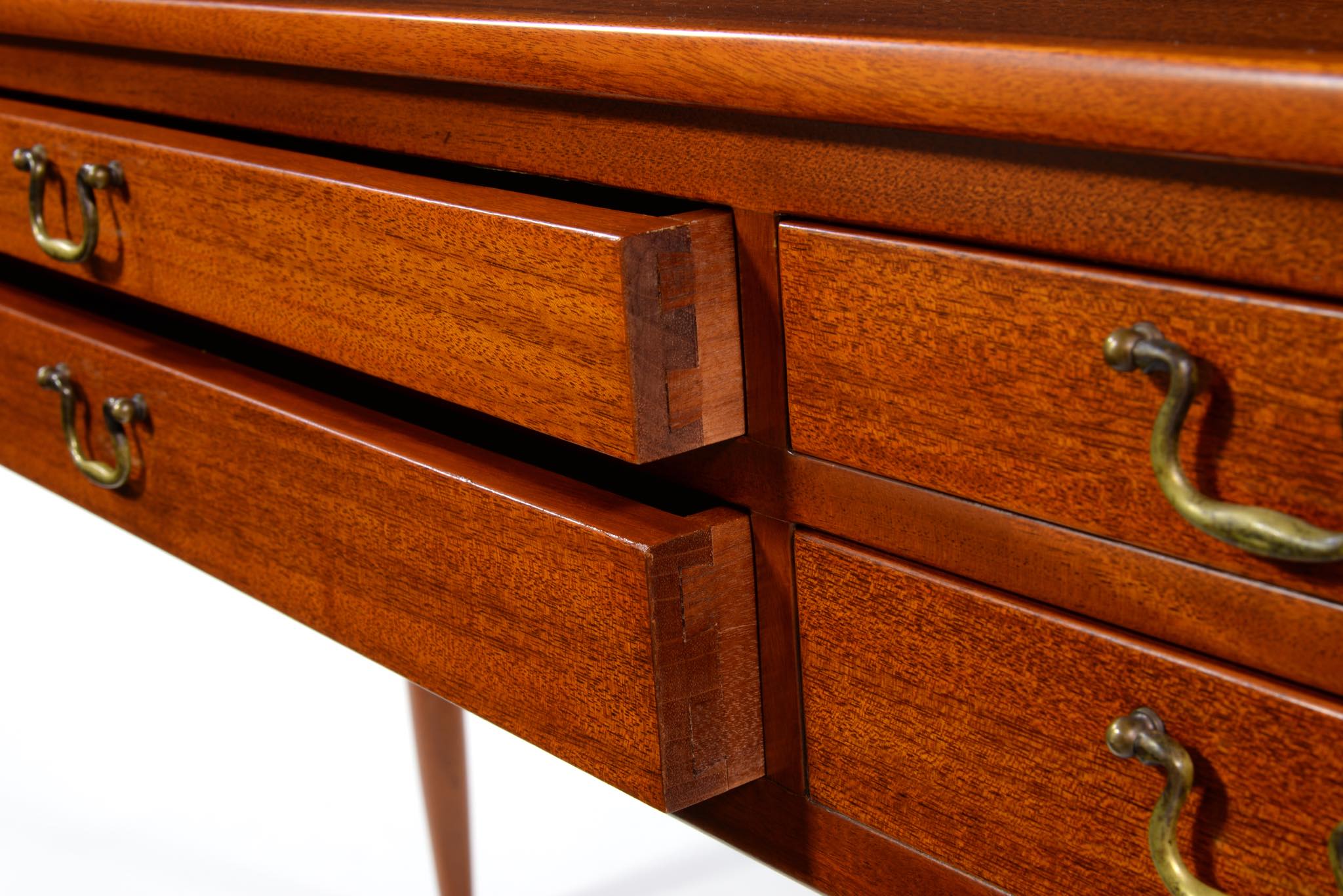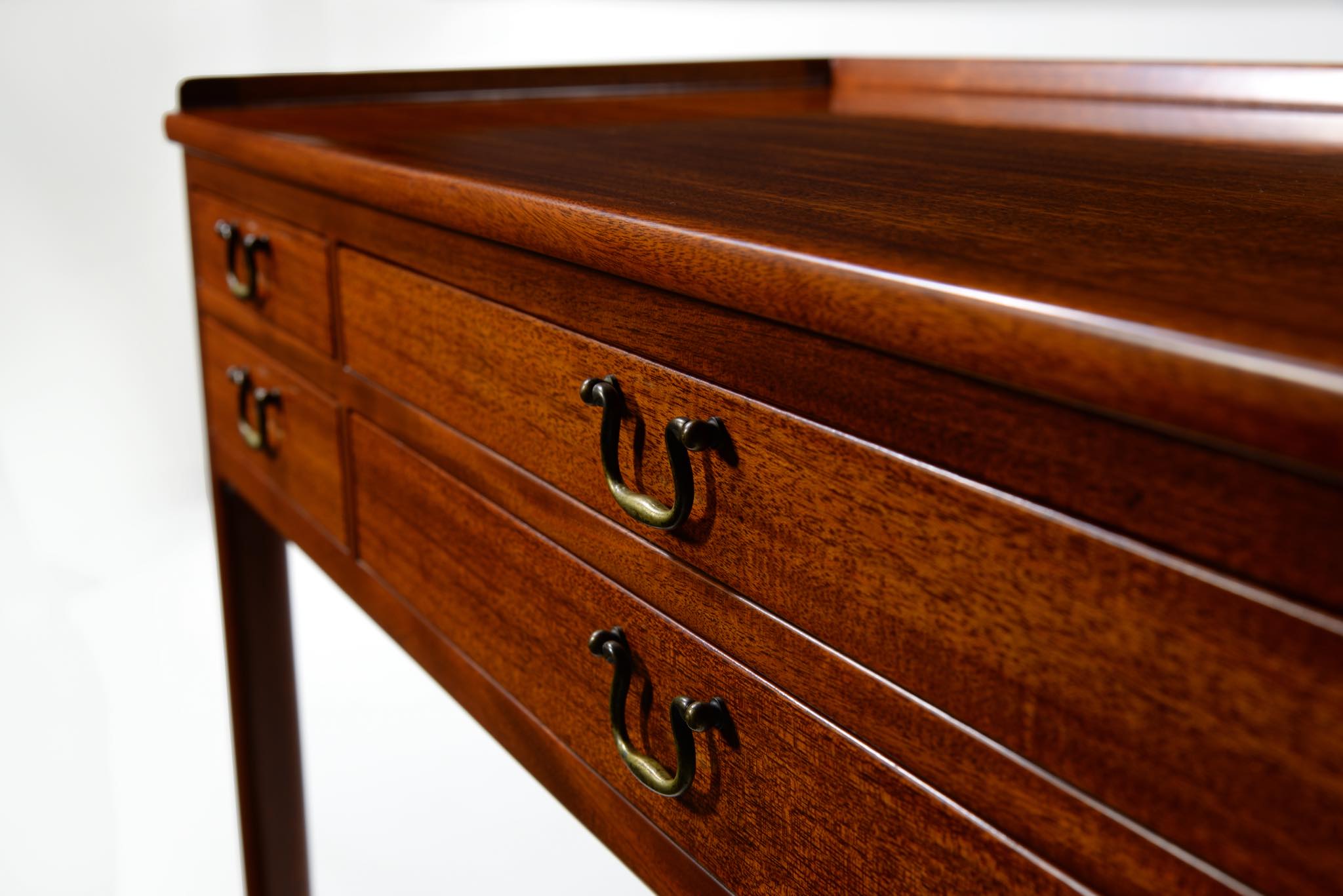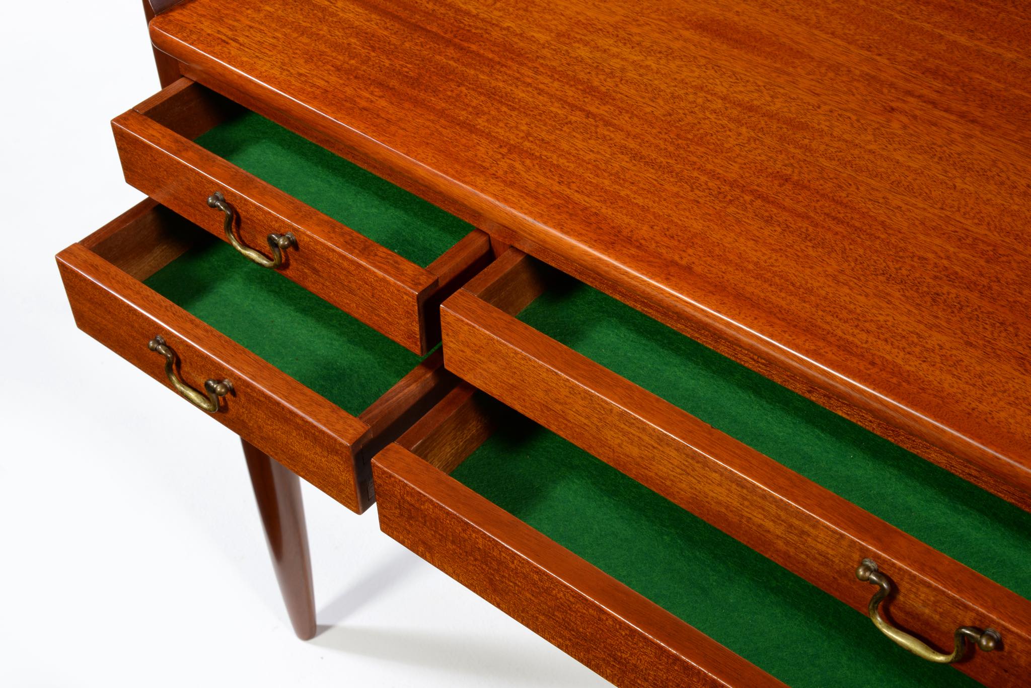 デンマークの家具工房にて作られたコンソールテーブルです。玄関ホールや通路脇などに備えるテーブルです。作行きから見て1940年代頃に作られたもののようで、工房等は不明ですが丁寧な仕事のものです。本体はマホガニー材、ハンドルは真鍮で、ハンドルに現れた経年のくすみはそのままにしております。背面も化粧されているので間仕切りとしてもお使いいただけます。表面の塗膜は劣化が見られたため一旦剥離し再塗装しました。艶感など違和感なくきれいに整える事ができました。
