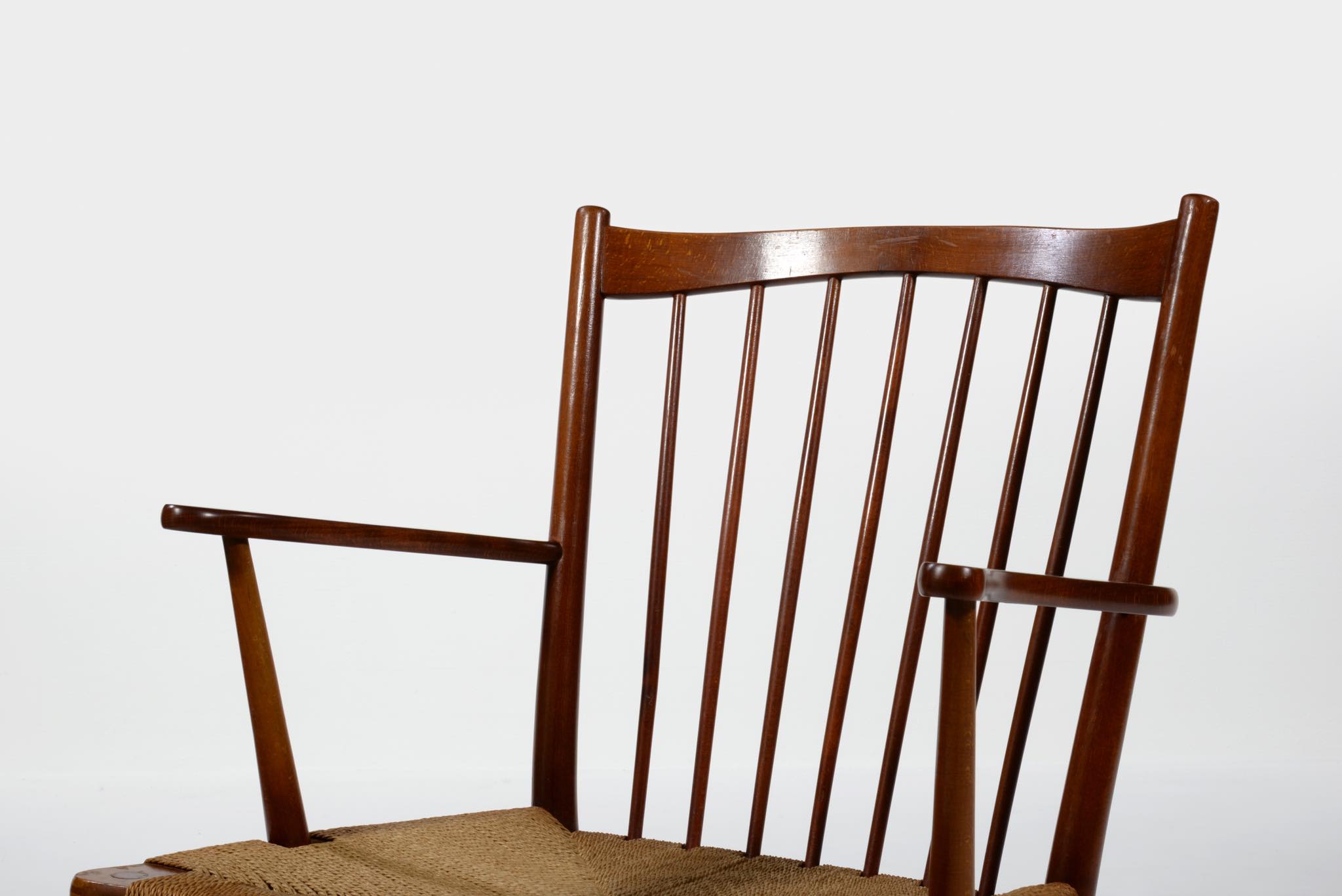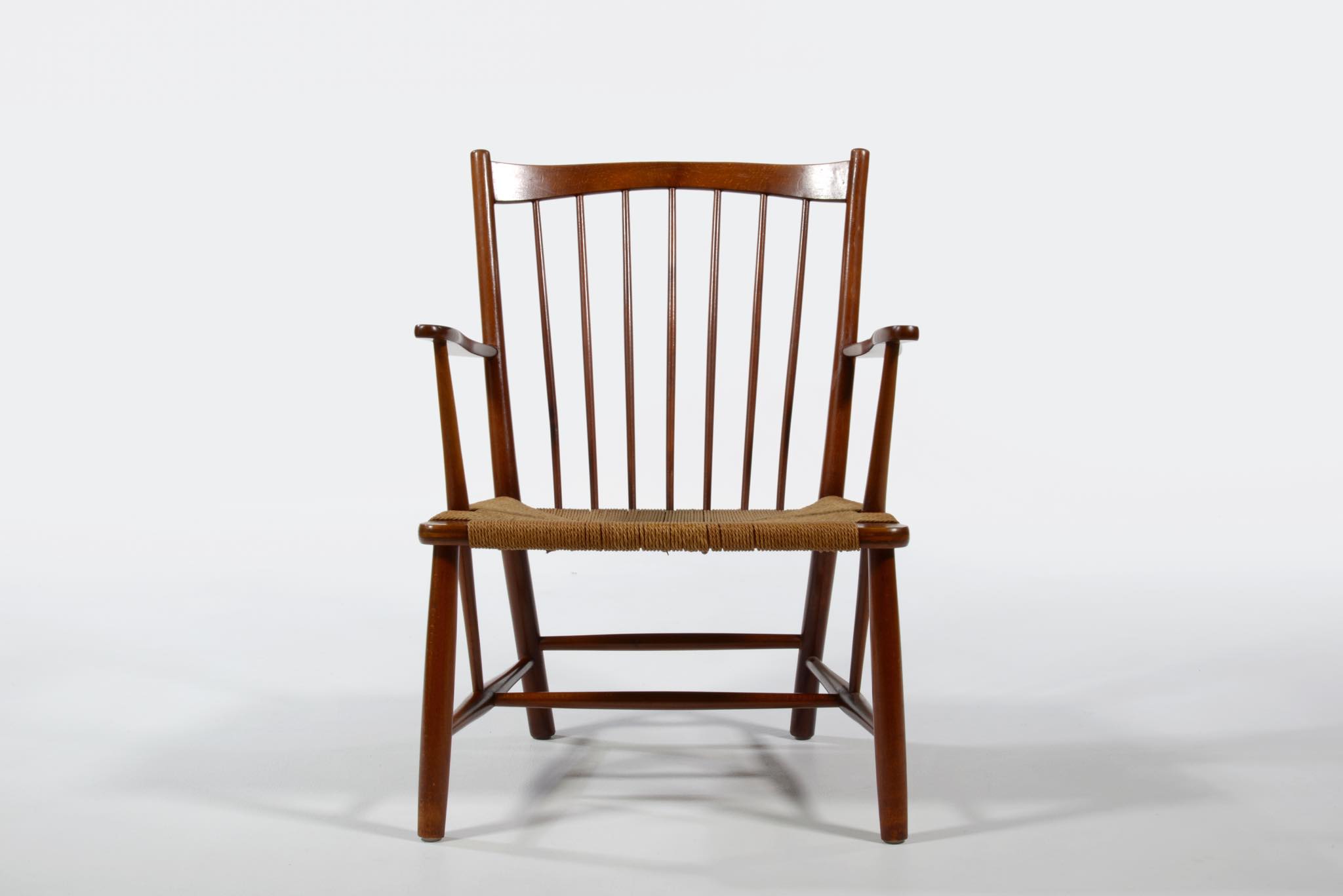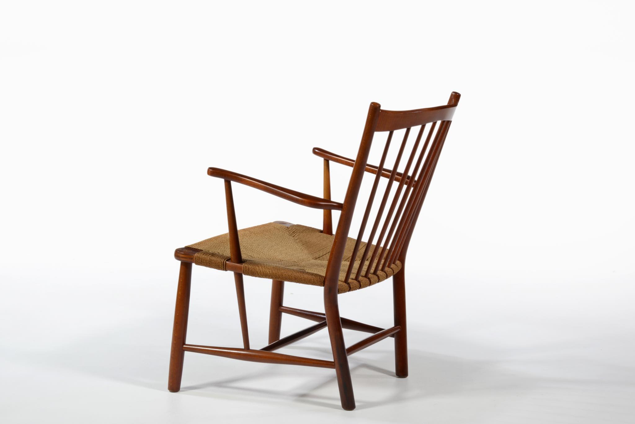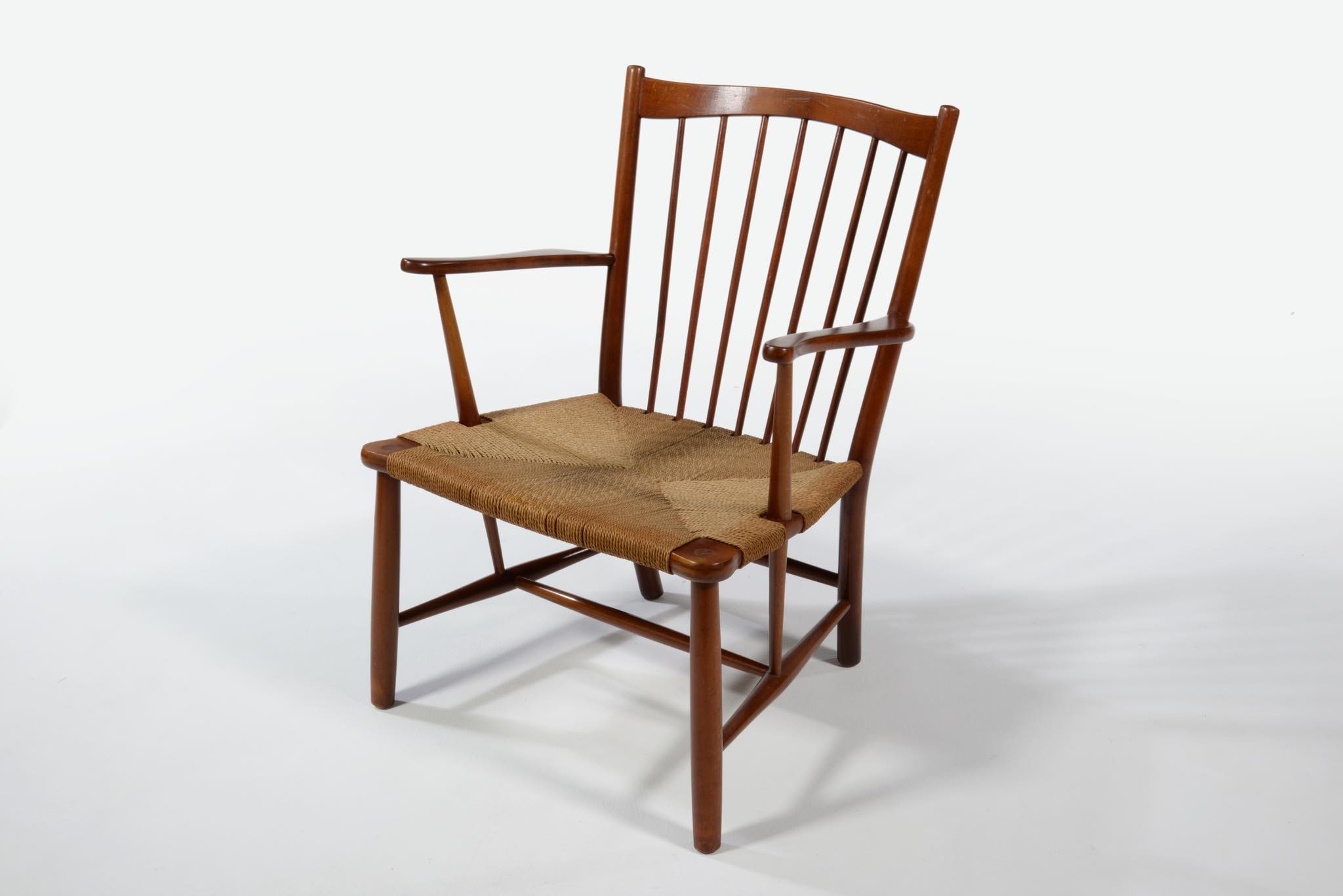 Hans J. Wegner/ハンス・ウェグナーによるイージーチェアです。コペンハーゲンの王様広場に位置する百貨店、マガジン(Magasin du Nord)の為に1947年にデザインされたものです。シェーカー様式のデザインが特徴的で、同じくウェグナー作の "J16" ロッキングチェアの流れを汲むものでしょう。一般には小売されなかったのか現存数が極めて少ないようです。シートのペーパーコードは古く、当時に張られたものかもしれませんが、傷みなどはなく古格すら感じさせる雰囲気です。