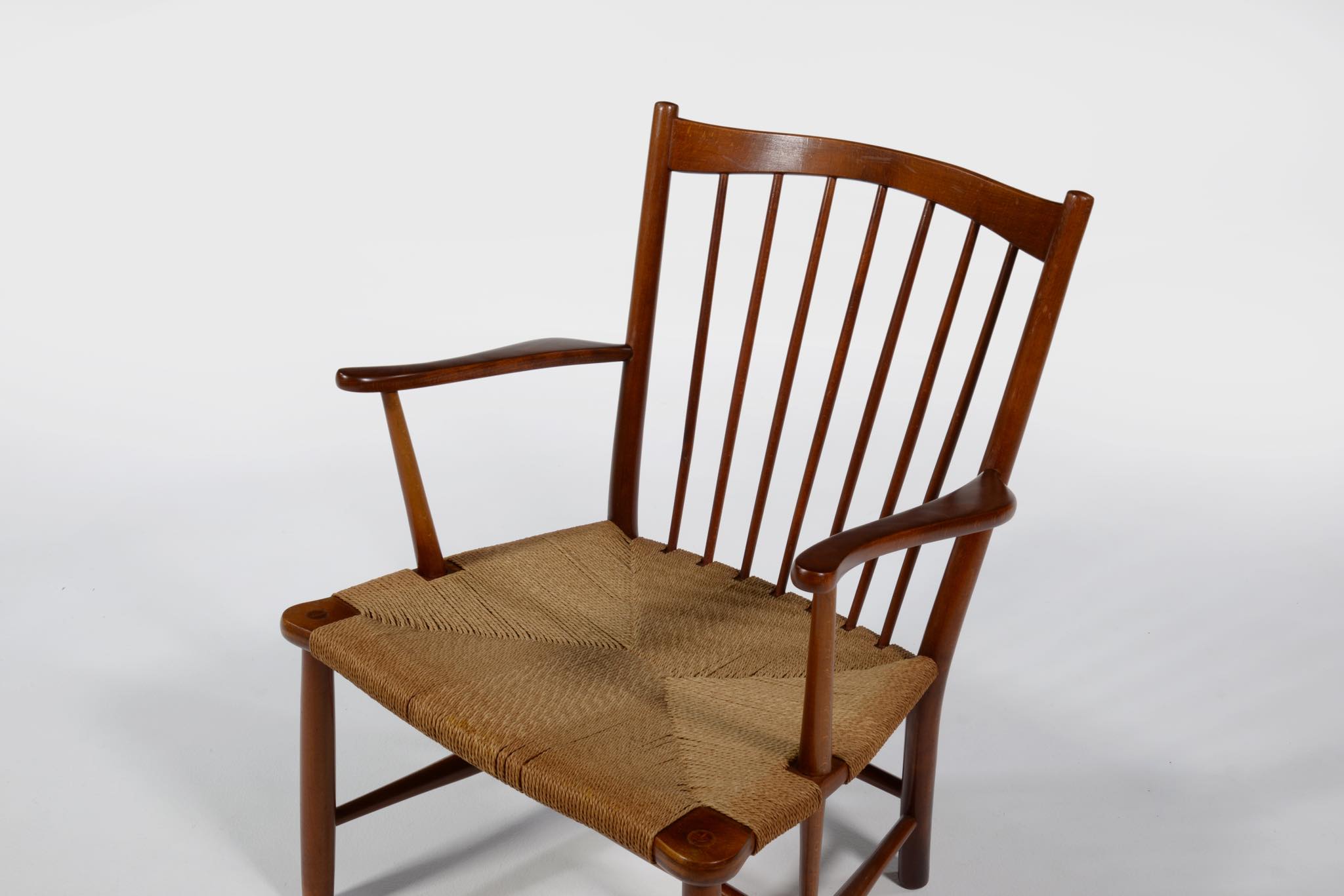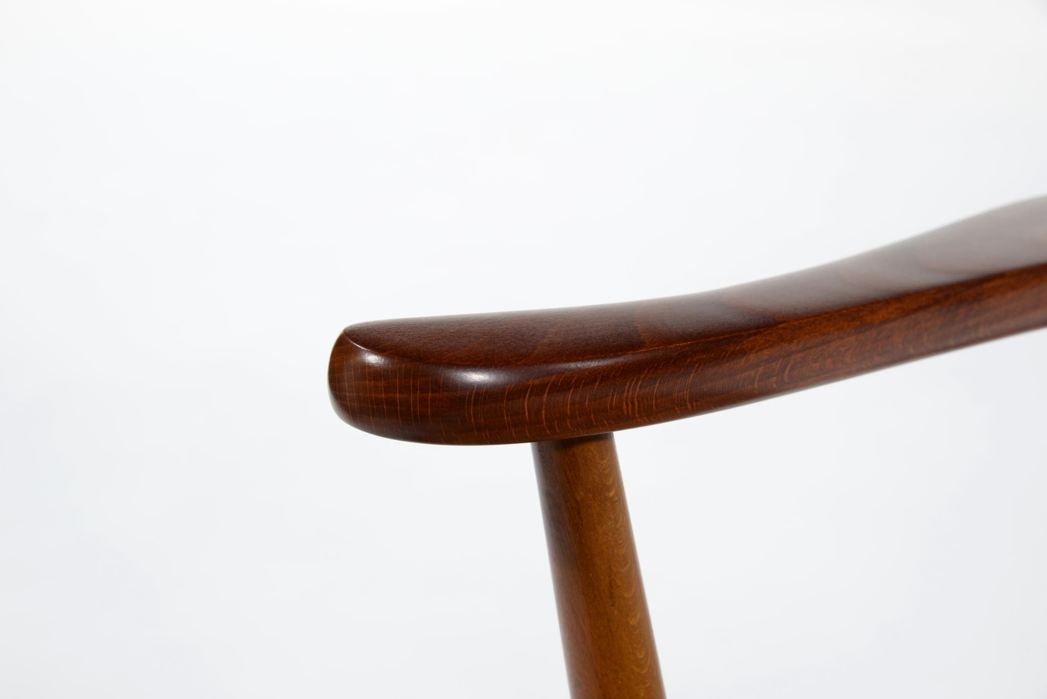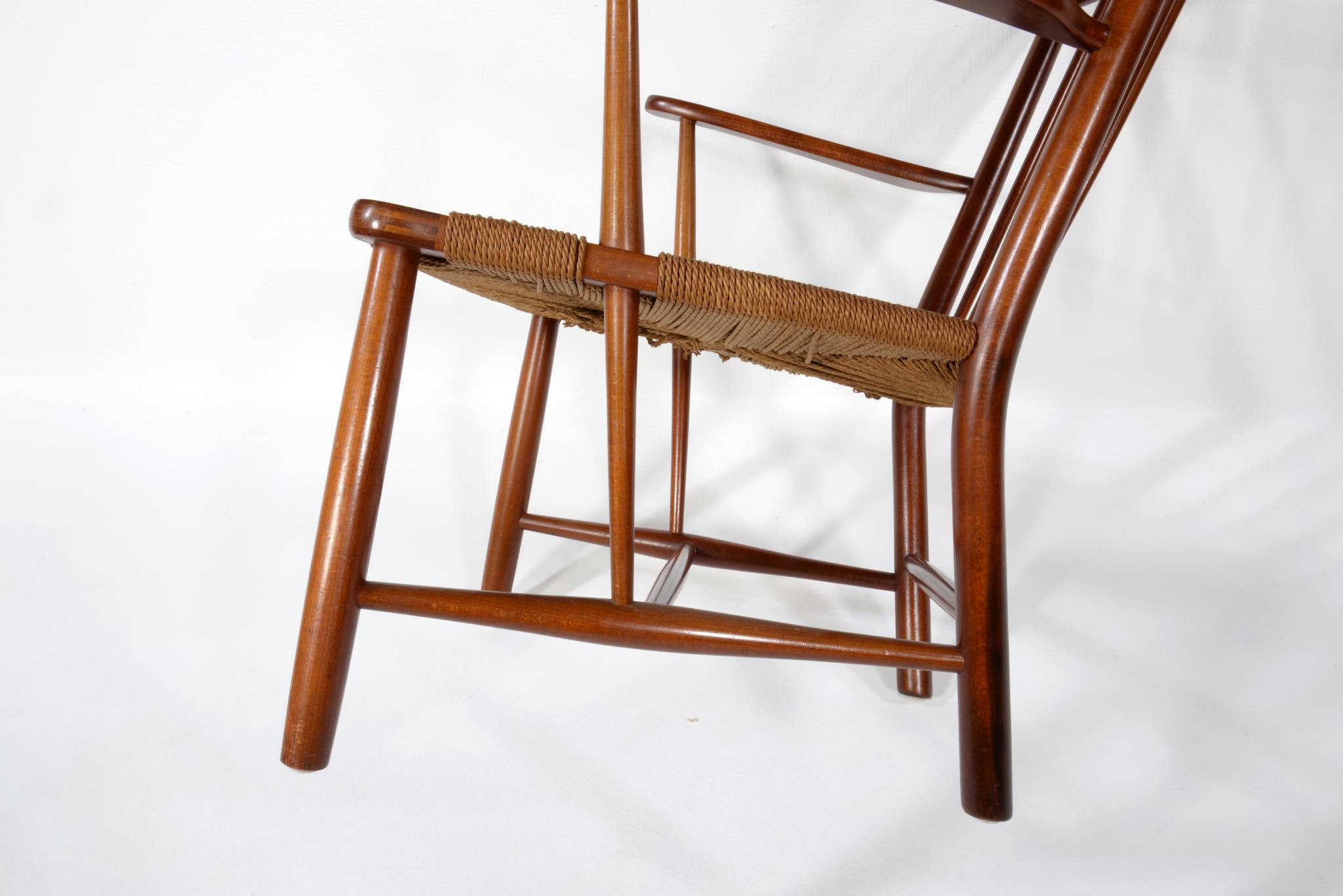 Hans J. Wegner/ハンス・ウェグナーによるイージーチェアです。コペンハーゲンの王様広場に位置する百貨店、マガジン(Magasin du Nord)の為に1947年にデザインされたものです。シェーカー様式のデザインが特徴的で、同じくウェグナー作の "J16" ロッキングチェアの流れを汲むものでしょう。一般には小売されなかったのか現存数が極めて少ないようです。シートのペーパーコードは古く、当時に張られたものかもしれませんが、傷みなどはなく古格すら感じさせる雰囲気です。