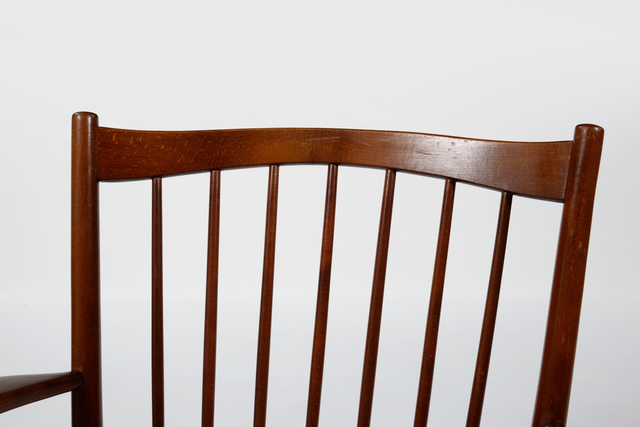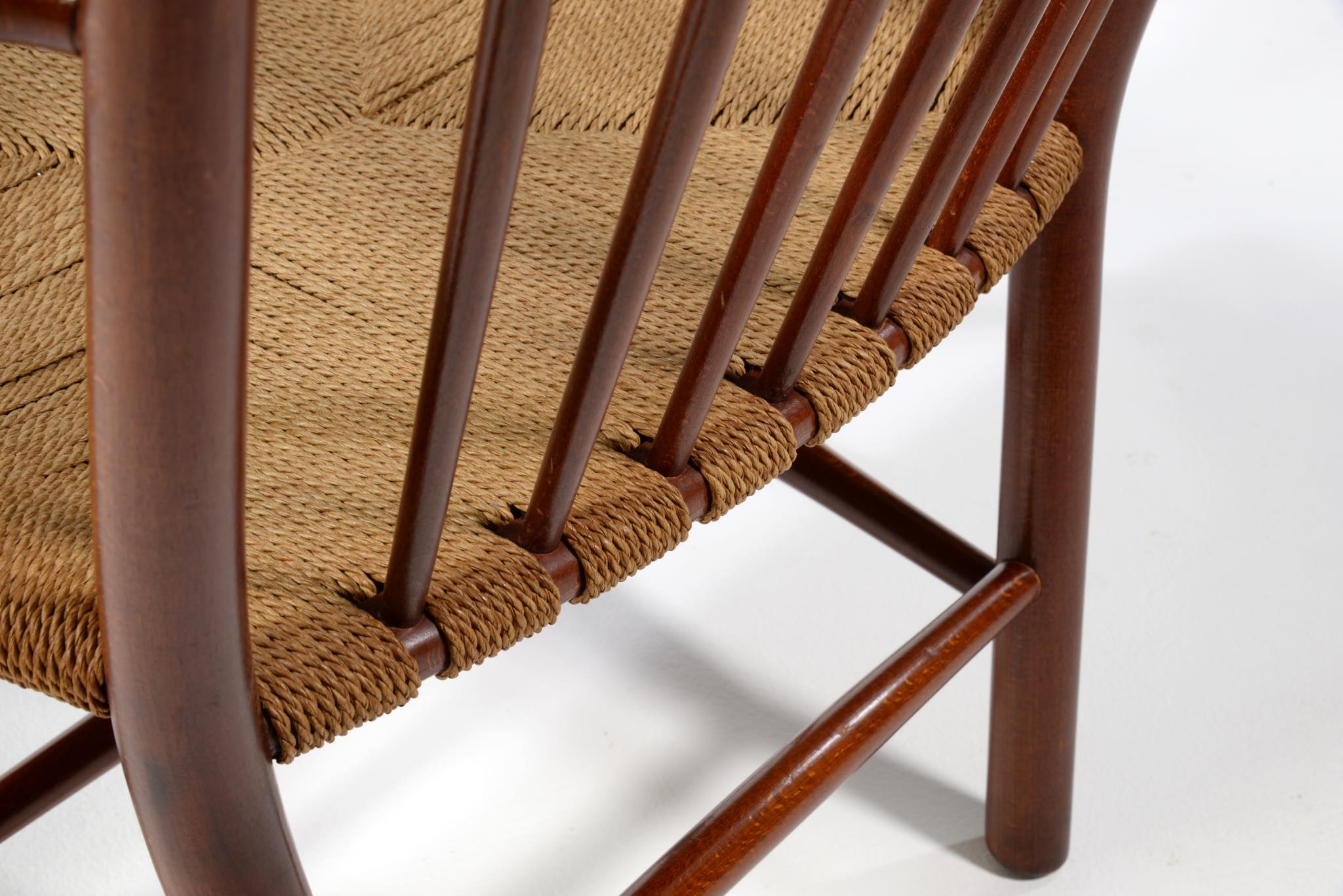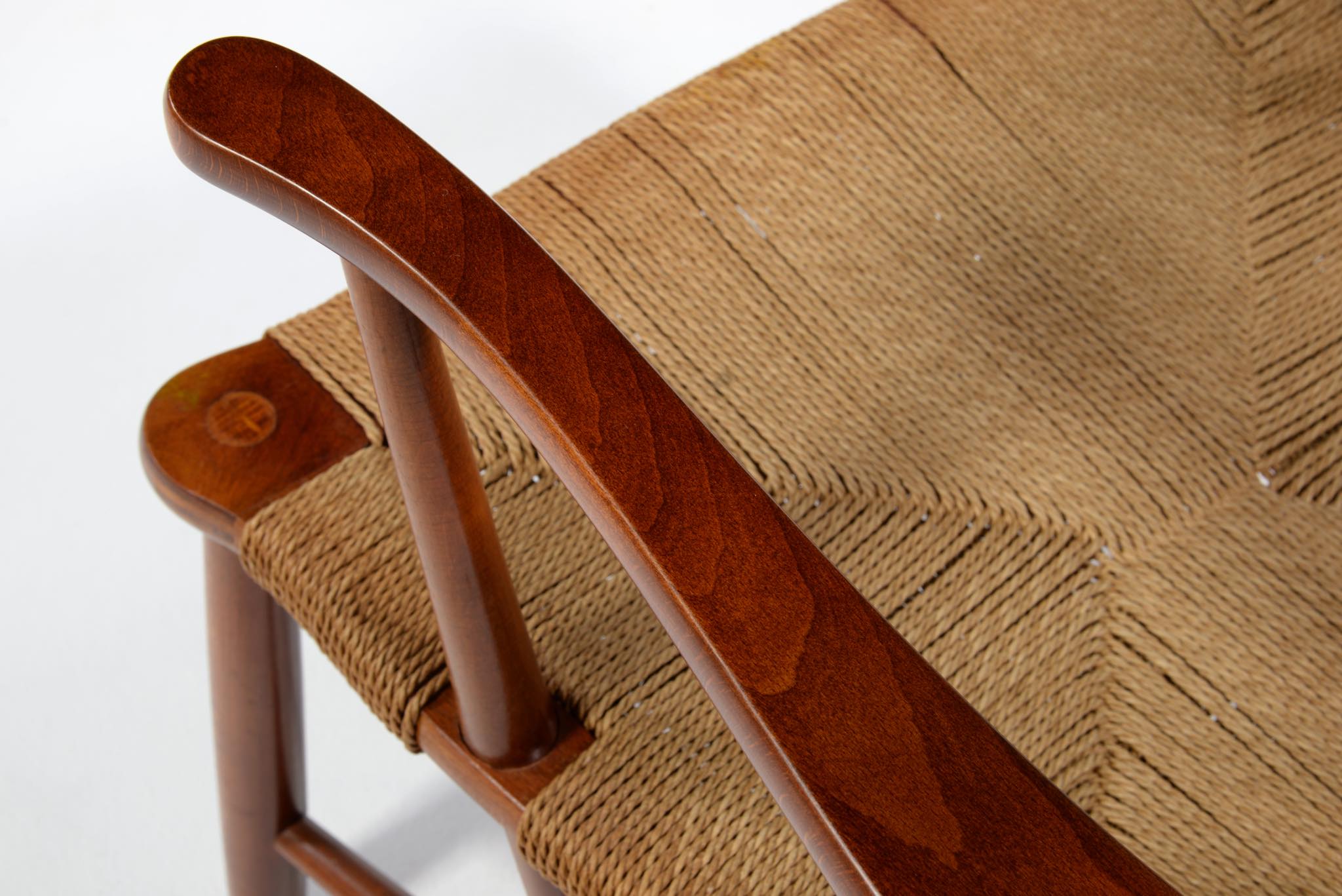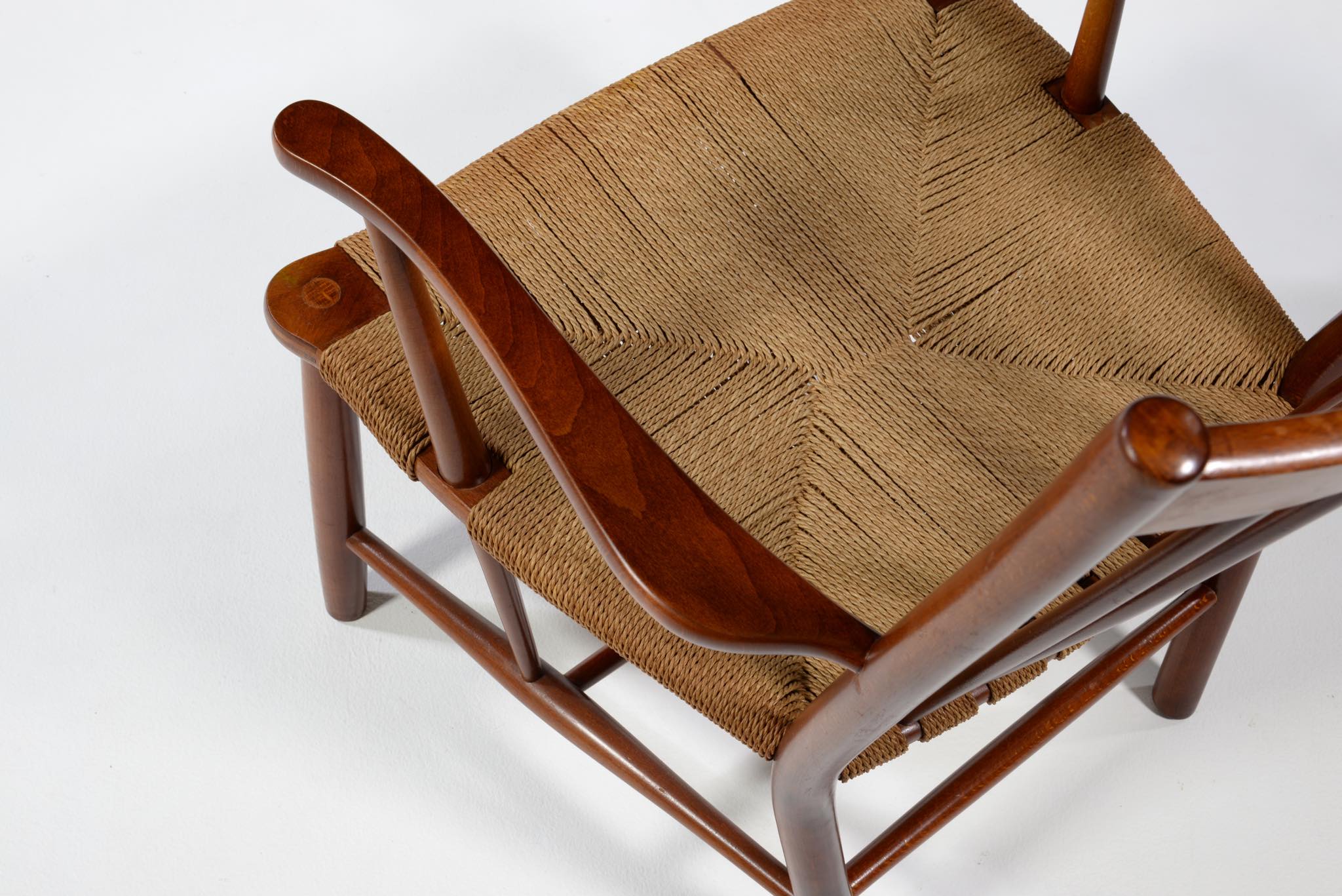 Hans J. Wegner/ハンス・ウェグナーによるイージーチェアです。コペンハーゲンの王様広場に位置する百貨店、マガジン(Magasin du Nord)の為に1947年にデザインされたものです。シェーカー様式のデザインが特徴的で、同じくウェグナー作の "J16" ロッキングチェアの流れを汲むものでしょう。一般には小売されなかったのか現存数が極めて少ないようです。シートのペーパーコードは古く、当時に張られたものかもしれませんが、傷みなどはなく古格すら感じさせる雰囲気です。