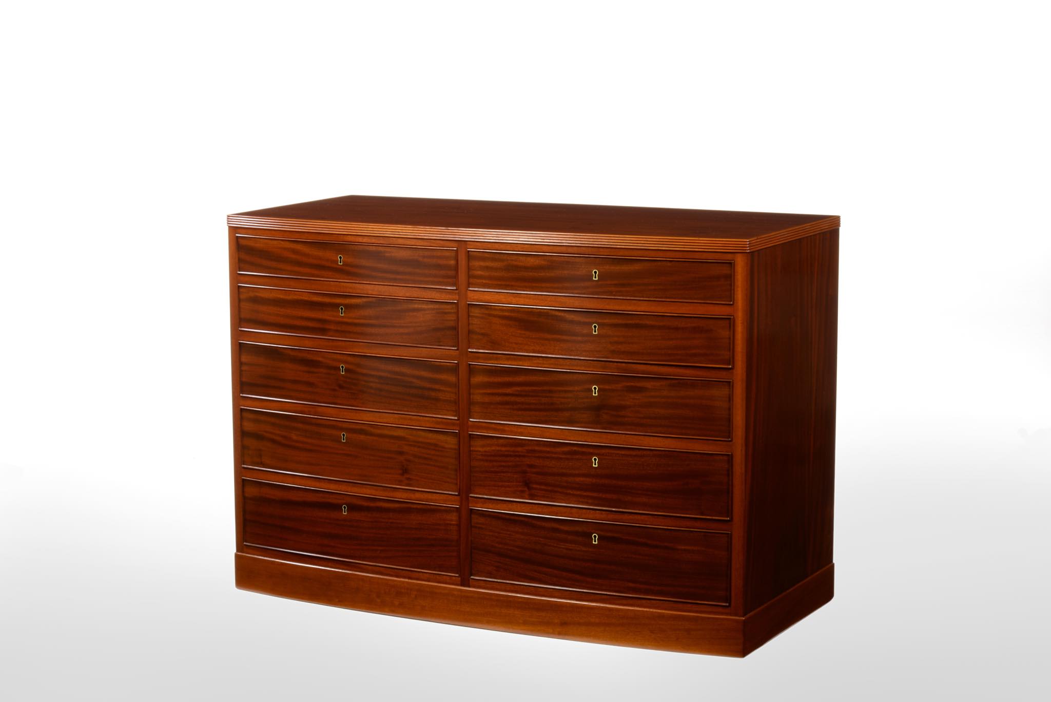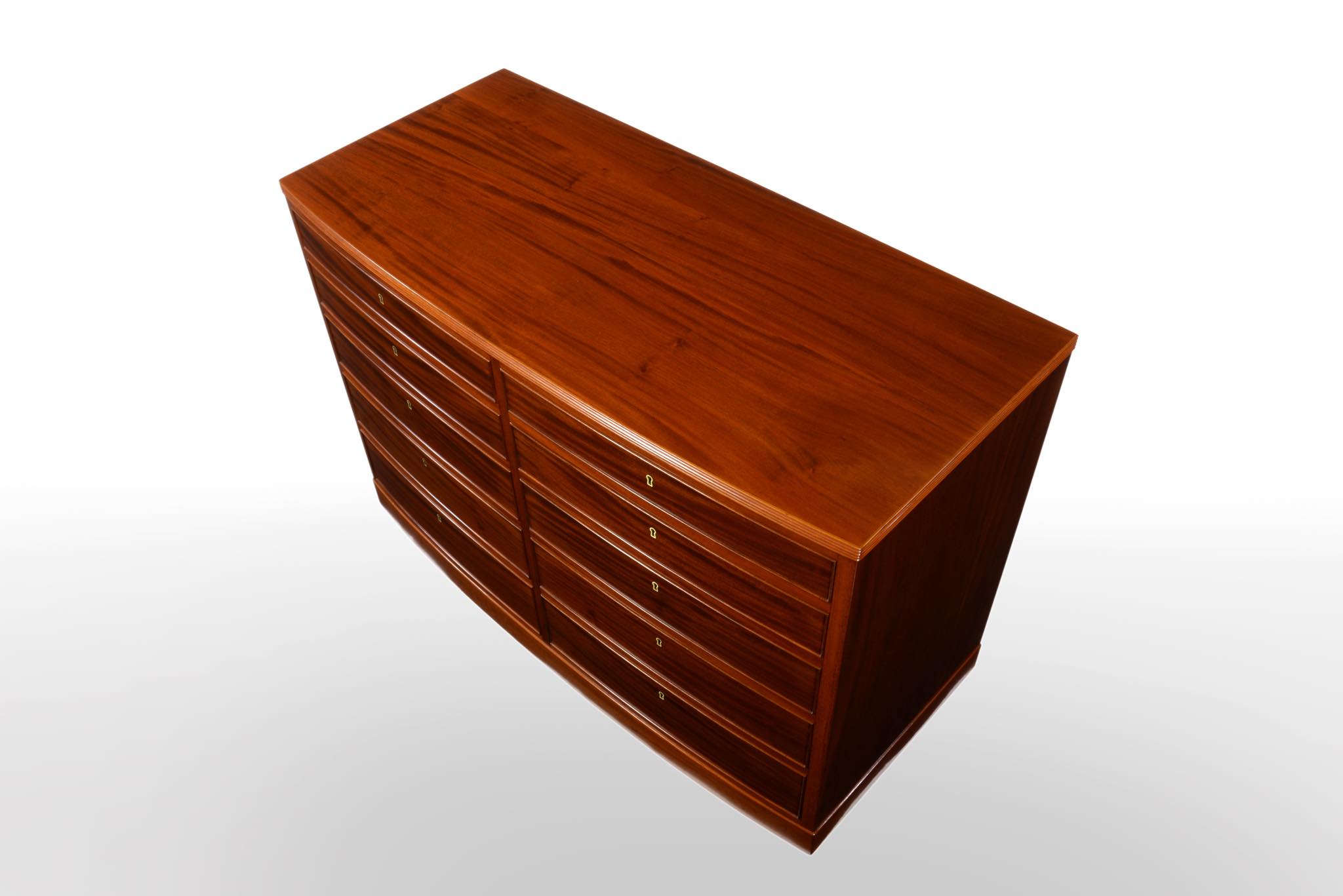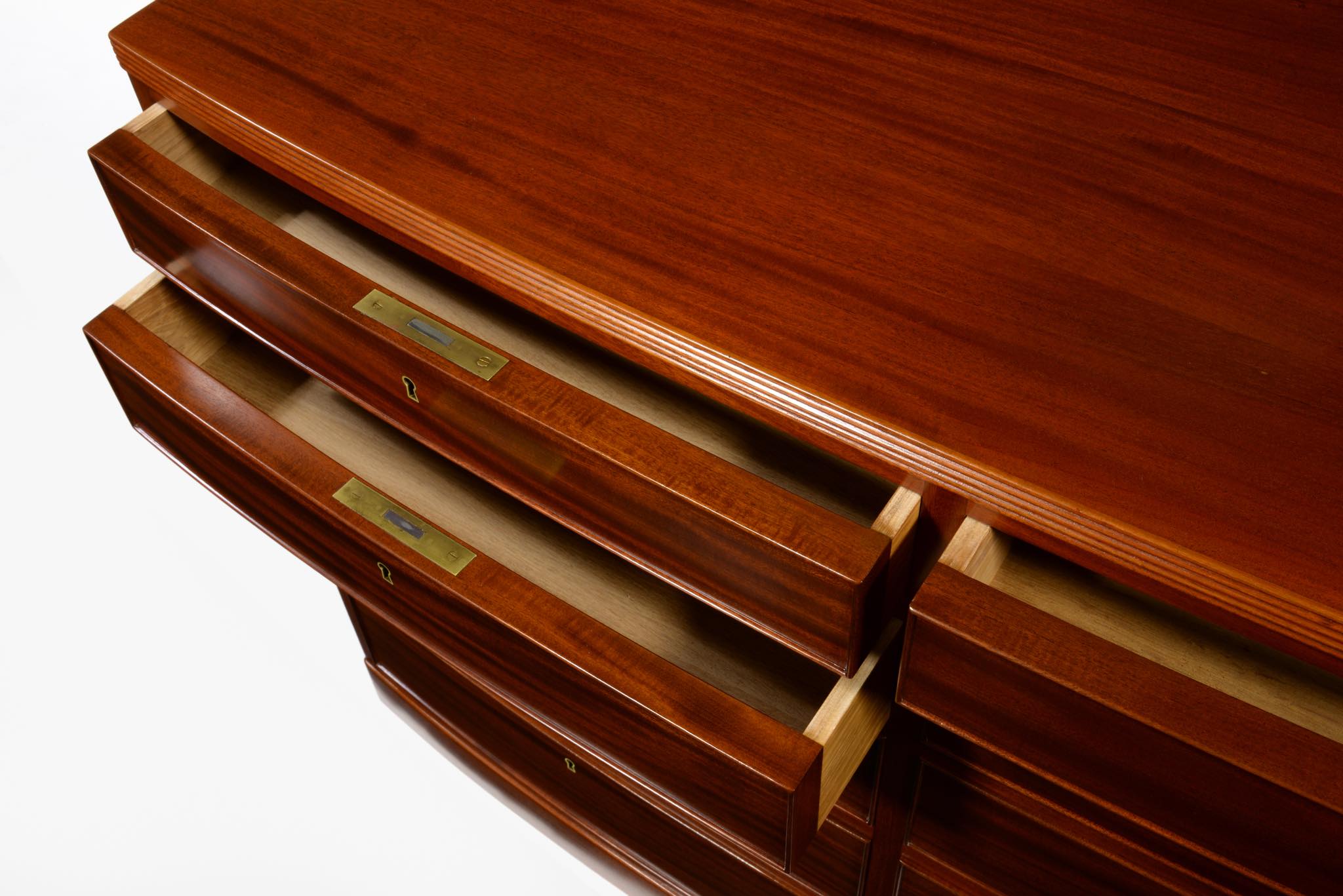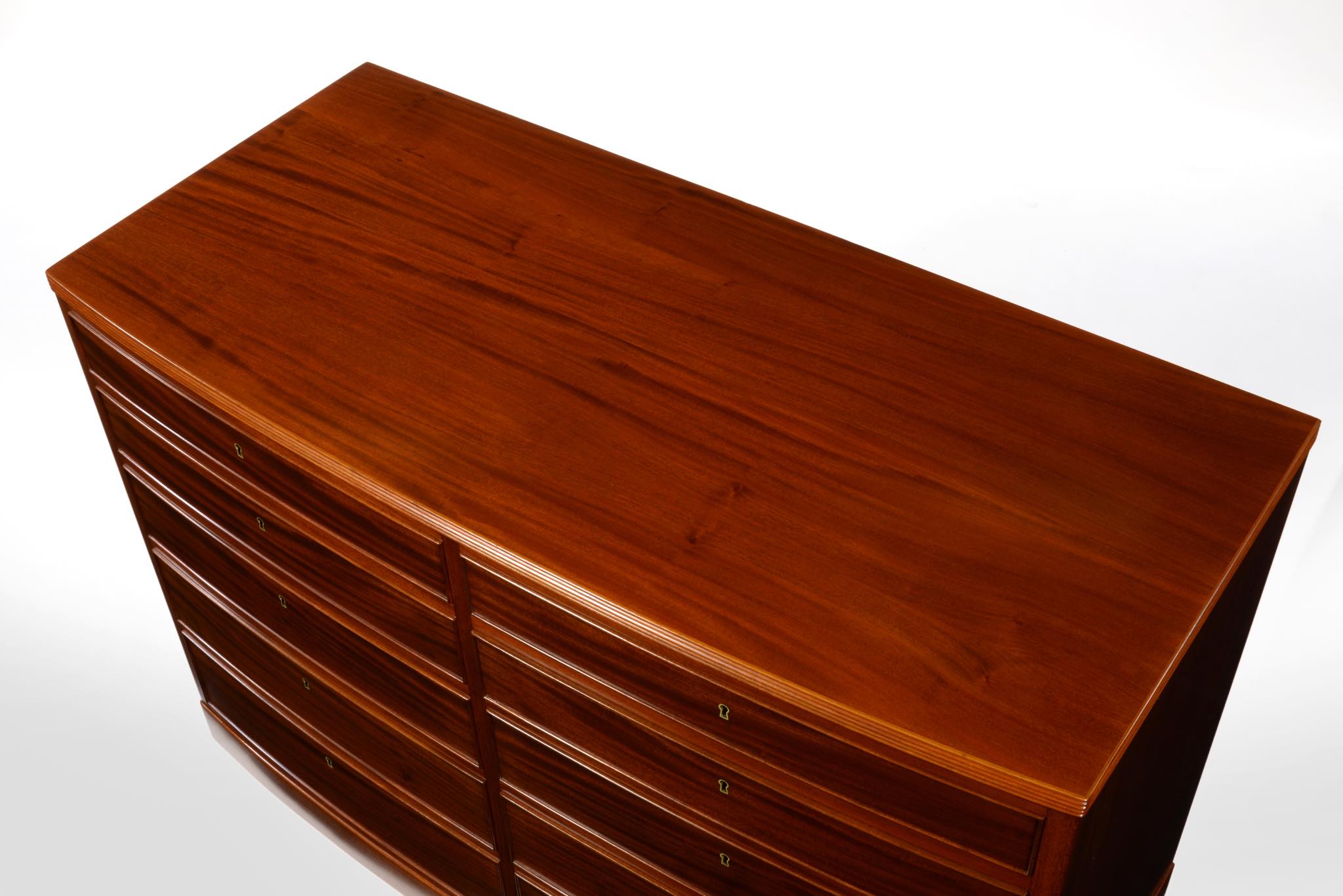 デンマークの名匠、Jacob Kjær/ヤコブ・ケアによって1940年代頃にデザイン、製作されたボウフロントチェストです。肌理の深いマホガニーが用いられた綺麗な家具です。鍵は素材違いですが2本付属します。ボウフロントとは、弓形(Bow)の弧の意味で、チェストの前面に弧を取り入れたスタイルが18世紀後半の英国で誕生し流行したようです。18世紀当時のものはコペンハーゲンのデザインミュージアム(旧工芸博物館)で飾られていたことがありました。(2012年)
