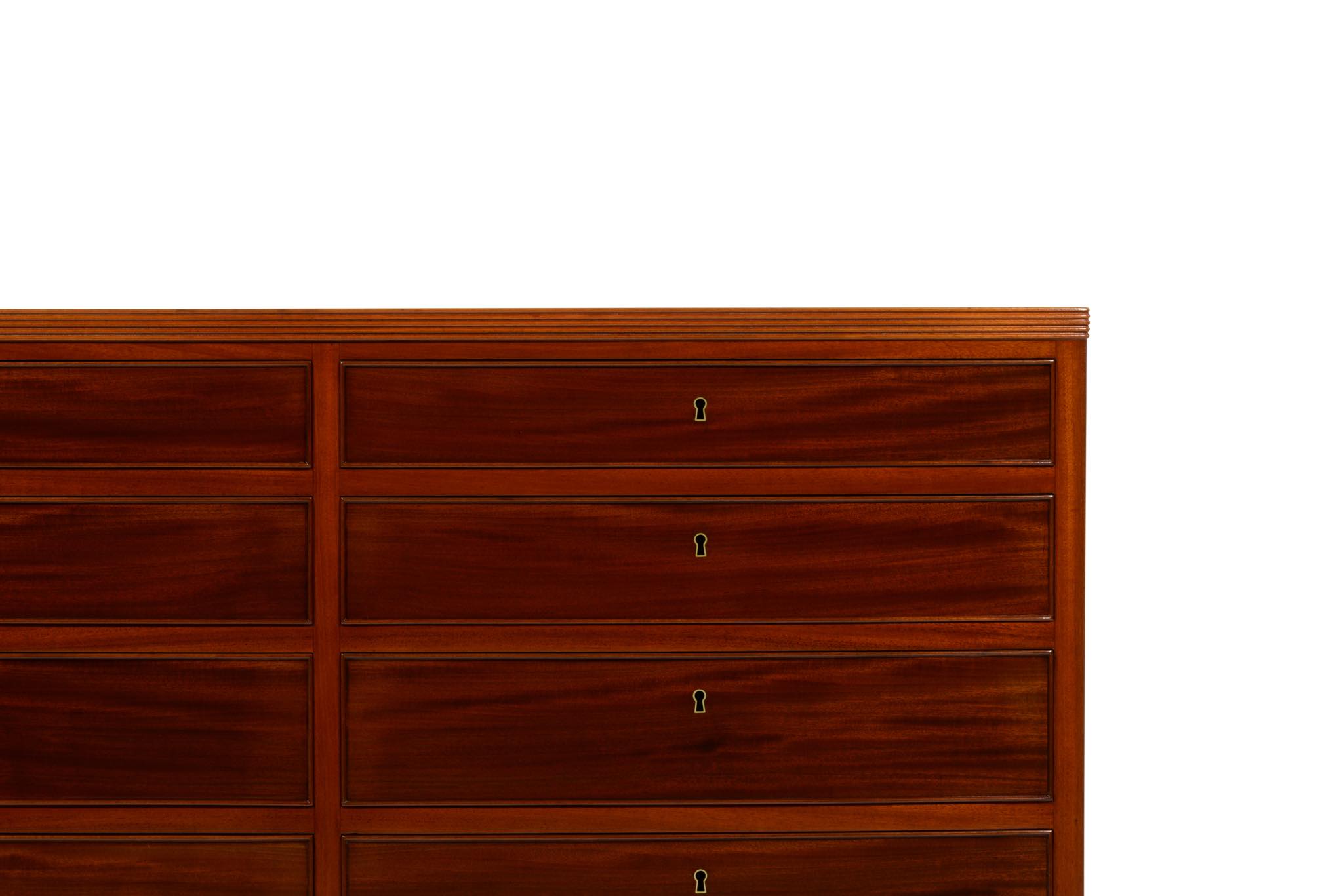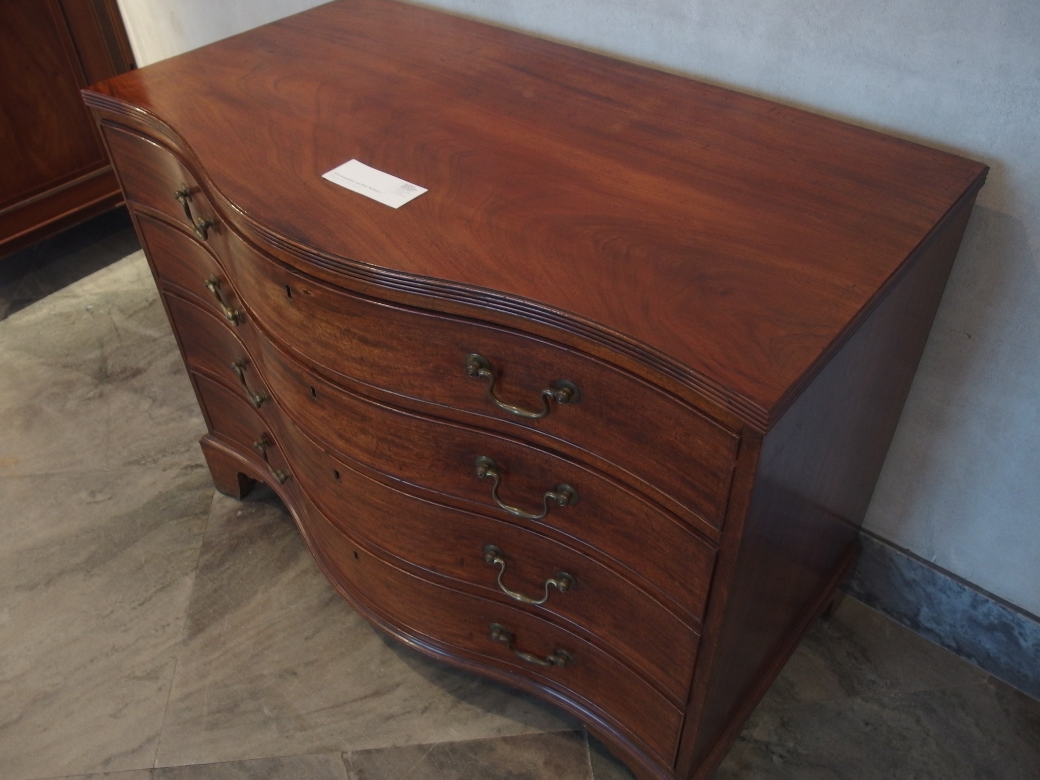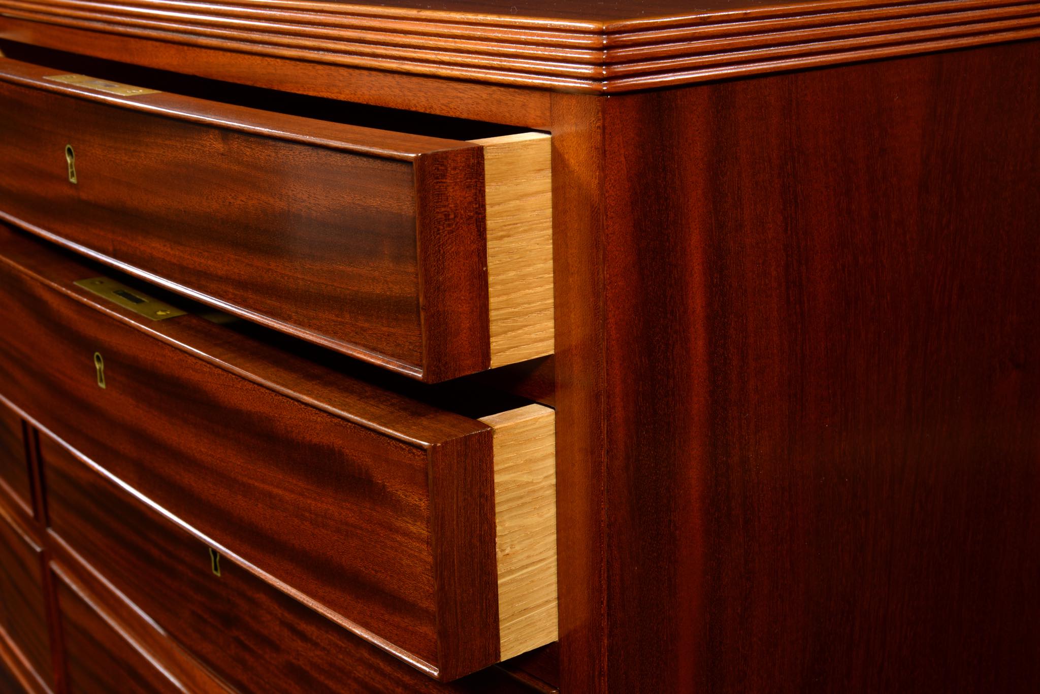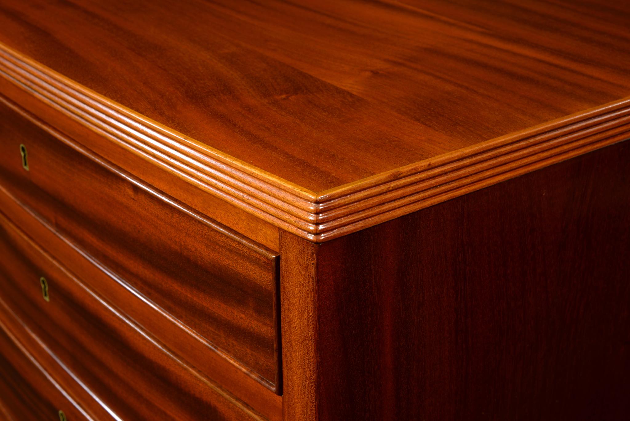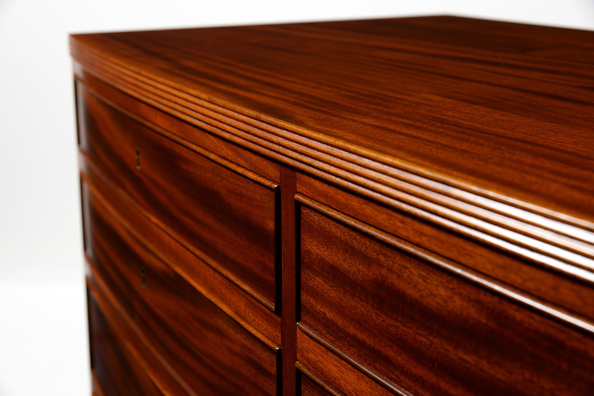 デンマークの名匠、Jacob Kjær/ヤコブ・ケアによって1940年代頃にデザイン、製作されたボウフロントチェストです。肌理の深いマホガニーが用いられた綺麗な家具です。鍵は素材違いですが2本付属します。ボウフロントとは、弓形(Bow)の弧の意味で、チェストの前面に弧を取り入れたスタイルが18世紀後半の英国で誕生し流行したようです。18世紀当時のものはコペンハーゲンのデザインミュージアム(旧工芸博物館)で飾られていたことがありました。(2012年)