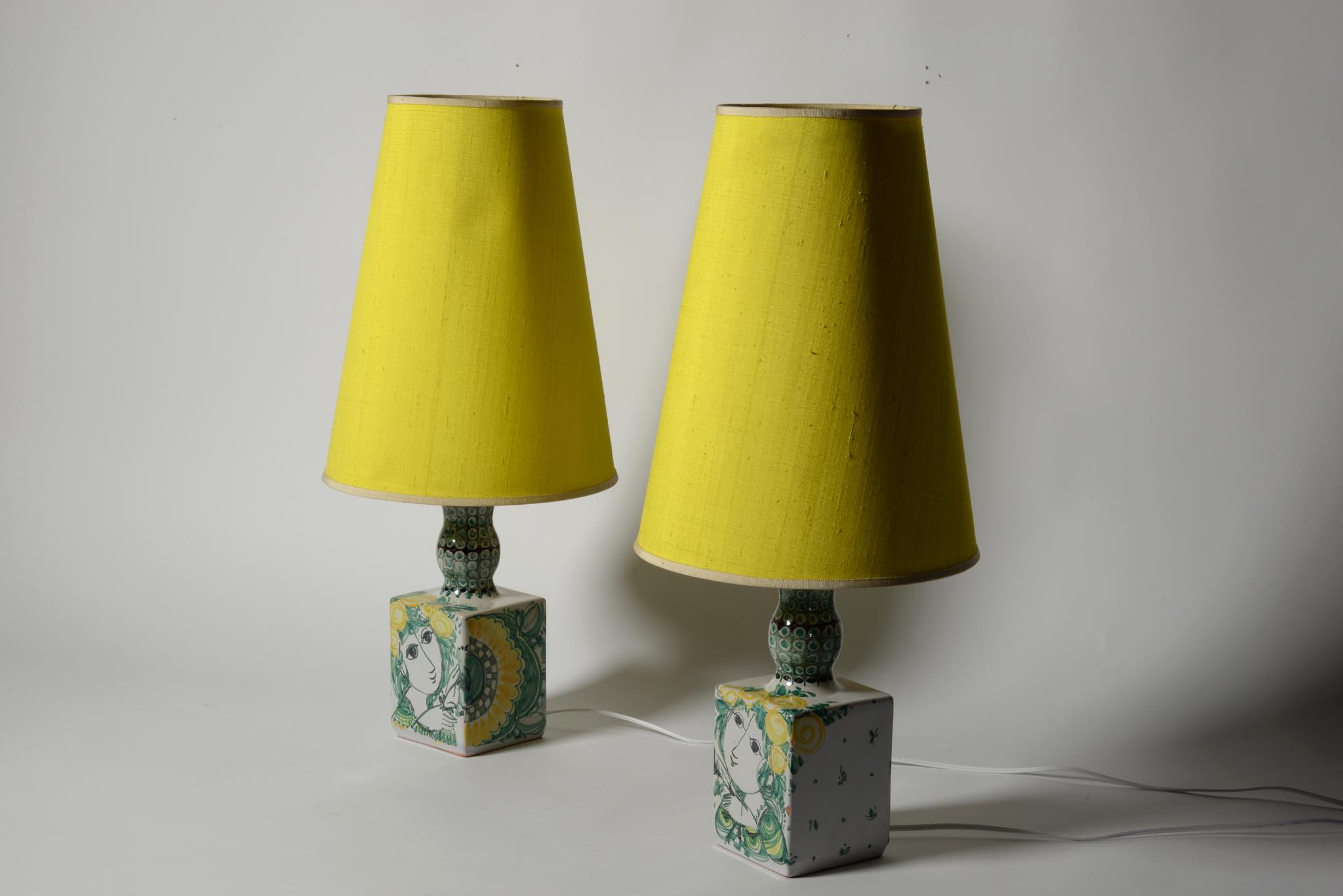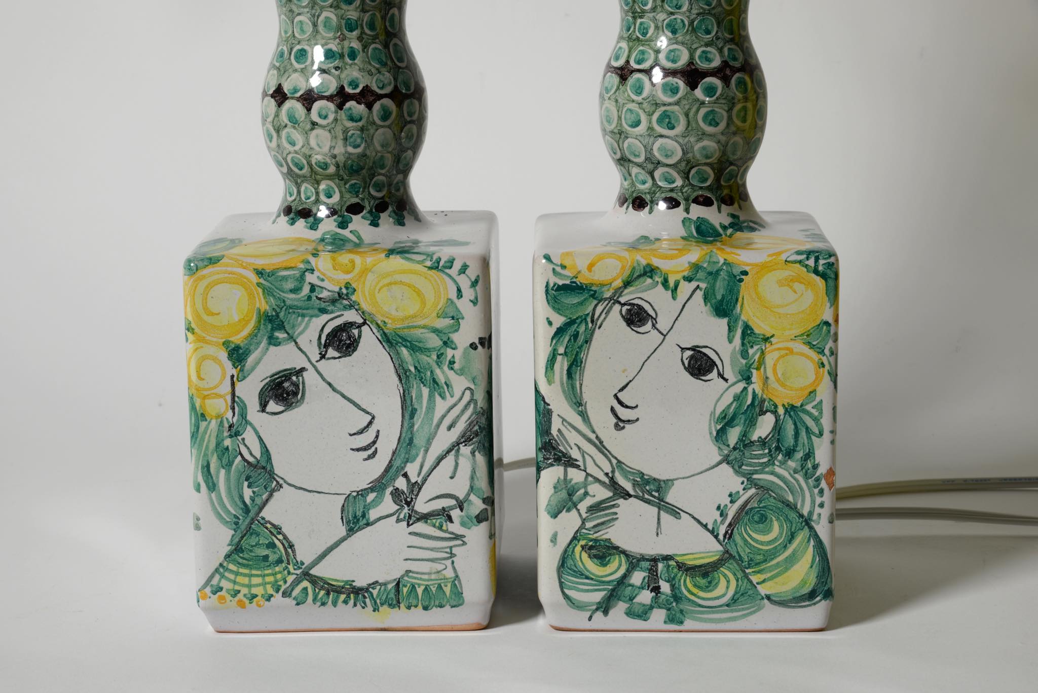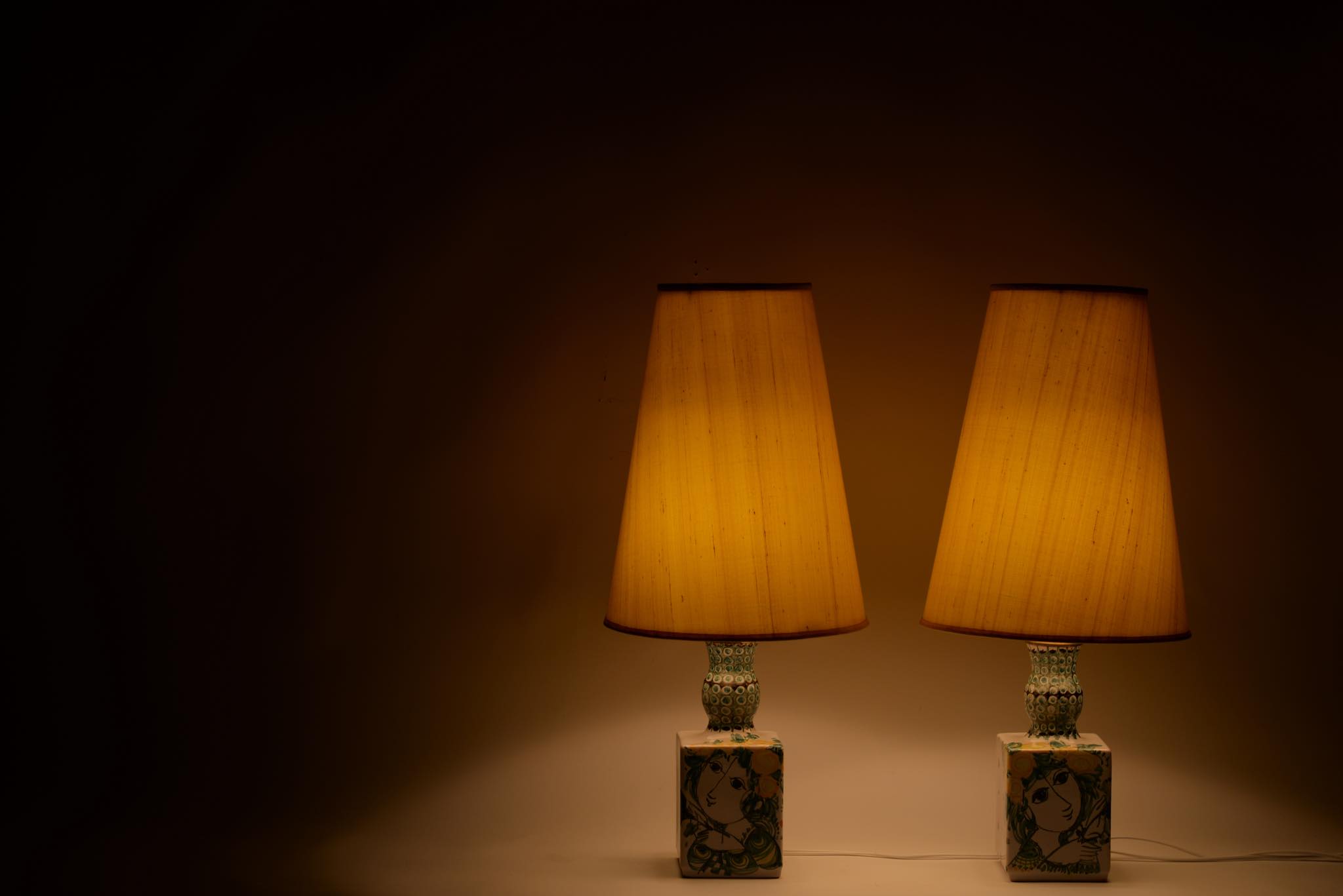デンマークのアーティスト、Bjørn Wiinblad/ビョルン・ヴィンブラッドによるテーブルランプ一対です。1980年に焼成されたもので、ペアで置くことで、絵付けされたそれぞれの女性が向き合う格好となります。一方の本体にチップが見られますが、共直しでの修復が可能ですので詳しくはお問い合わせください。配線は新たに交換しております。