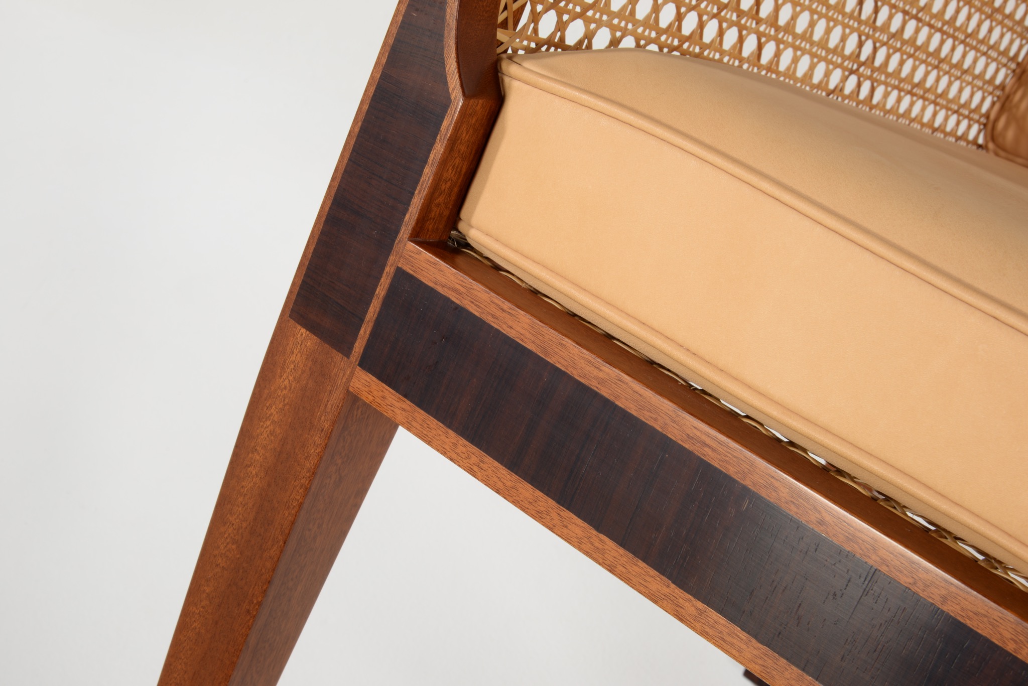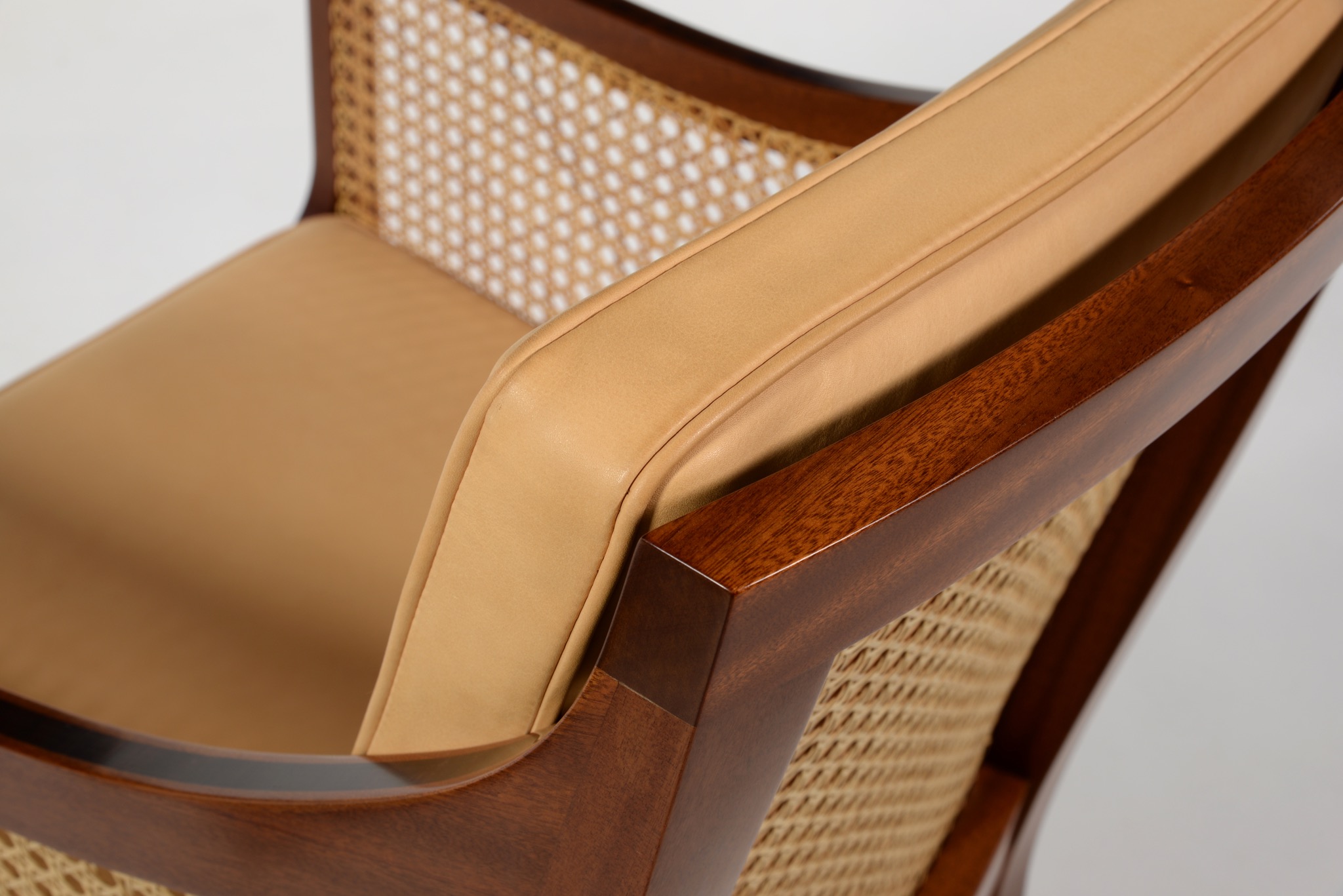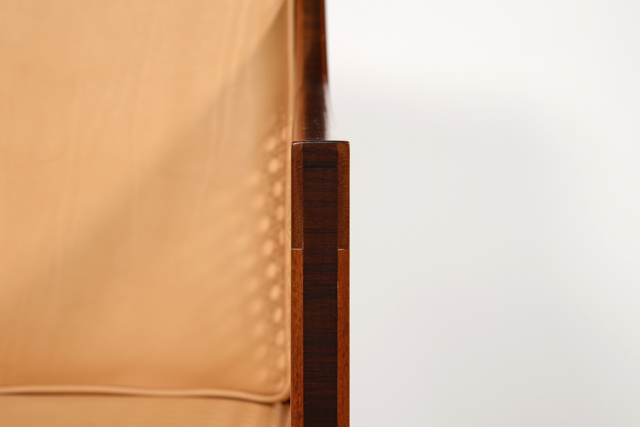 「デンマーク近代家具デザインの父」と称される、デザイナーでプロフェッサーを務めた、Kaare Klint/コーア・クリントによる "イングリッシュチェア/ベルジュールチェア” 一対です。1932年にデザインされたモデルで、18世紀英国のシェラトン様式にこのルーツが見られます。こちらはルド・ラスムッセン工房によって2015年に作られたもので、同工房最終期のプロダクトとなります。現在、ルド・ラスムッセン工房はカール・ハンセン&サン社によって併合されました。マホガニーのフレームにはアクセントとしてローズウッド材が象眼されています。上質なヌメ皮革を用いたクッションが備わり、手編みによる籐張りにて座る人の体重を支えます。ヌメ皮革は多少使われていますが、さらに使い込む事で深い色合いを増すでしょう。こちらは一対での販売となります。
